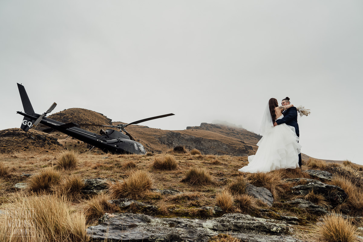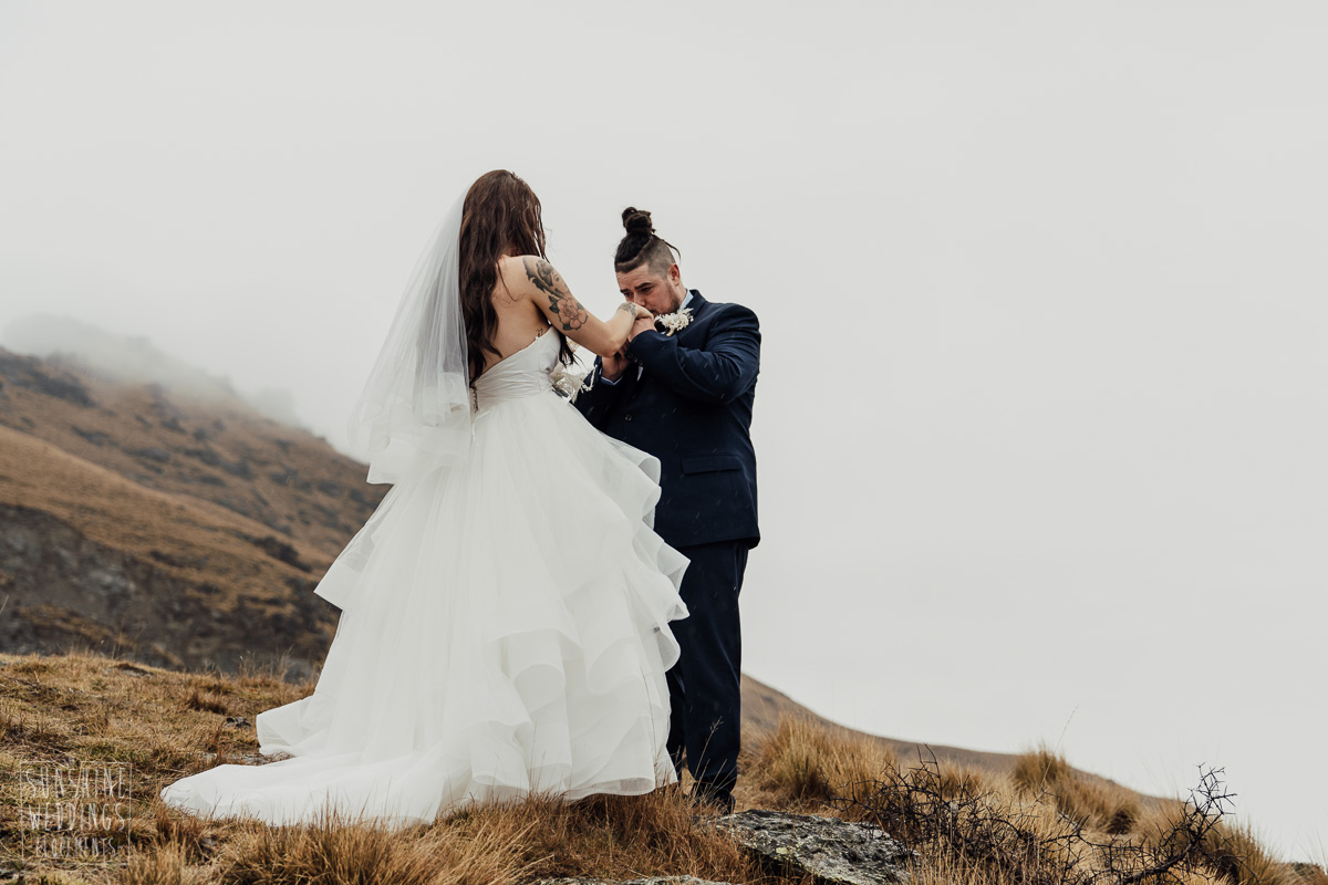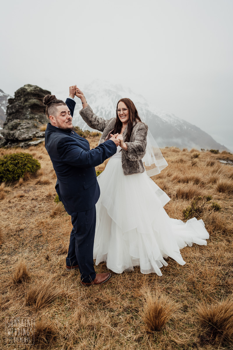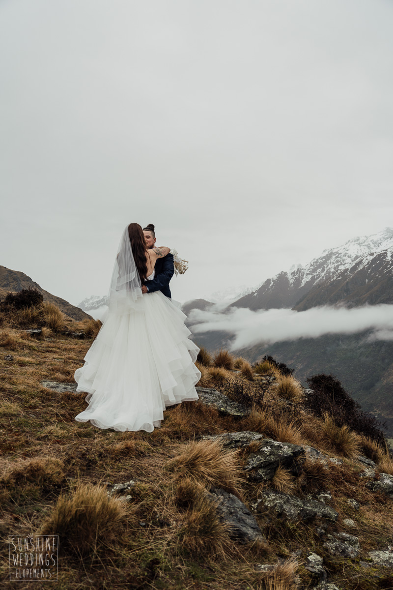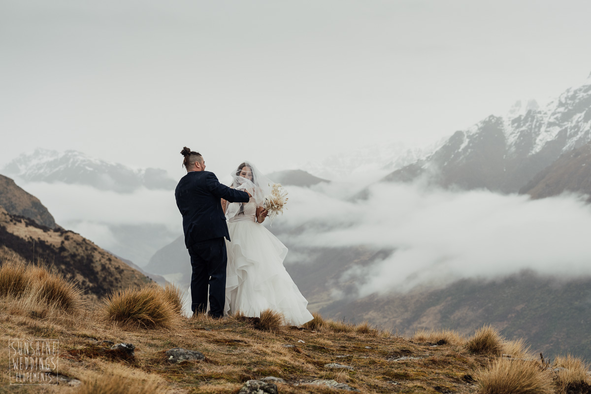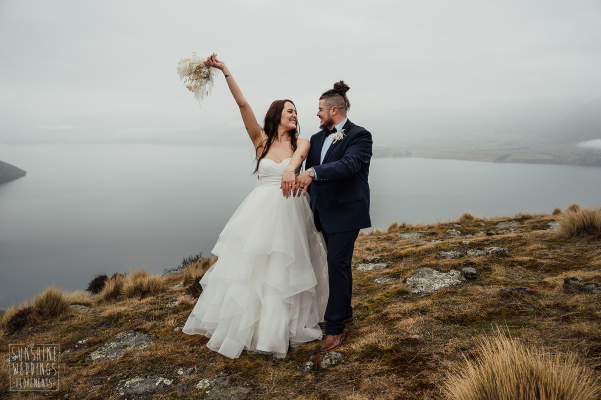 We couldn’t get to the higher peaks due to low cloud and wind so Scott and the pilot found them a couple of sheltered spots at Round Hill and then Bayonet Peak instead. First a snowy mountain backdrop for their ceremony, then with great views across Lake Wakatipu for some more time exploring and a photo shoot.