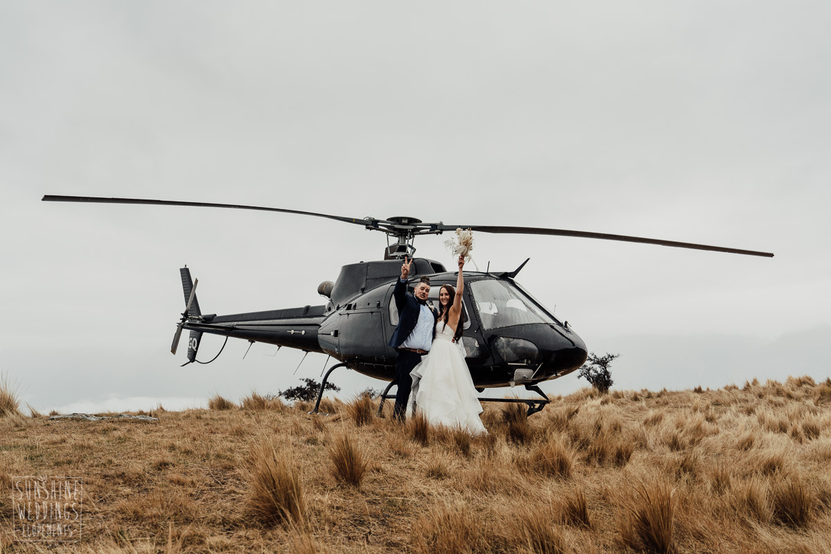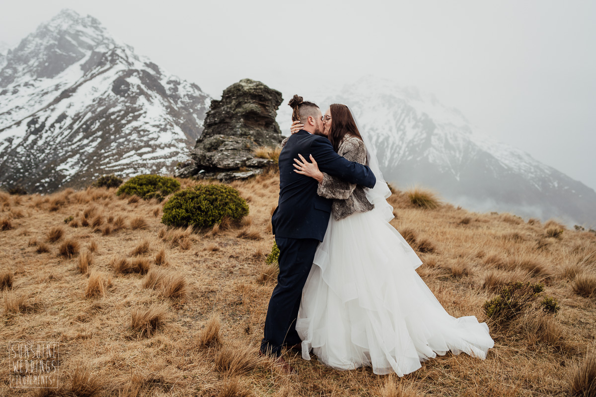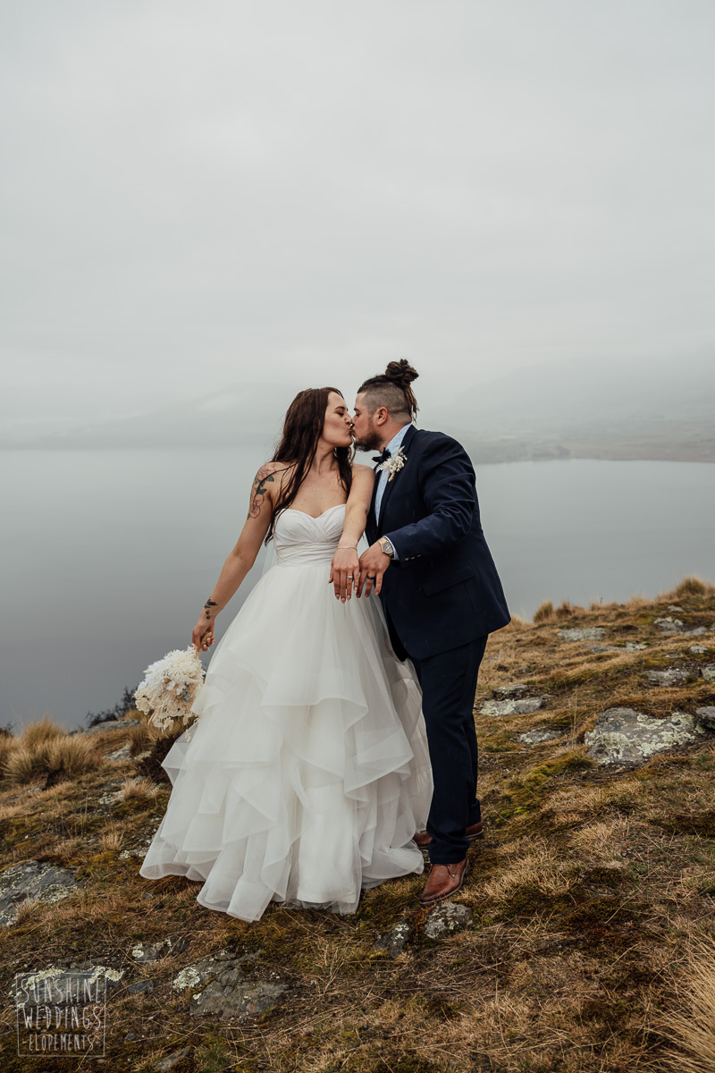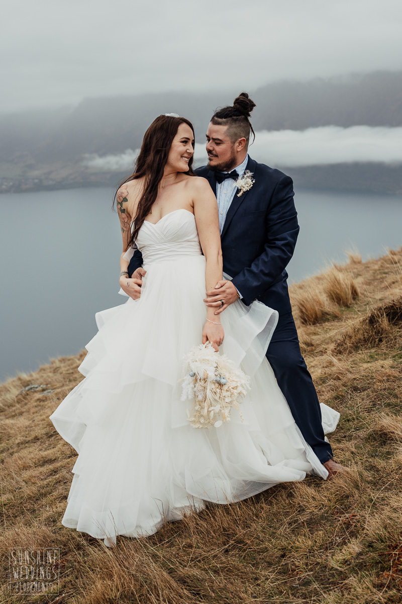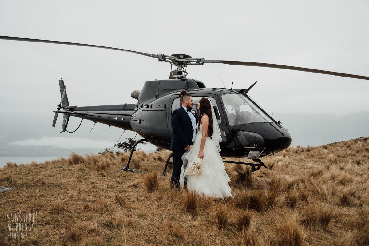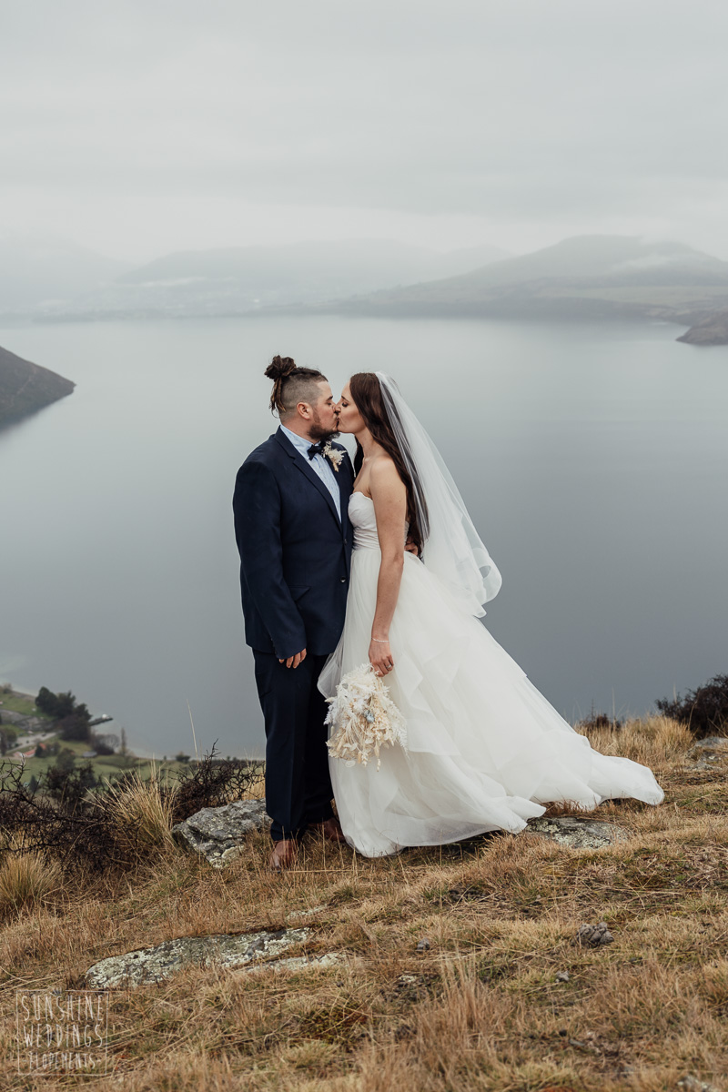 We couldn’t get to the higher peaks due to low cloud and wind so Scott and the pilot found them a couple of sheltered spots at Round Hill and then Bayonet Peak instead. First a snowy mountain backdrop for their ceremony, then with great views across Lake Wakatipu for some more time exploring and a photo shoot.