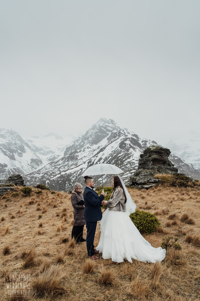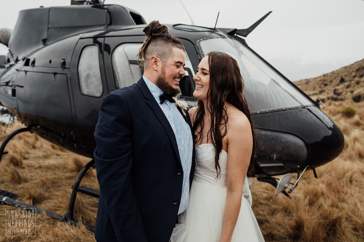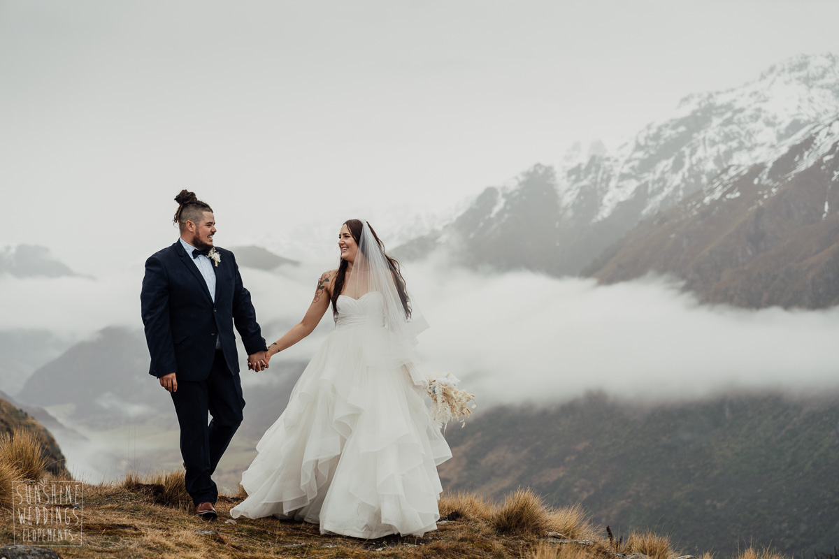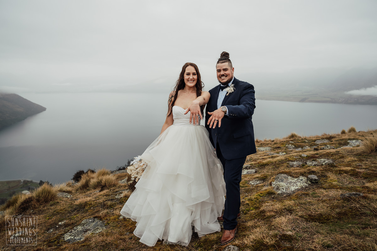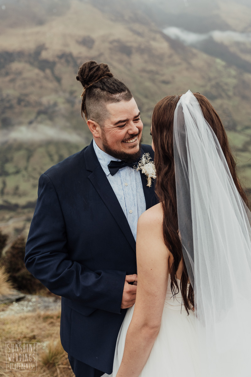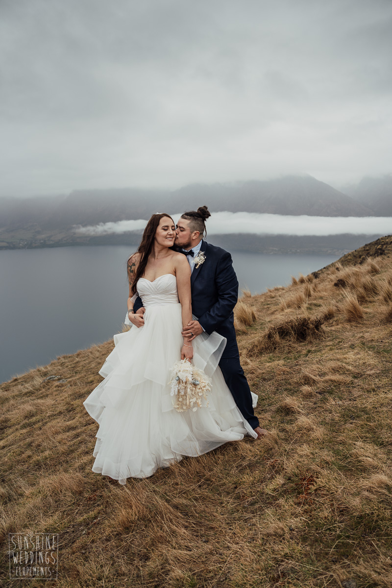 We couldn’t get to the higher peaks due to low cloud and wind so Scott and the pilot found them a couple of sheltered spots at Round Hill and then Bayonet Peak instead. First a snowy mountain backdrop for their ceremony, then with great views across Lake Wakatipu for some more time exploring and a photo shoot.