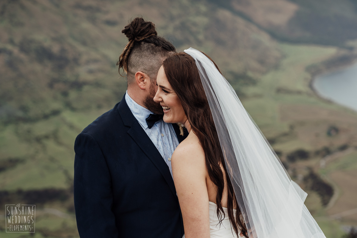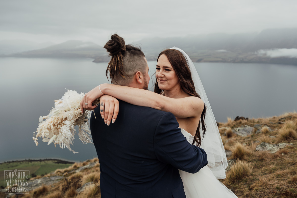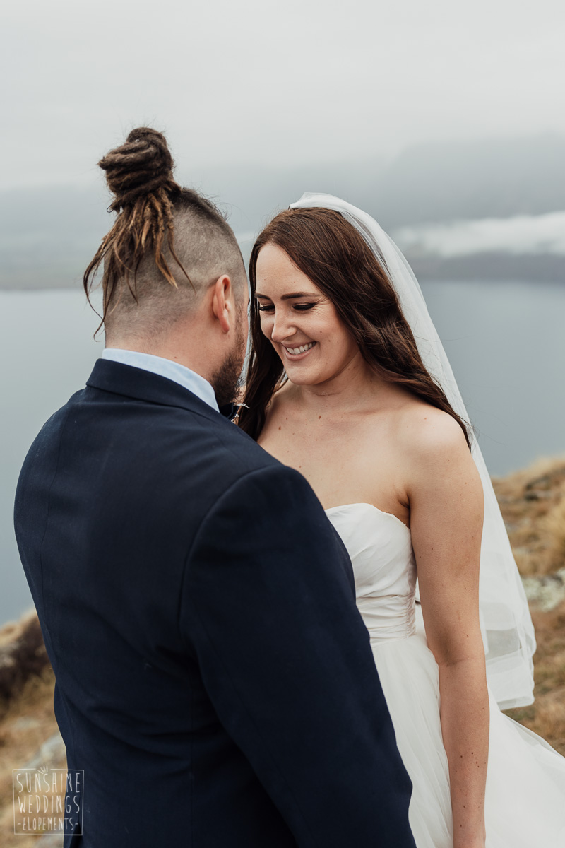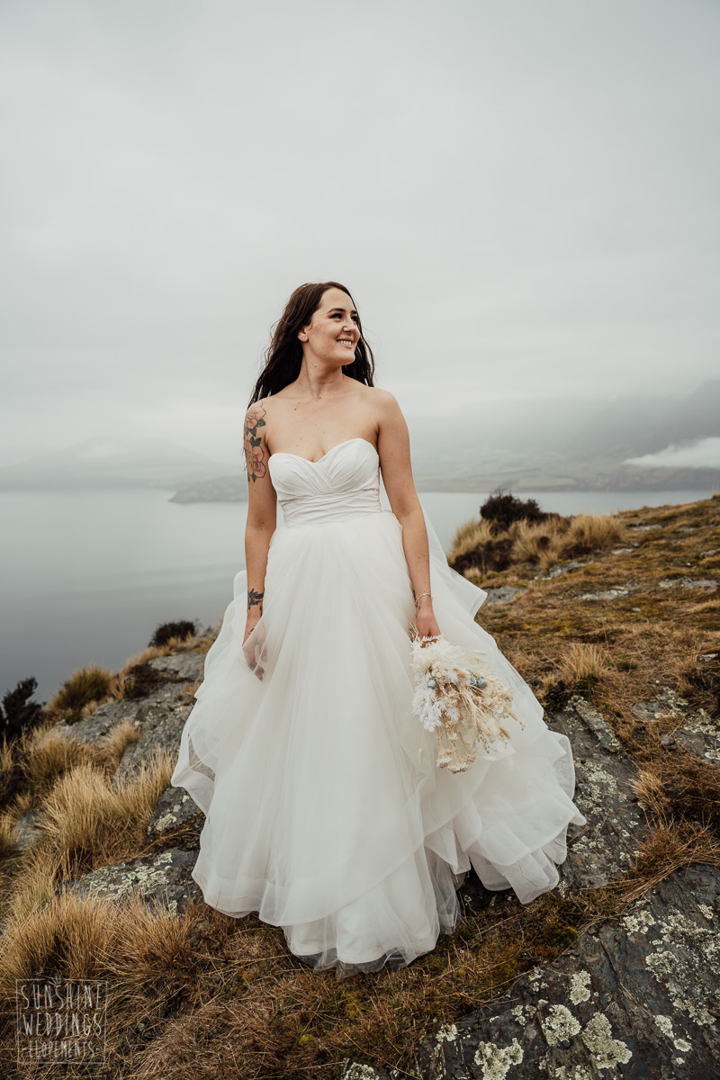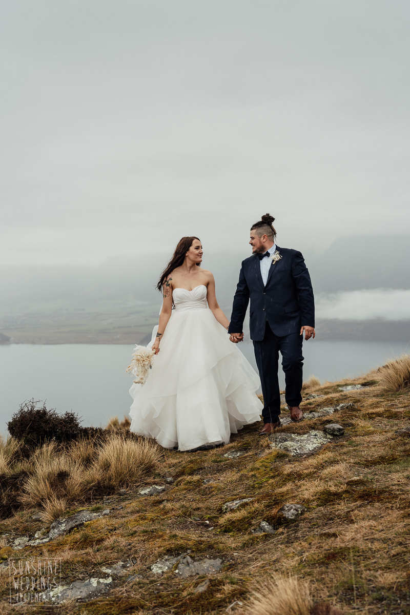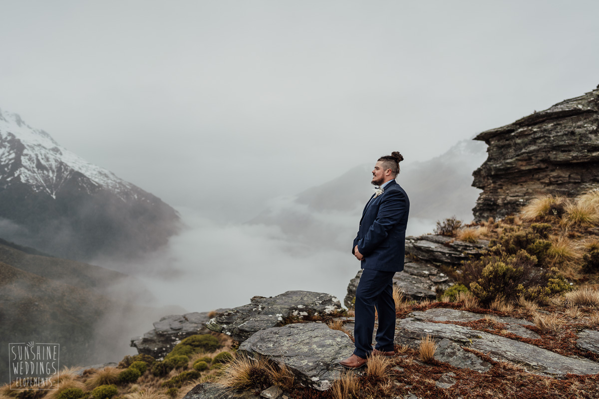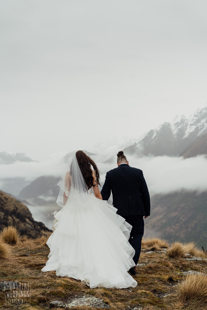 We couldn’t get to the higher peaks due to low cloud and wind so Scott and the pilot found them a couple of sheltered spots at Round Hill and then Bayonet Peak instead. First a snowy mountain backdrop for their ceremony, then with great views across Lake Wakatipu for some more time exploring and a photo shoot.