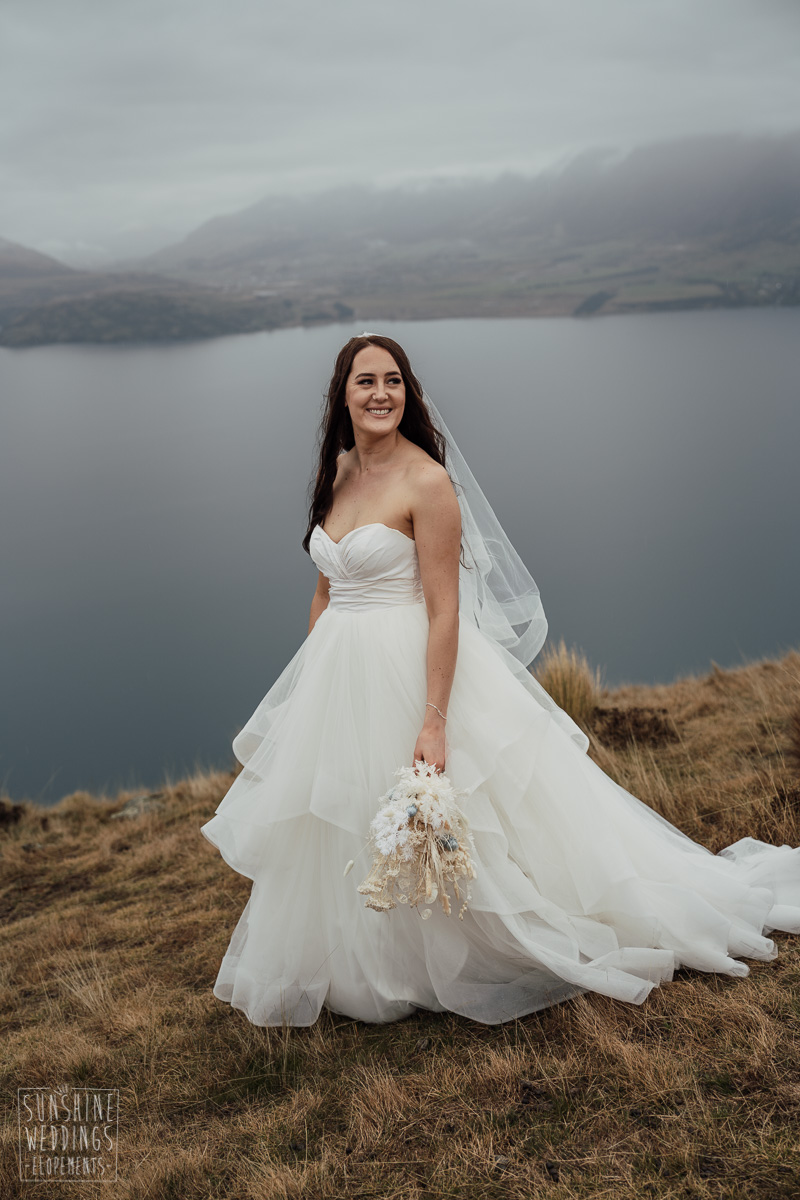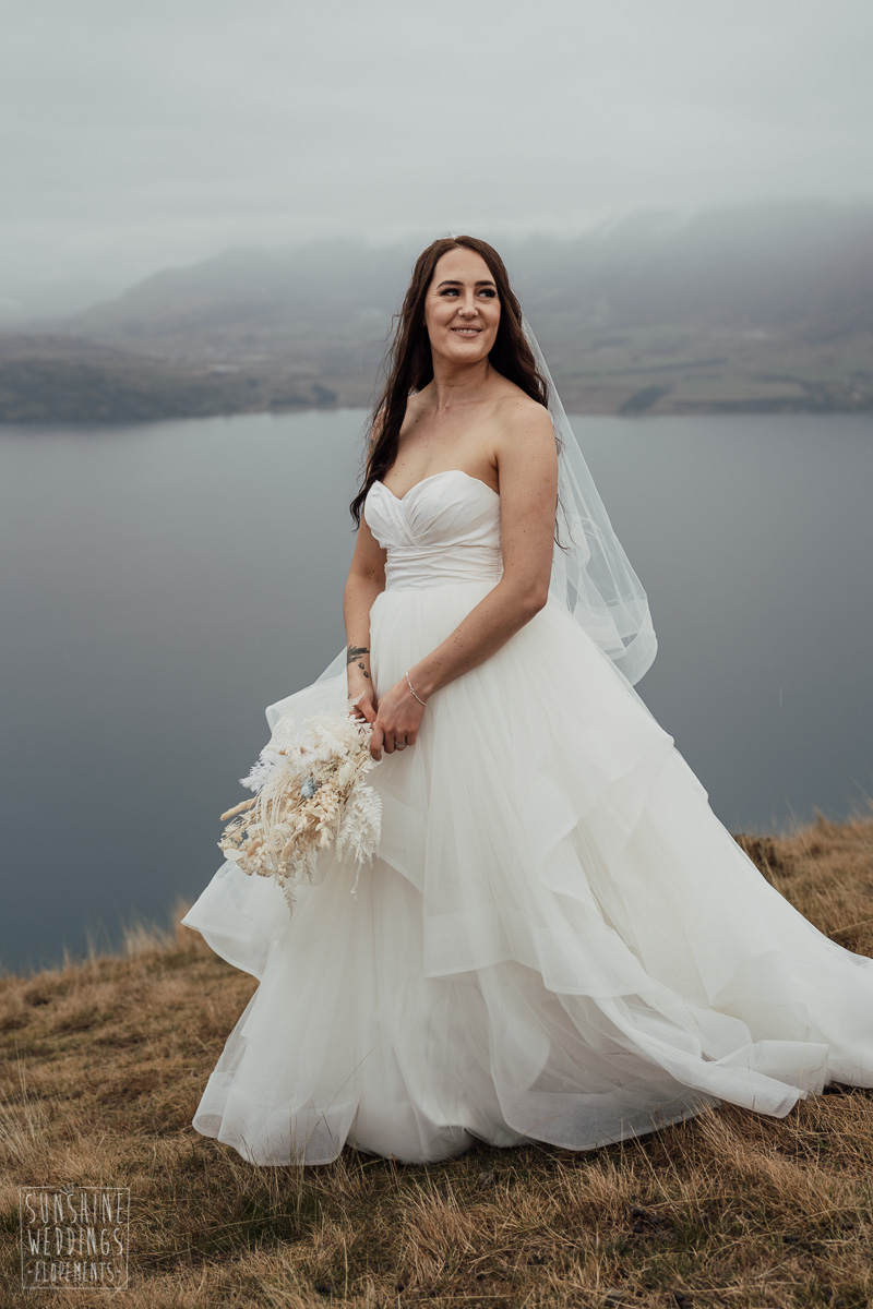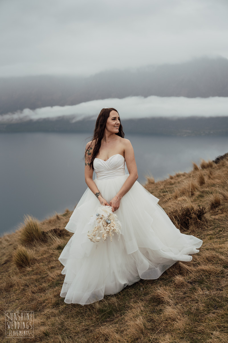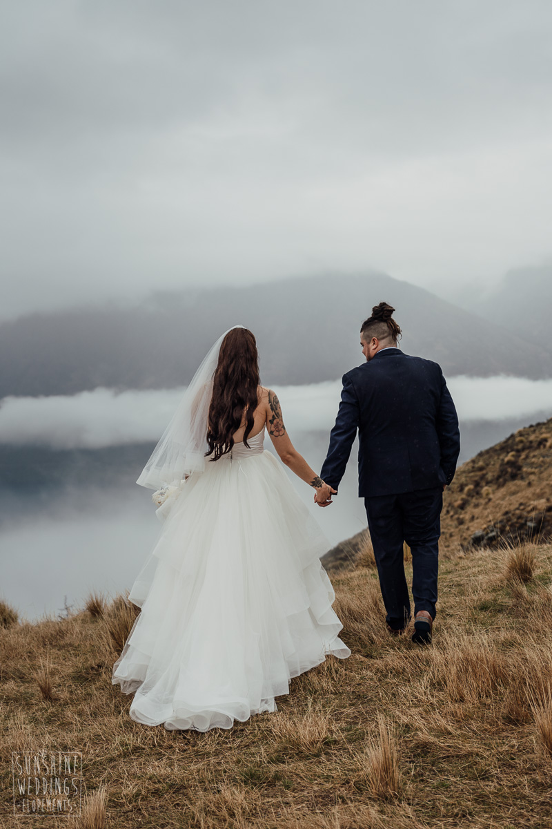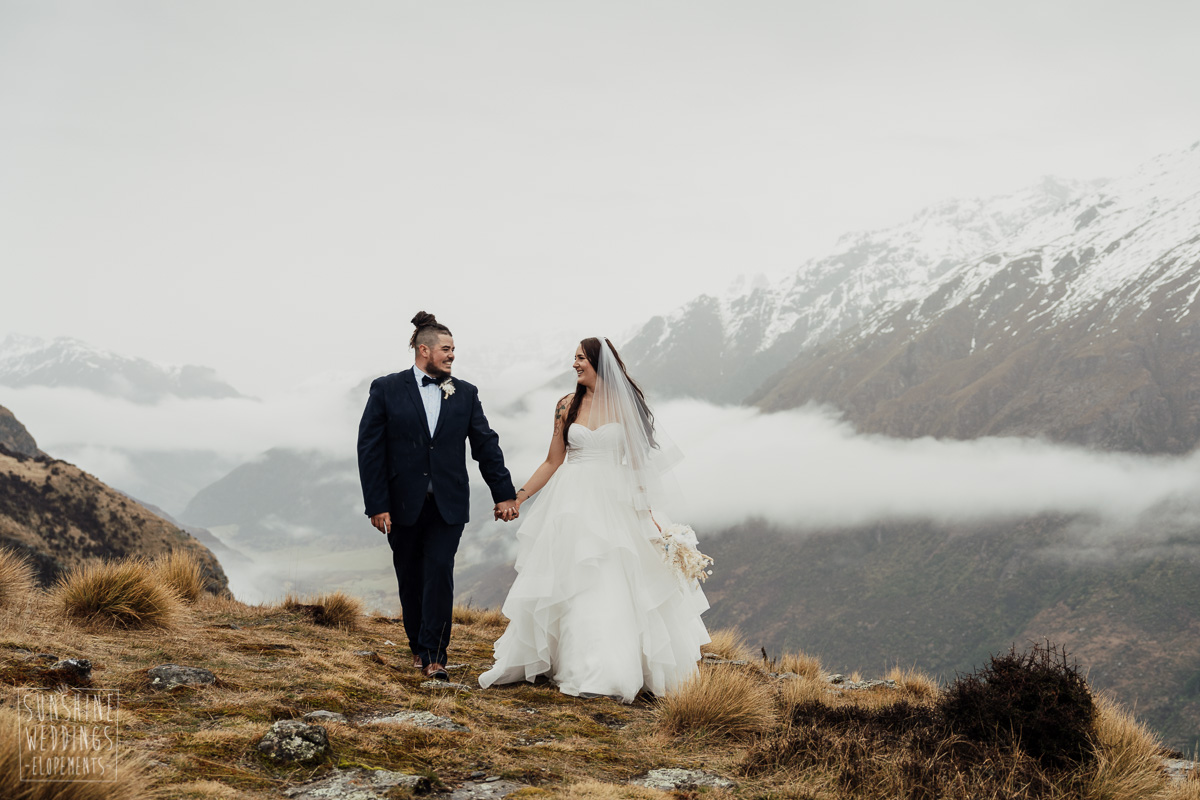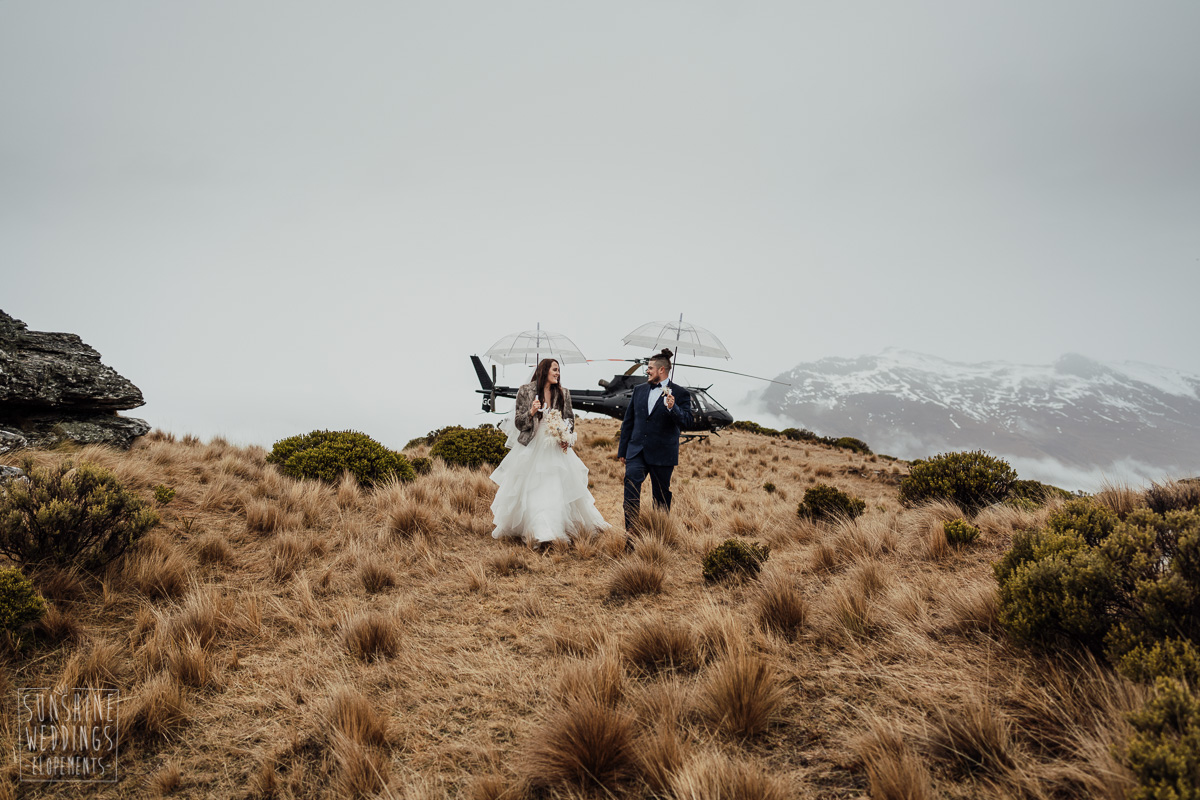 We couldn’t get to the higher peaks due to low cloud and wind so Scott and the pilot found them a couple of sheltered spots at Round Hill and then Bayonet Peak instead. First a snowy mountain backdrop for their ceremony, then with great views across Lake Wakatipu for some more time exploring and a photo shoot.