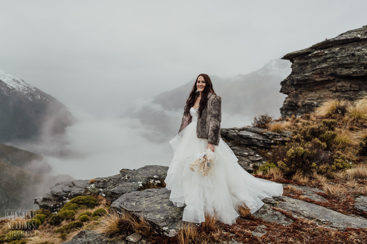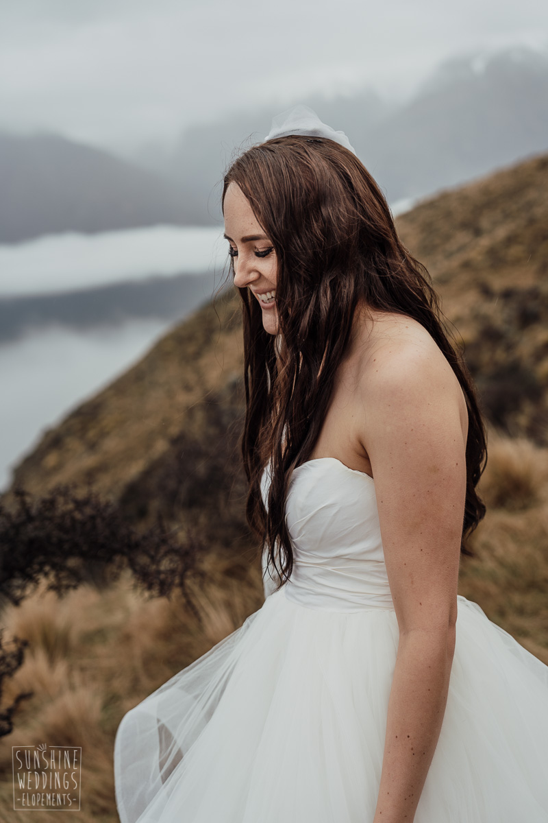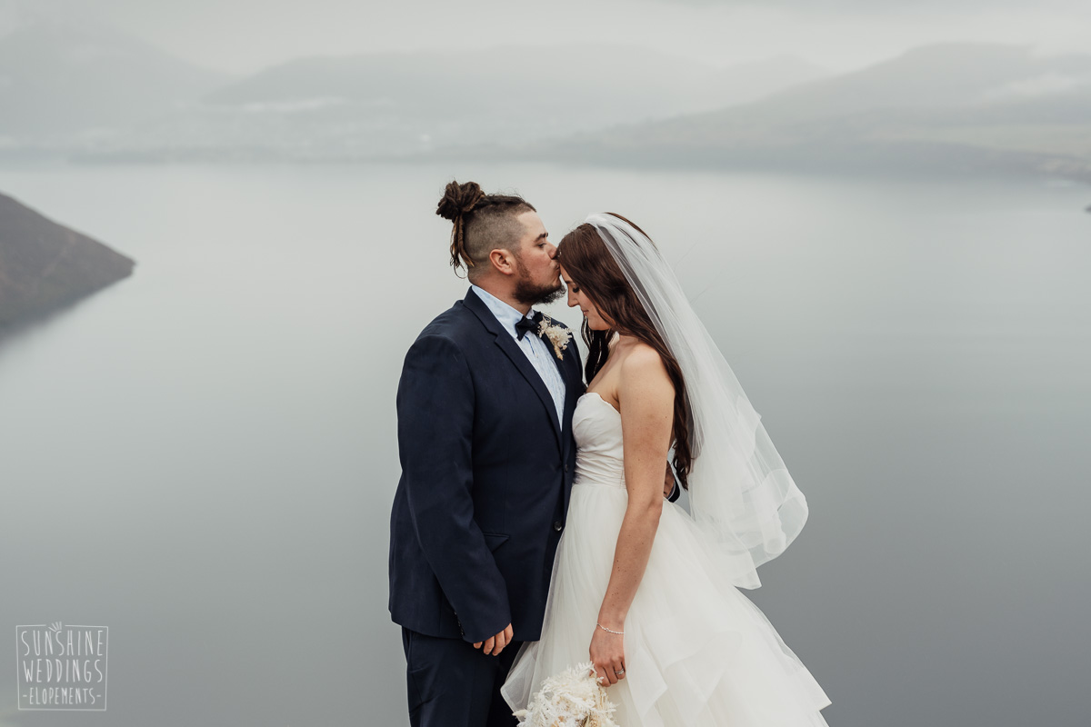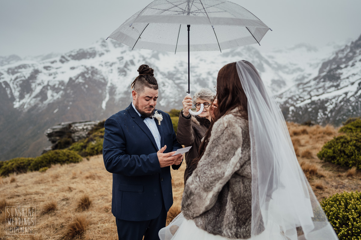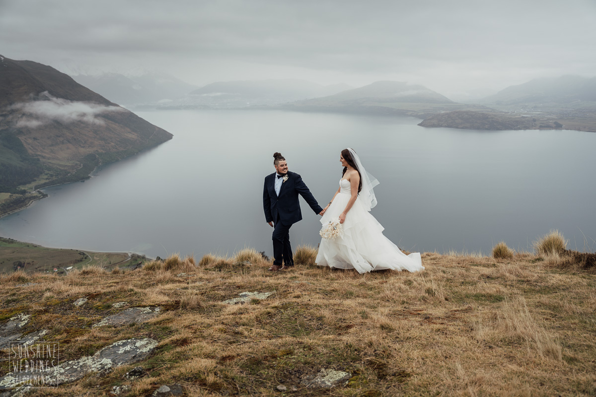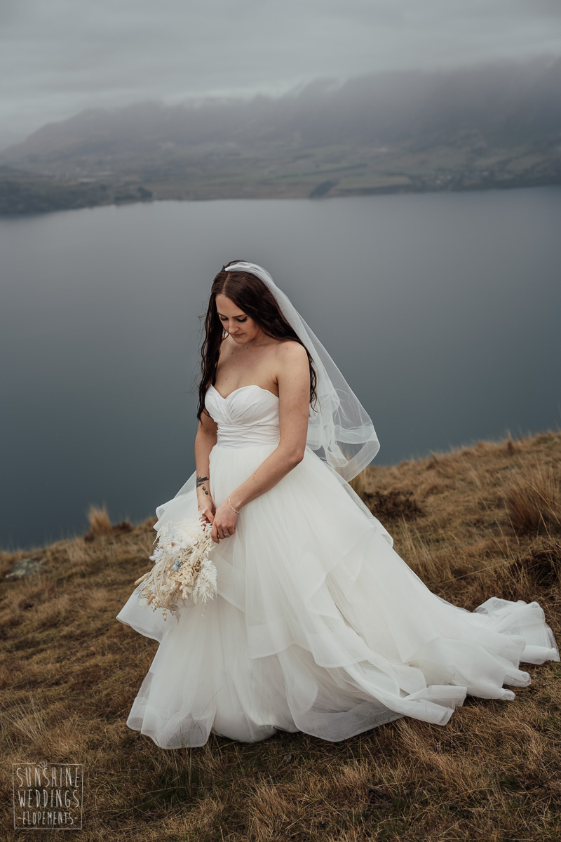 We couldn’t get to the higher peaks due to low cloud and wind so Scott and the pilot found them a couple of sheltered spots at Round Hill and then Bayonet Peak instead. First a snowy mountain backdrop for their ceremony, then with great views across Lake Wakatipu for some more time exploring and a photo shoot.