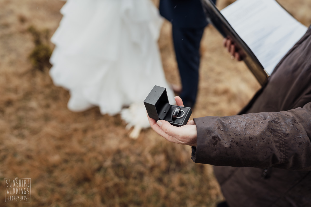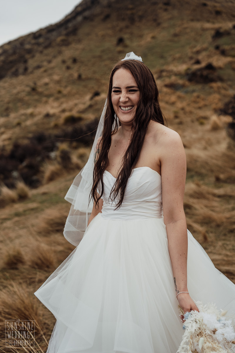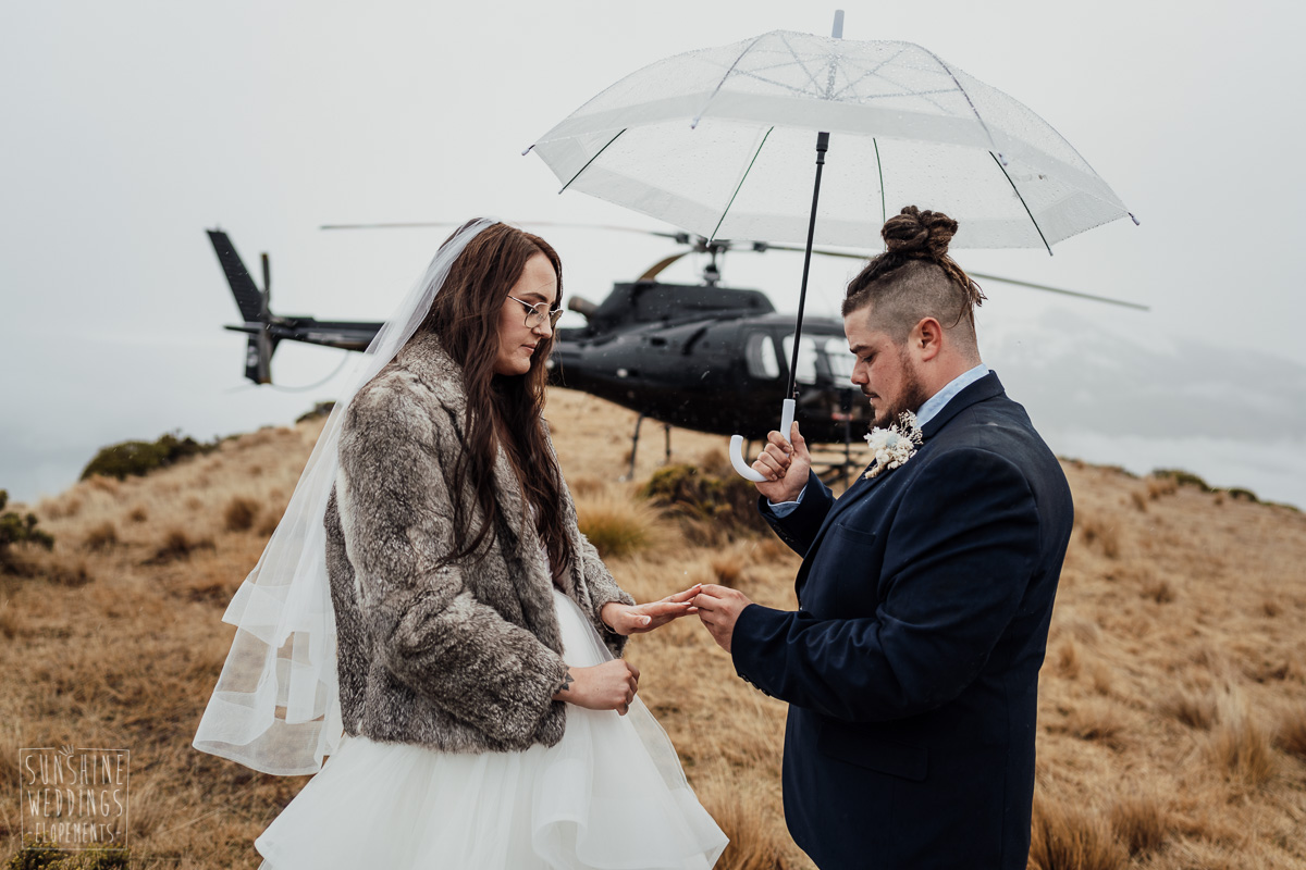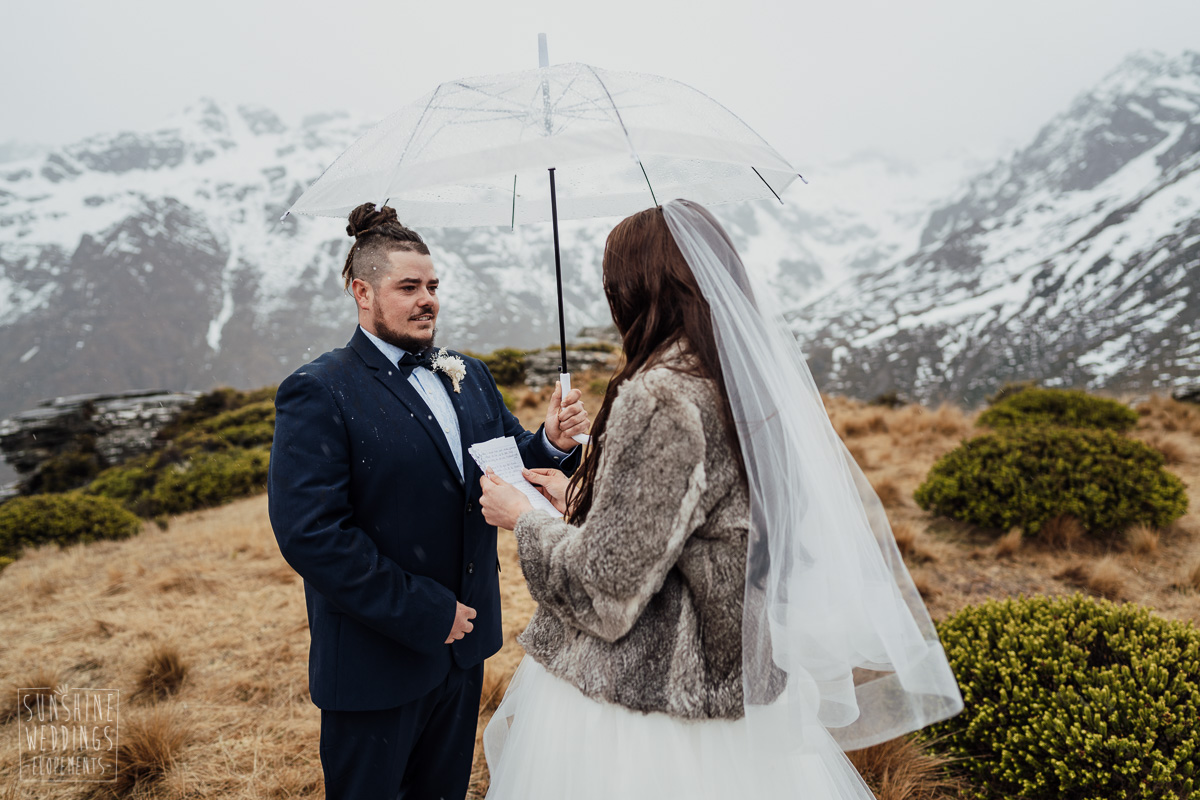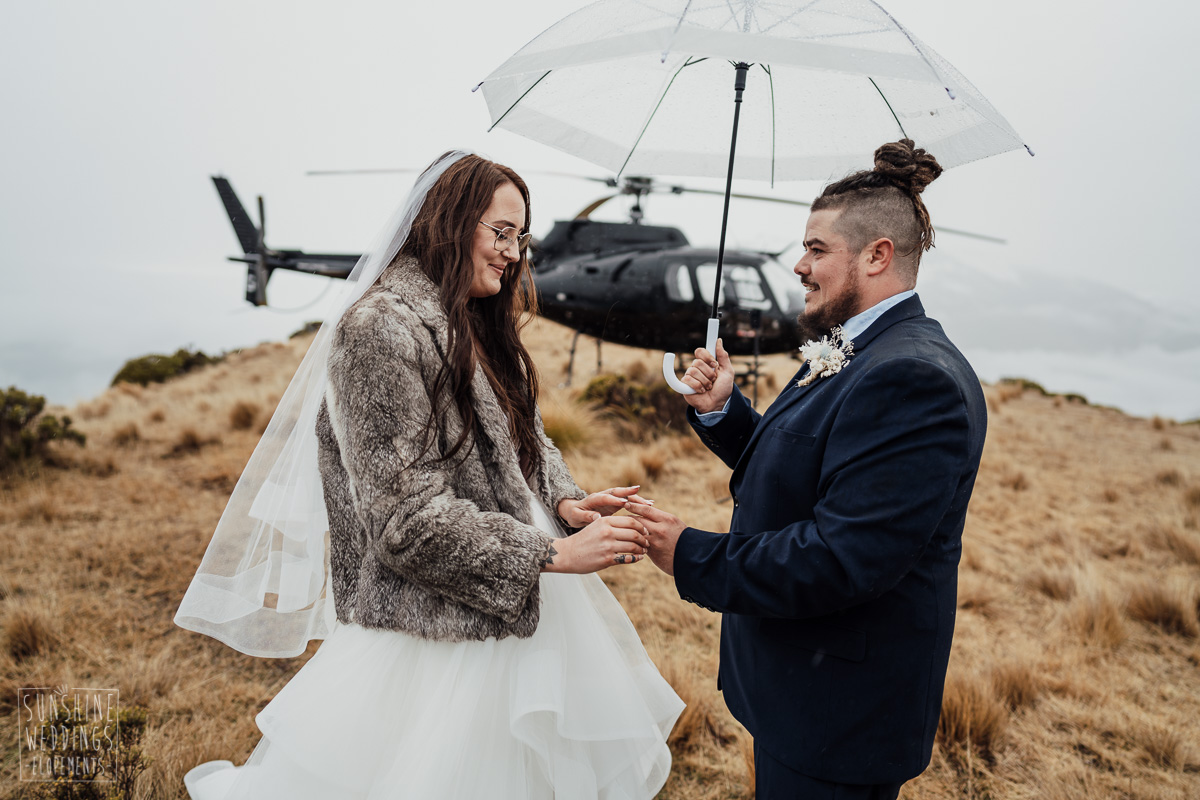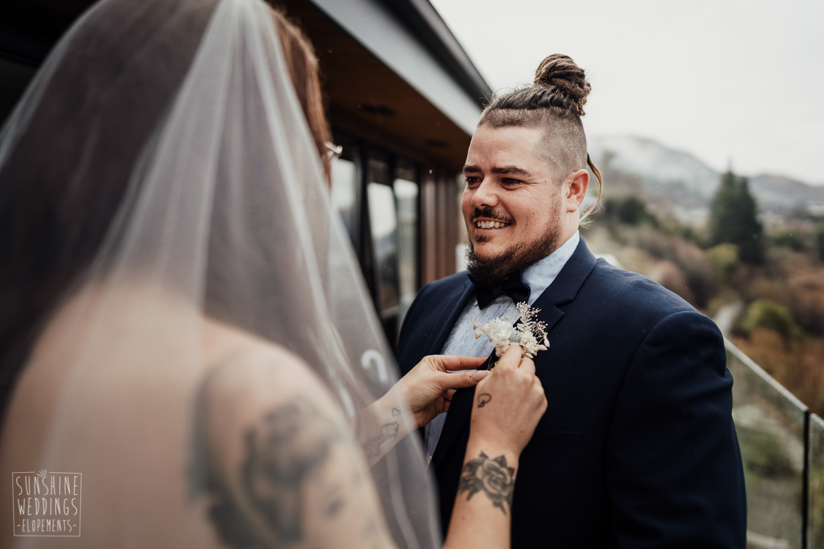We couldn’t get to the higher peaks due to low cloud and wind so Scott and the pilot found them a couple of sheltered spots at Round Hill and then Bayonet Peak instead. First a snowy mountain backdrop for their ceremony, then with great views across Lake Wakatipu for some more time exploring and a photo shoot.
