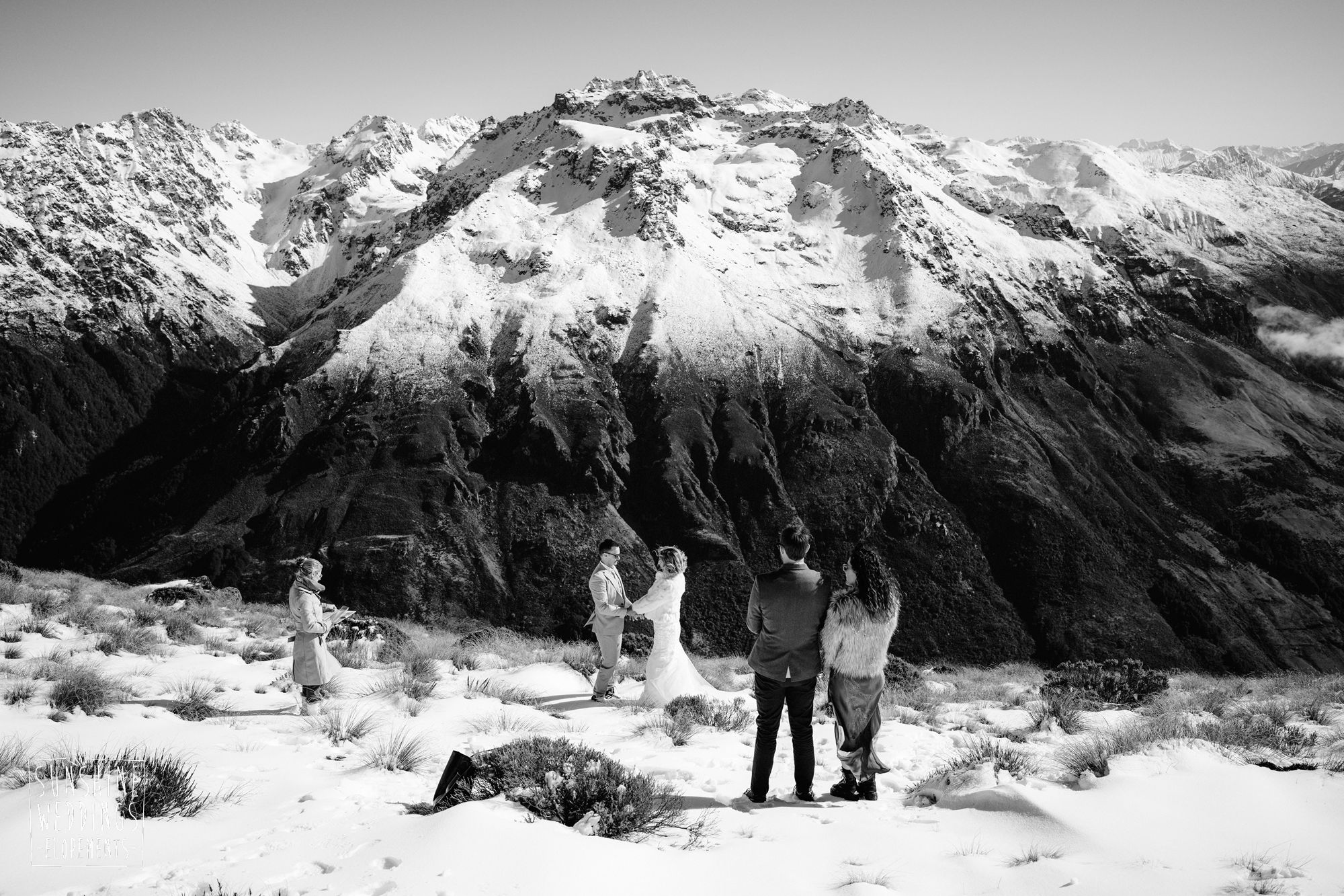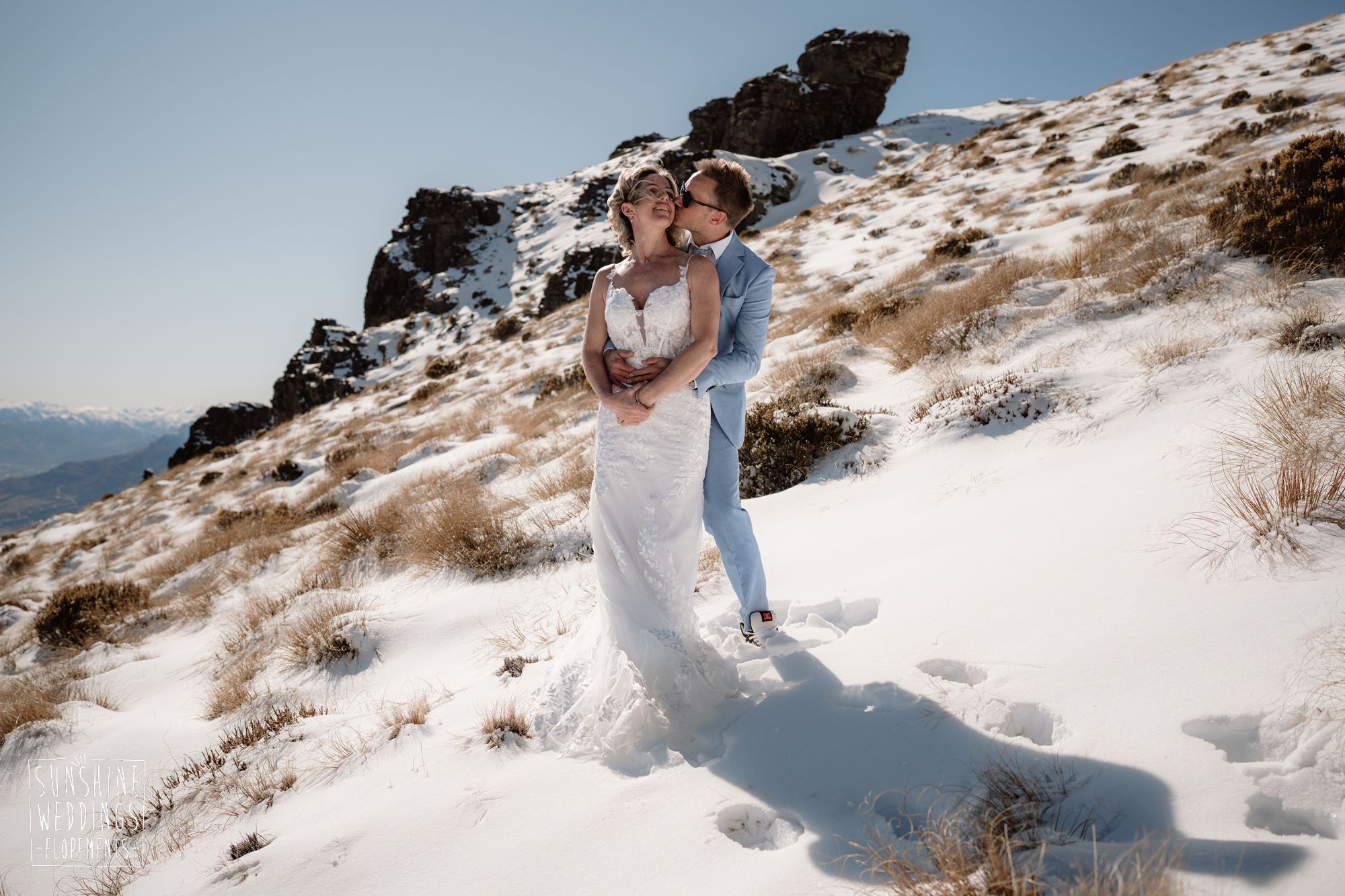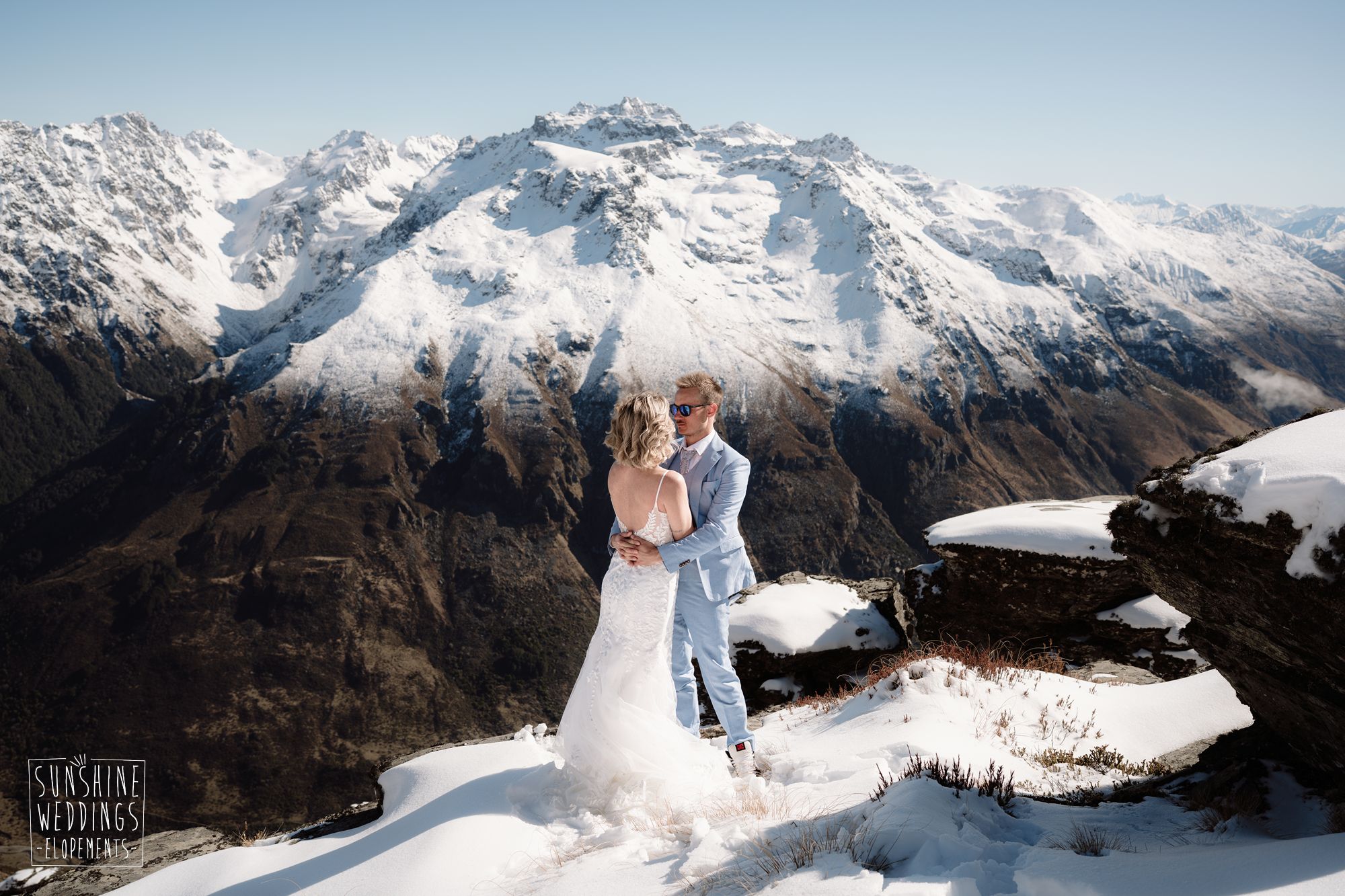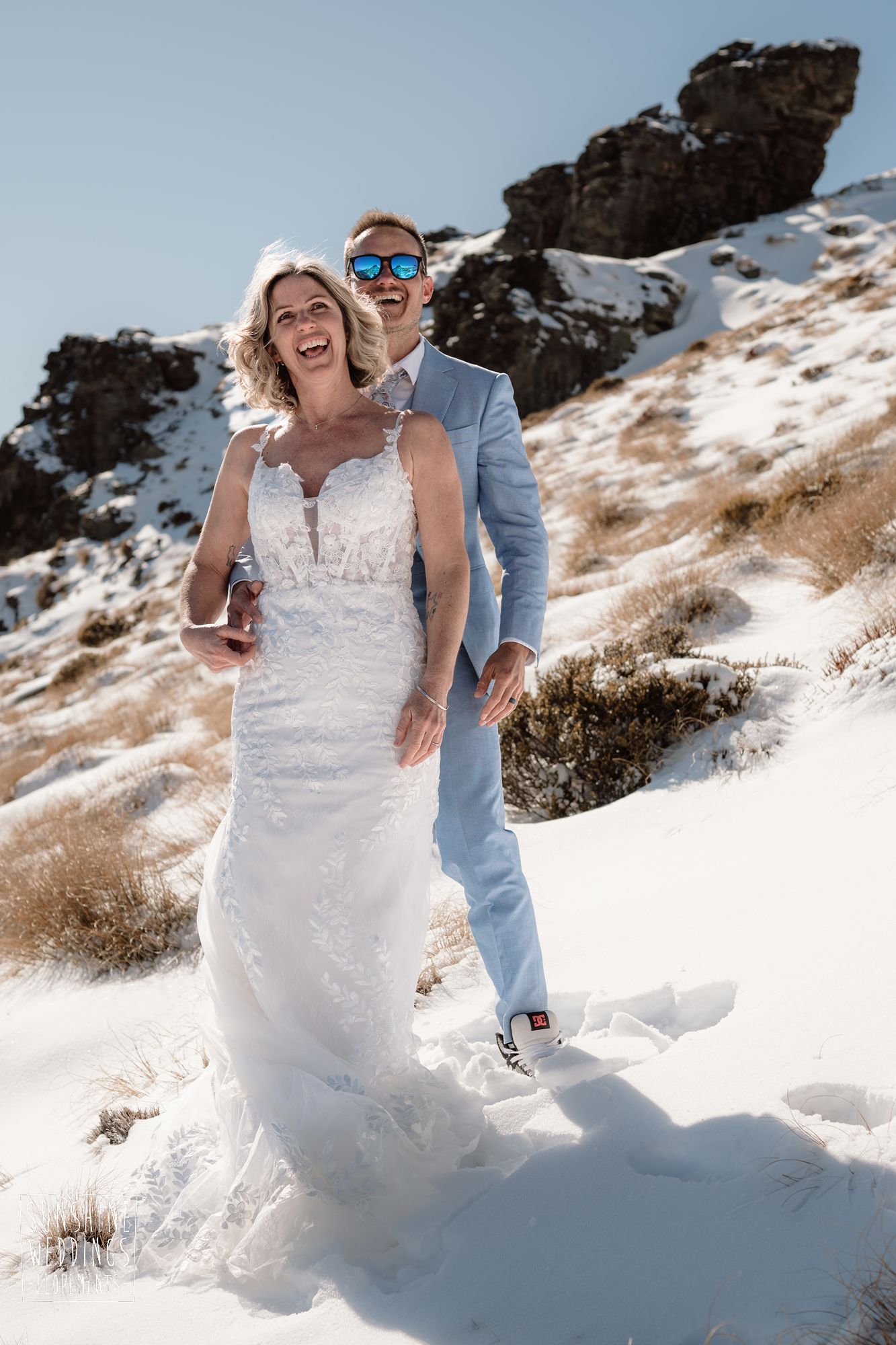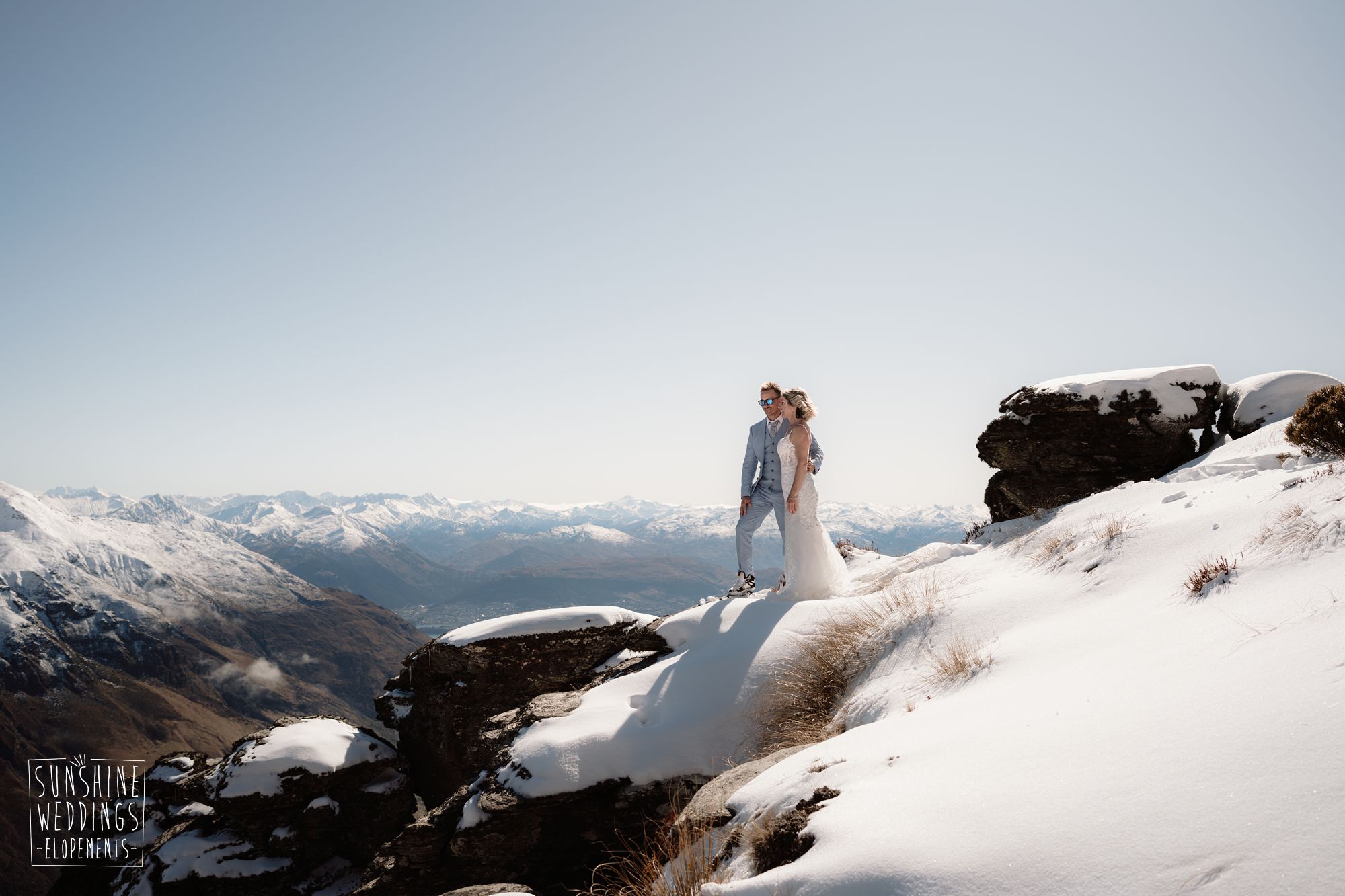 Sally and Jack had booked a trip to Queenstown for a snowboarding trip with two mates. Somewhere between booking their flights and hitting the slopes, they also decided to get married. They got in touch, and two weeks later on a clear winter morning they flew up to Bayonet Peak with their friends and said their vows in the snow.