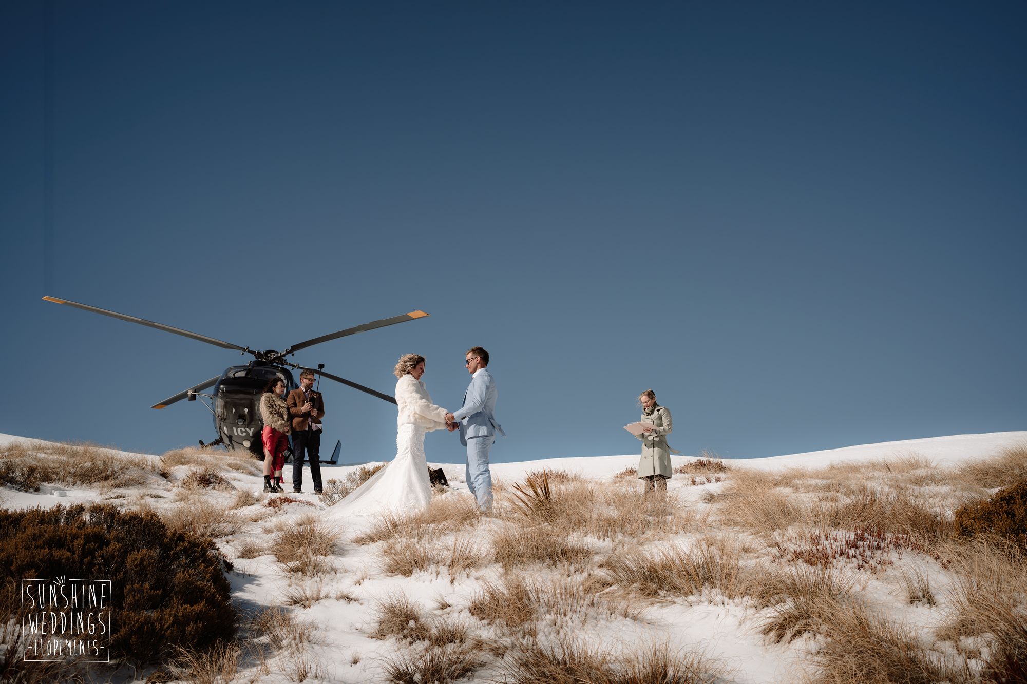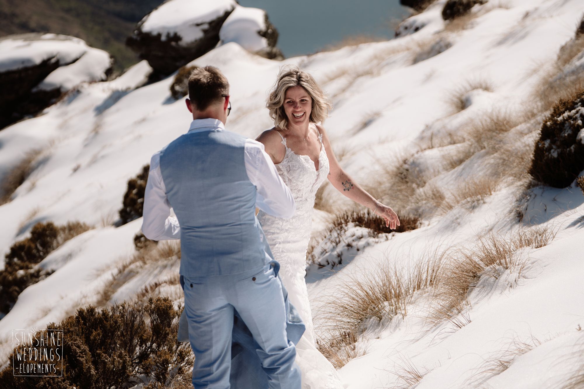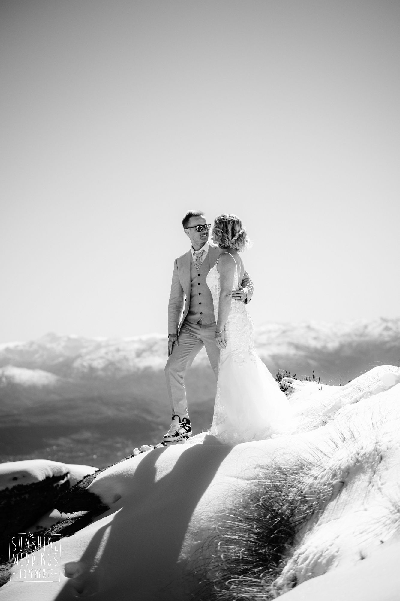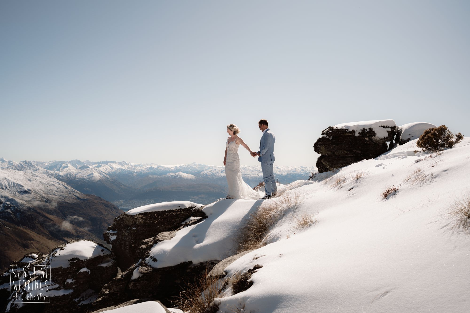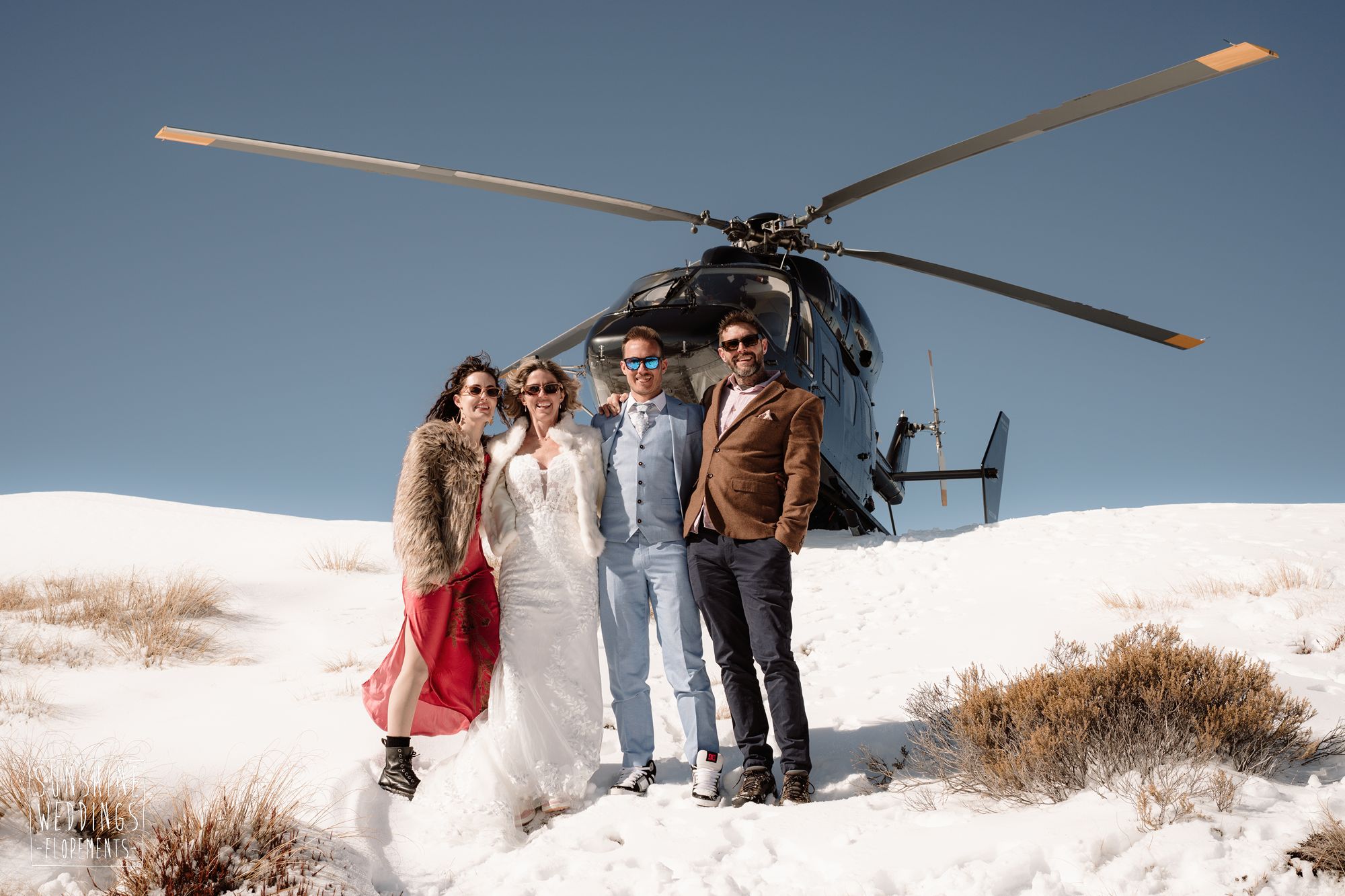 Sally and Jack had booked a trip to Queenstown for a snowboarding trip with two mates. Somewhere between booking their flights and hitting the slopes, they also decided to get married. They got in touch, and two weeks later on a clear winter morning they flew up to Bayonet Peak with their friends and said their vows in the snow.