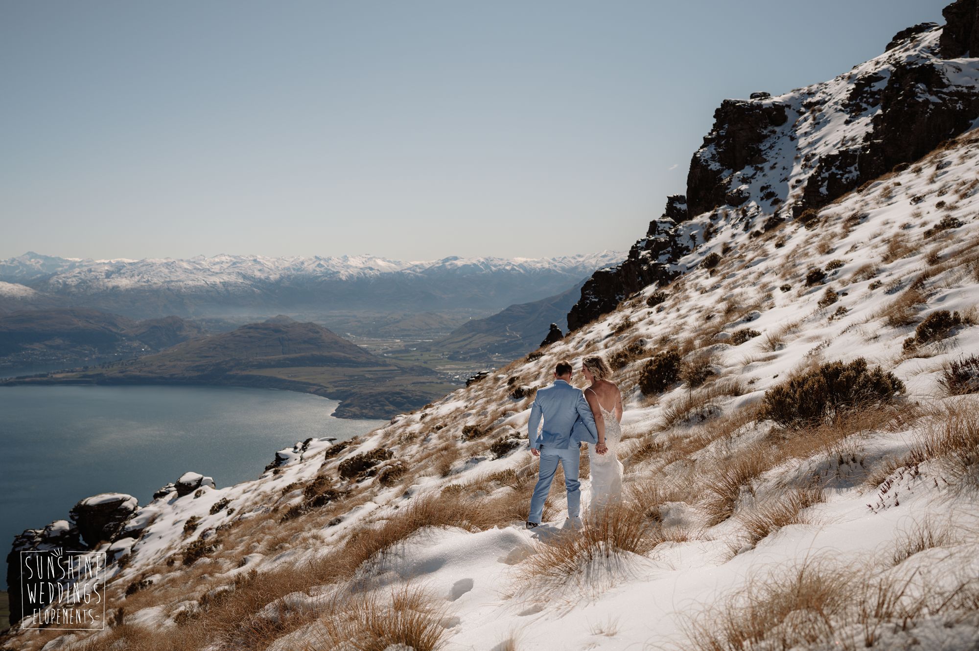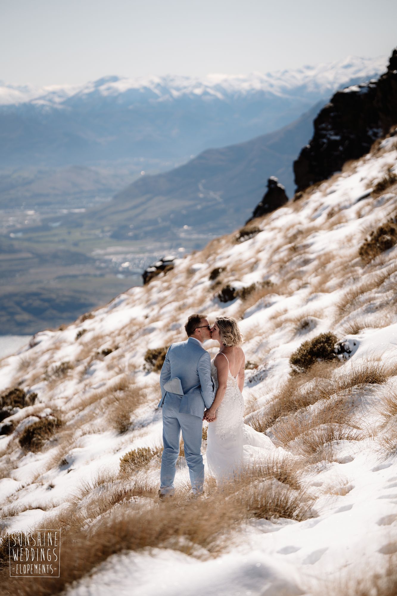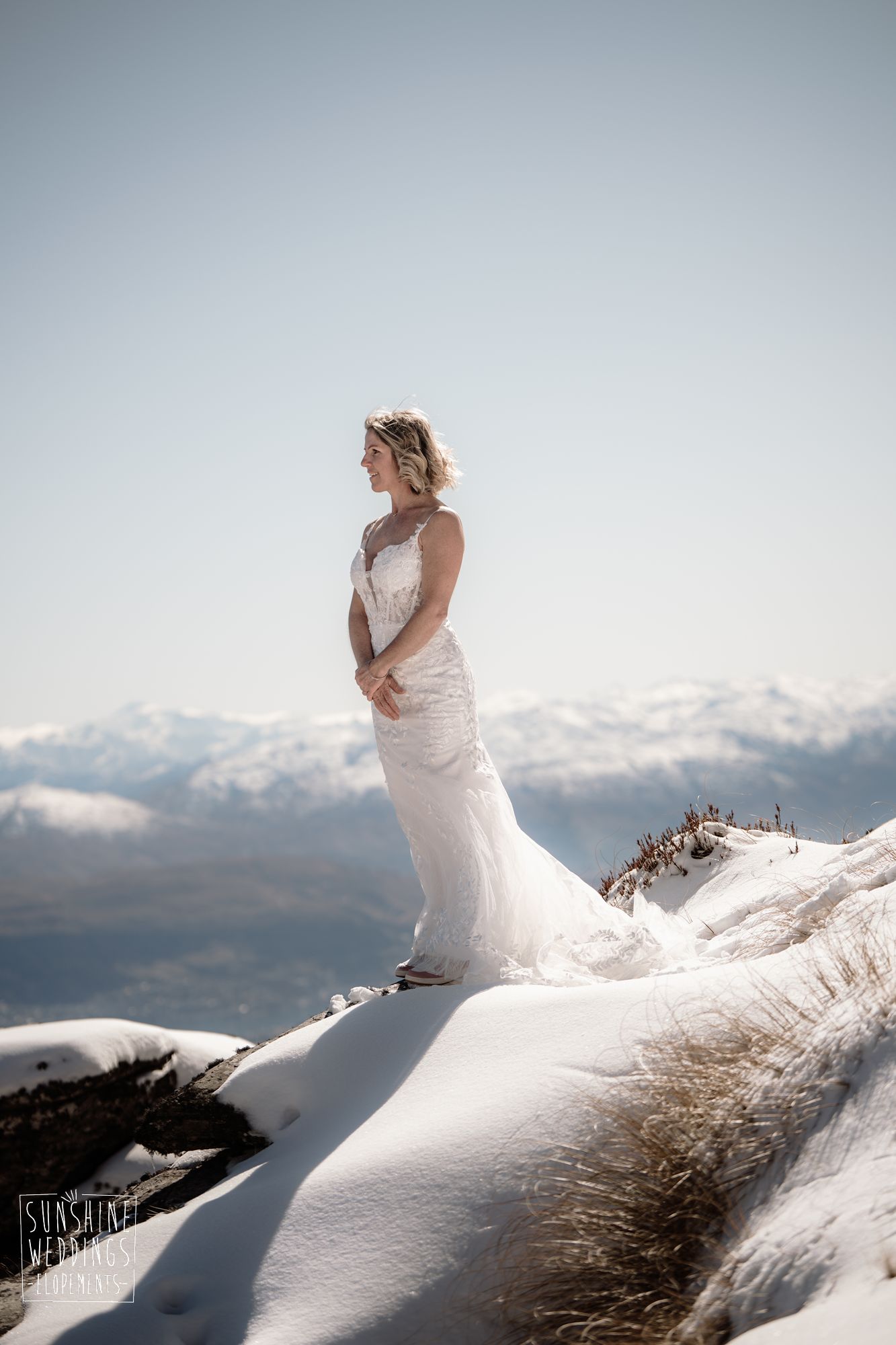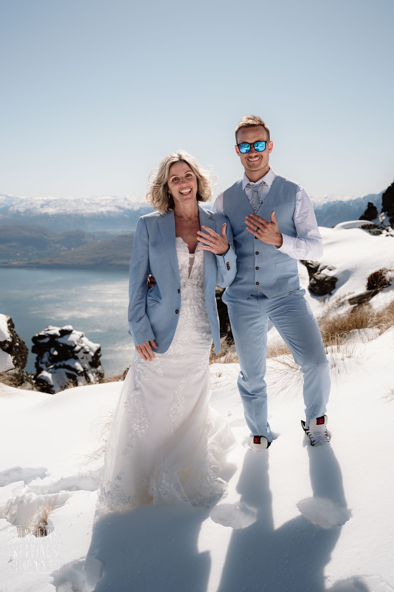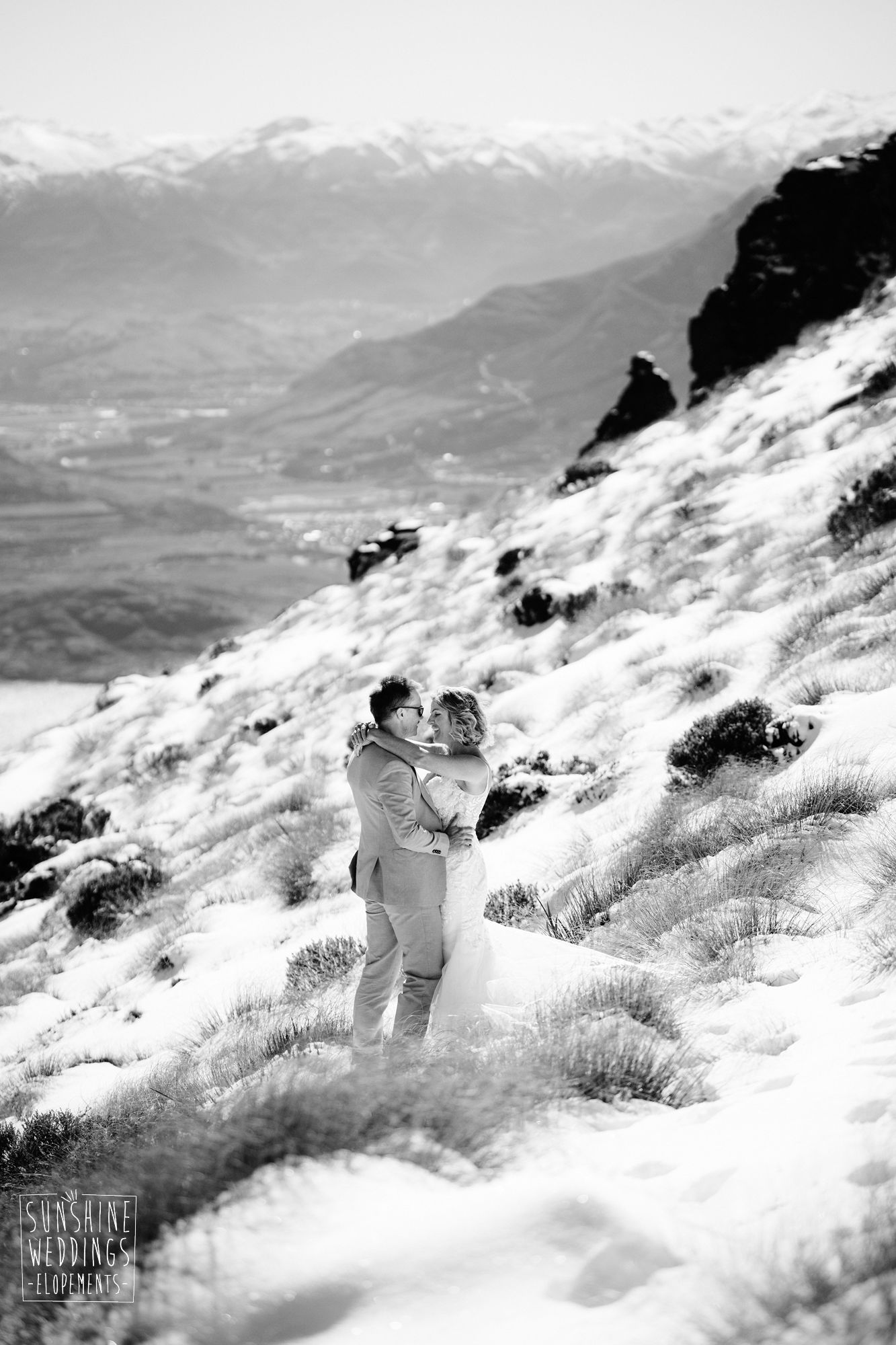 Sally and Jack had booked a trip to Queenstown for a snowboarding trip with two mates. Somewhere between booking their flights and hitting the slopes, they also decided to get married. They got in touch, and two weeks later on a clear winter morning they flew up to Bayonet Peak with their friends and said their vows in the snow.
