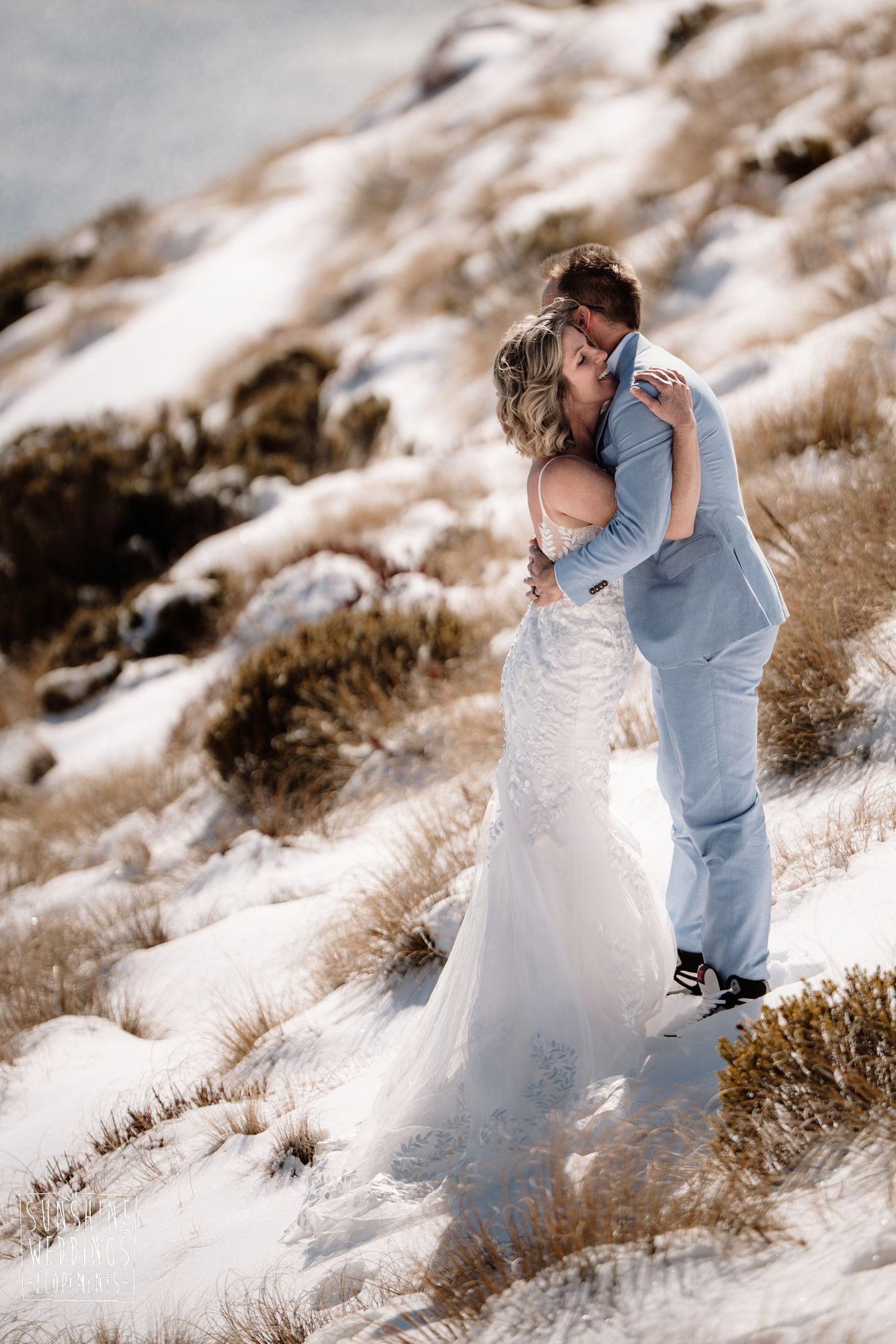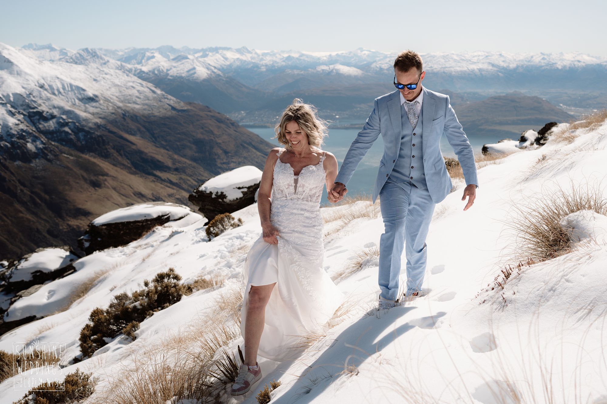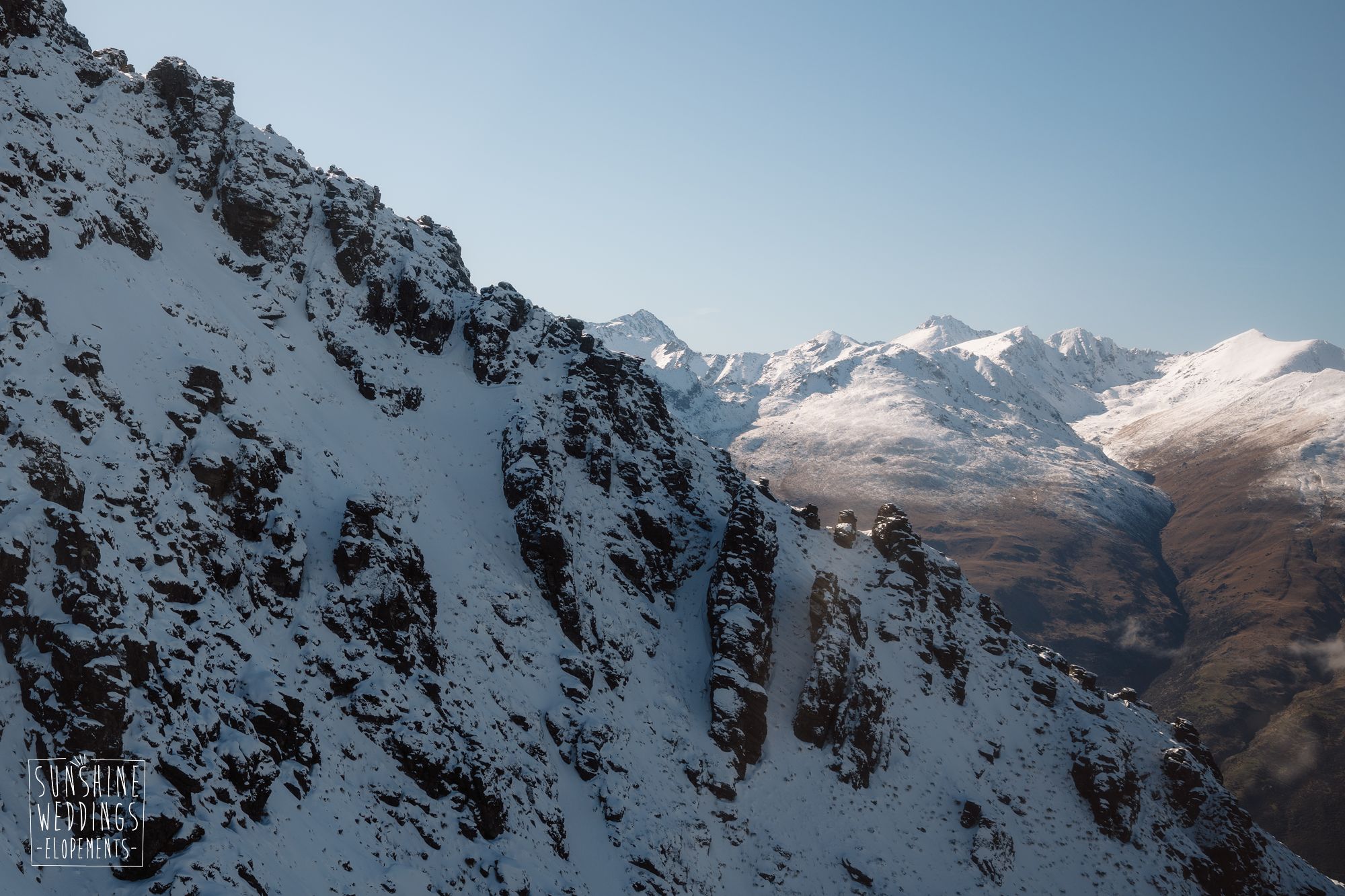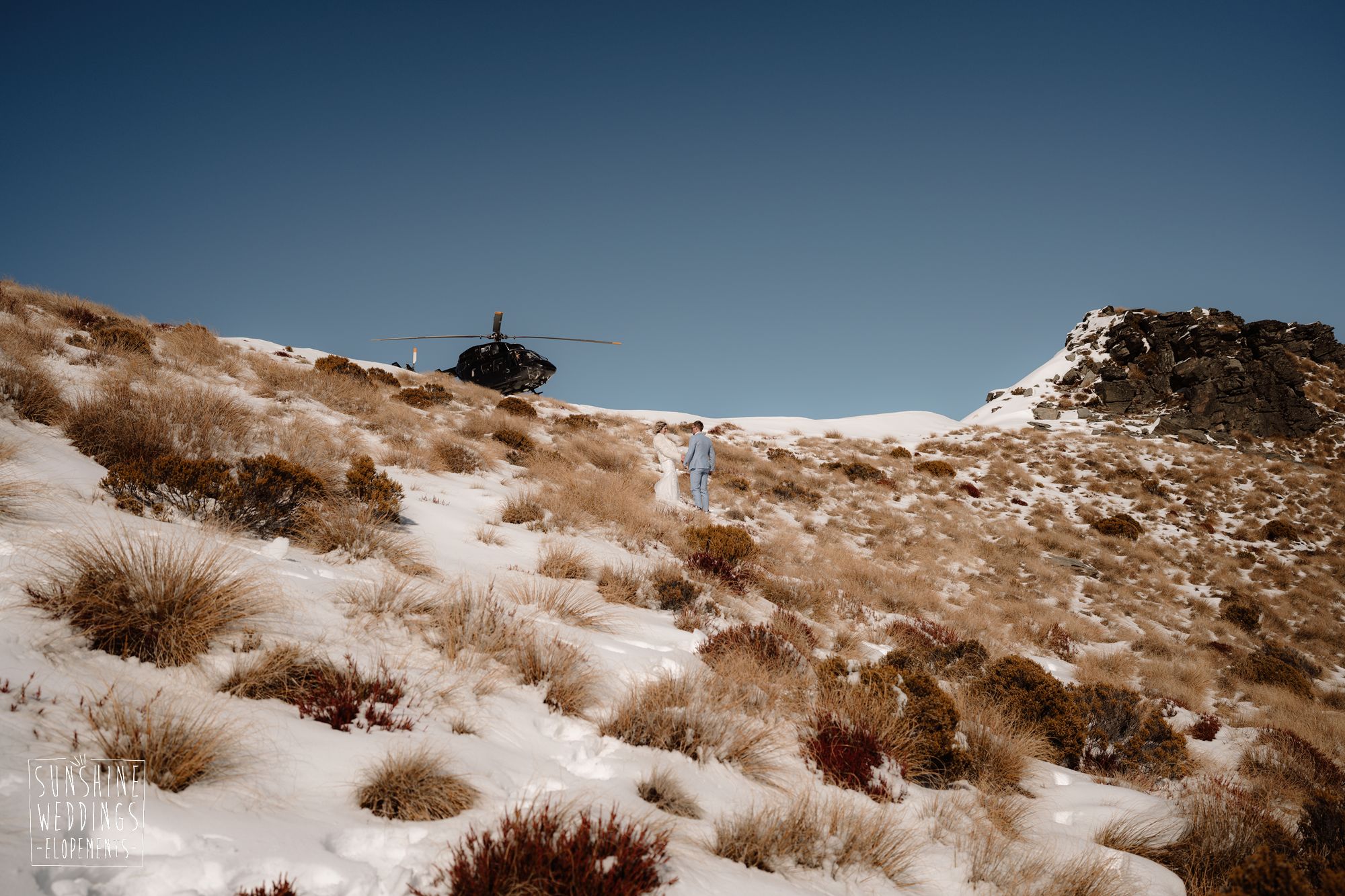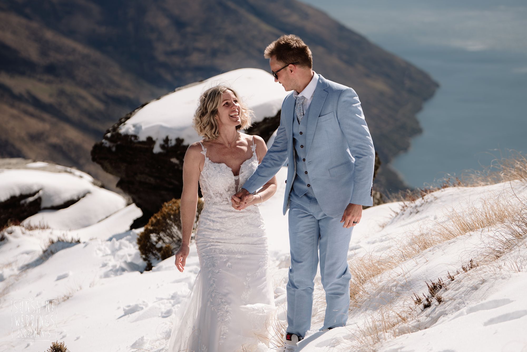 Sally and Jack had booked a trip to Queenstown for a snowboarding trip with two mates. Somewhere between booking their flights and hitting the slopes, they also decided to get married. They got in touch, and two weeks later on a clear winter morning they flew up to Bayonet Peak with their friends and said their vows in the snow.