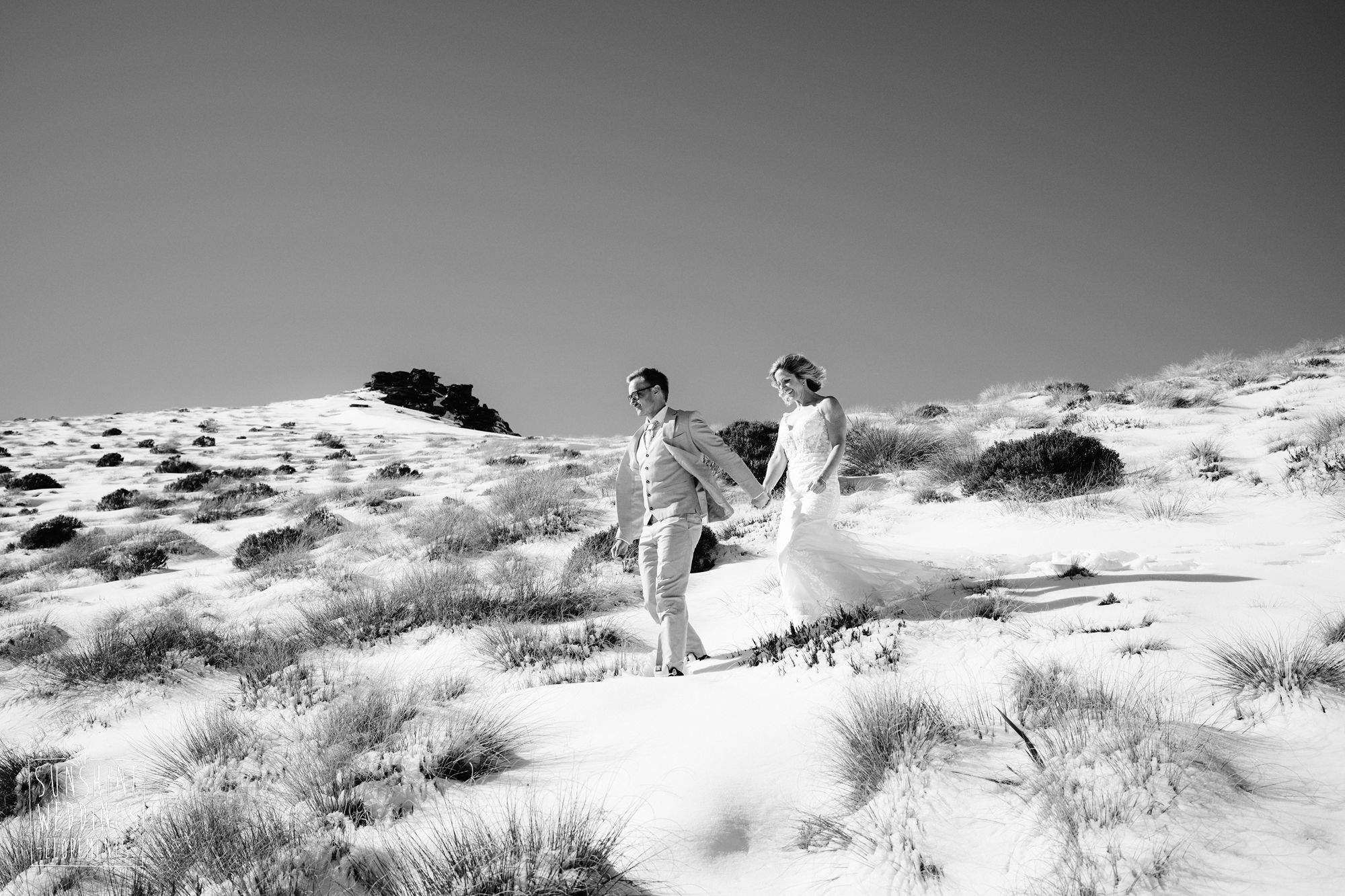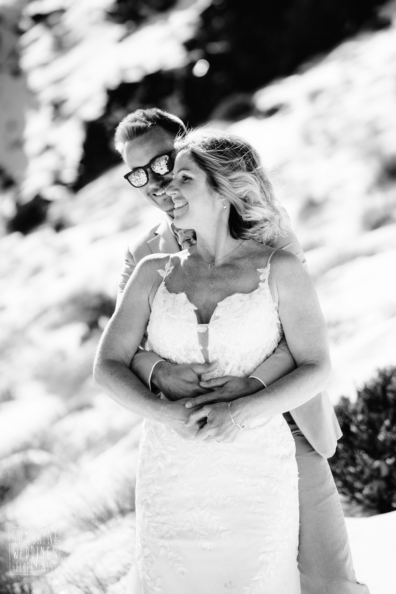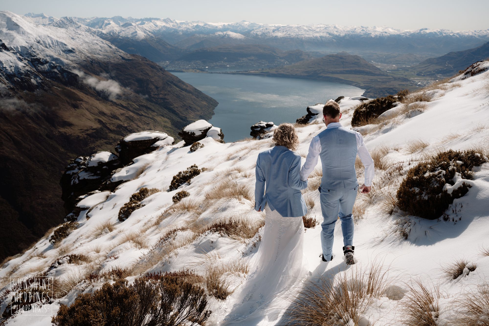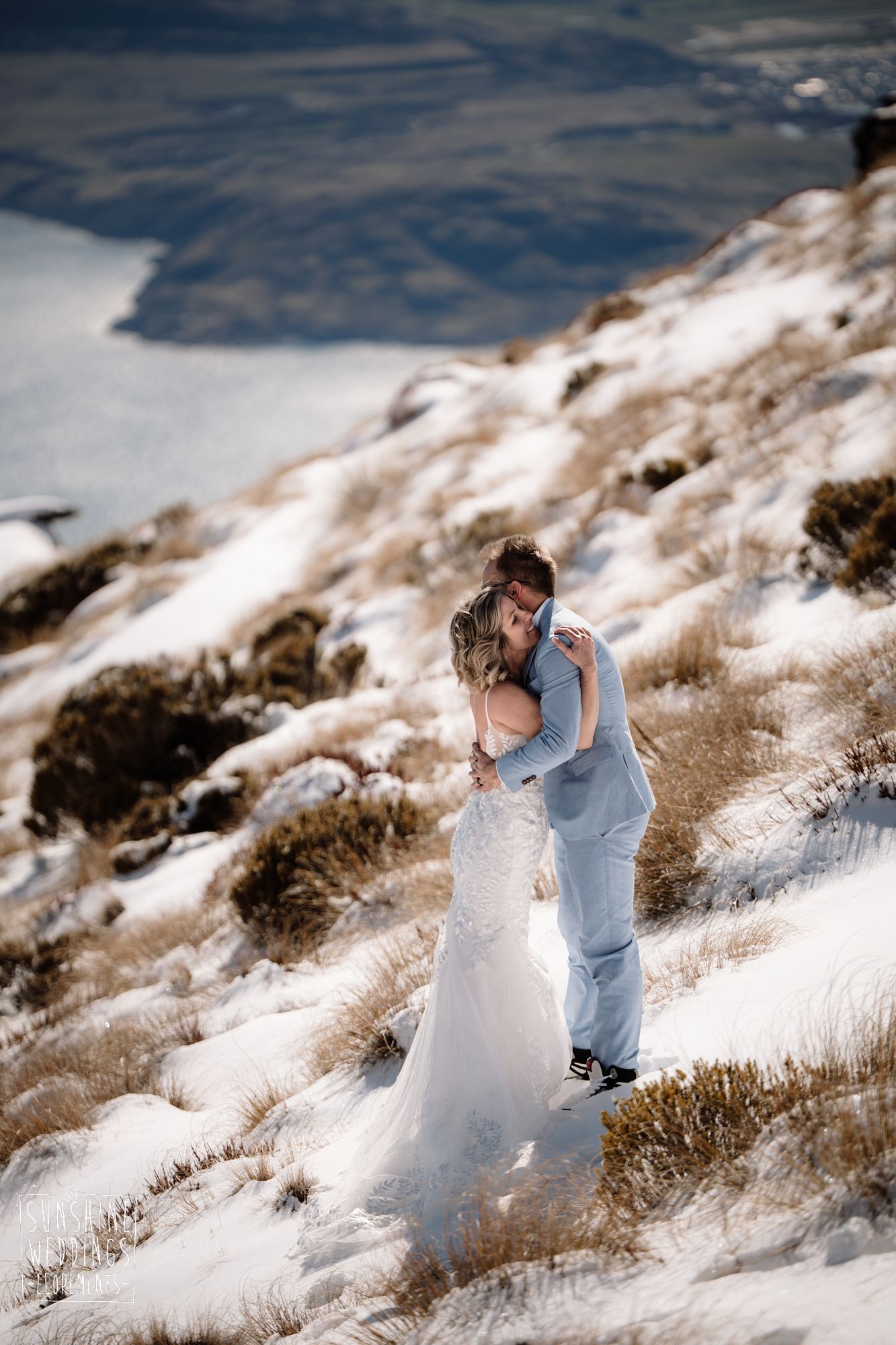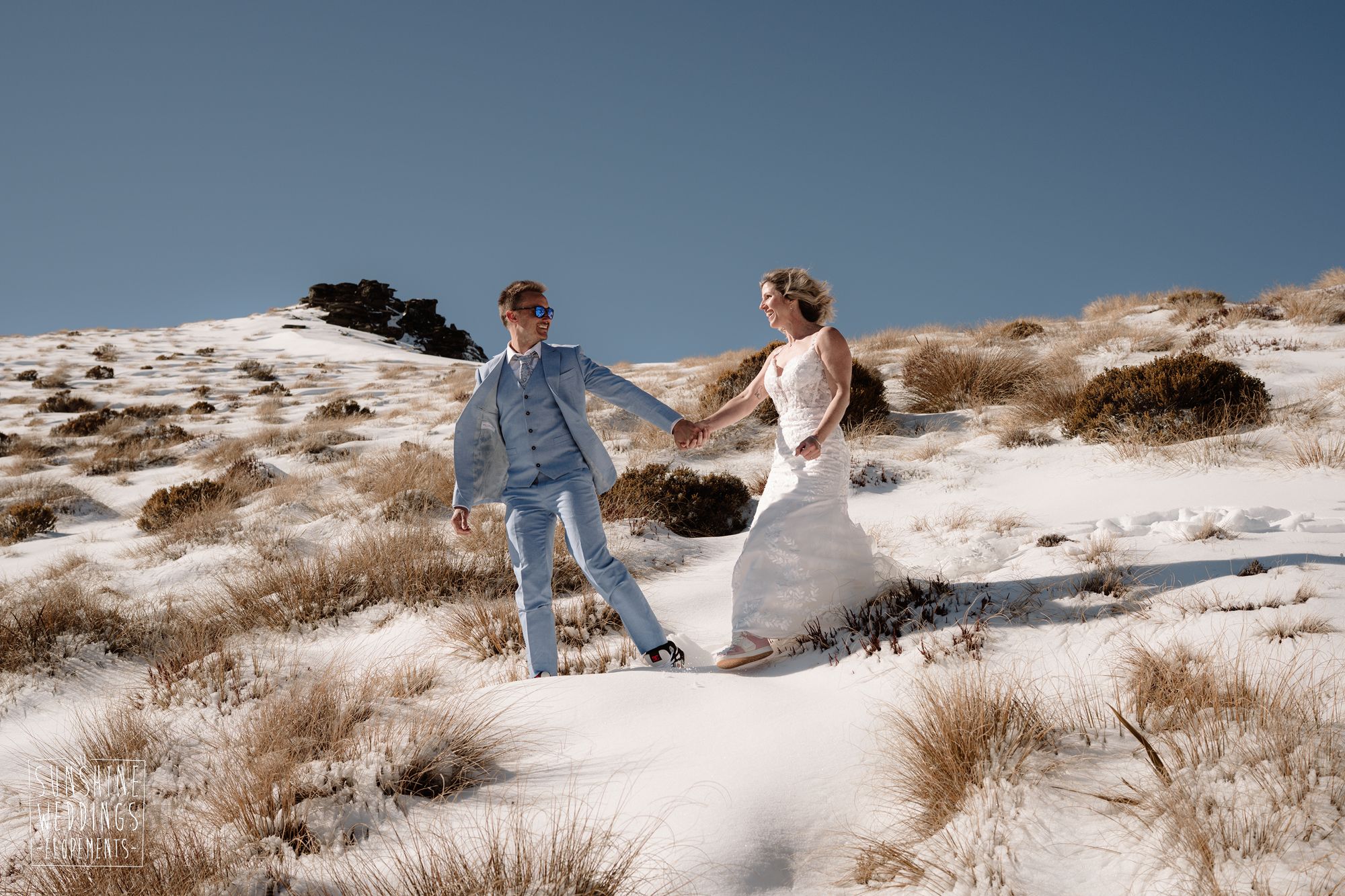 Sally and Jack had booked a trip to Queenstown for a snowboarding trip with two mates. Somewhere between booking their flights and hitting the slopes, they also decided to get married. They got in touch, and two weeks later on a clear winter morning they flew up to Bayonet Peak with their friends and said their vows in the snow.