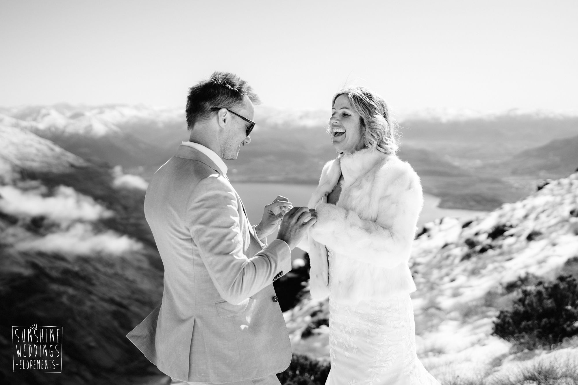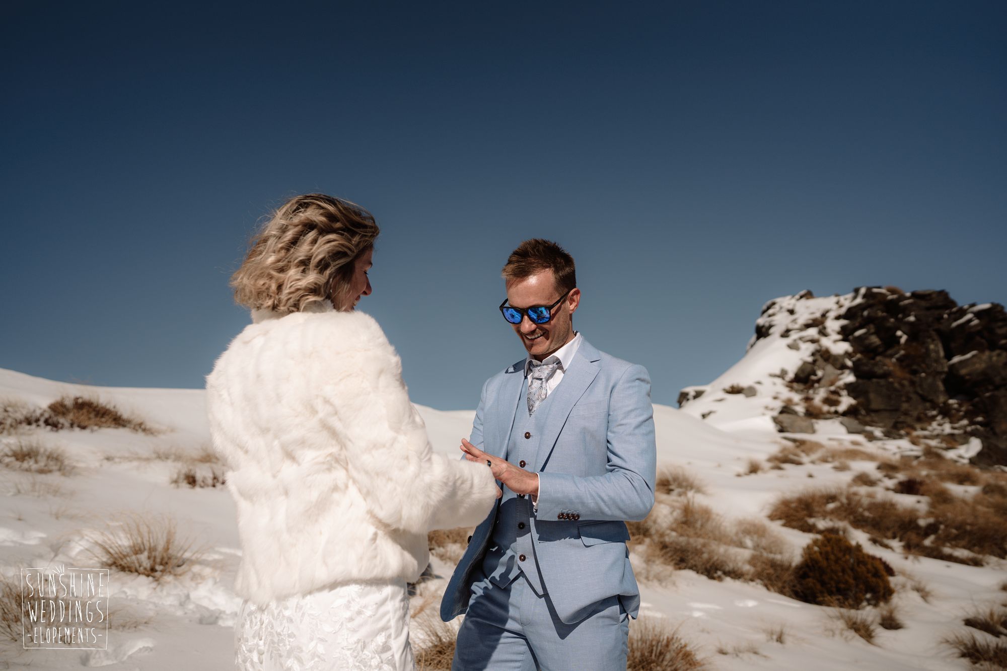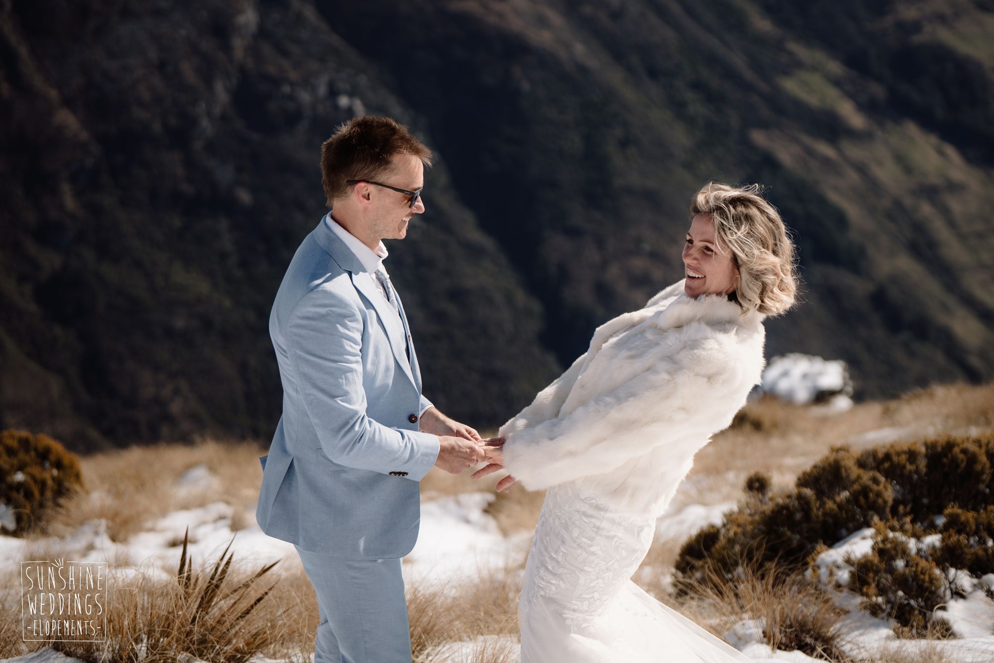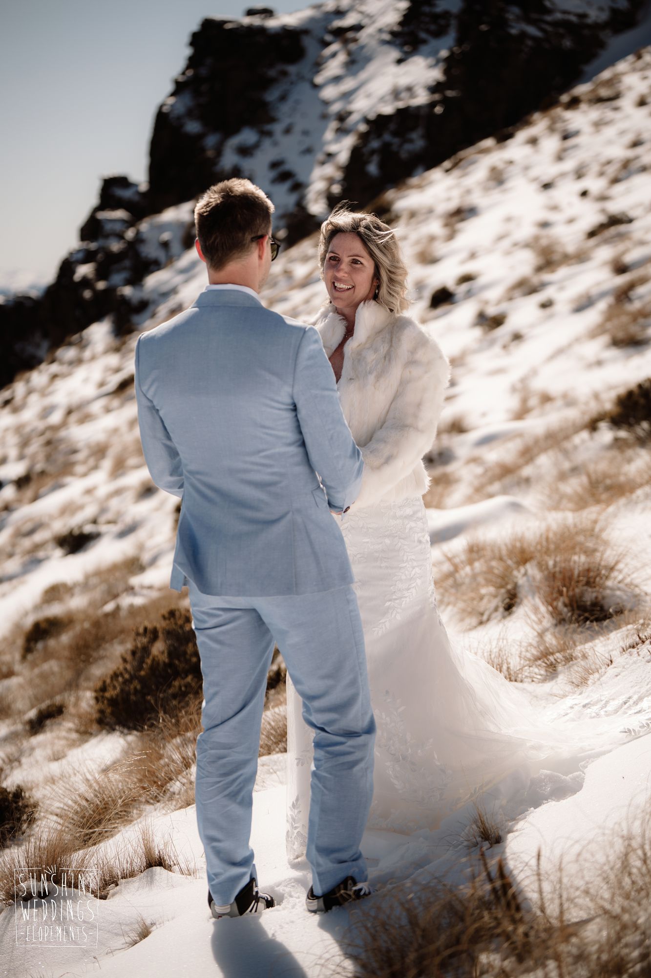 When you’re getting married in the snow in Queenstown it’s likely to be a bit chilly. Sally borrowed one of our complimentary wedding furs — a white rabbit fur jacket from Hollies of Denmark. We keep a selection of furs available for exactly this situation, because the mountains in winter are very good-looking but also genuinely cold.