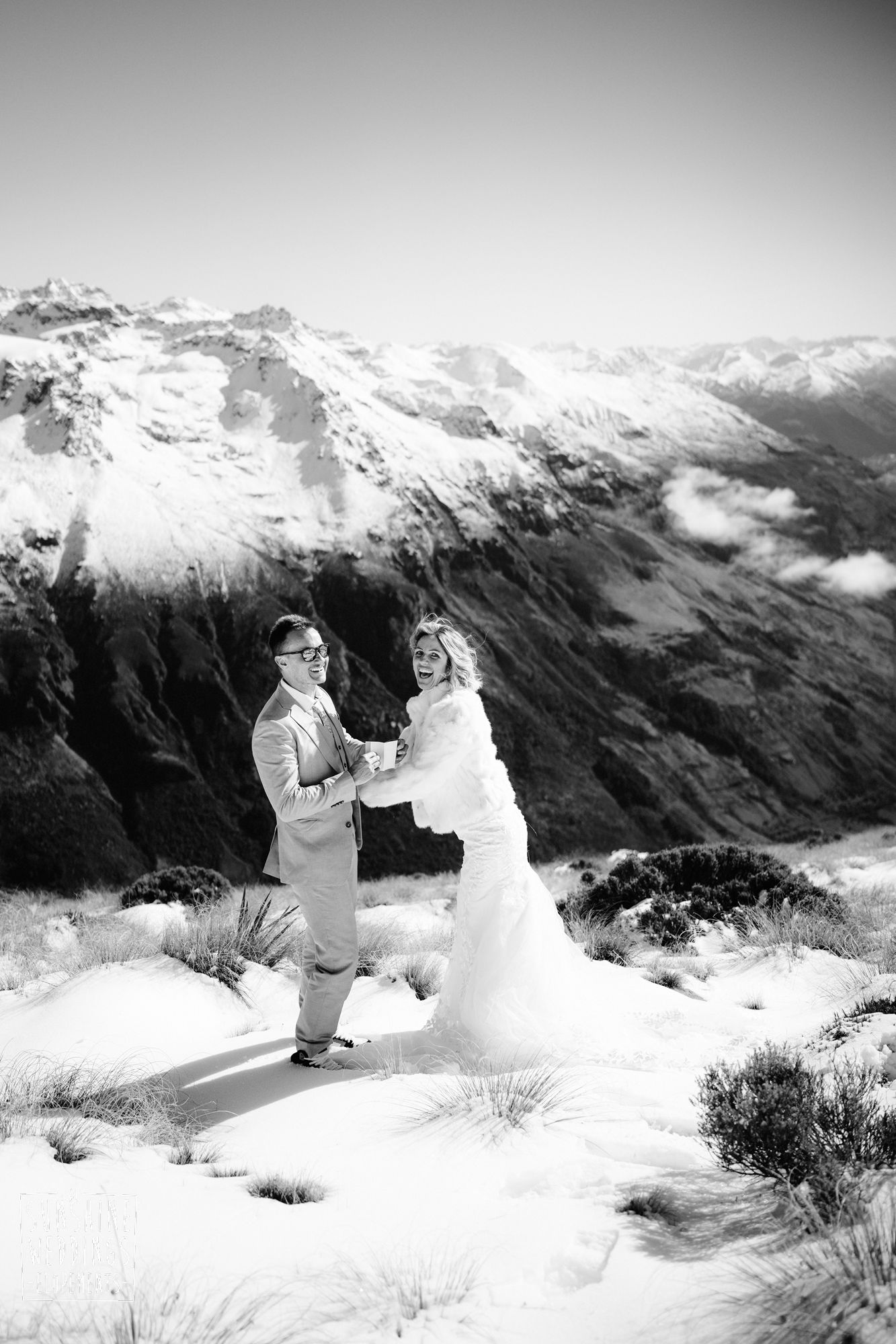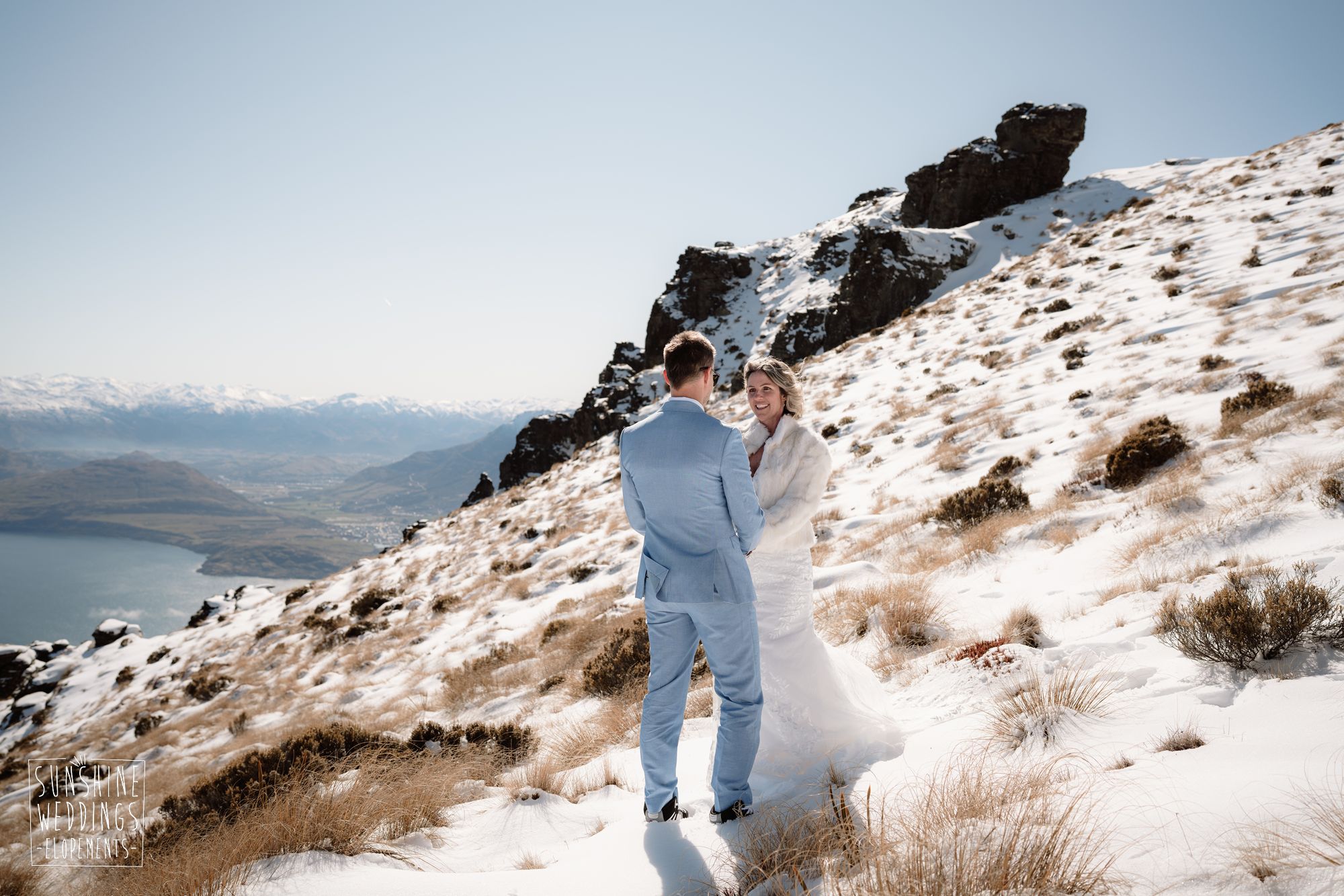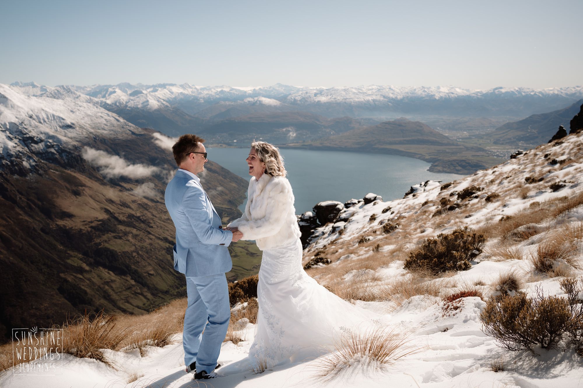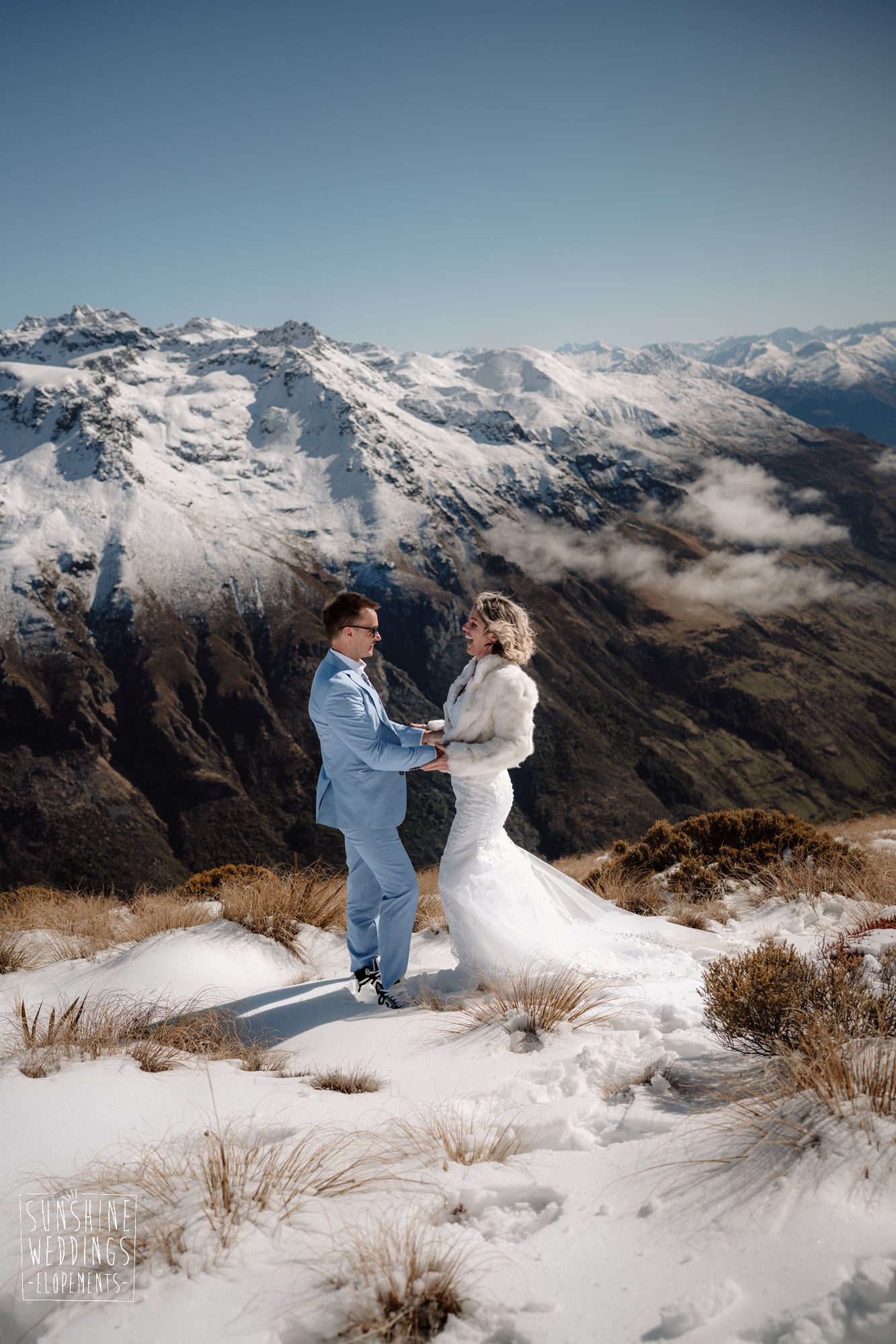 When you’re getting married in the snow in Queenstown it’s likely to be a bit chilly. Sally borrowed one of our complimentary wedding furs — a white rabbit fur jacket from Hollies of Denmark. We keep a selection of furs available for exactly this situation, because the mountains in winter are very good-looking but also genuinely cold.