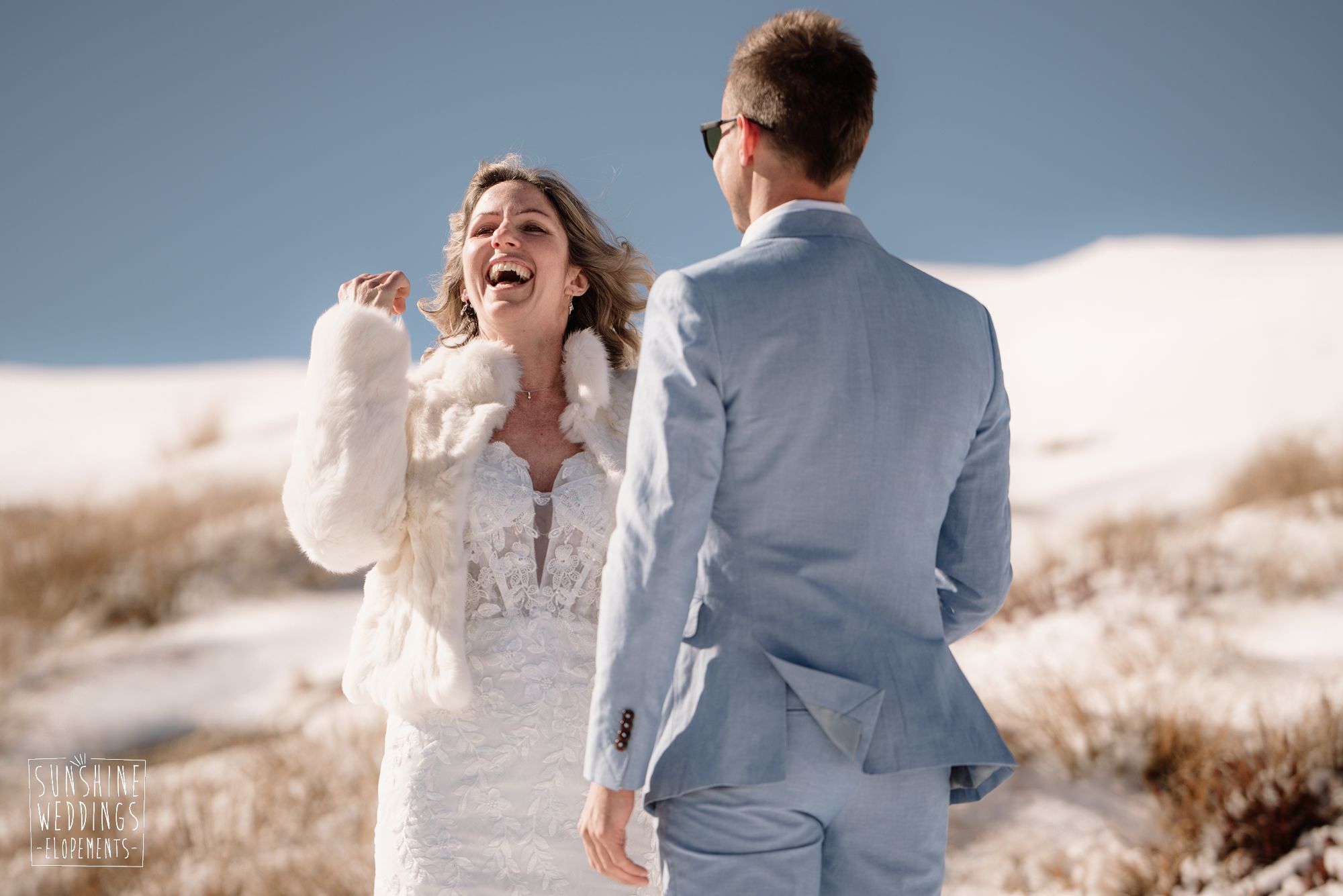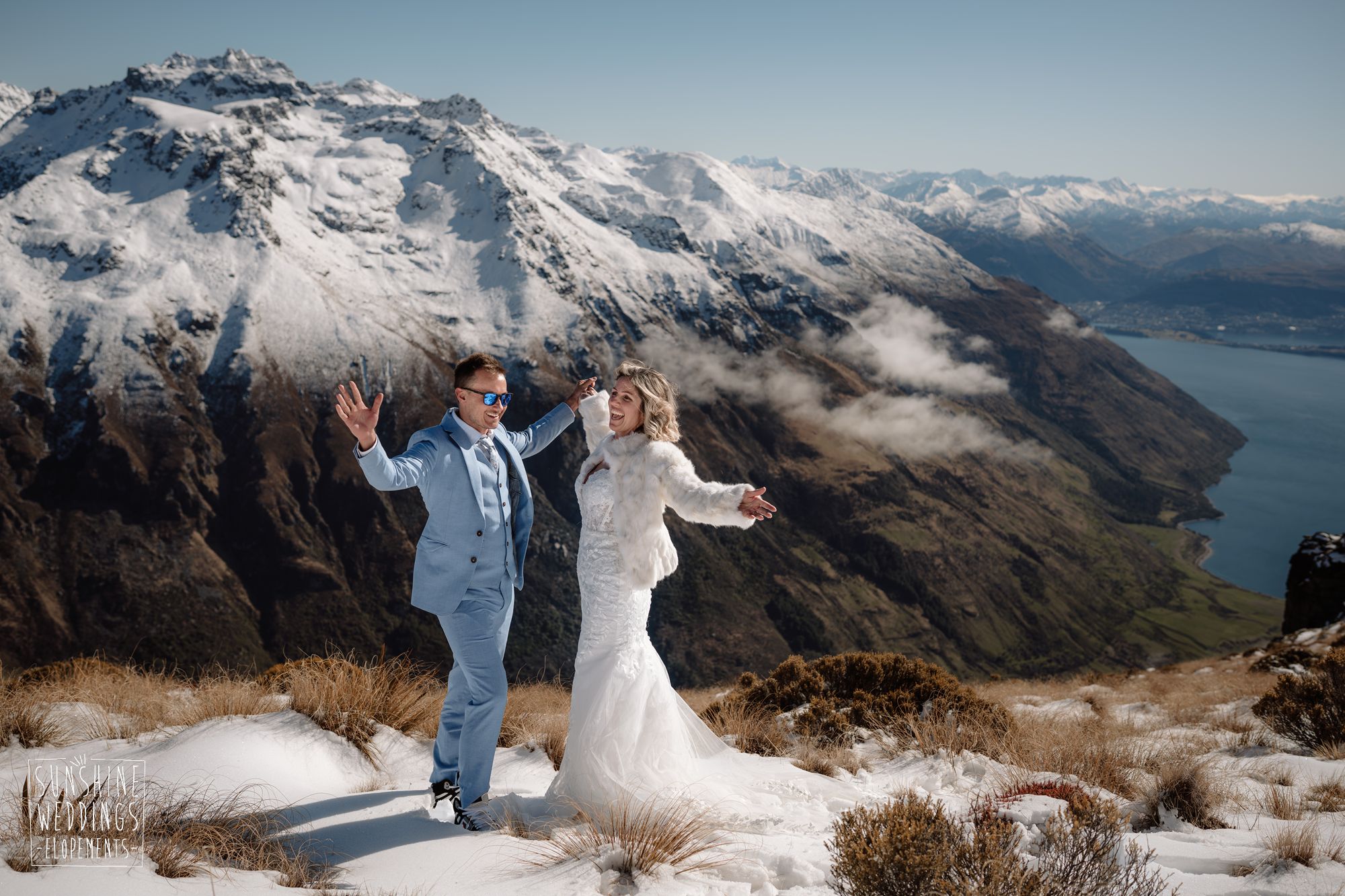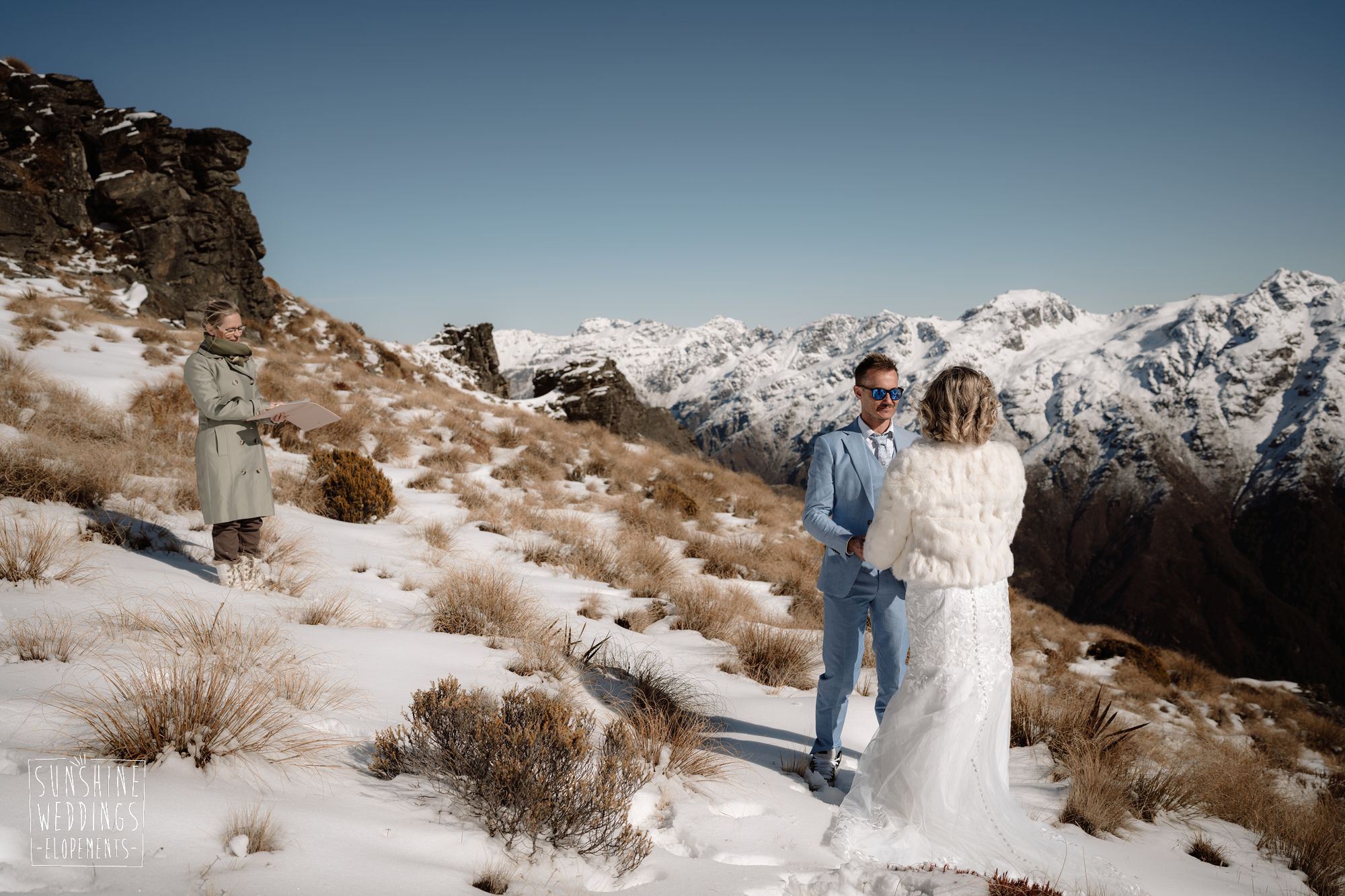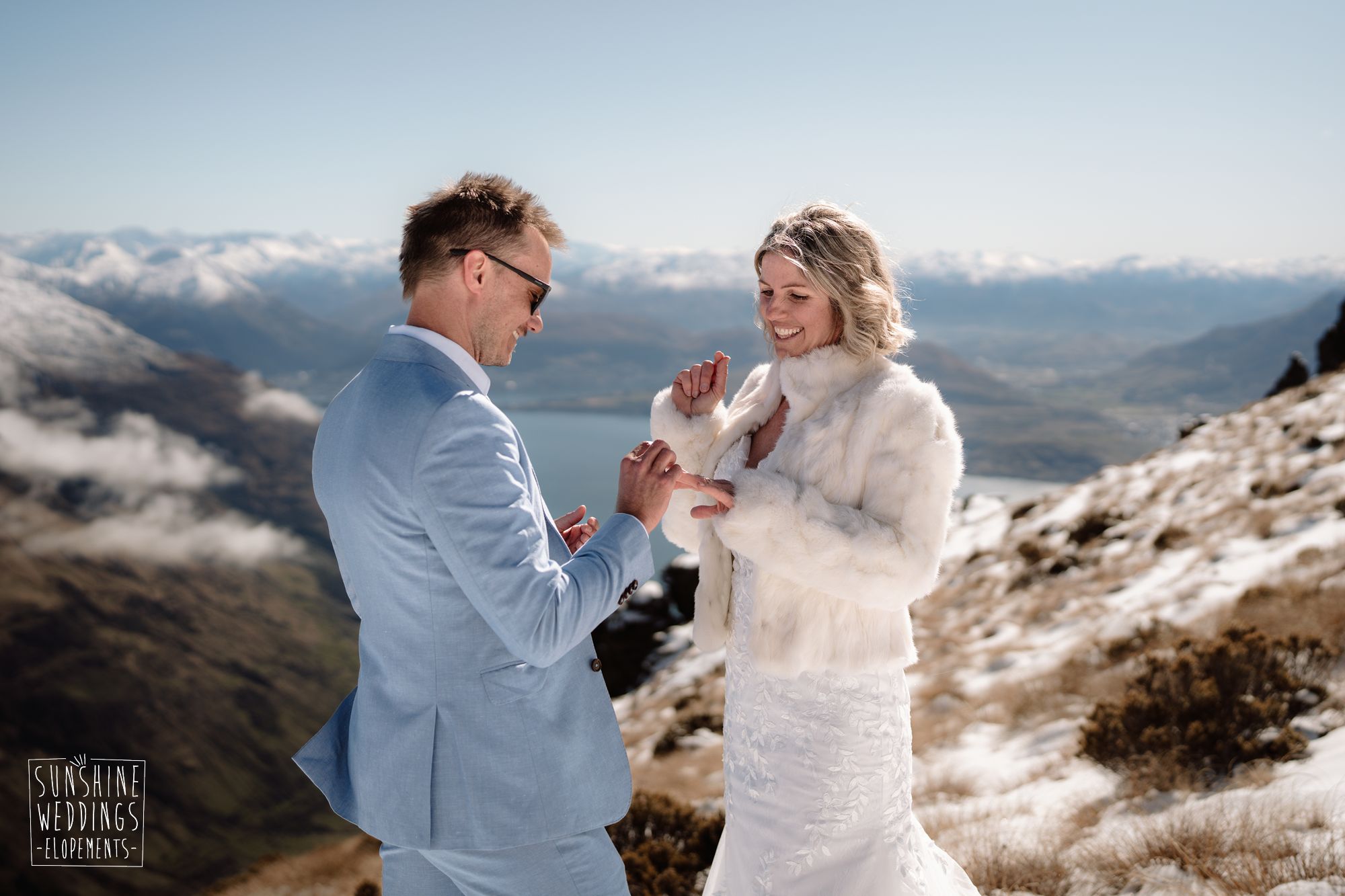 When you’re getting married in the snow in Queenstown it’s likely to be a bit chilly. Sally borrowed one of our complimentary wedding furs — a white rabbit fur jacket from Hollies of Denmark. We keep a selection of furs available for exactly this situation, because the mountains in winter are very good-looking but also genuinely cold.