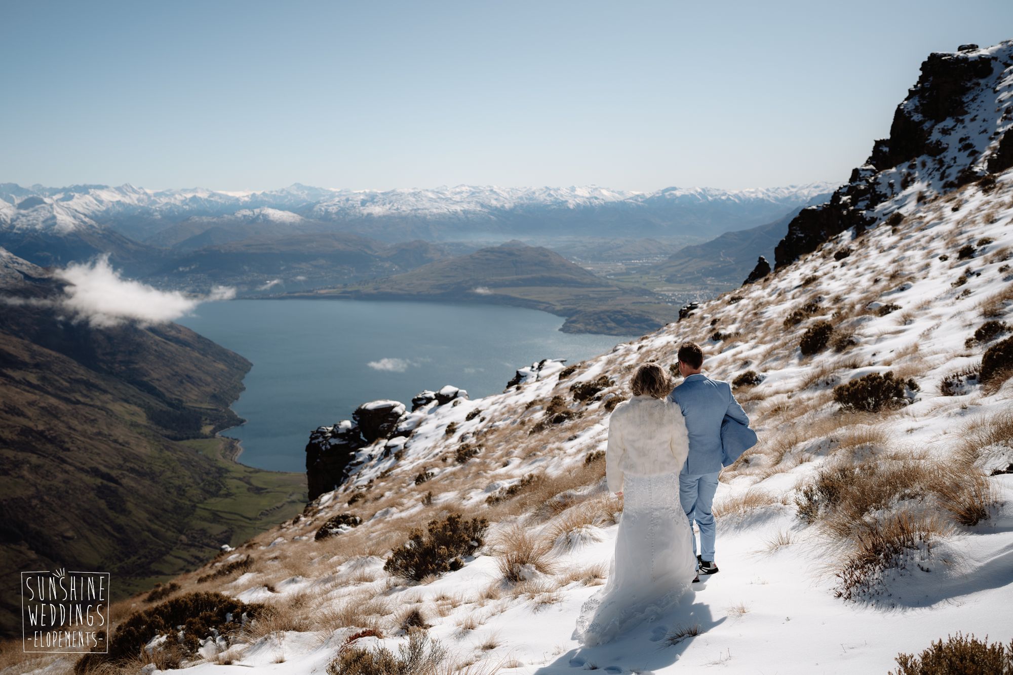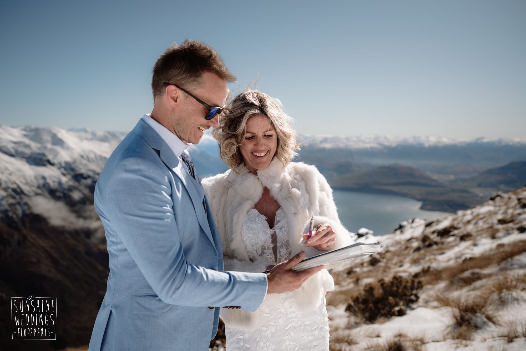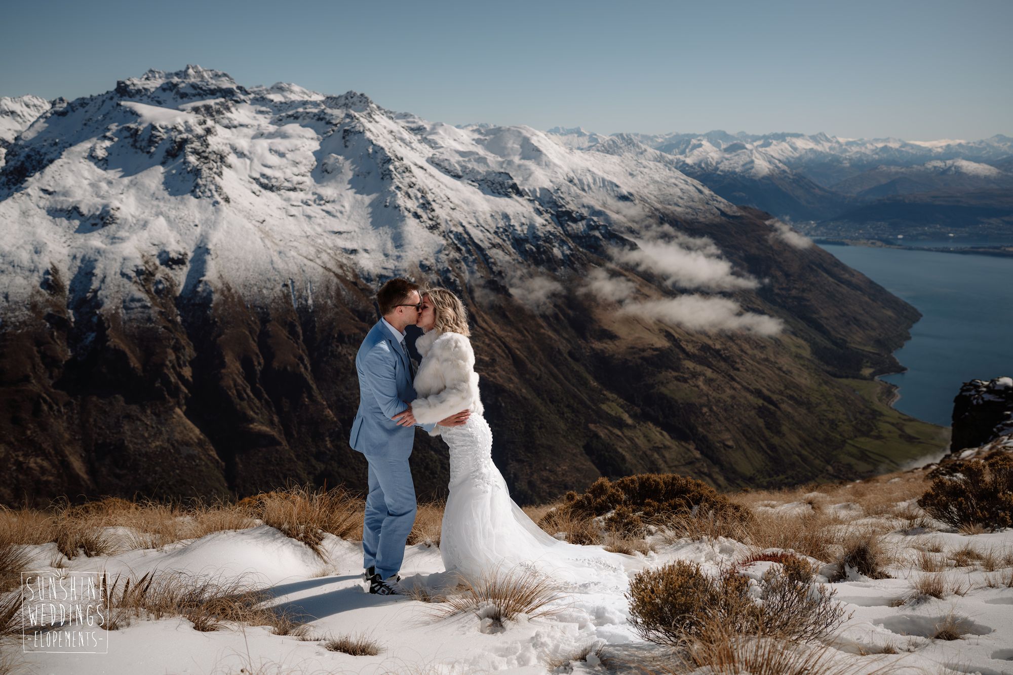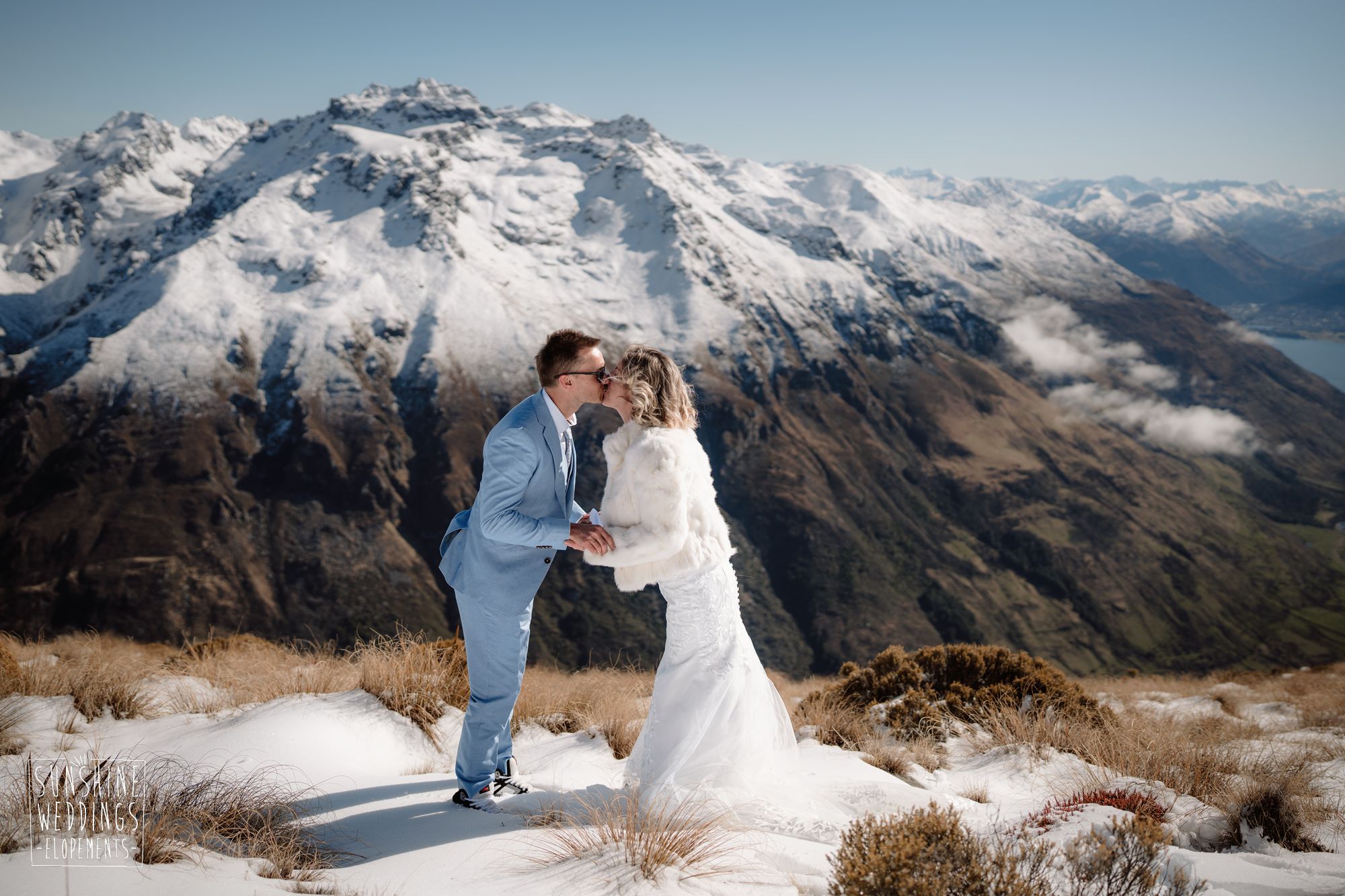 When you’re getting married in the snow in Queenstown it’s likely to be a bit chilly. Sally borrowed one of our complimentary wedding furs — a white rabbit fur jacket from Hollies of Denmark. We keep a selection of furs available for exactly this situation, because the mountains in winter are very good-looking but also genuinely cold.