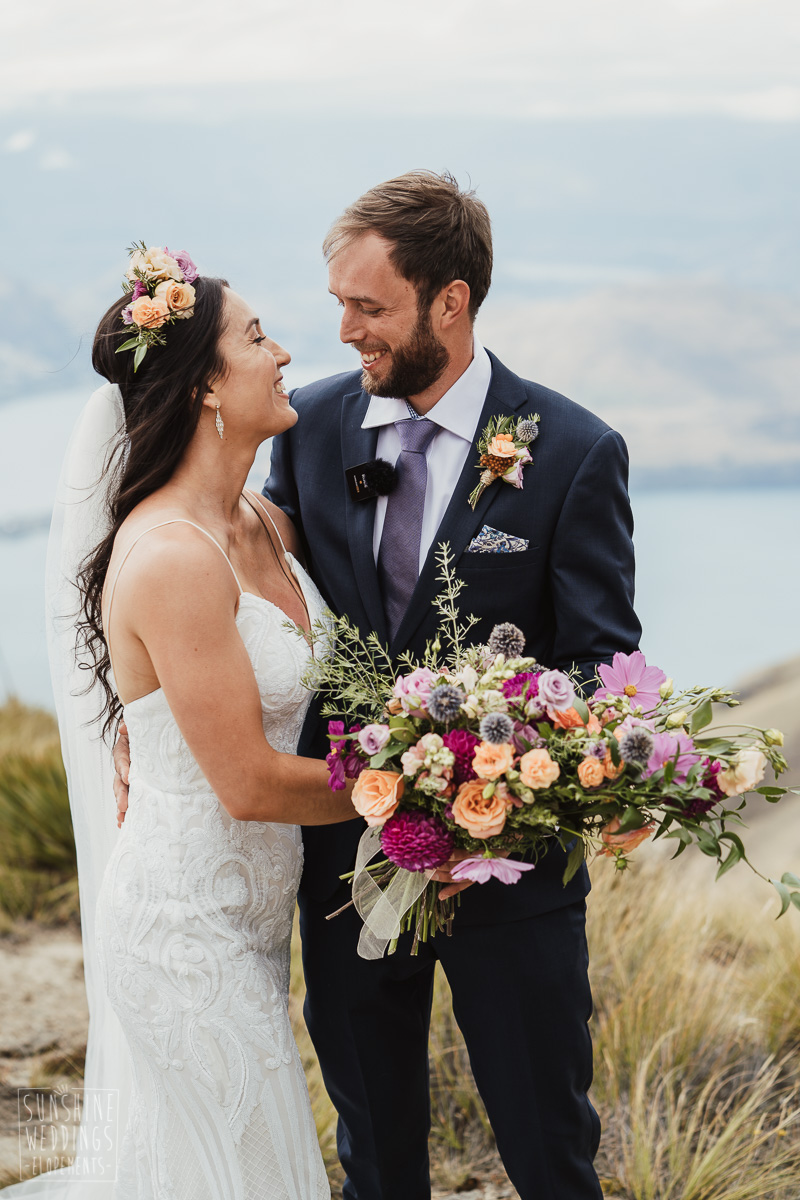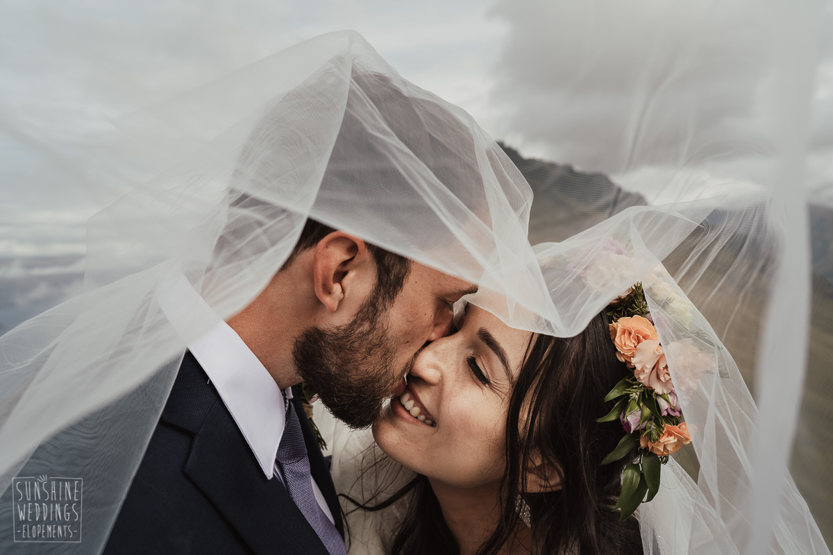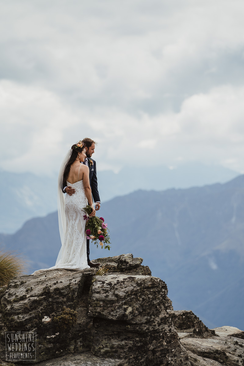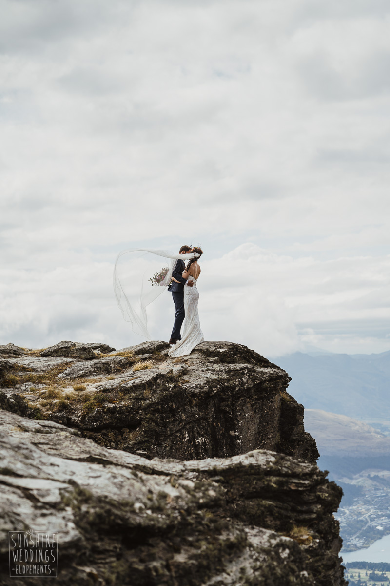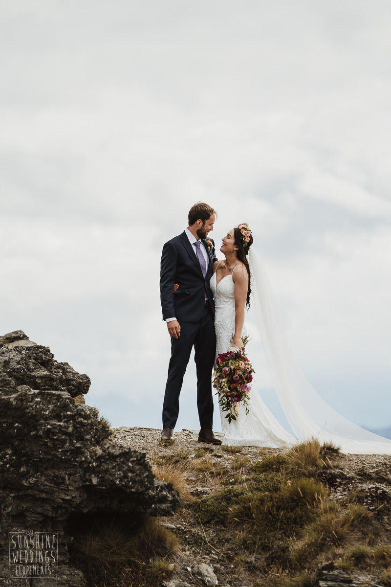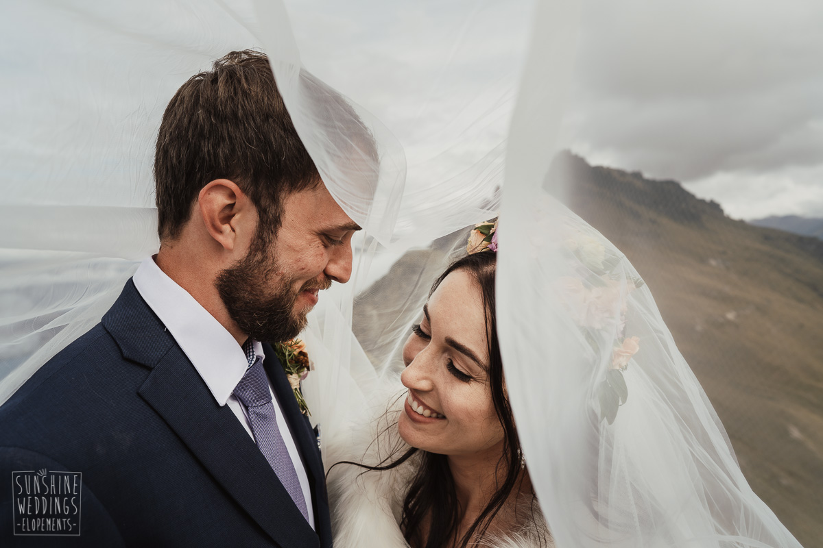 Jade and Joseph could not stop smiling all day. And who could blame them! Their ceremony was at The Ledge on Cecil Peak, followed by a second landing at Bayonet Peak. Jade’s beautiful flowers and flower crown suited the setting perfectly and we can’t go past a good veil shot or two.