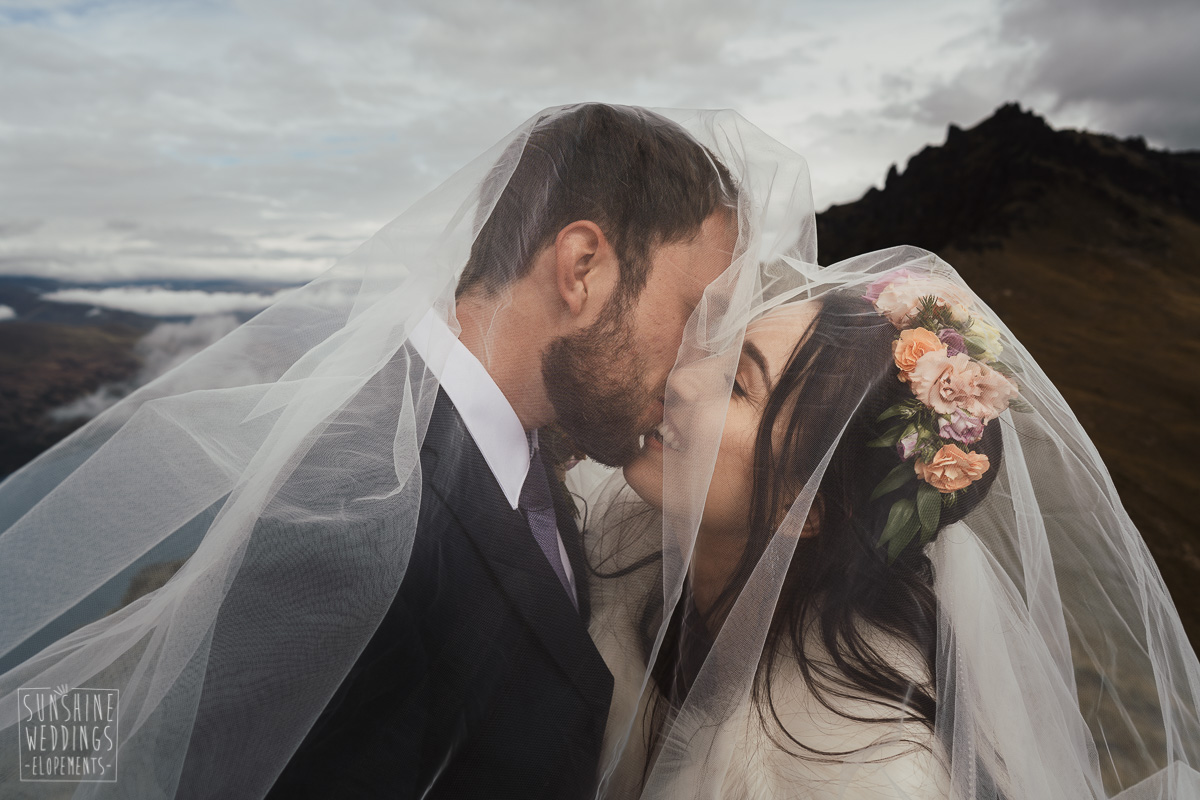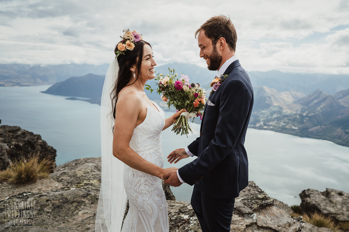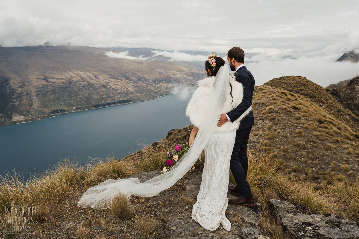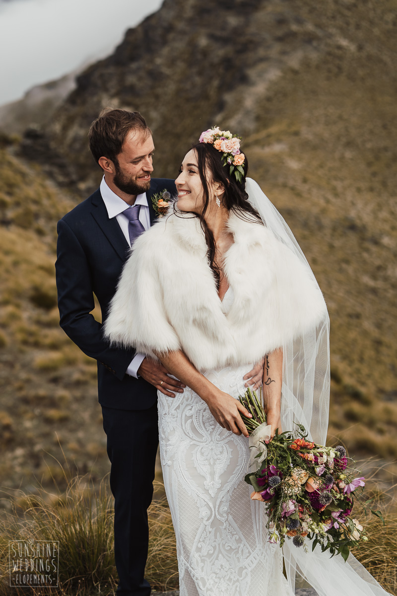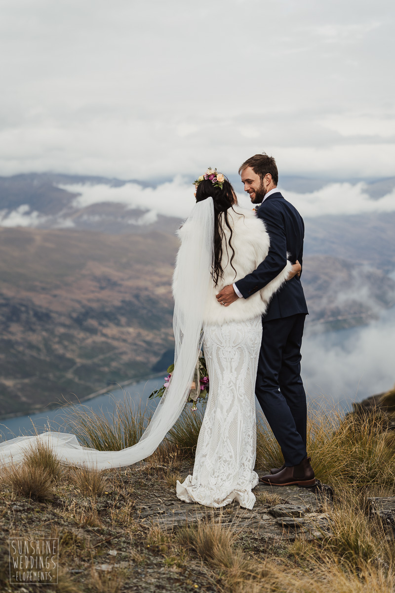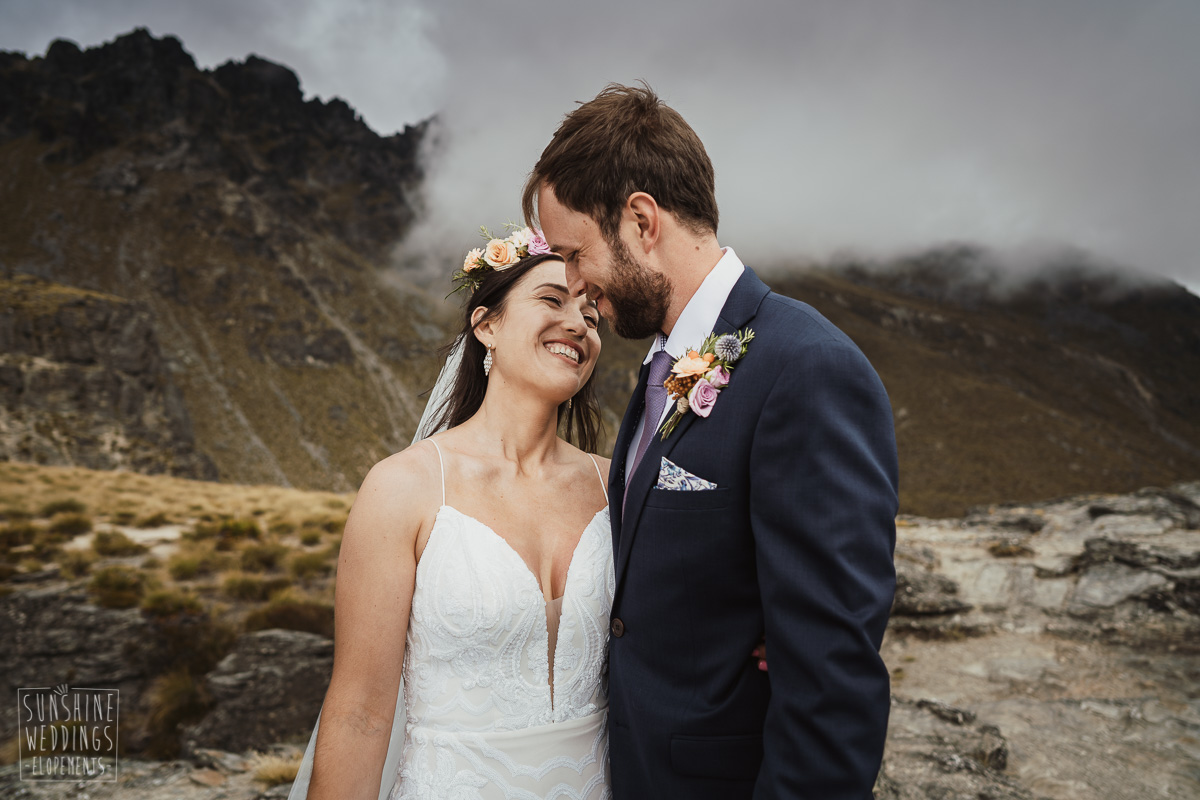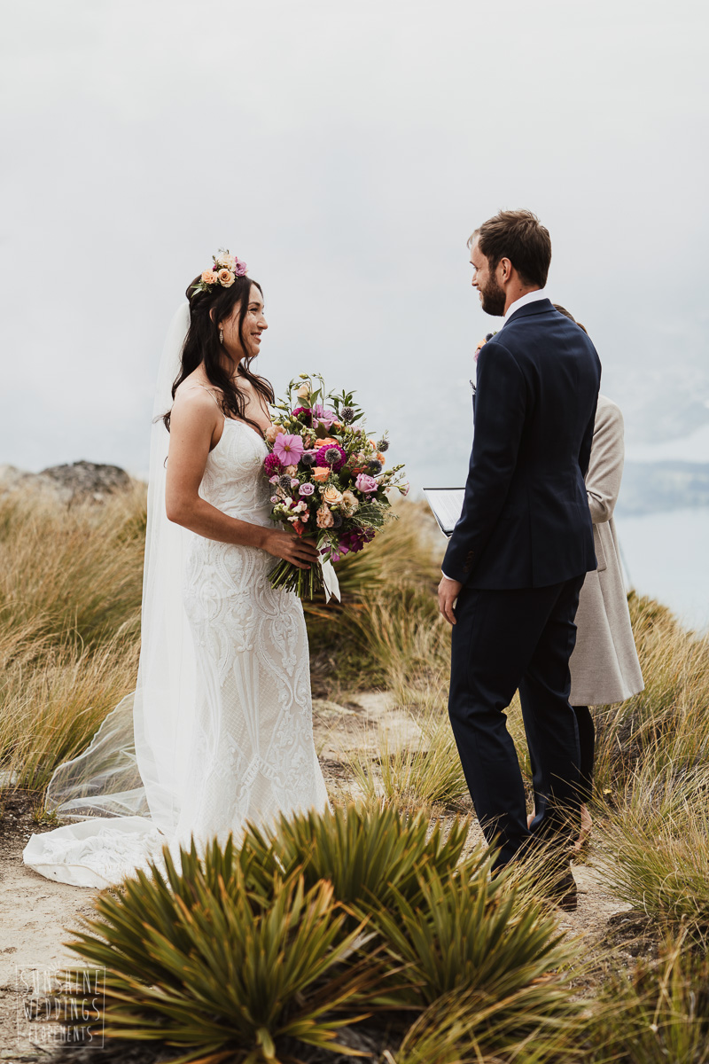 Jade and Joseph could not stop smiling all day. And who could blame them! Their ceremony was at The Ledge on Cecil Peak, followed by a second landing at Bayonet Peak. Jade’s beautiful flowers and flower crown suited the setting perfectly and we can’t go past a good veil shot or two.