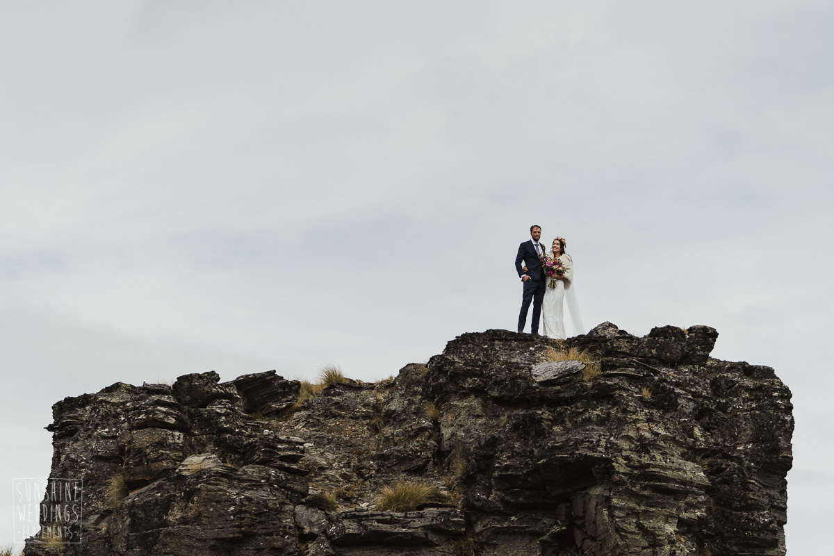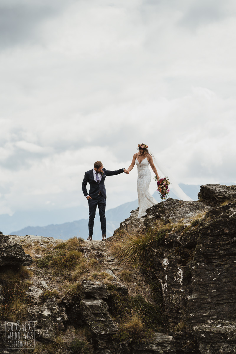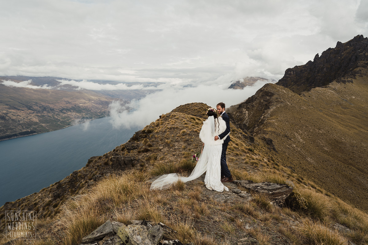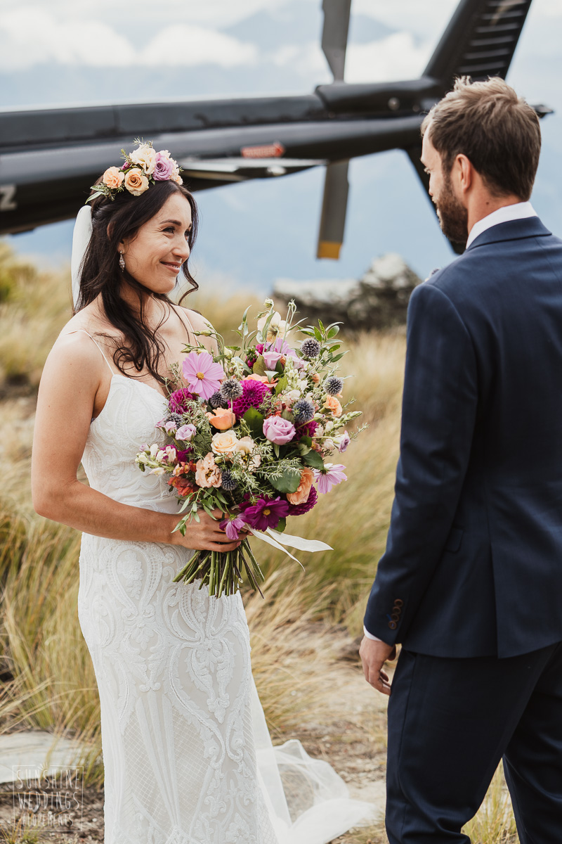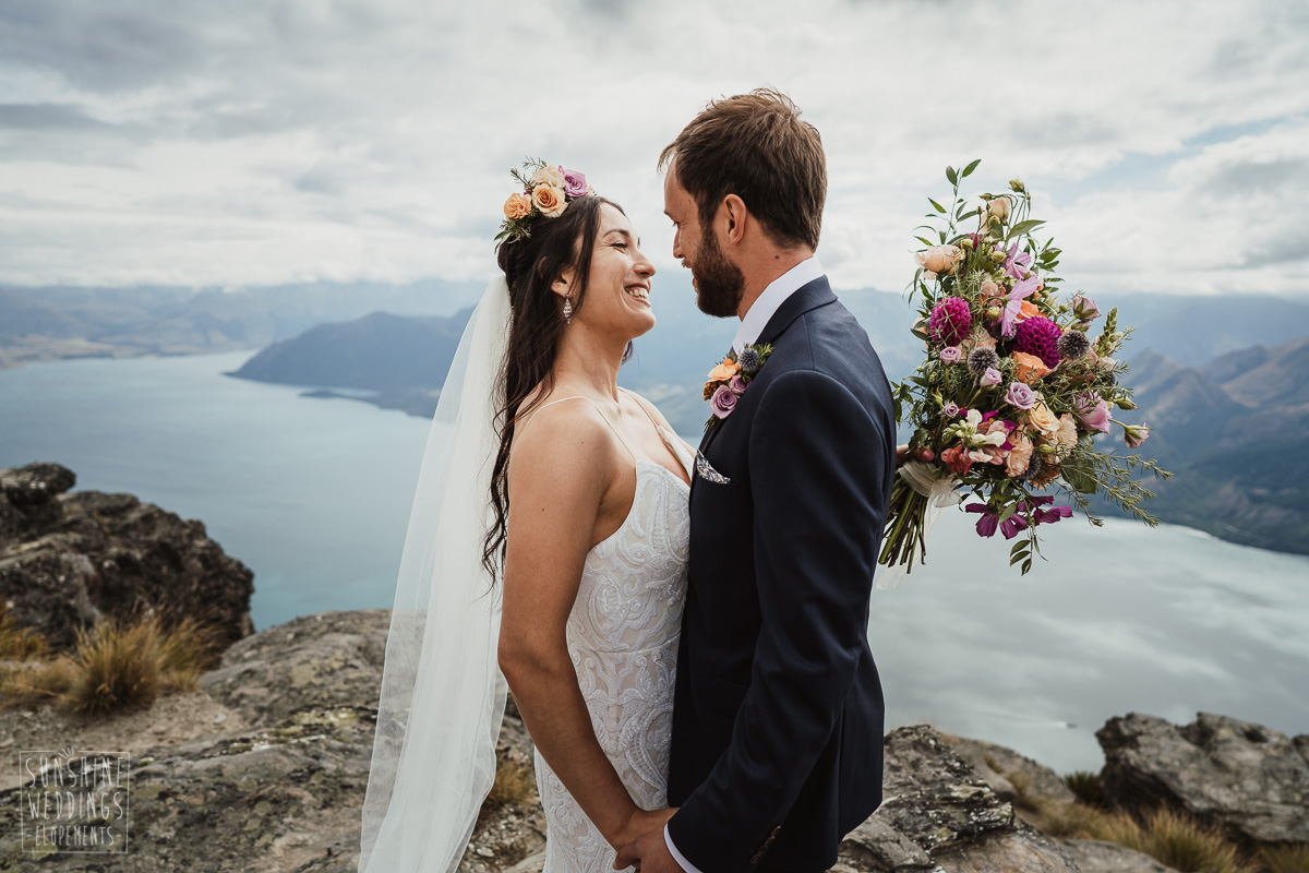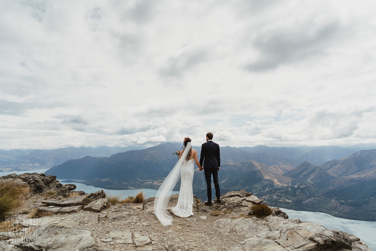 Jade and Joseph could not stop smiling all day. And who could blame them! Their ceremony was at The Ledge on Cecil Peak, followed by a second landing at Bayonet Peak. Jade’s beautiful flowers and flower crown suited the setting perfectly and we can’t go past a good veil shot or two.
