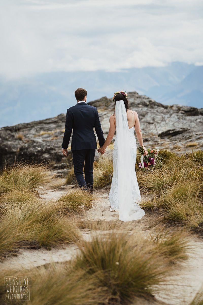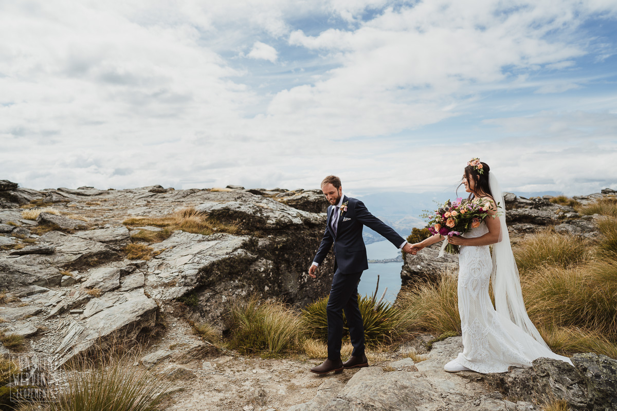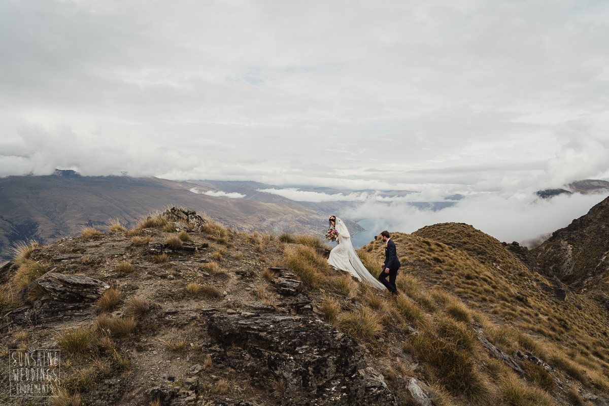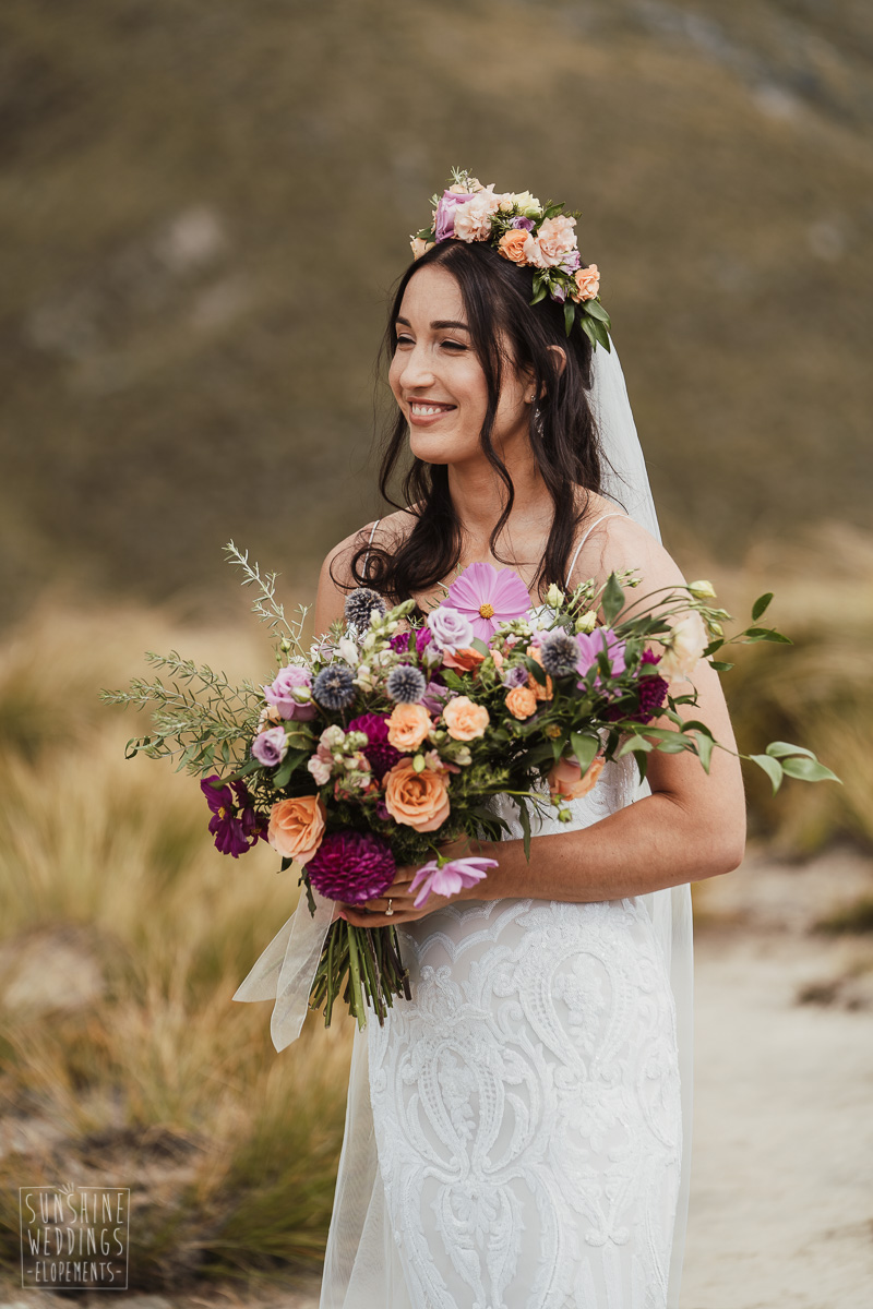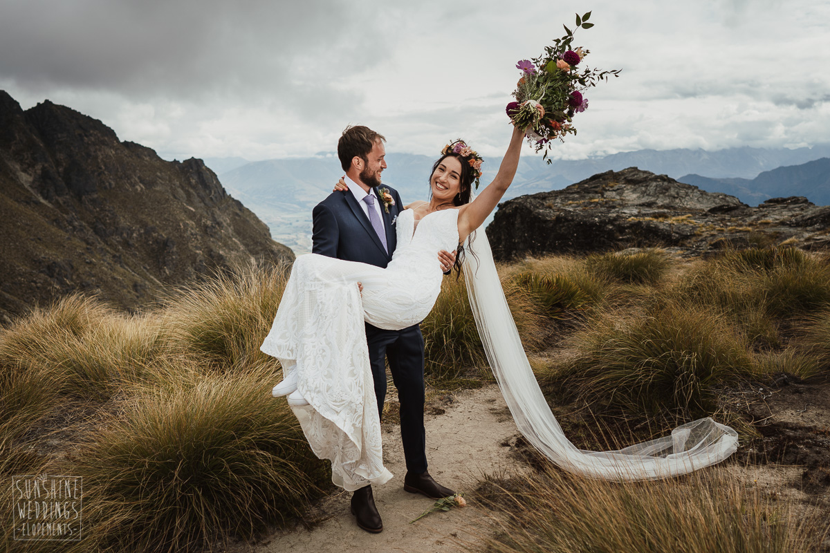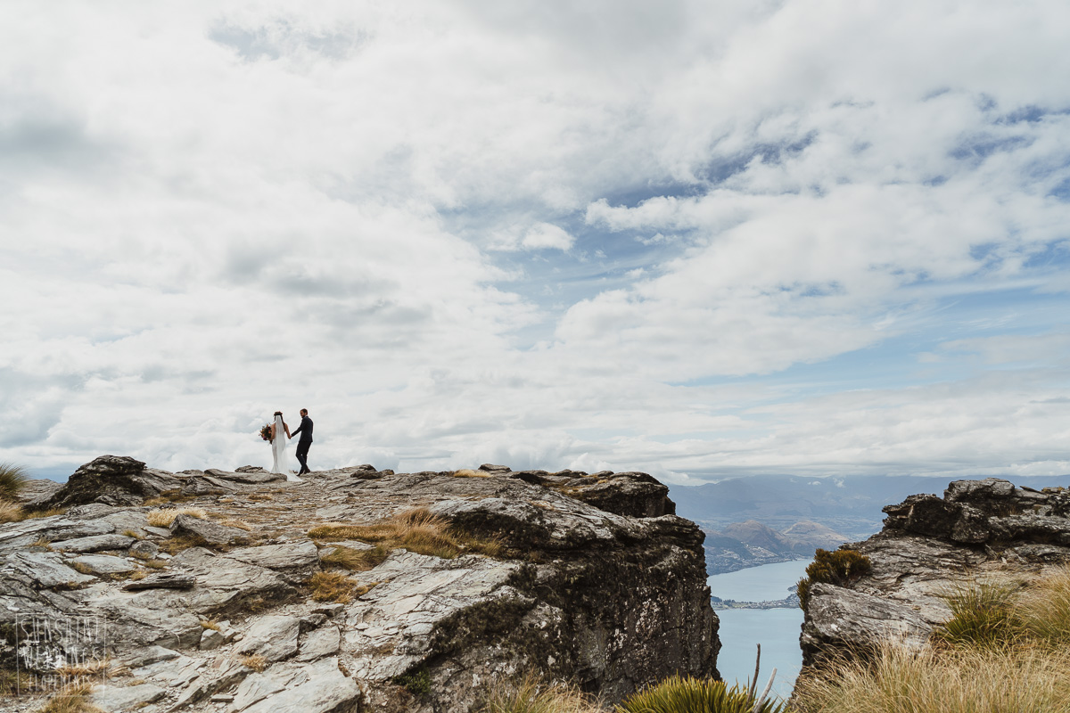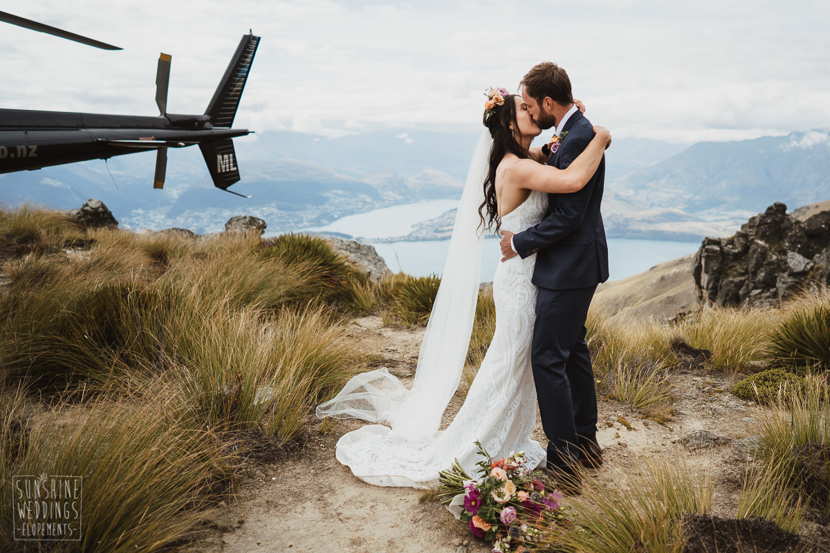Jade and Joseph could not stop smiling all day. And who could blame them! Their ceremony was at The Ledge on Cecil Peak, followed by a second landing at Bayonet Peak. Jade’s beautiful flowers and flower crown suited the setting perfectly and we can’t go past a good veil shot or two.