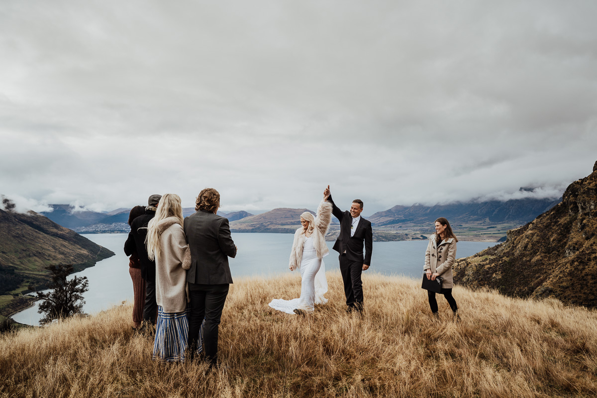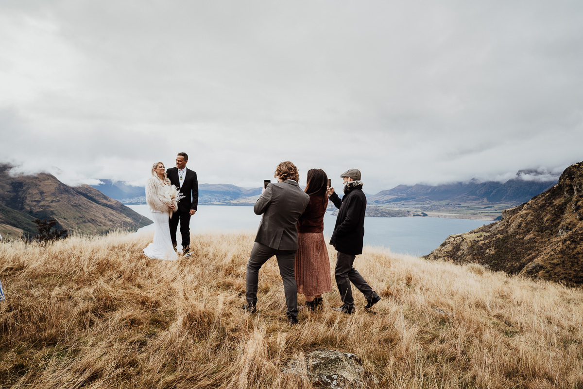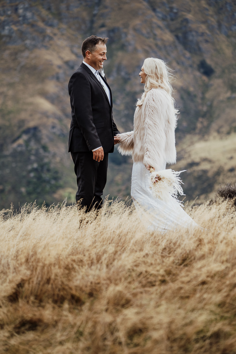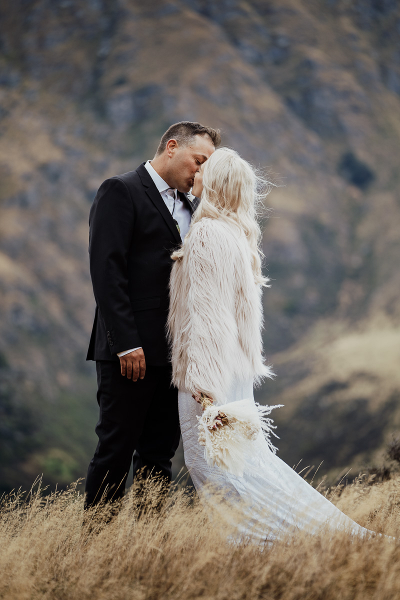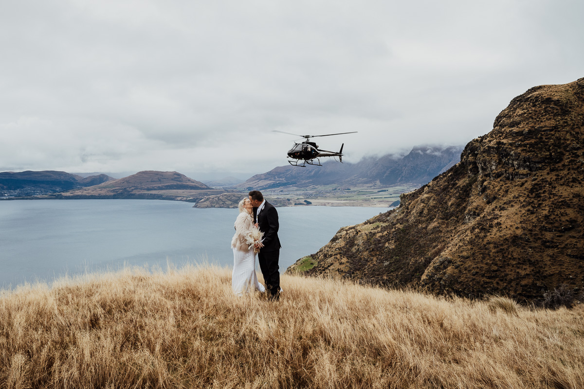 One of our favourite weddings of the season. Low cloud on the day meant a bit more exploring was in order so Scott found a beautiful, tussocky landing just nestled underneath. Views of Lake Wakatipu and surrounding mountains didn’t distract Jazz and Nathan from each other though.