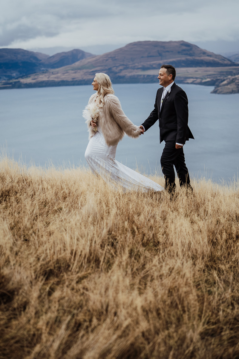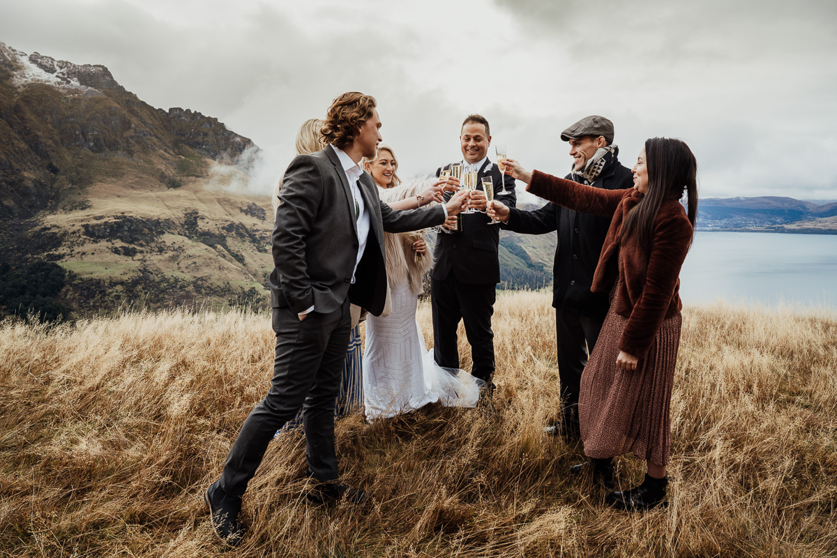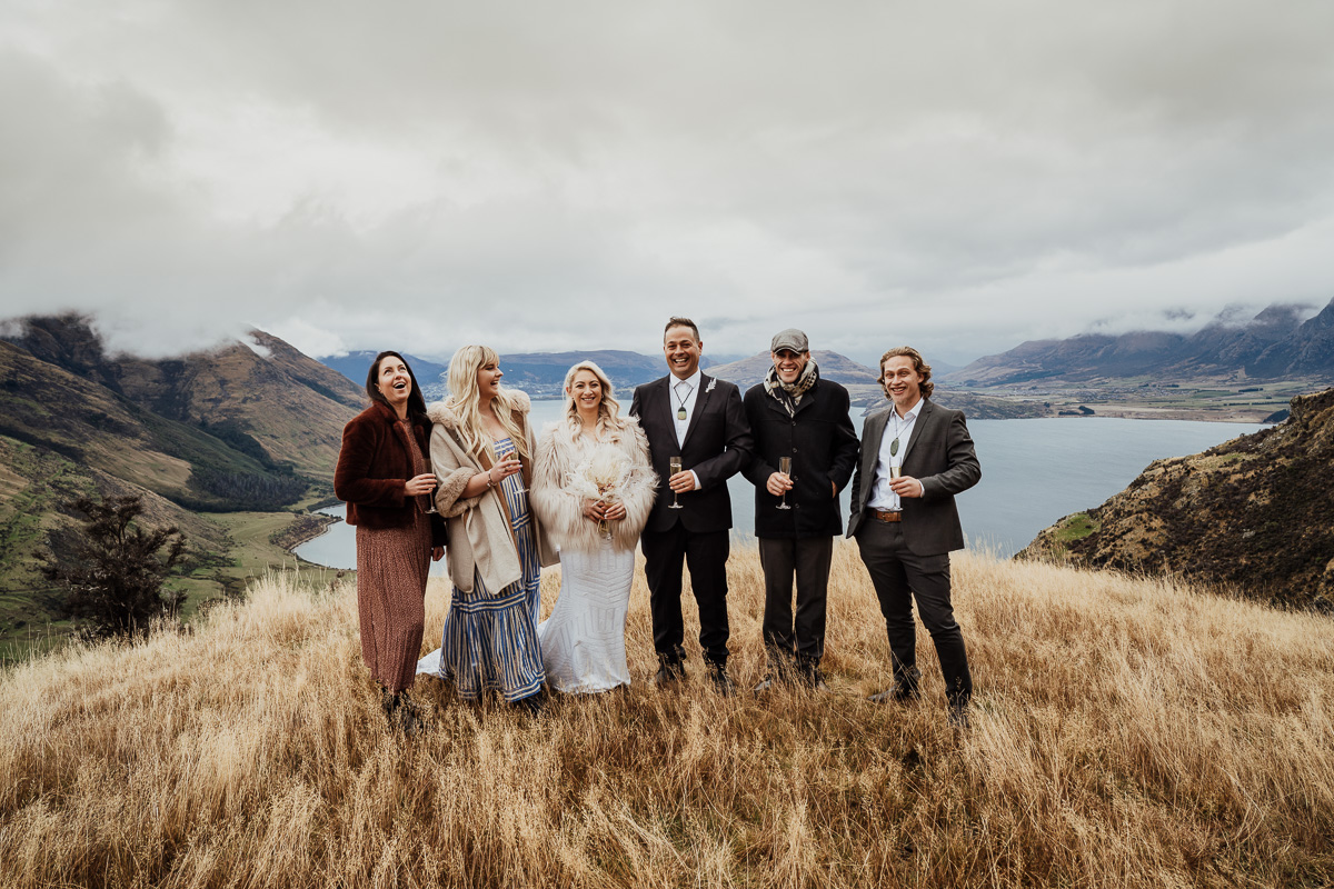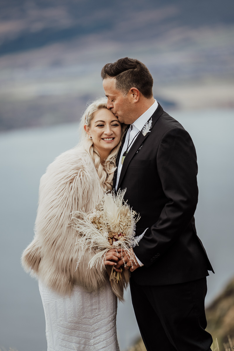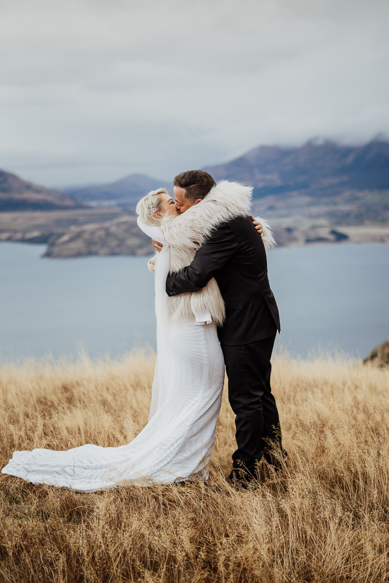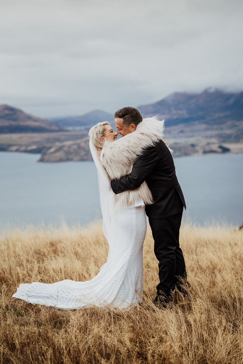 One of our favourite weddings of the season. Low cloud on the day meant a bit more exploring was in order so Scott found a beautiful, tussocky landing just nestled underneath. Views of Lake Wakatipu and surrounding mountains didn’t distract Jazz and Nathan from each other though.
