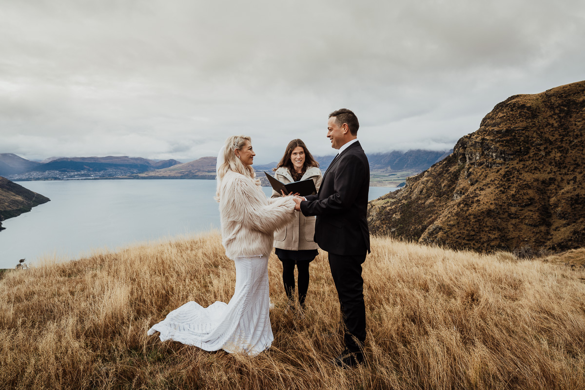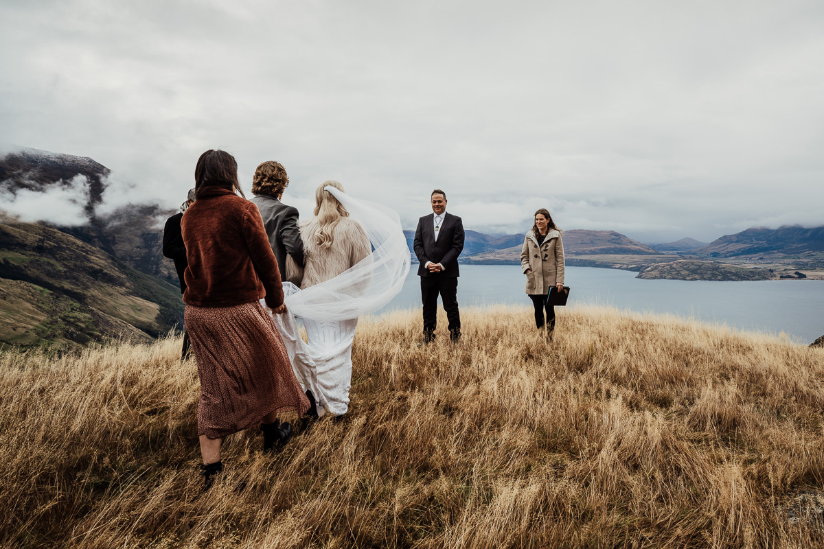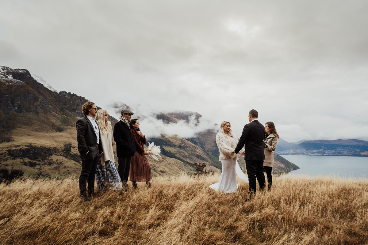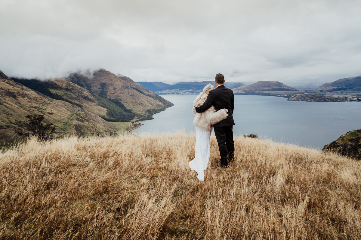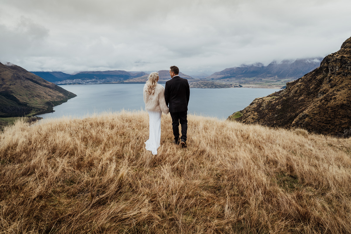 One of our favourite weddings of the season. Low cloud on the day meant a bit more exploring was in order so Scott found a beautiful, tussocky landing just nestled underneath. Views of Lake Wakatipu and surrounding mountains didn’t distract Jazz and Nathan from each other though.