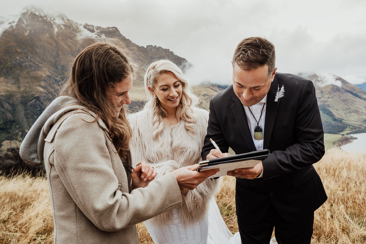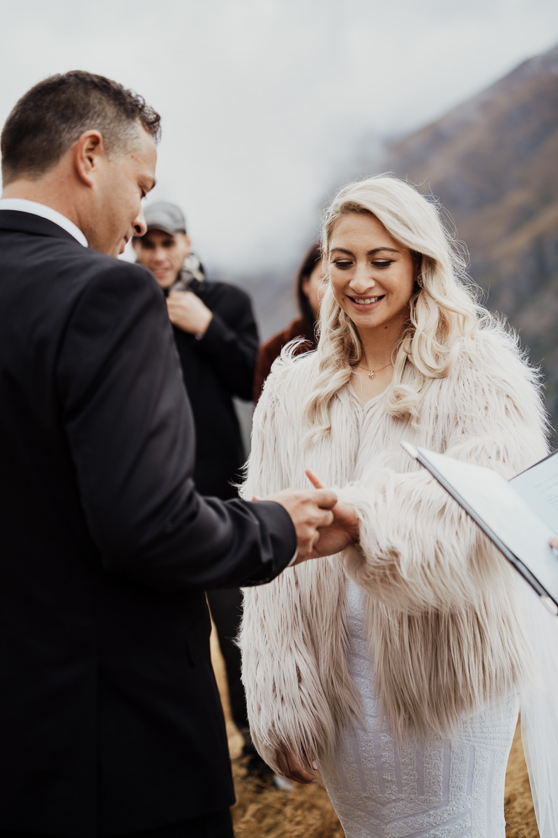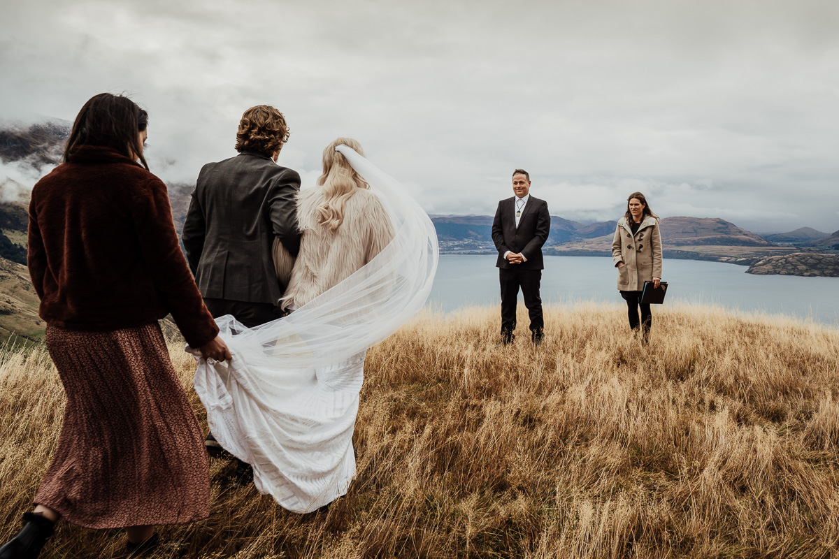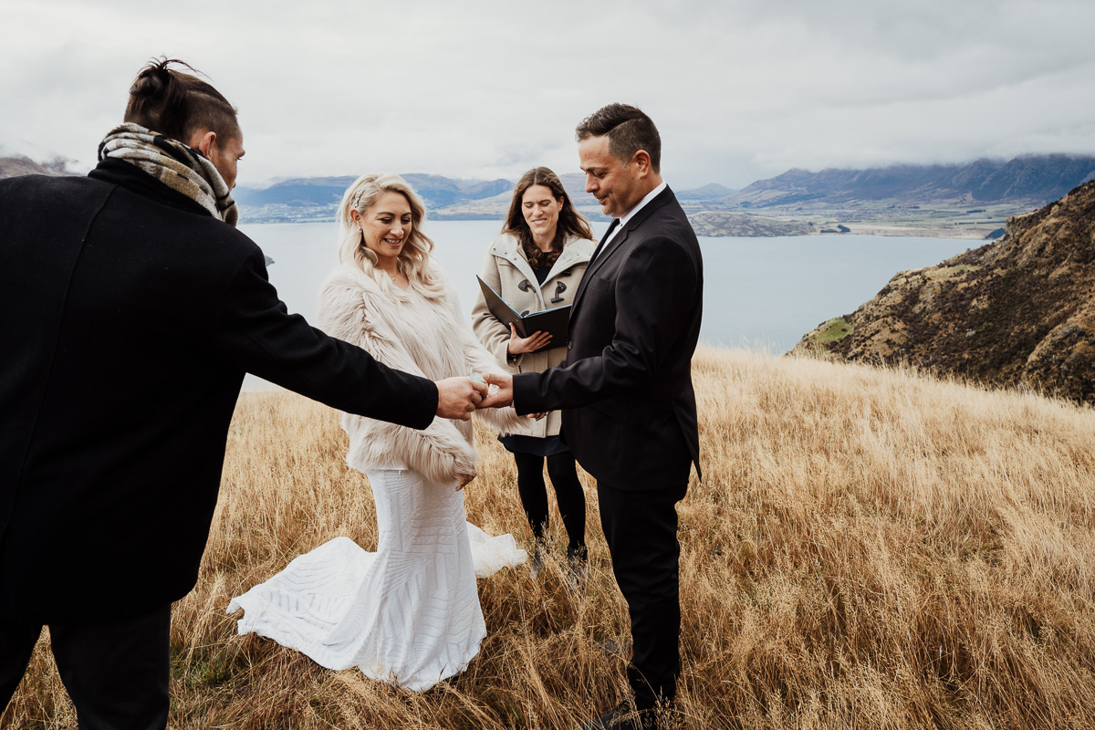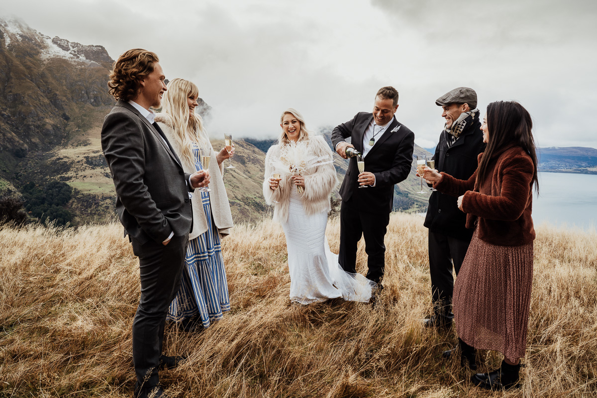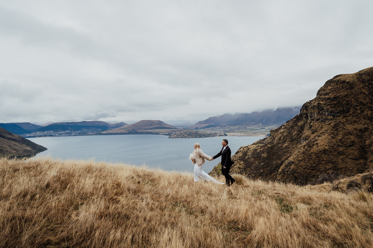 One of our favourite weddings of the season. Low cloud on the day meant a bit more exploring was in order so Scott found a beautiful, tussocky landing just nestled underneath. Views of Lake Wakatipu and surrounding mountains didn’t distract Jazz and Nathan from each other though.
