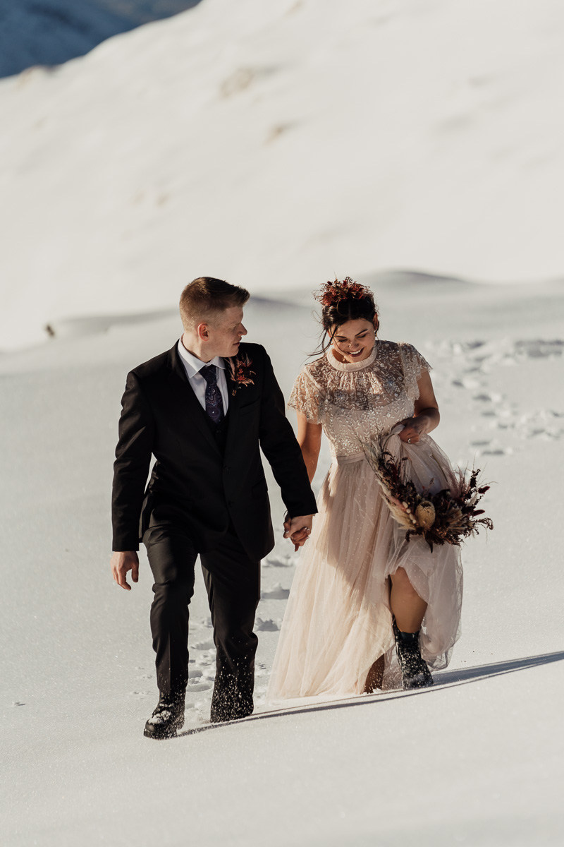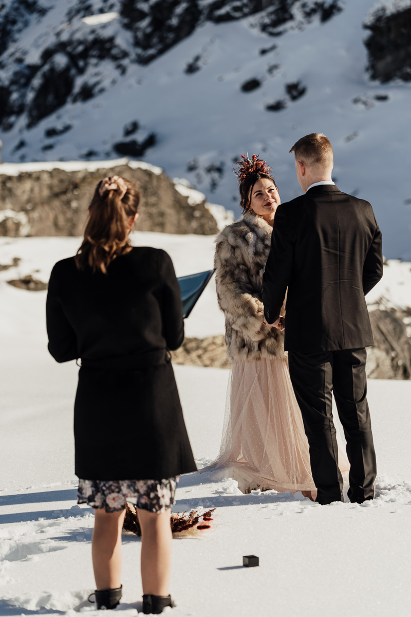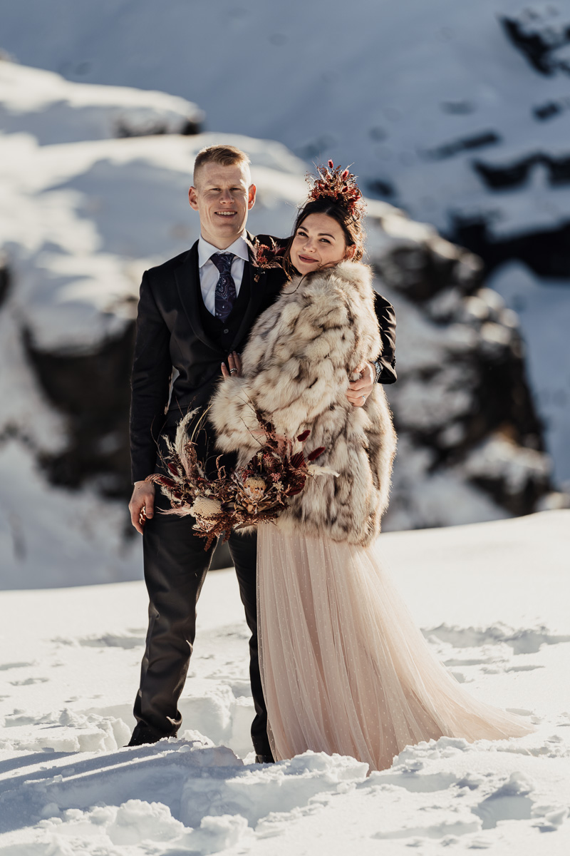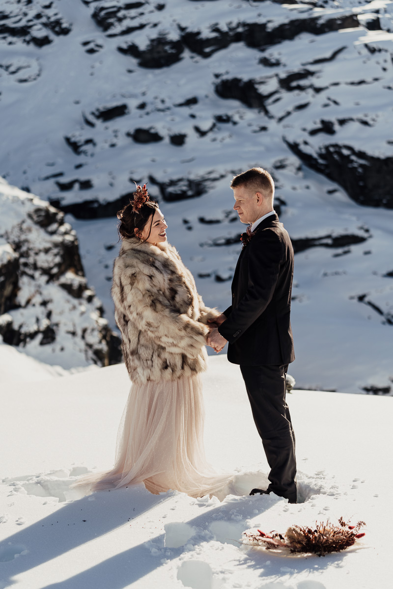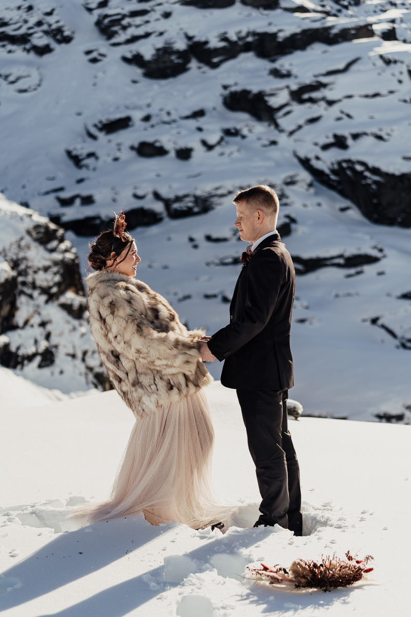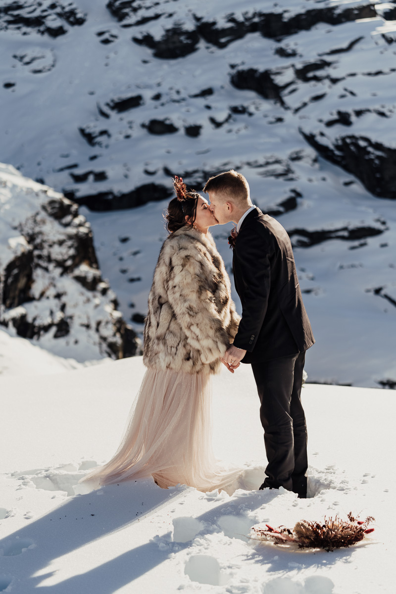 Late Autumn provided a bit of a treat for Kate and Philip’s elopement. A fresh layer of fluffy white snow arrived just in time for their helicopter flight and ceremony. With a bluebird day and a sheltered spot away from the wind, they exchanged vows in a peaceful and intimate setting with a ceremony by celebrant Eva Hooper. Kate’s pink dress looked amazing in the light with her non-traditional flower hoop and big smile for her new husband.