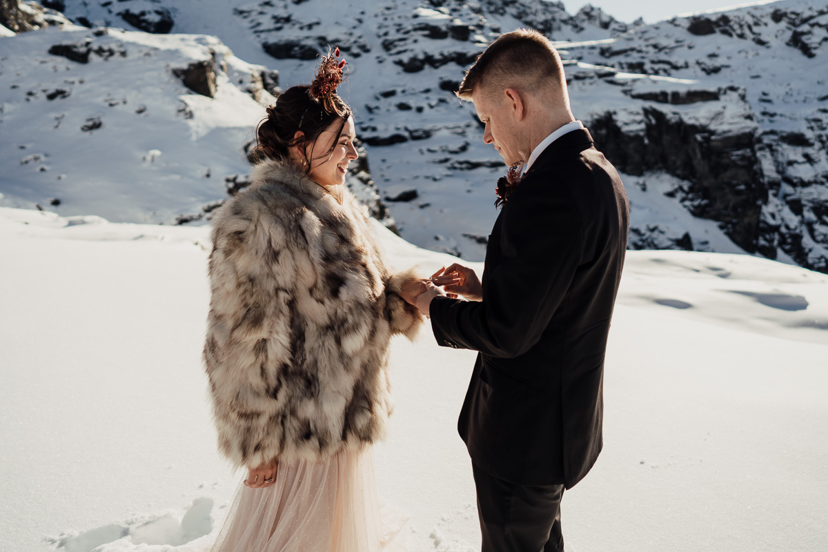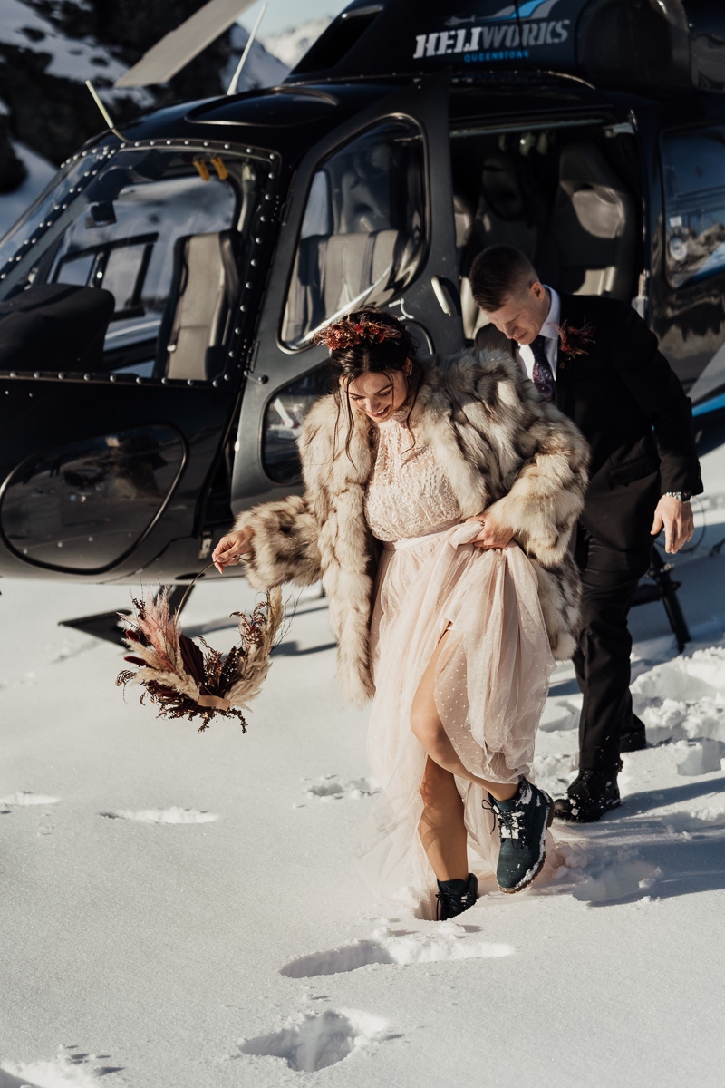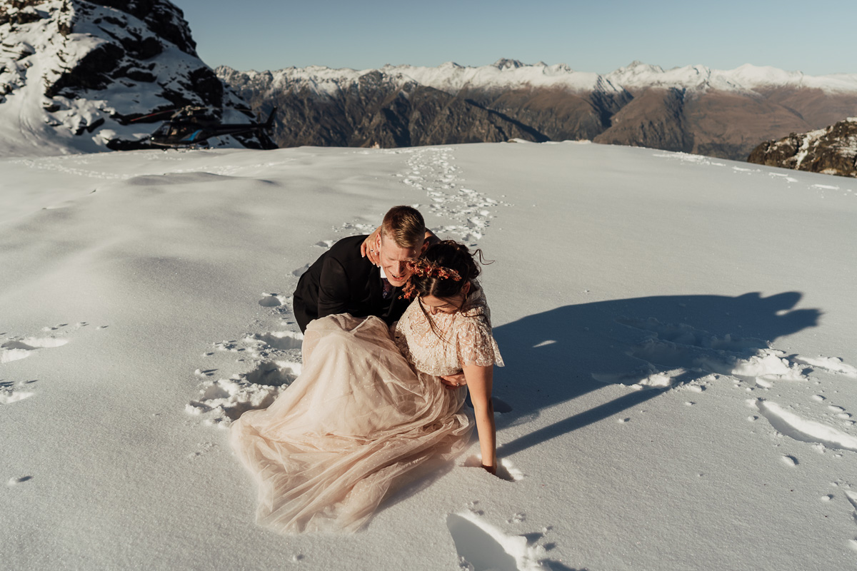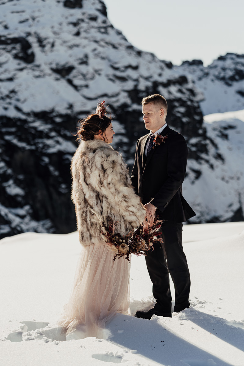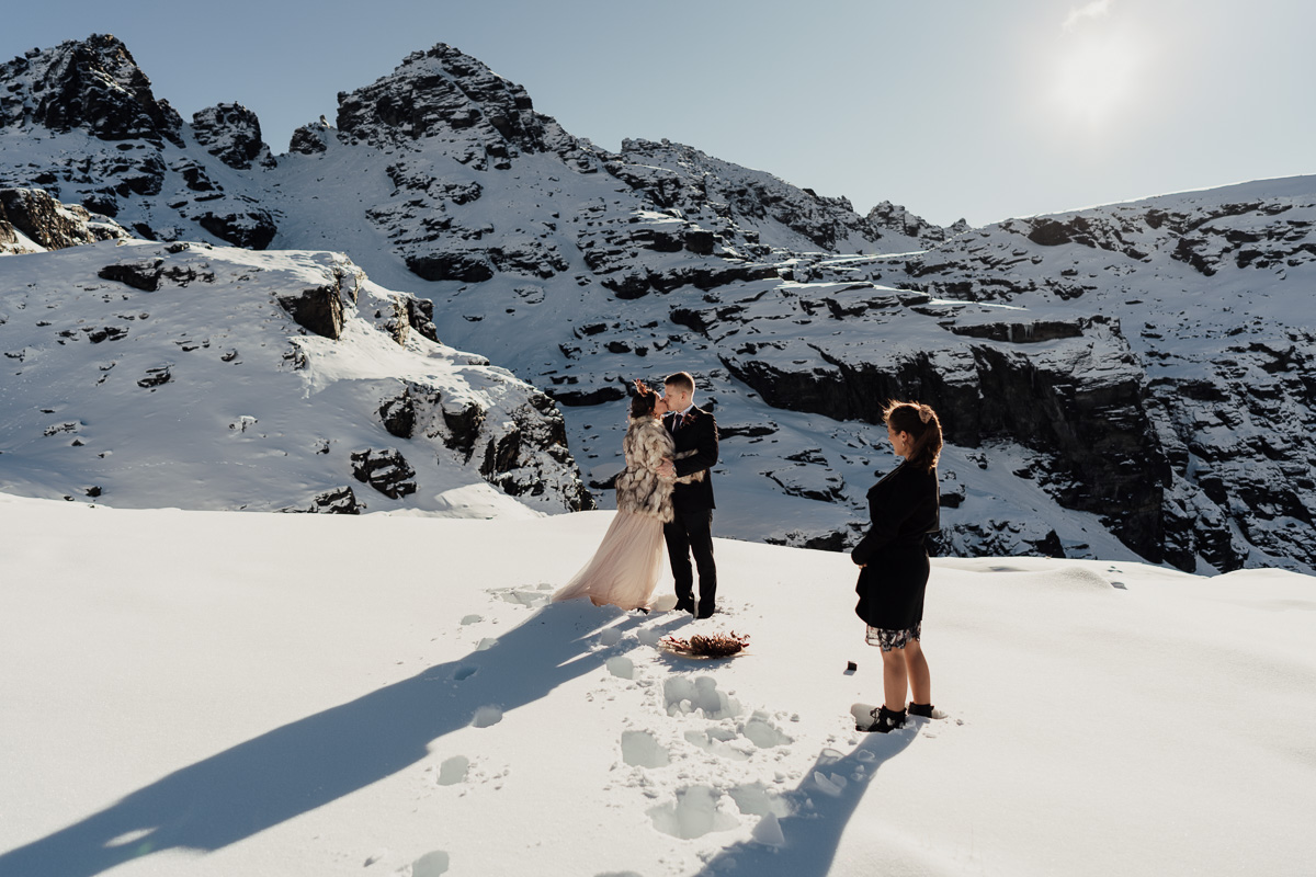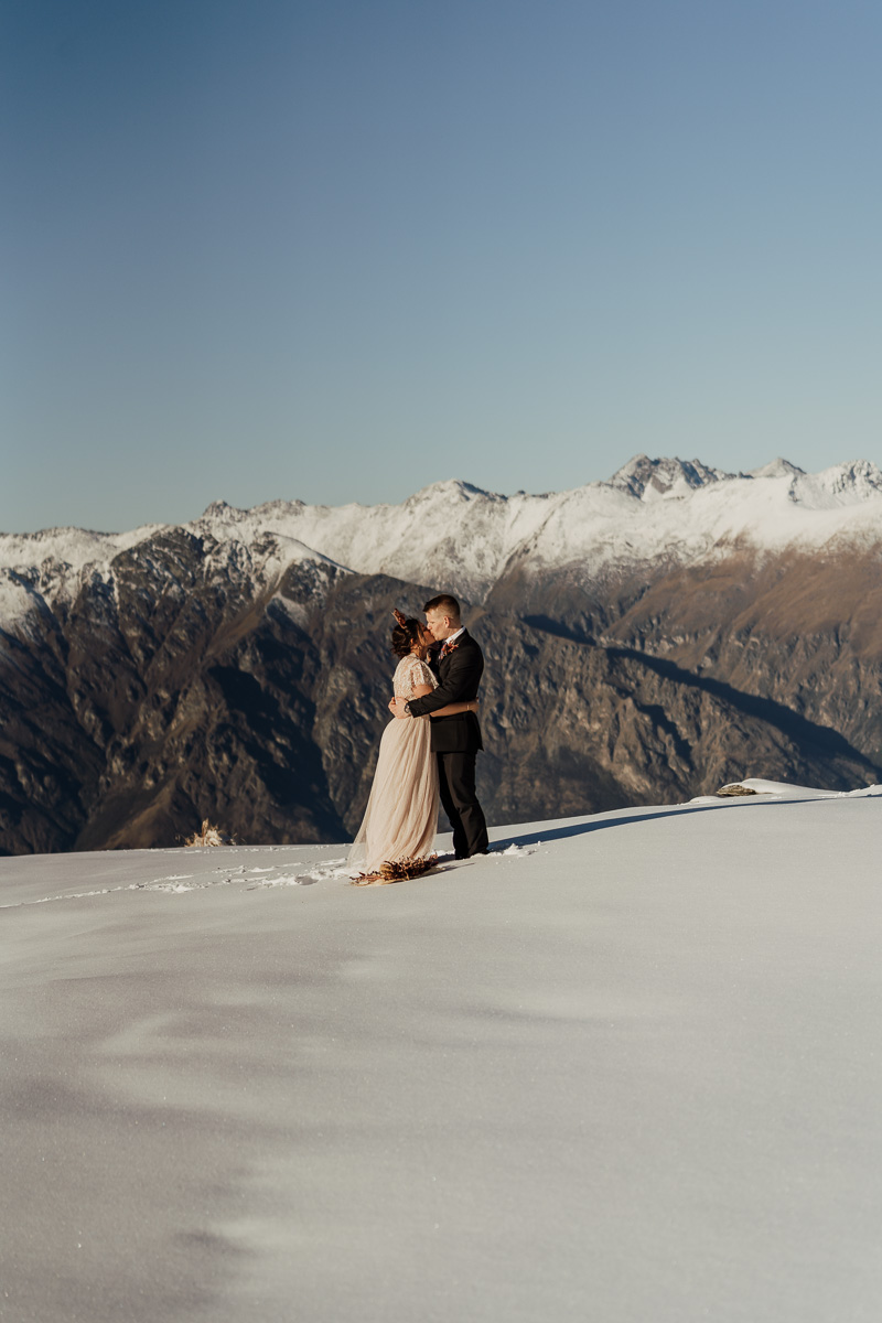 Late Autumn provided a bit of a treat for Kate and Philip’s elopement. A fresh layer of fluffy white snow arrived just in time for their helicopter flight and ceremony. With a bluebird day and a sheltered spot away from the wind, they exchanged vows in a peaceful and intimate setting with a ceremony by celebrant Eva Hooper. Kate’s pink dress looked amazing in the light with her non-traditional flower hoop and big smile for her new husband.