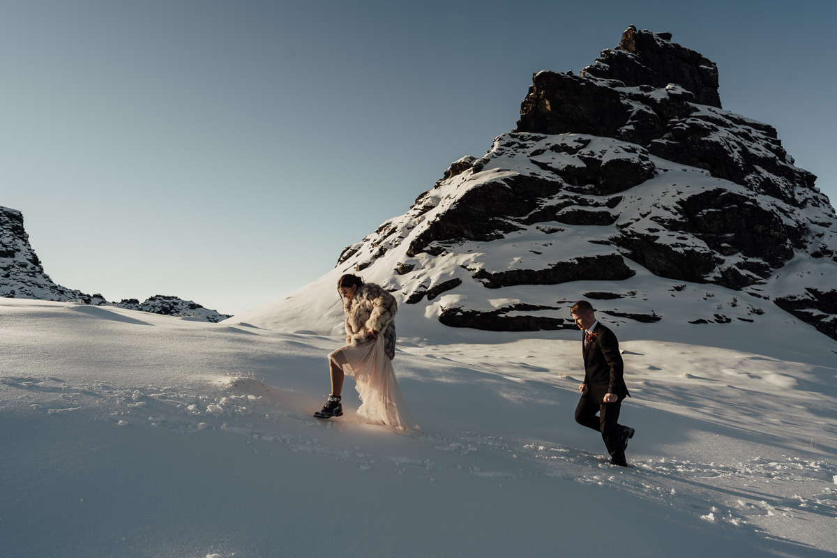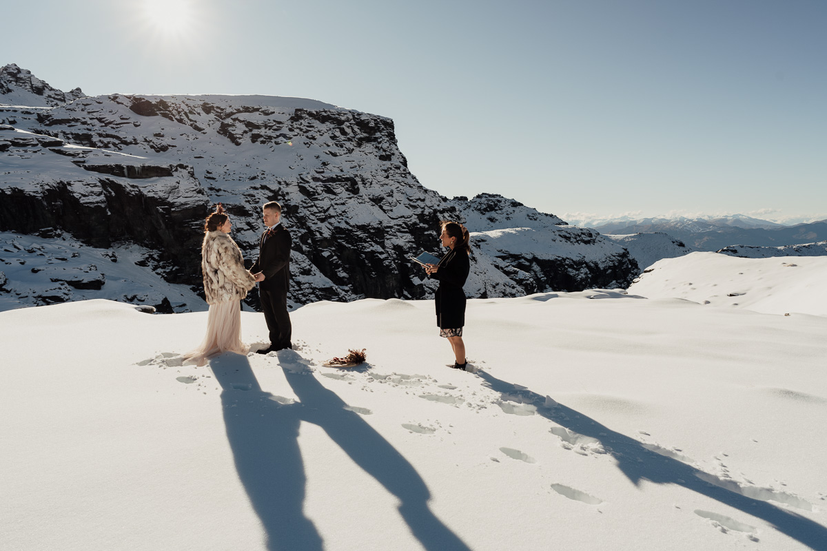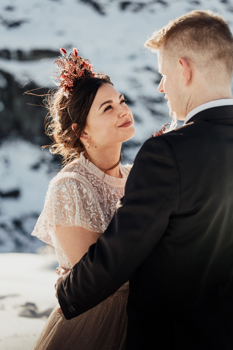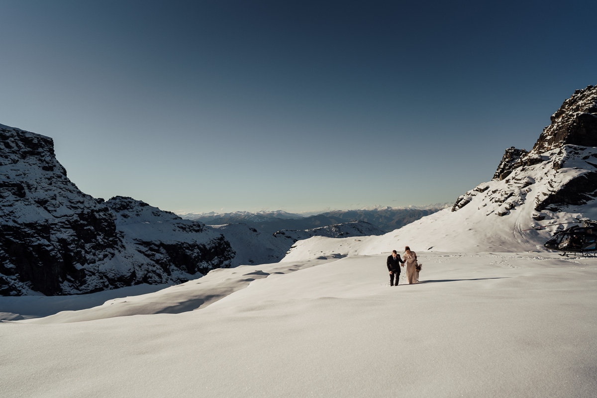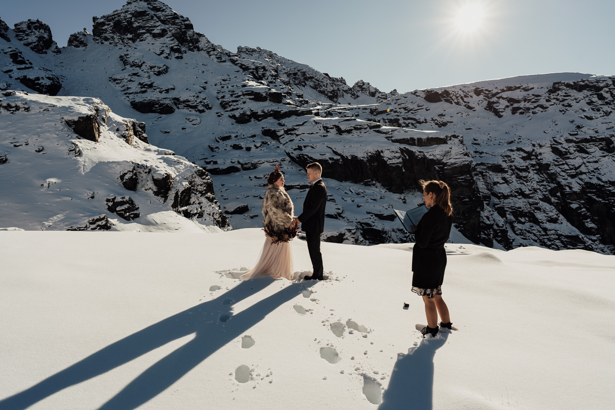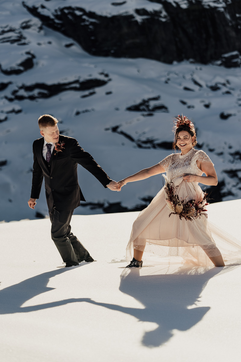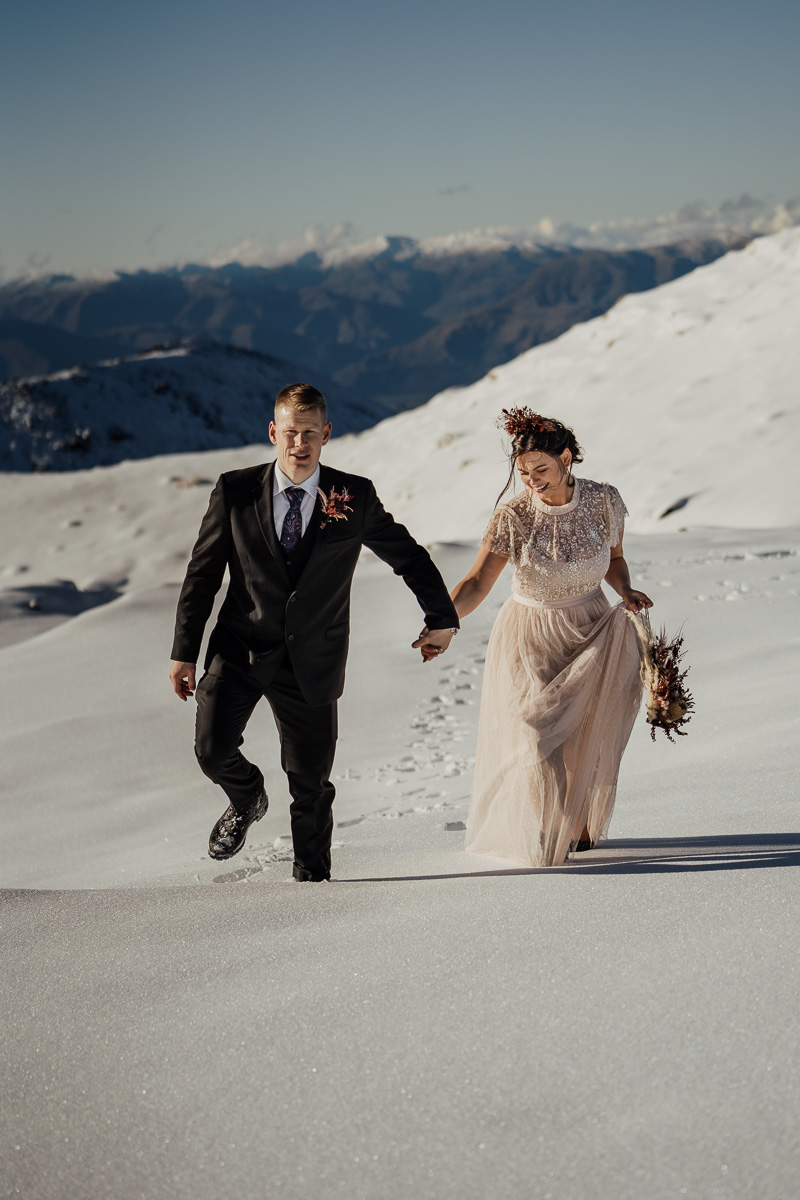 Late Autumn provided a bit of a treat for Kate and Philip’s elopement. A fresh layer of fluffy white snow arrived just in time for their helicopter flight and ceremony. With a bluebird day and a sheltered spot away from the wind, they exchanged vows in a peaceful and intimate setting with a ceremony by celebrant Eva Hooper. Kate’s pink dress looked amazing in the light with her non-traditional flower hoop and big smile for her new husband.