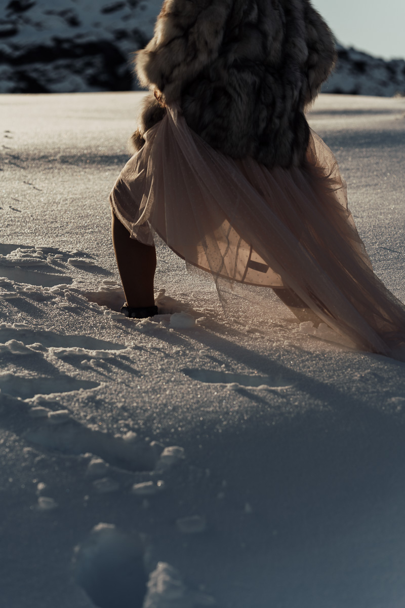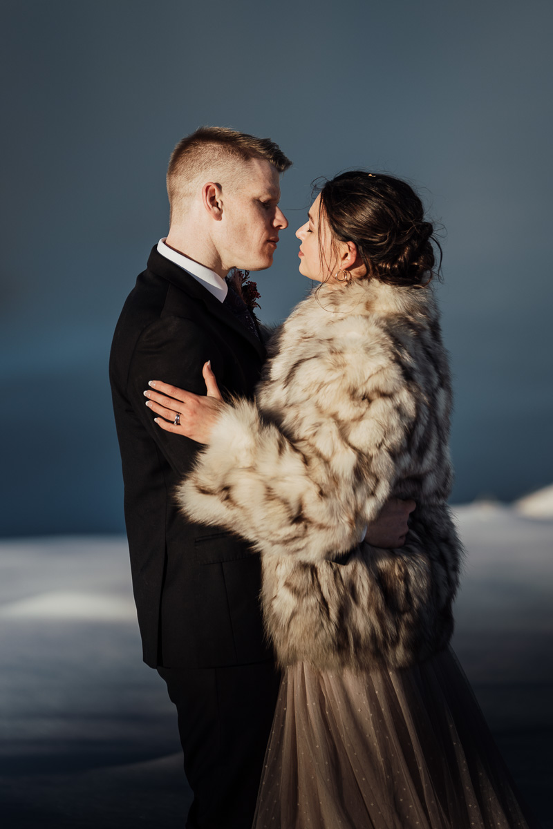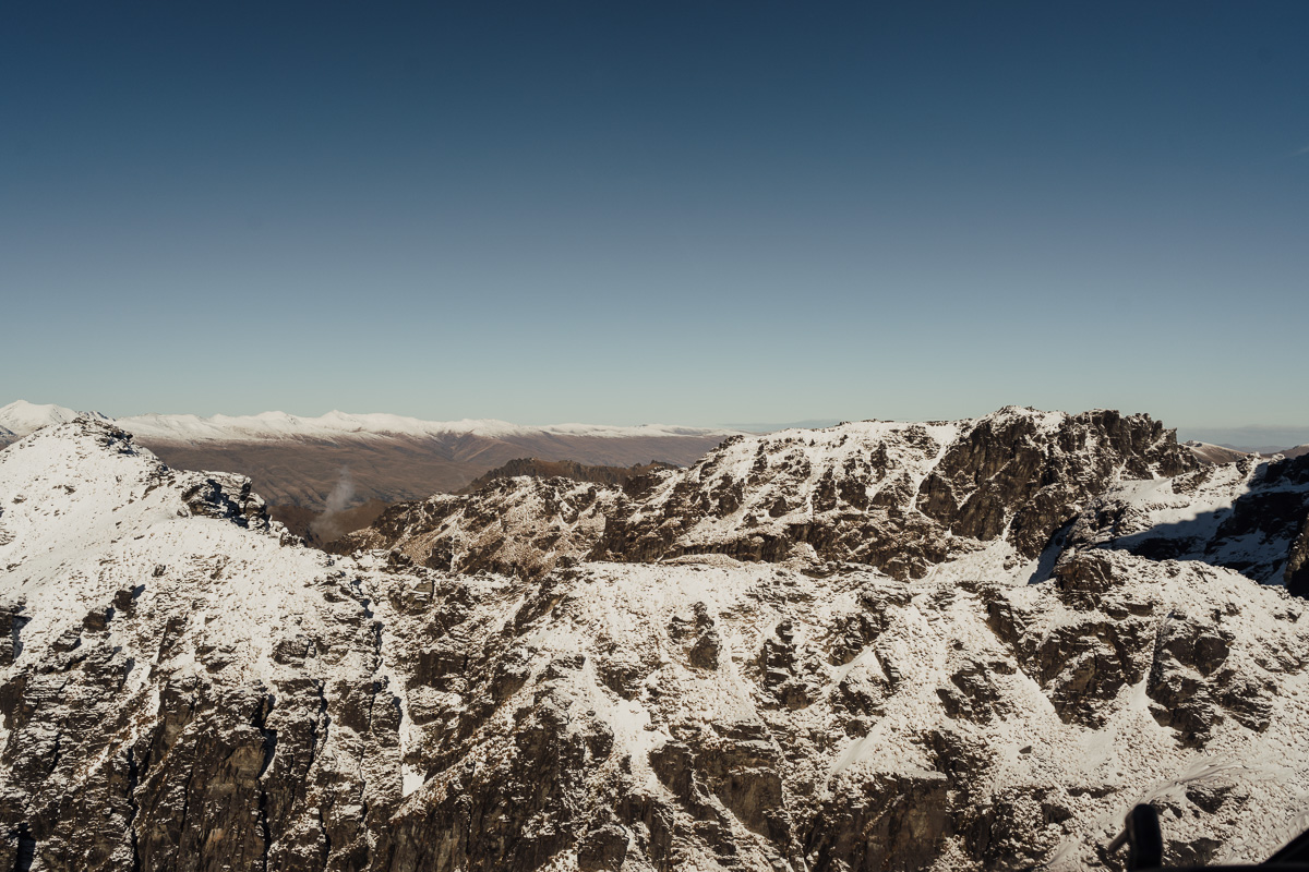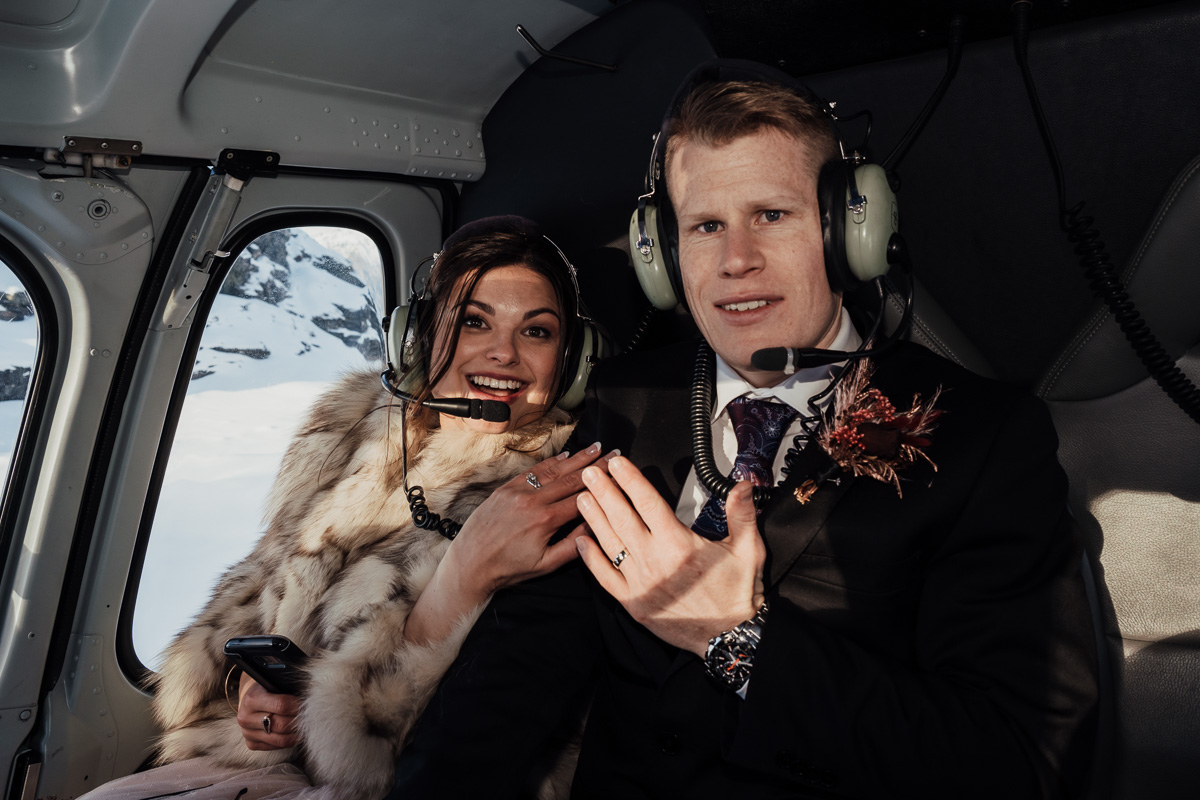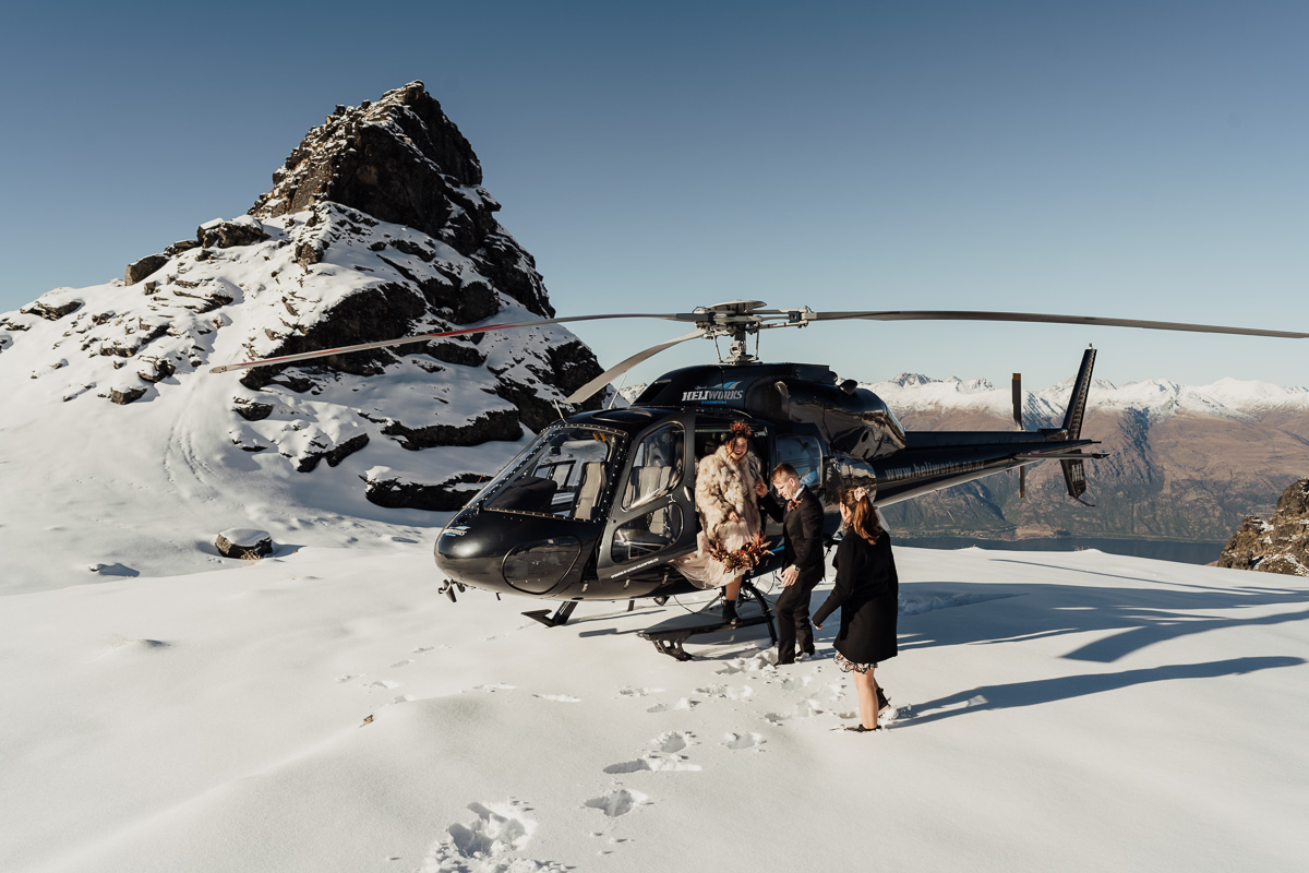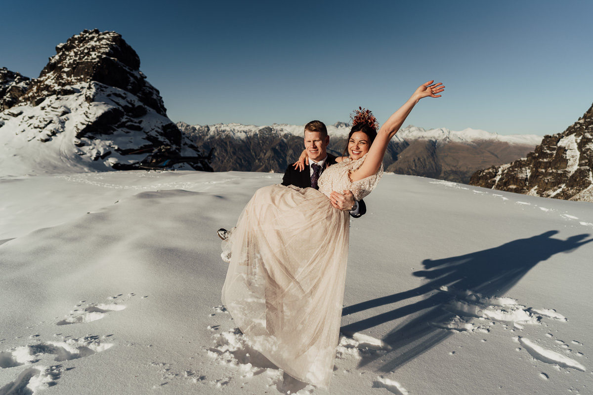 Late Autumn provided a bit of a treat for Kate and Philip’s elopement. A fresh layer of fluffy white snow arrived just in time for their helicopter flight and ceremony. With a bluebird day and a sheltered spot away from the wind, they exchanged vows in a peaceful and intimate setting with a ceremony by celebrant Eva Hooper. Kate’s pink dress looked amazing in the light with her non-traditional flower hoop and big smile for her new husband.