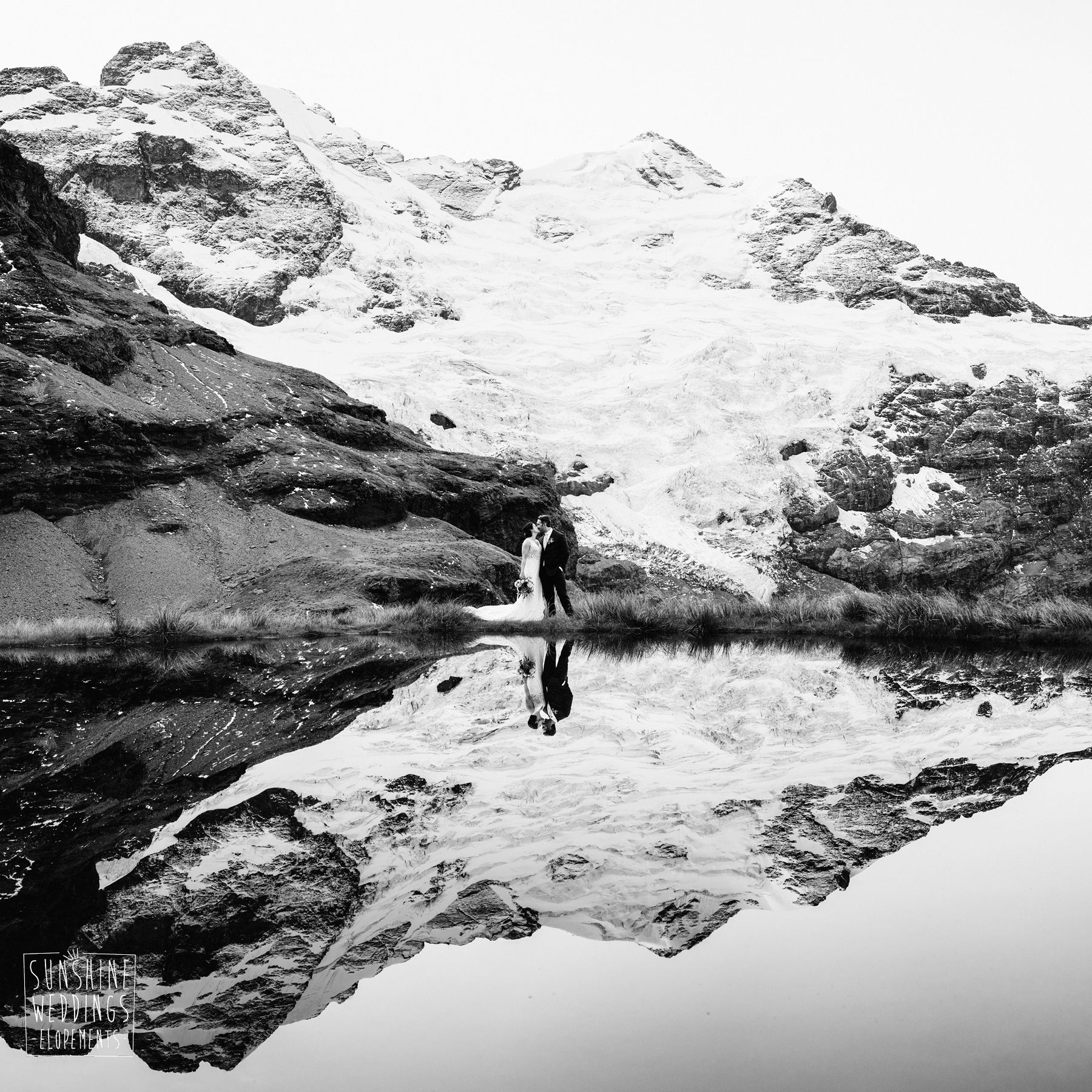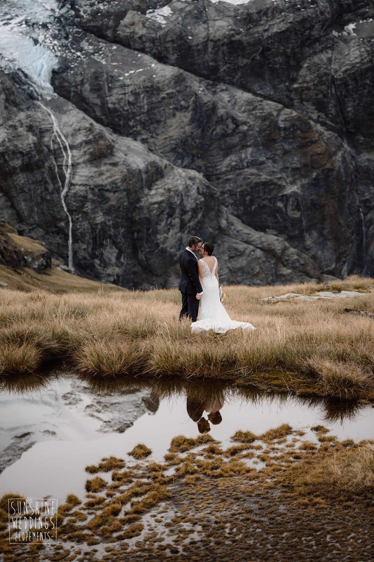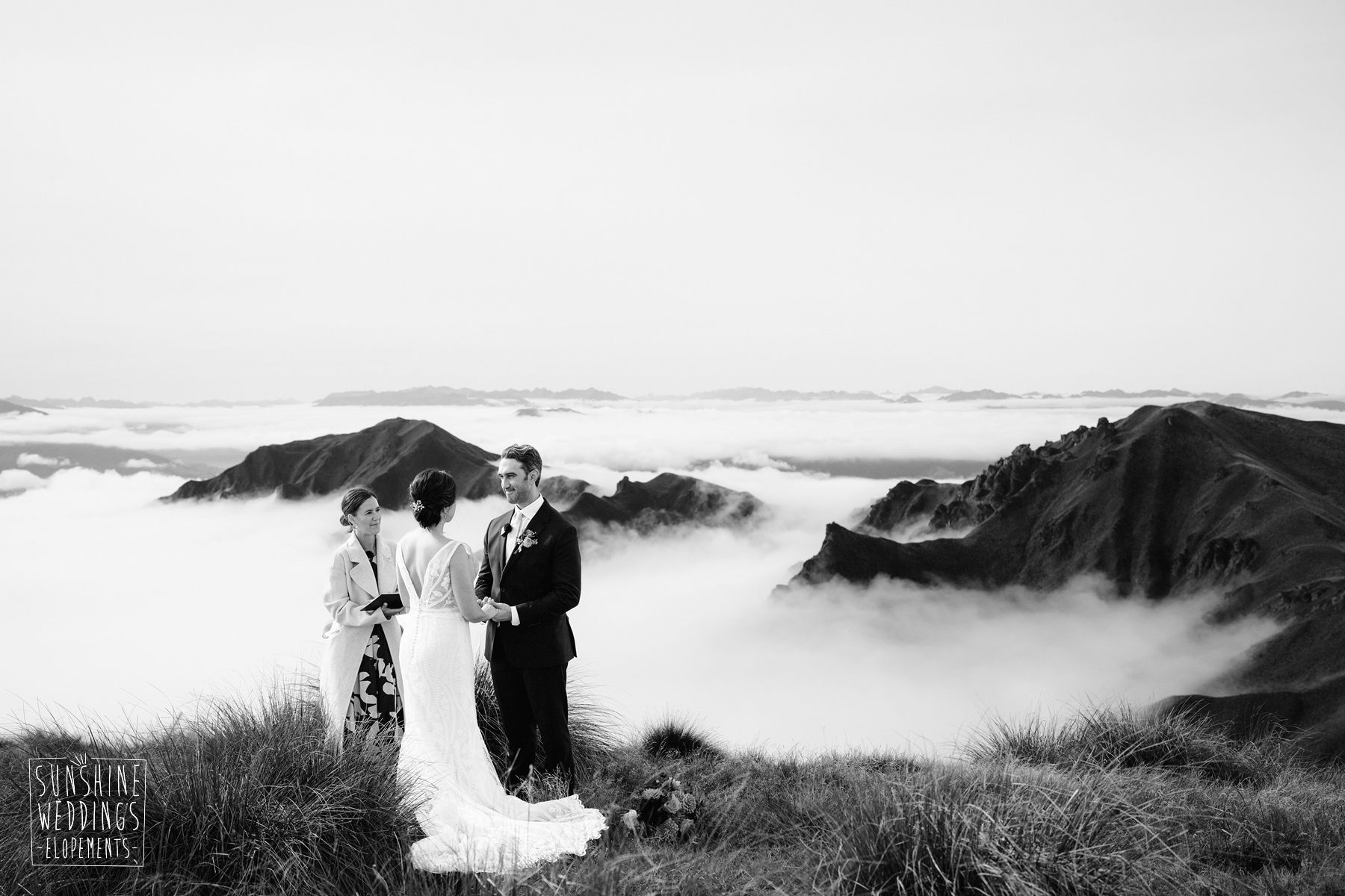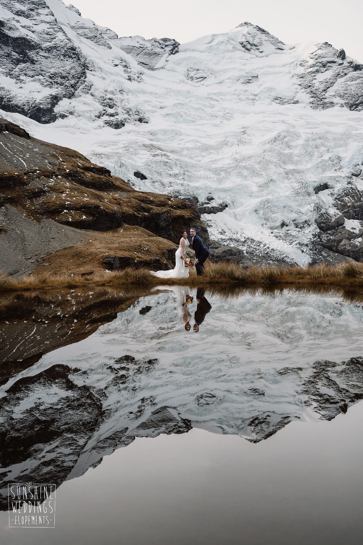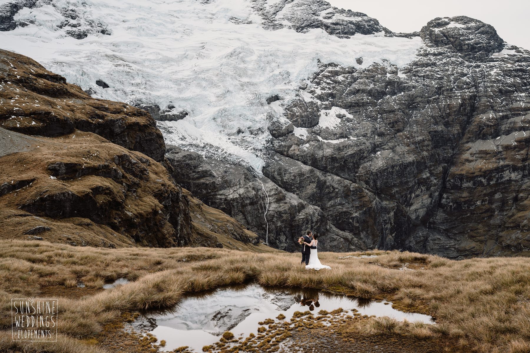 Scott started with them for a relaxed first look photos and walkabout at Gibbston Valley Lodge before heading in to the helicopter hangar. Weather is always the unknown element in any mountain wedding and low cloud meant the helicopter couldn’t landing at Coromandel Peak. Sometimes the plan B is even better though and the ceremony location at Mt Alpha floated above the clouds in a dreamy, surreal landscape. Then after the goodbyes, off to Earnslaw Tarns with mirror-glass tarns reflecting the Earnslaw Glacier looming behind.
