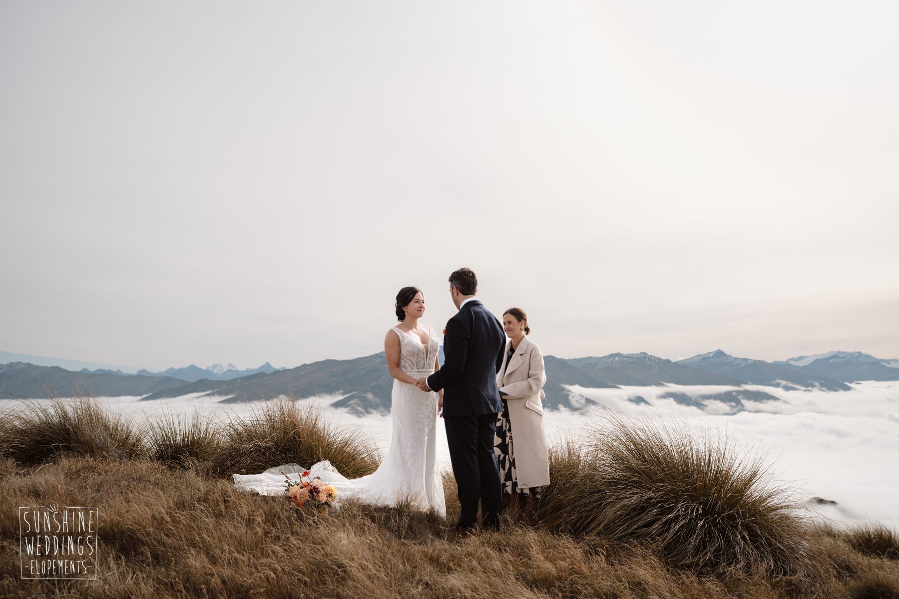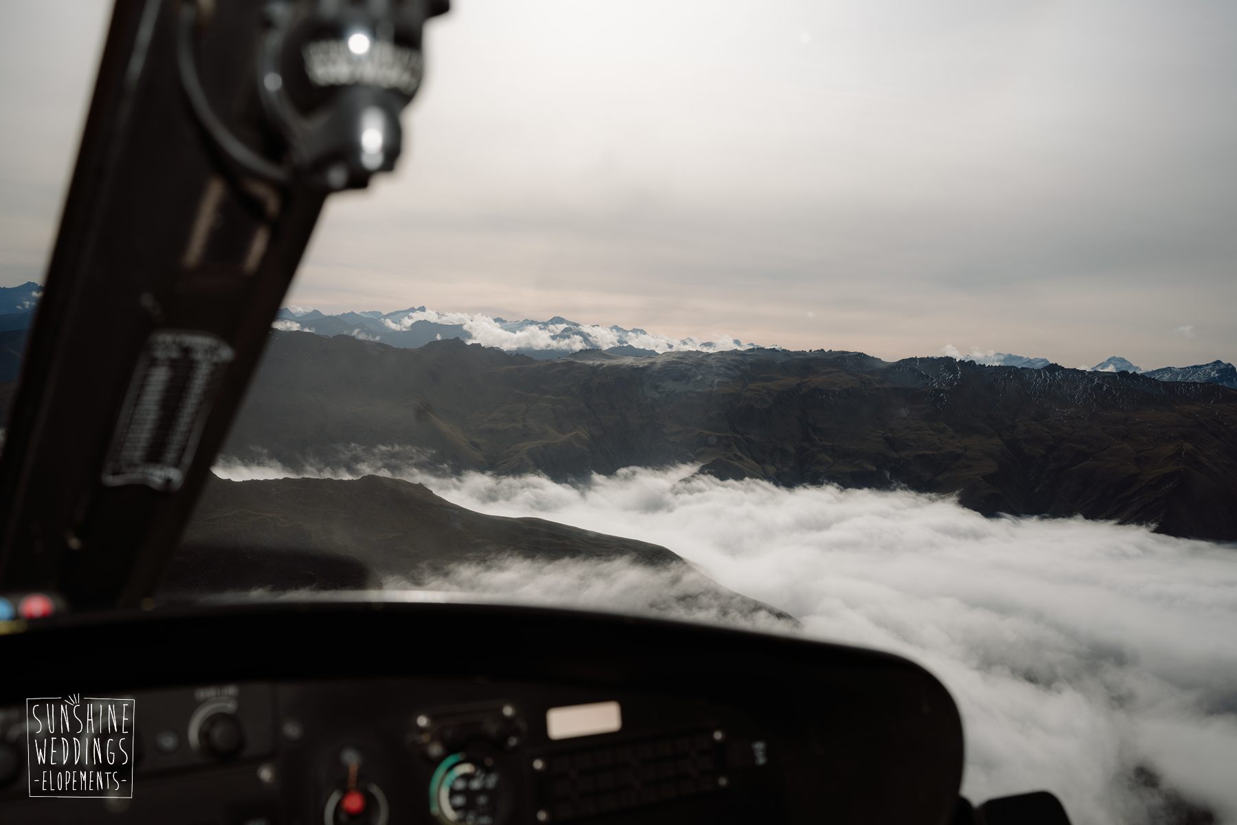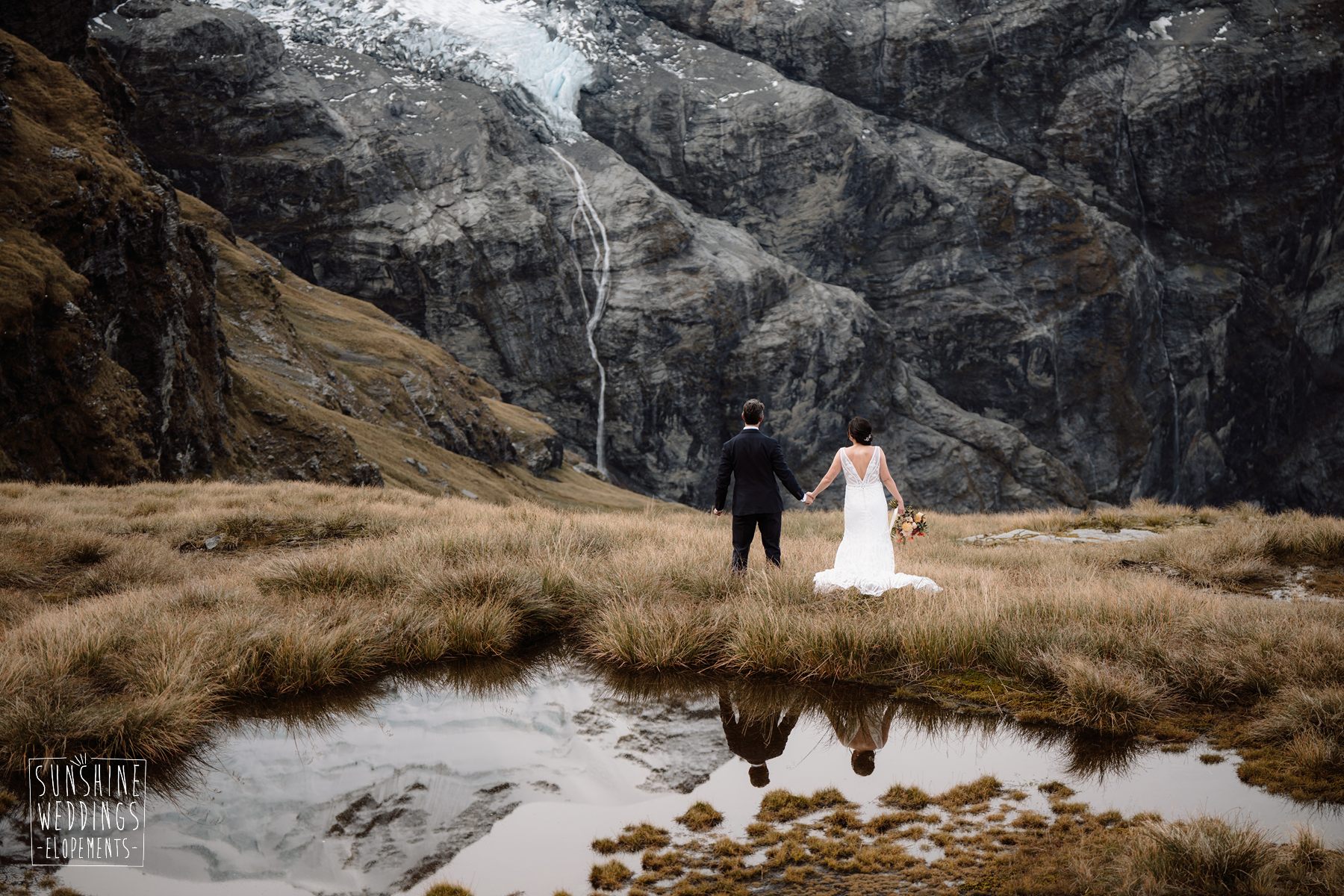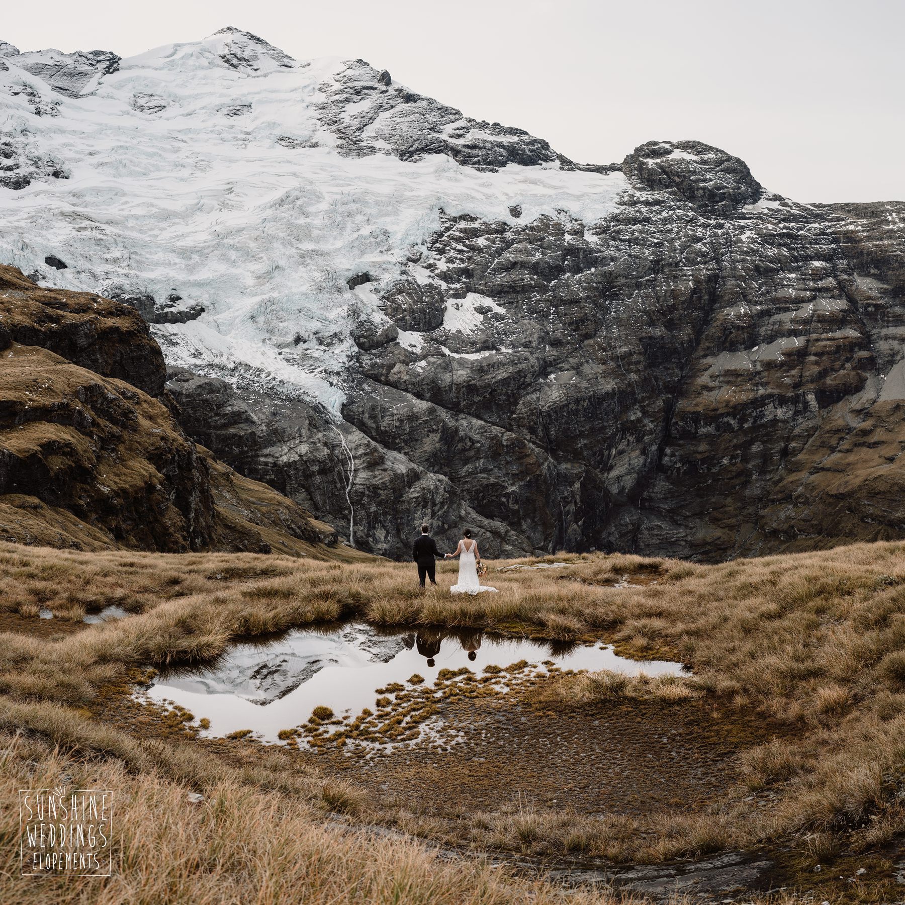 Scott started with them for a relaxed first look photos and walkabout at Gibbston Valley Lodge before heading in to the helicopter hangar. Weather is always the unknown element in any mountain wedding and low cloud meant the helicopter couldn’t landing at Coromandel Peak. Sometimes the plan B is even better though and the ceremony location at Mt Alpha floated above the clouds in a dreamy, surreal landscape. Then after the goodbyes, off to Earnslaw Tarns with mirror-glass tarns reflecting the Earnslaw Glacier looming behind.