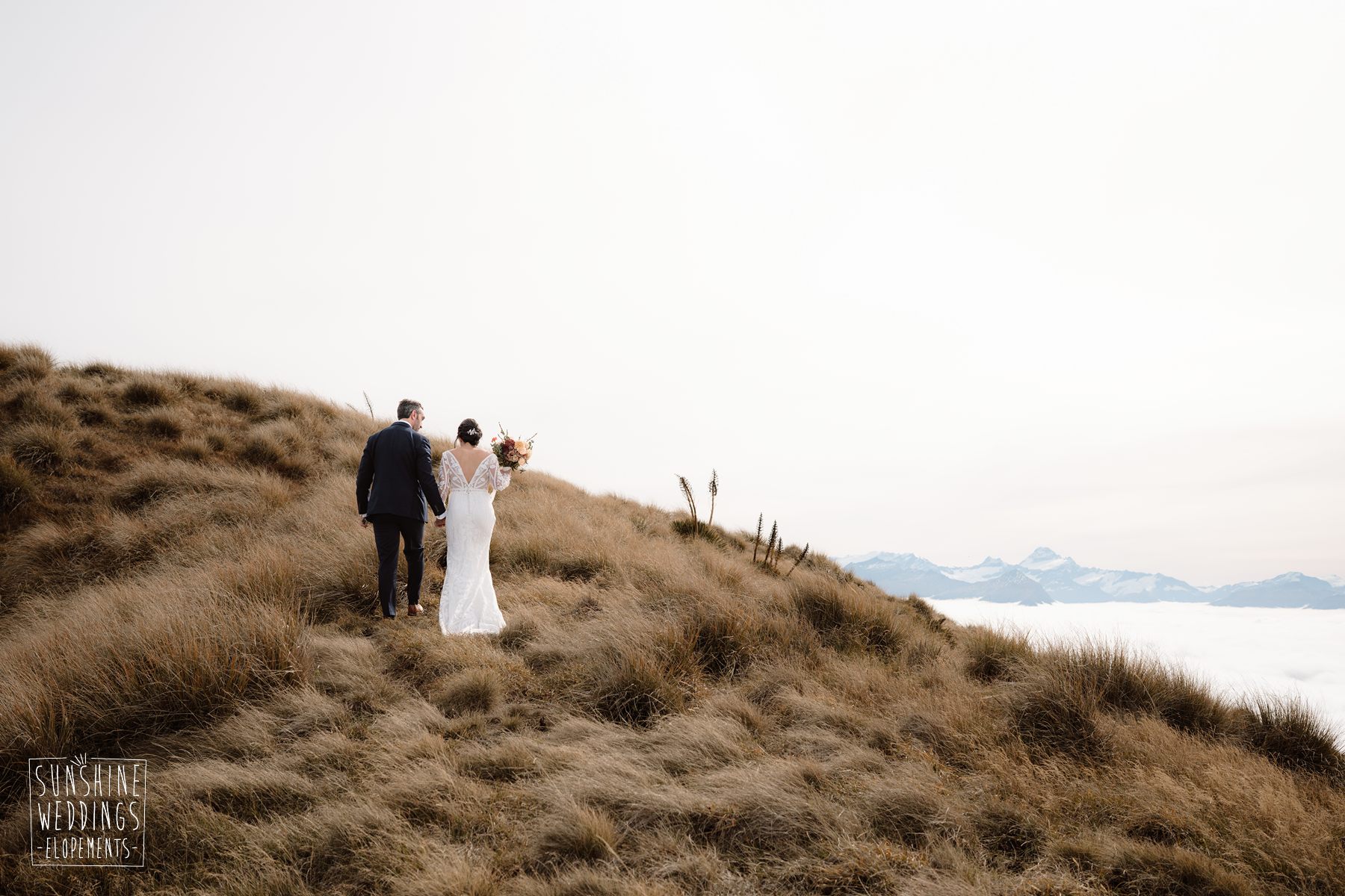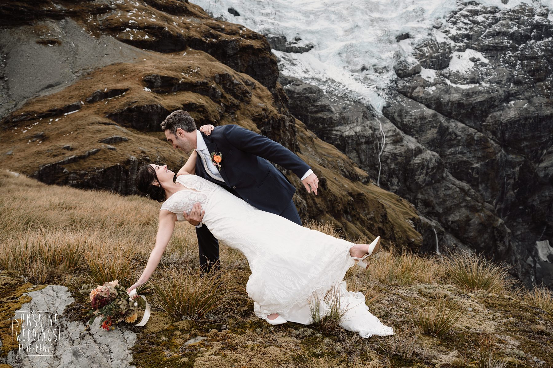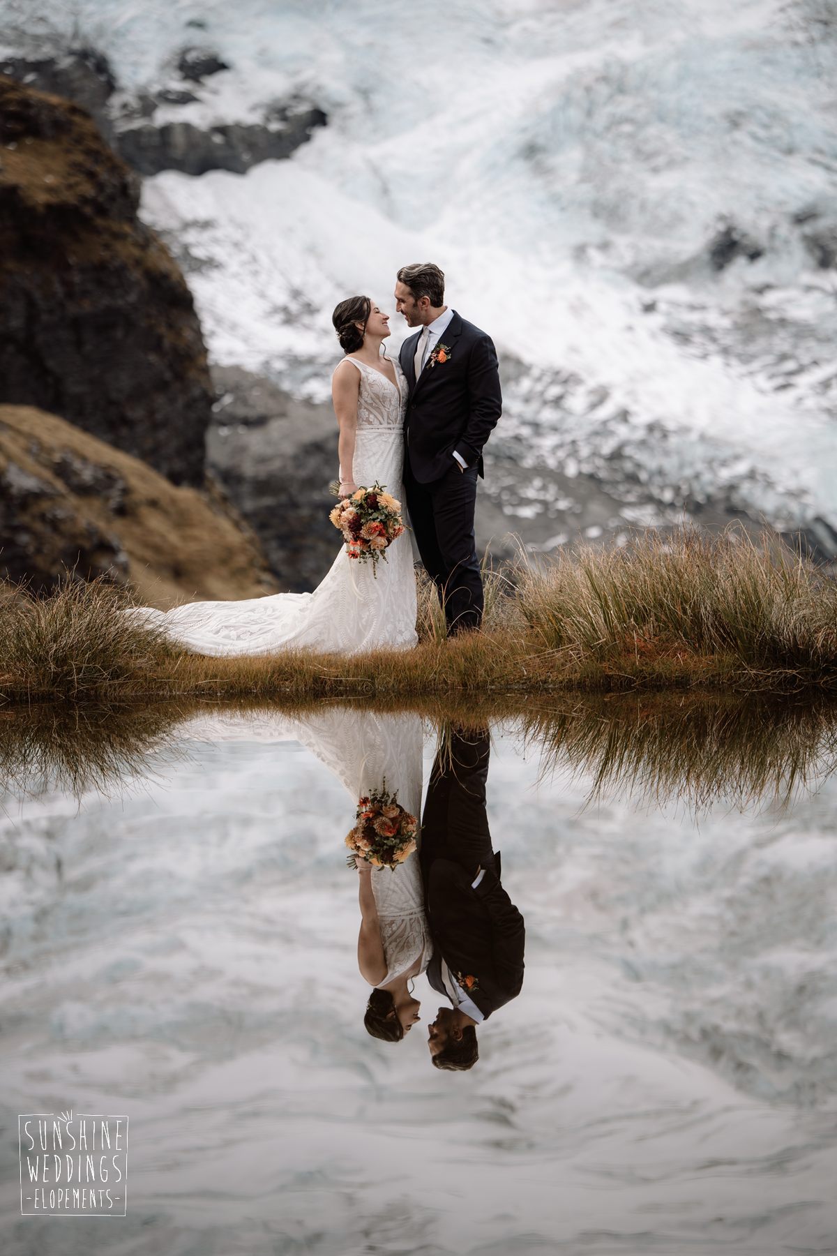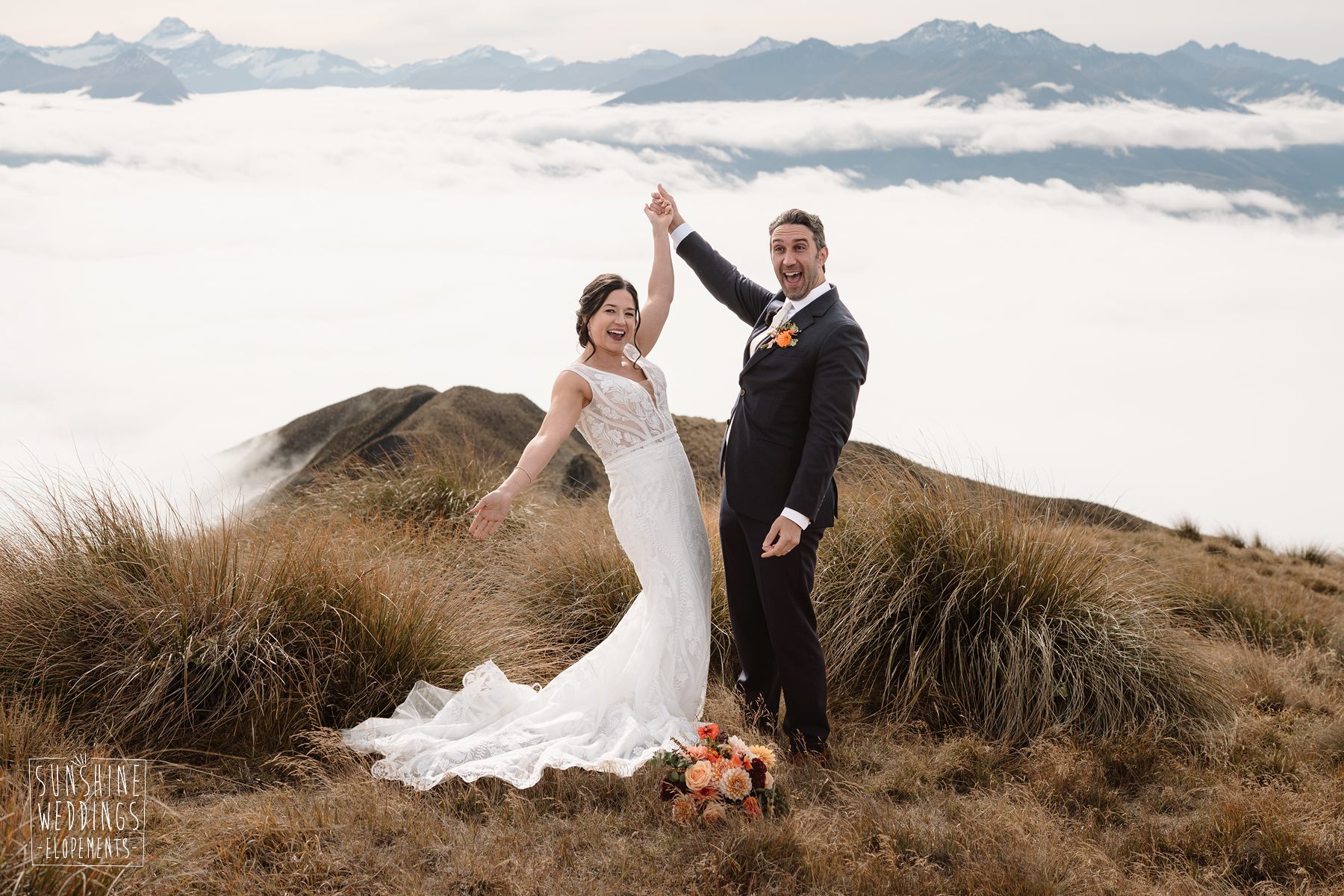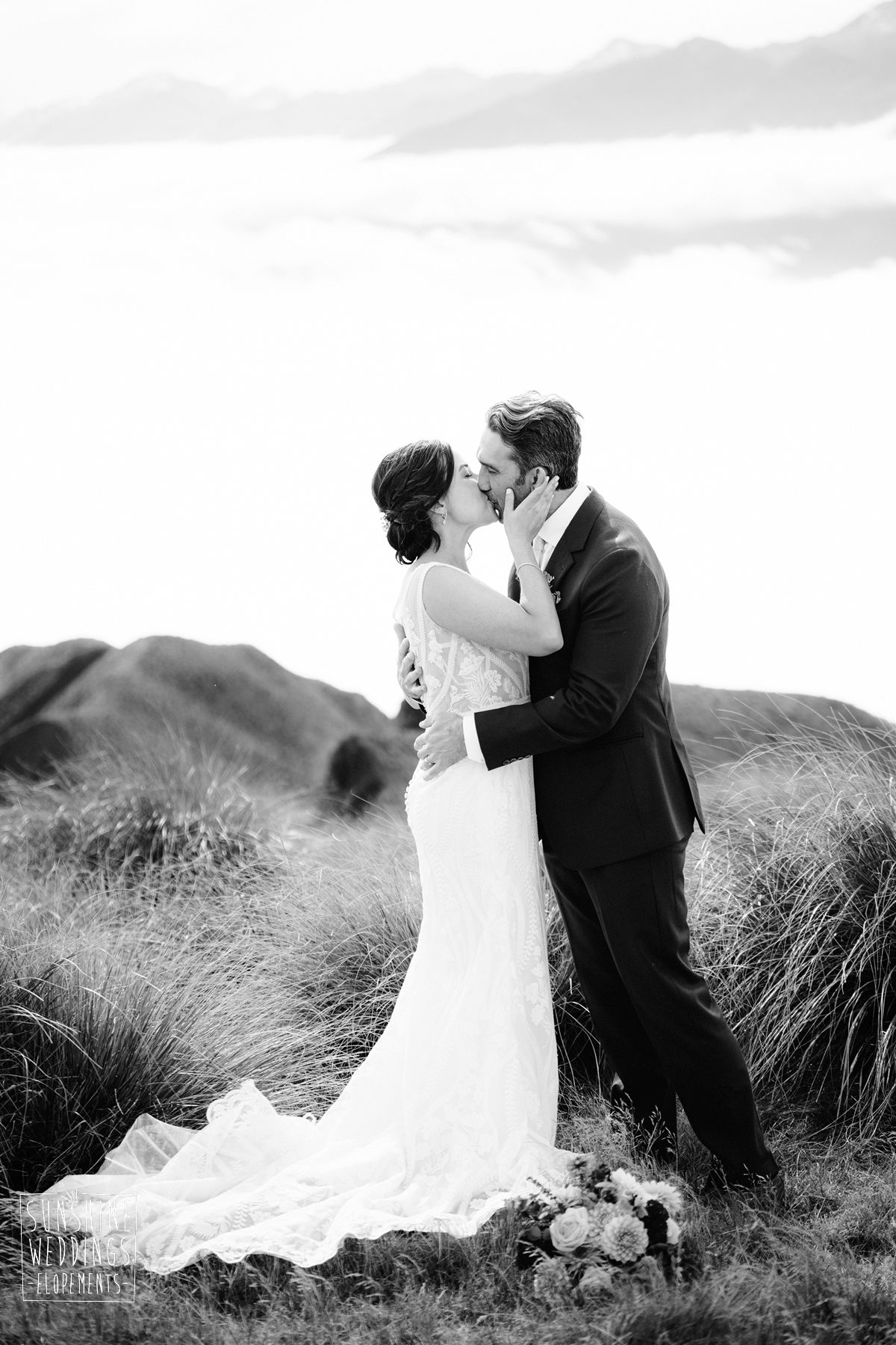 Scott started with them for a relaxed first look photos and walkabout at Gibbston Valley Lodge before heading in to the helicopter hangar. Weather is always the unknown element in any mountain wedding and low cloud meant the helicopter couldn’t landing at Coromandel Peak. Sometimes the plan B is even better though and the ceremony location at Mt Alpha floated above the clouds in a dreamy, surreal landscape. Then after the goodbyes, off to Earnslaw Tarns with mirror-glass tarns reflecting the Earnslaw Glacier looming behind.