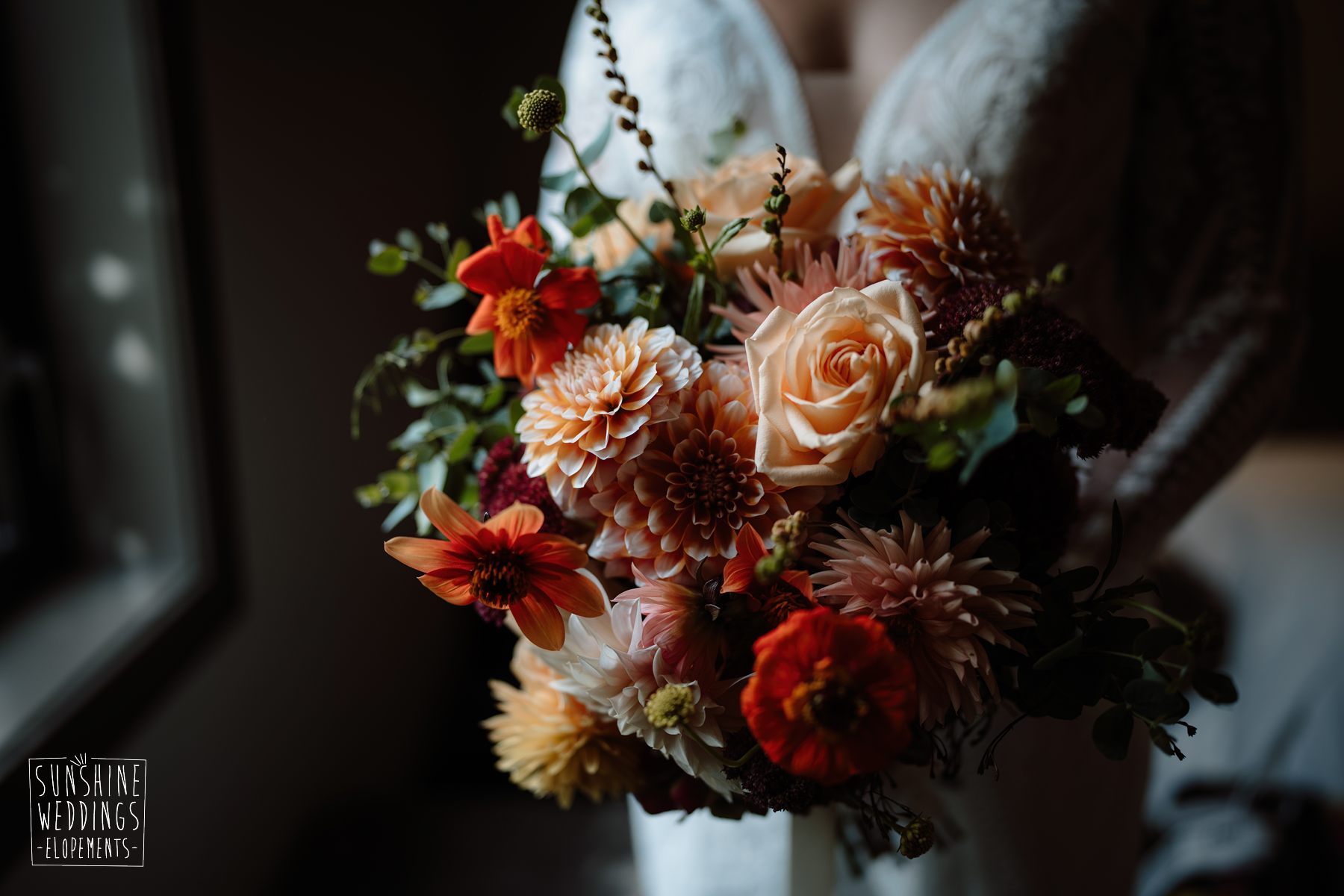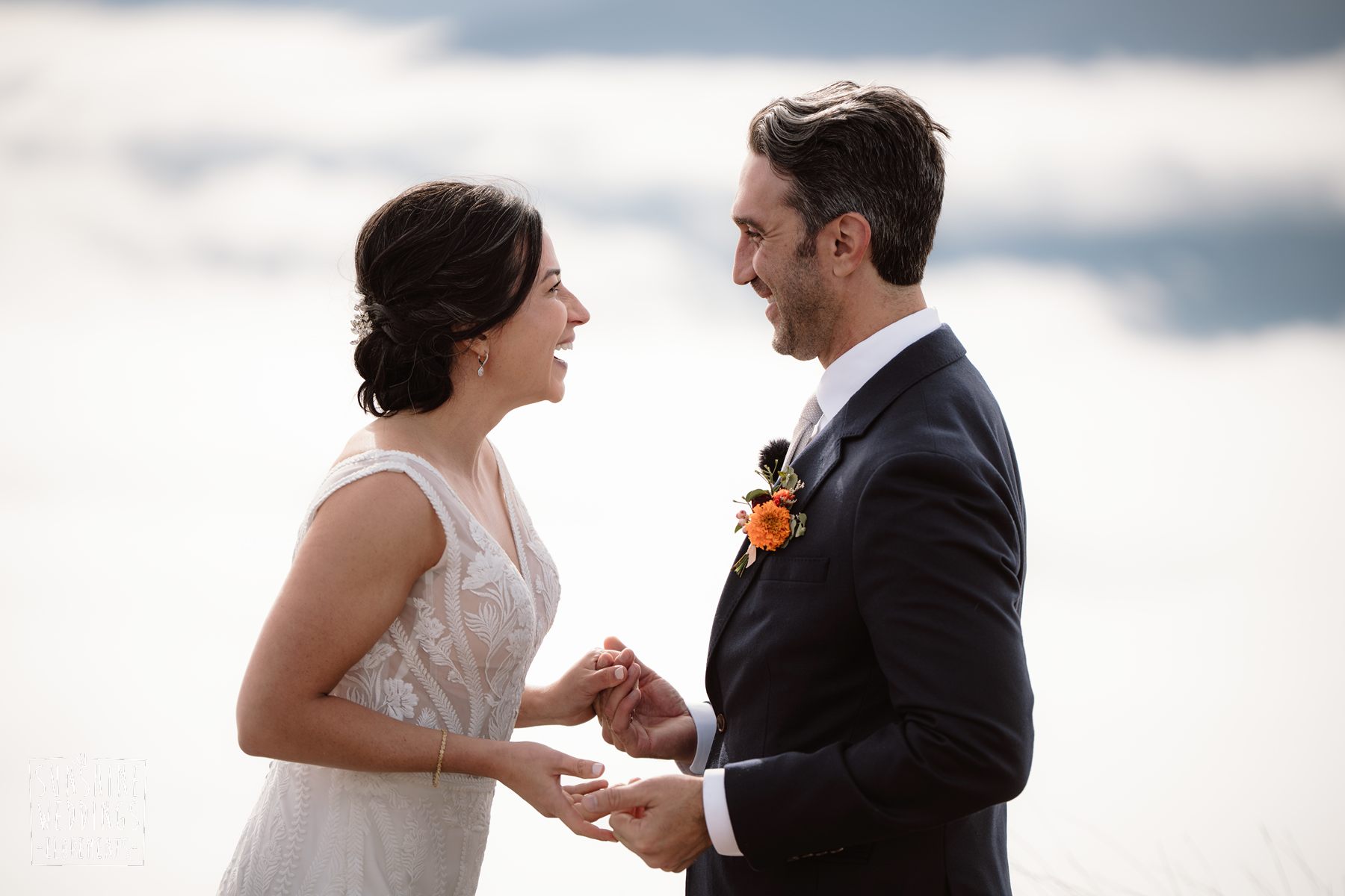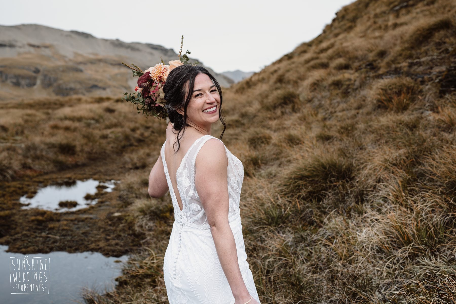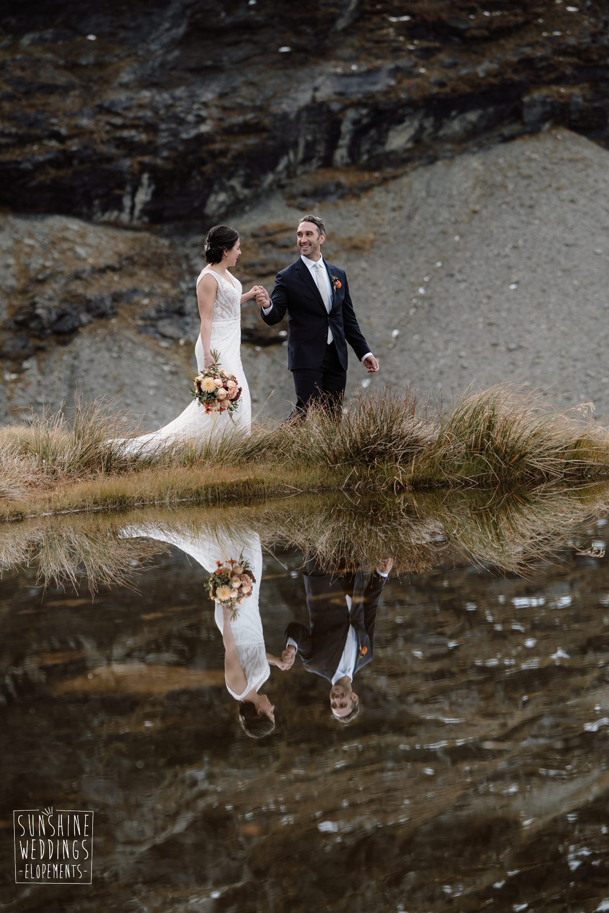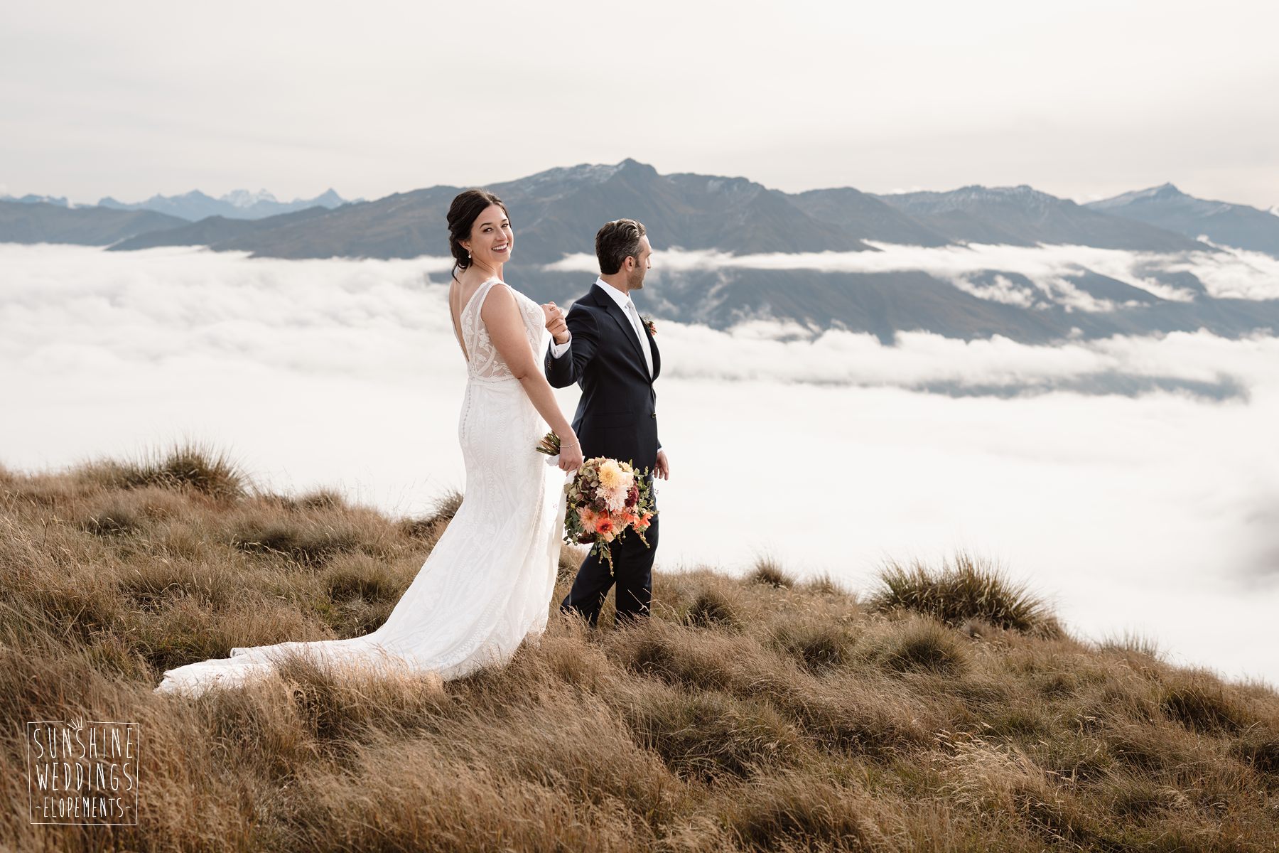 Scott started with them for a relaxed first look photos and walkabout at Gibbston Valley Lodge before heading in to the helicopter hangar. Weather is always the unknown element in any mountain wedding and low cloud meant the helicopter couldn’t landing at Coromandel Peak. Sometimes the plan B is even better though and the ceremony location at Mt Alpha floated above the clouds in a dreamy, surreal landscape. Then after the goodbyes, off to Earnslaw Tarns with mirror-glass tarns reflecting the Earnslaw Glacier looming behind.