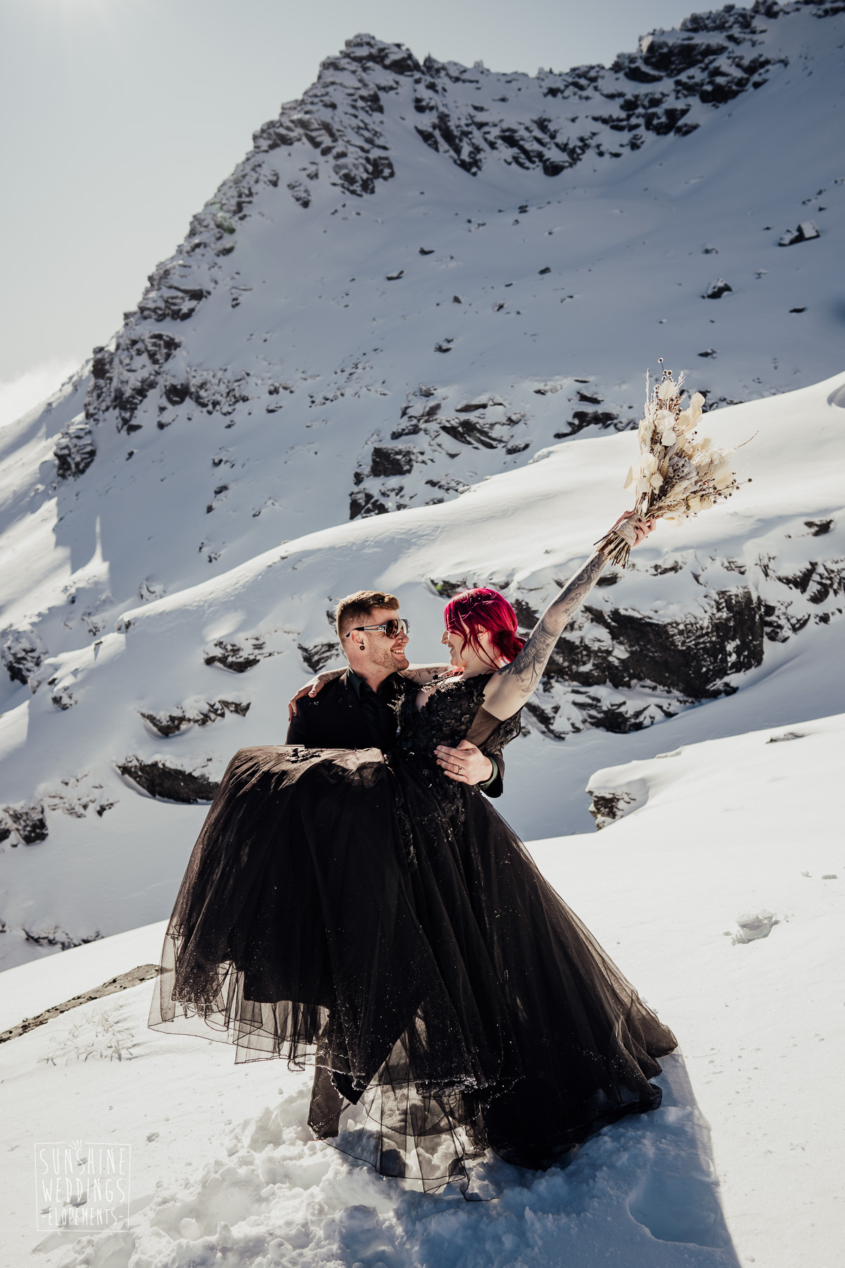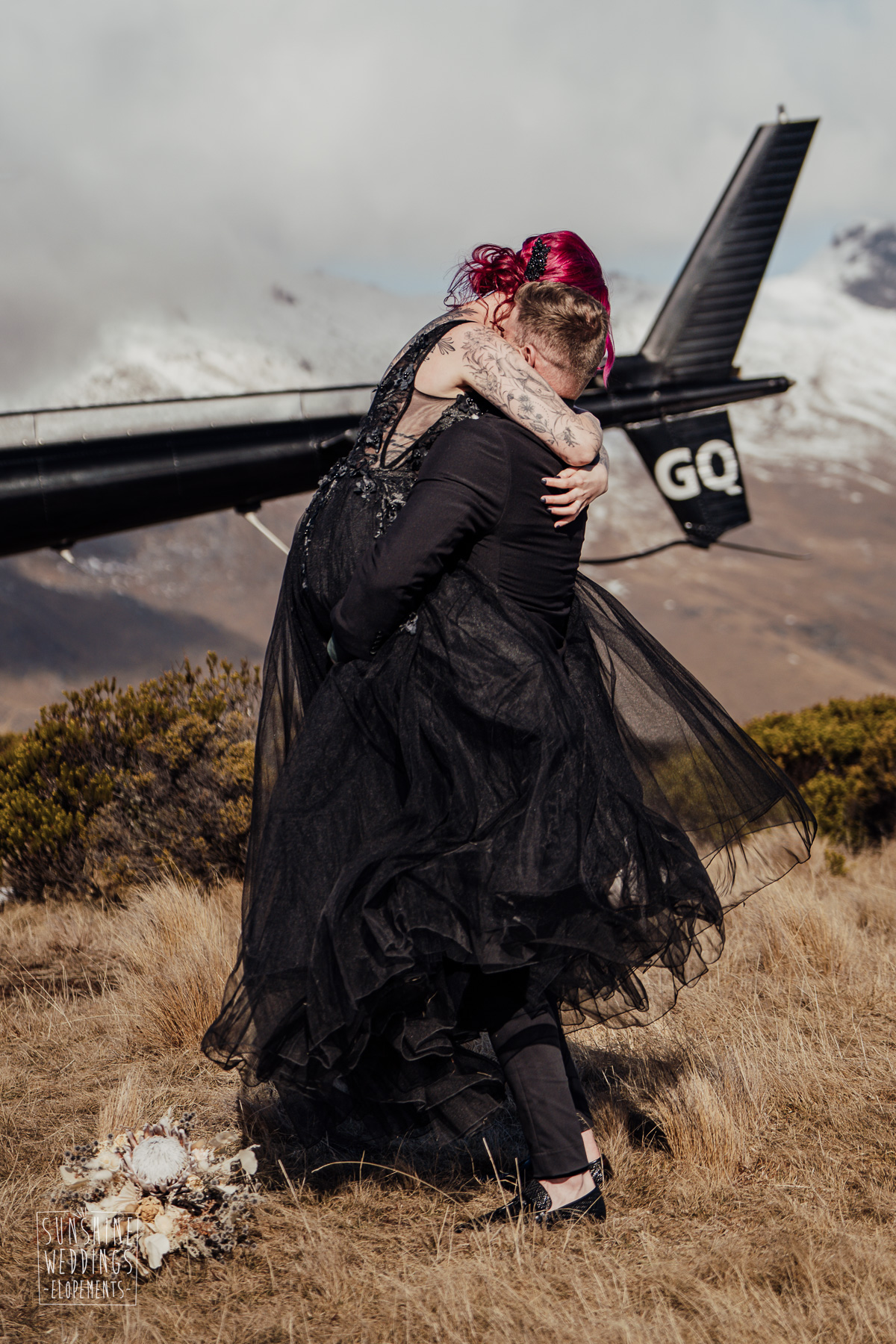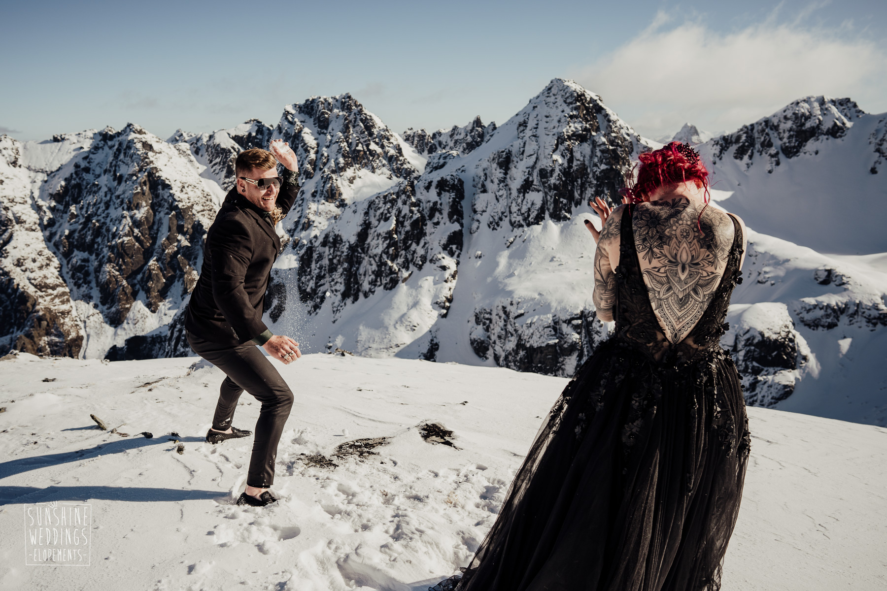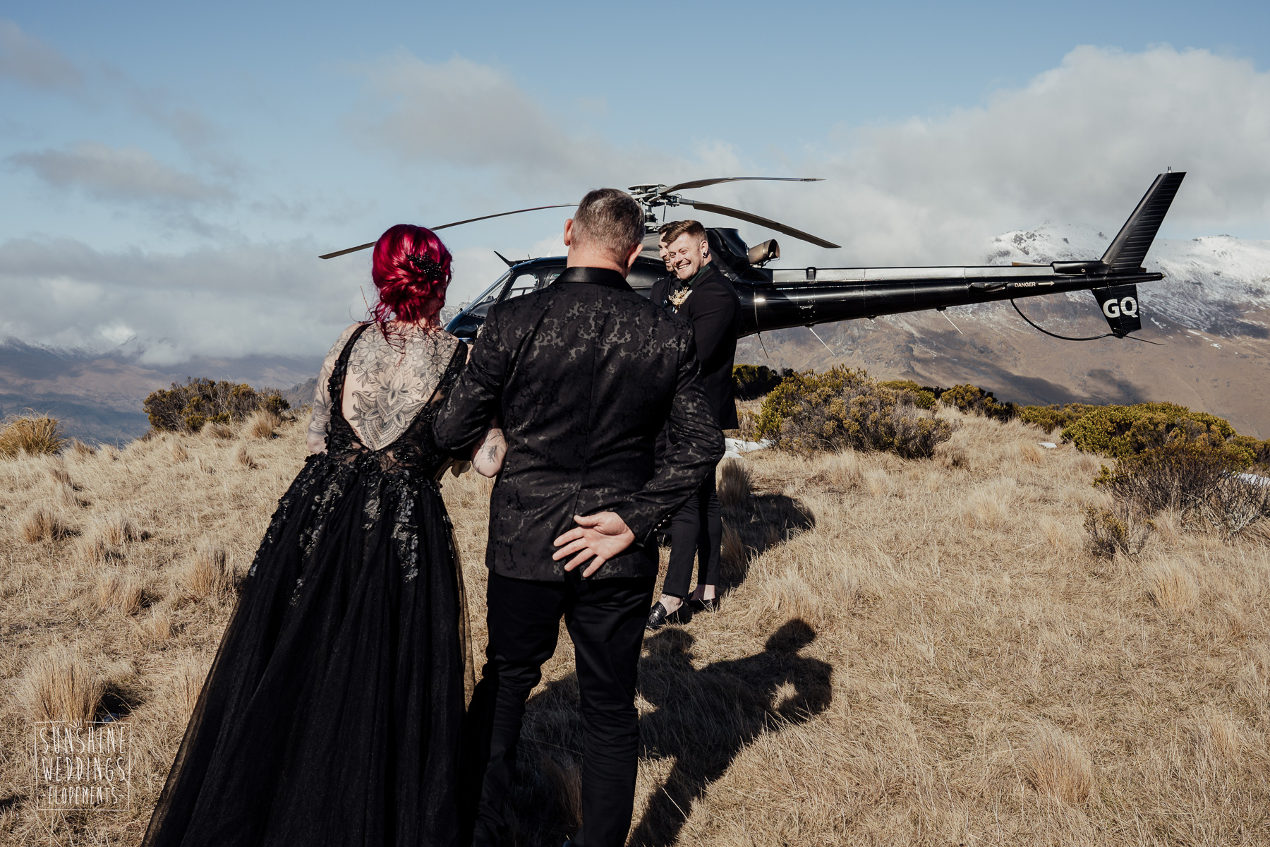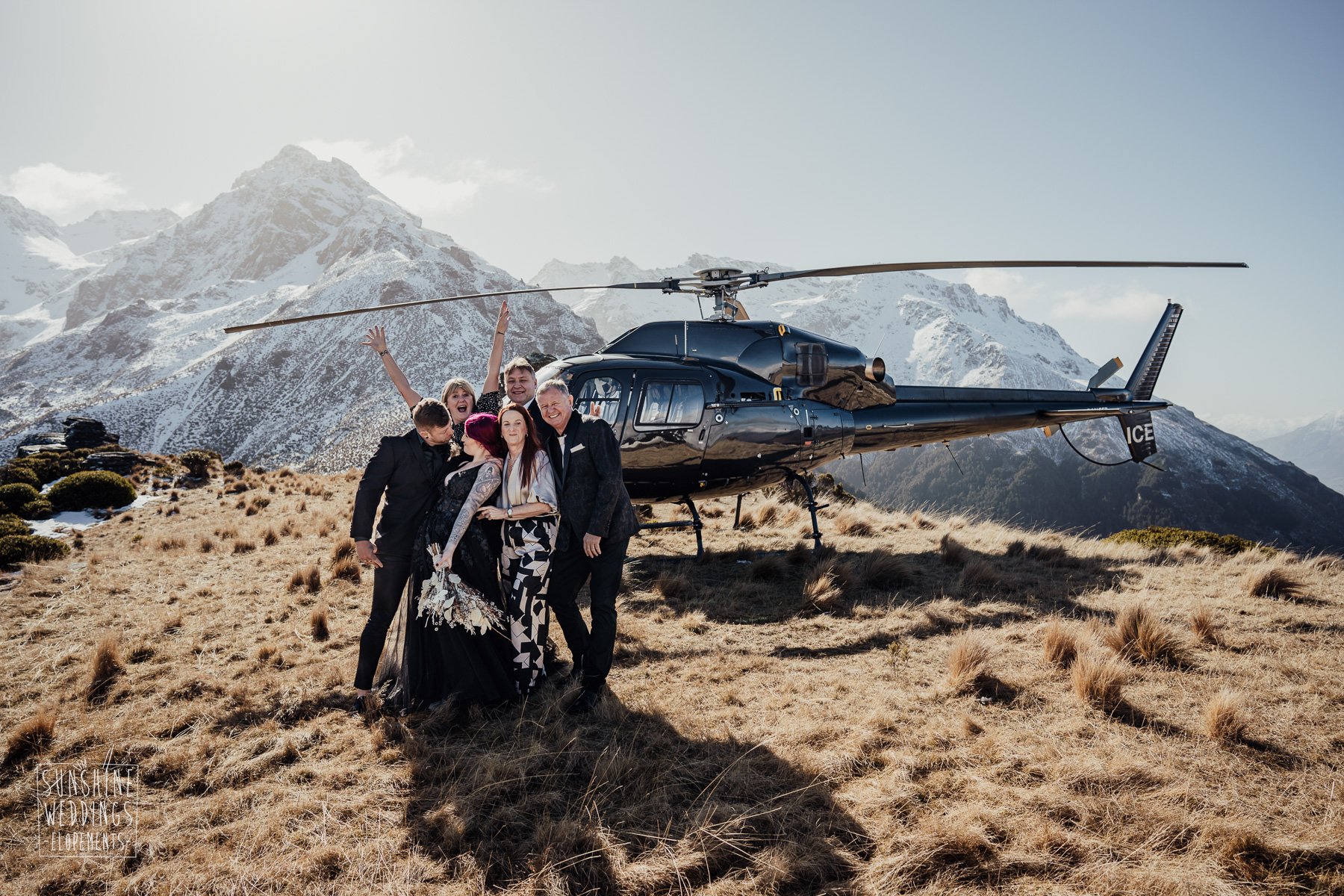 A blissed-out couple, gorgeous family, black dress, epic locations and serious wedding style all makes for an incredible Queenstown elopement and a very happy photographer! Their whole day was filled with laughter and a few hi-jinx with sneaky snowballs. Scott took them flying on a tiki-tour around the mountains and found a secret location in the middle of nowhere where no one had landed before, with plenty of fresh snow for a few more snowballs down the back. Loved it!