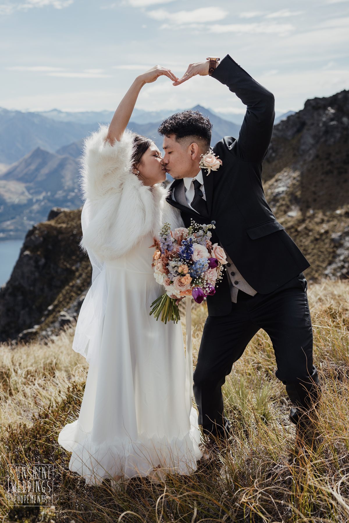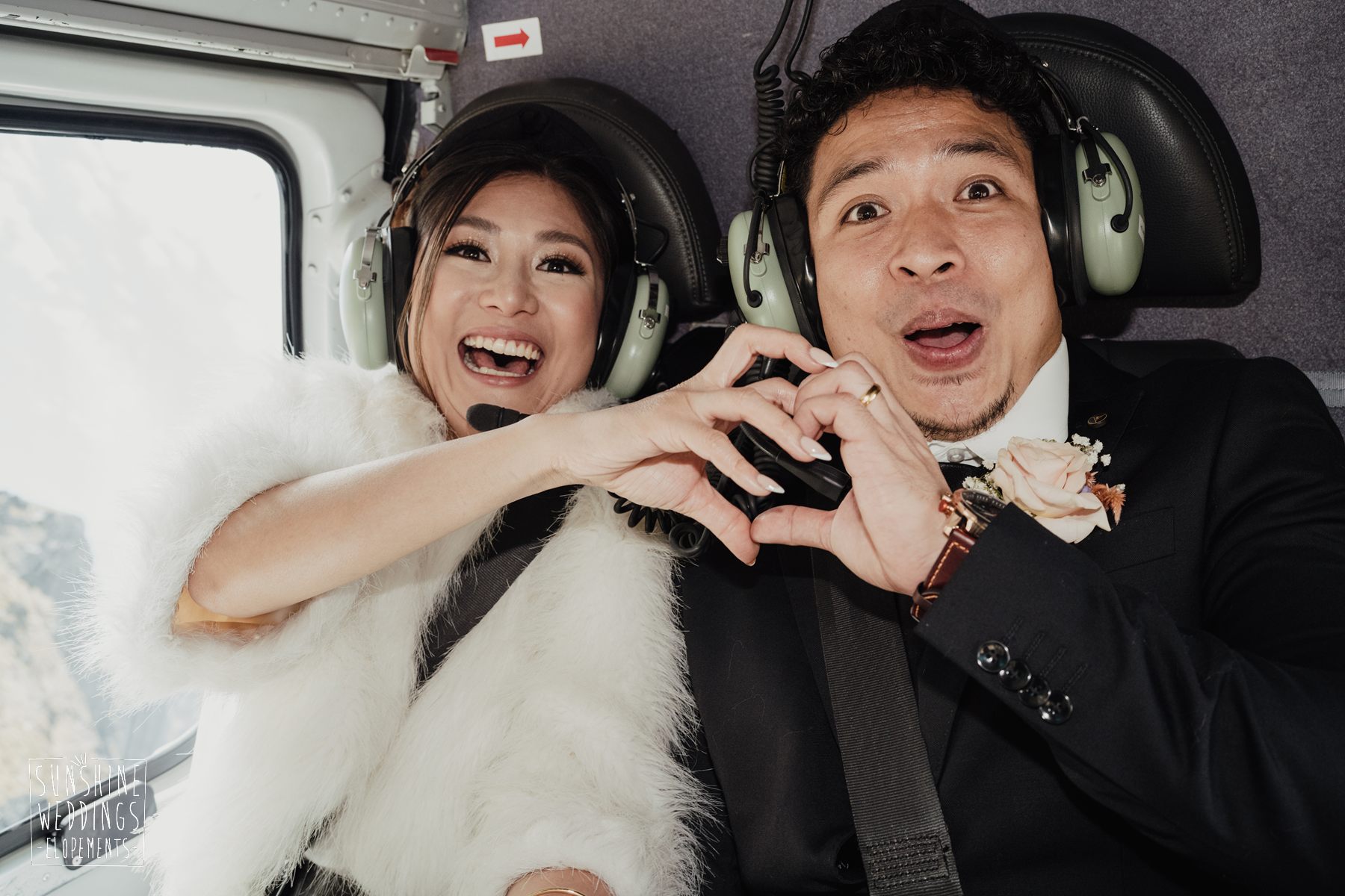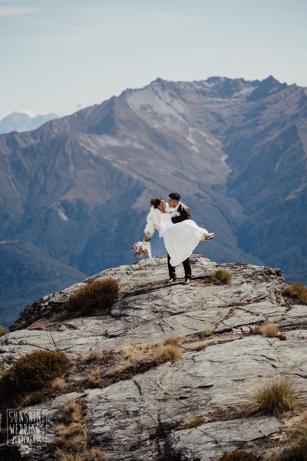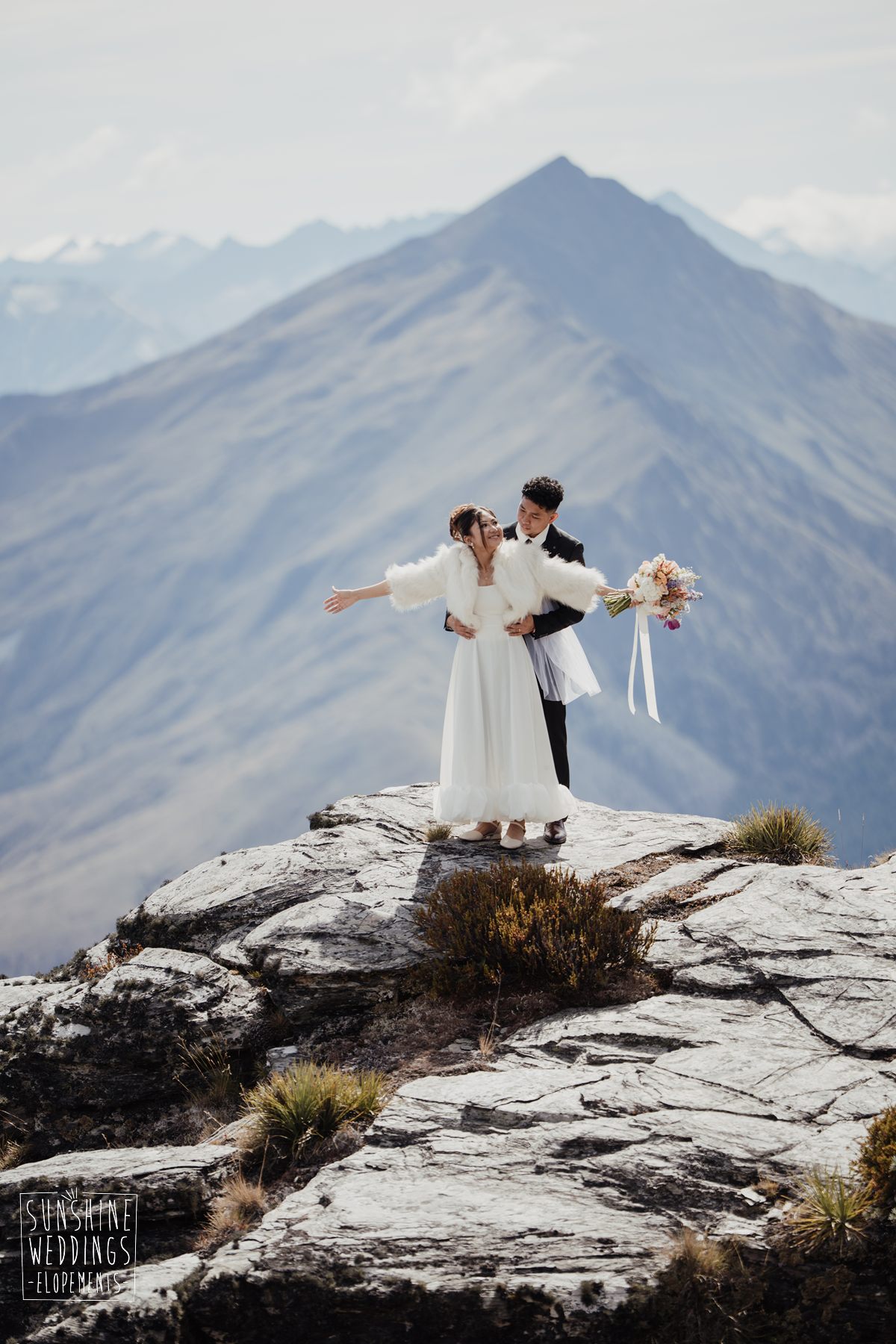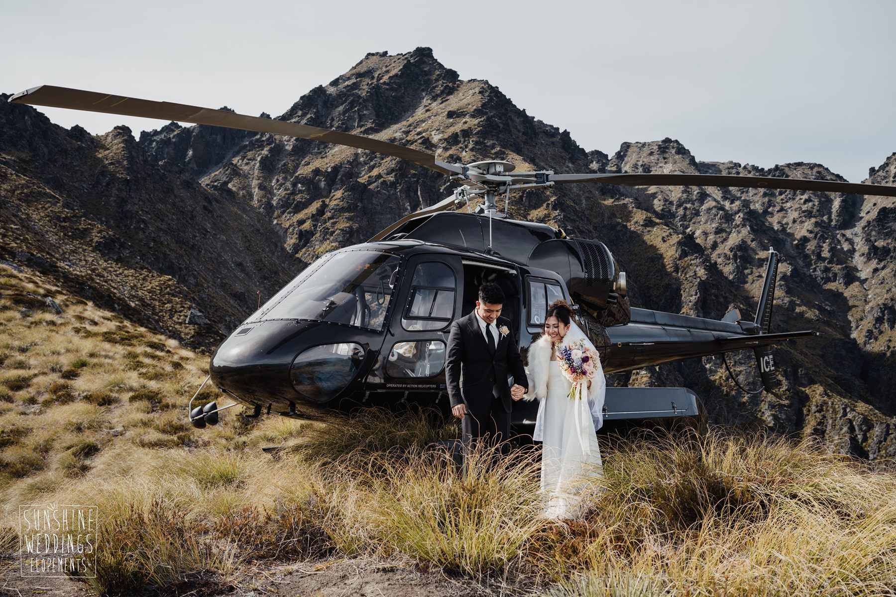 If we’re asked directly when is the best time to elope, we’ll always say Autumn. The sun is low and the light is soft and golden. As it was for Sharmaine and Daniel who had their very own glow going on. Scott collected them from their accommodation for a few photos before the flight, before flying up to Russ’s Drop landing location on Cecil Peak.