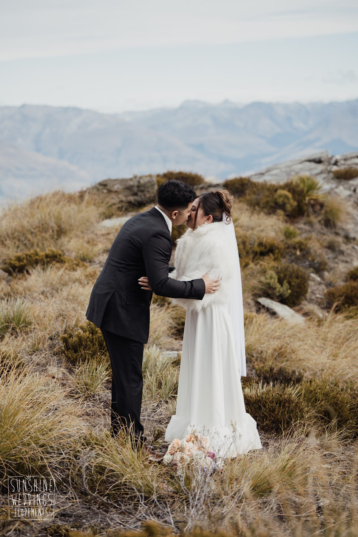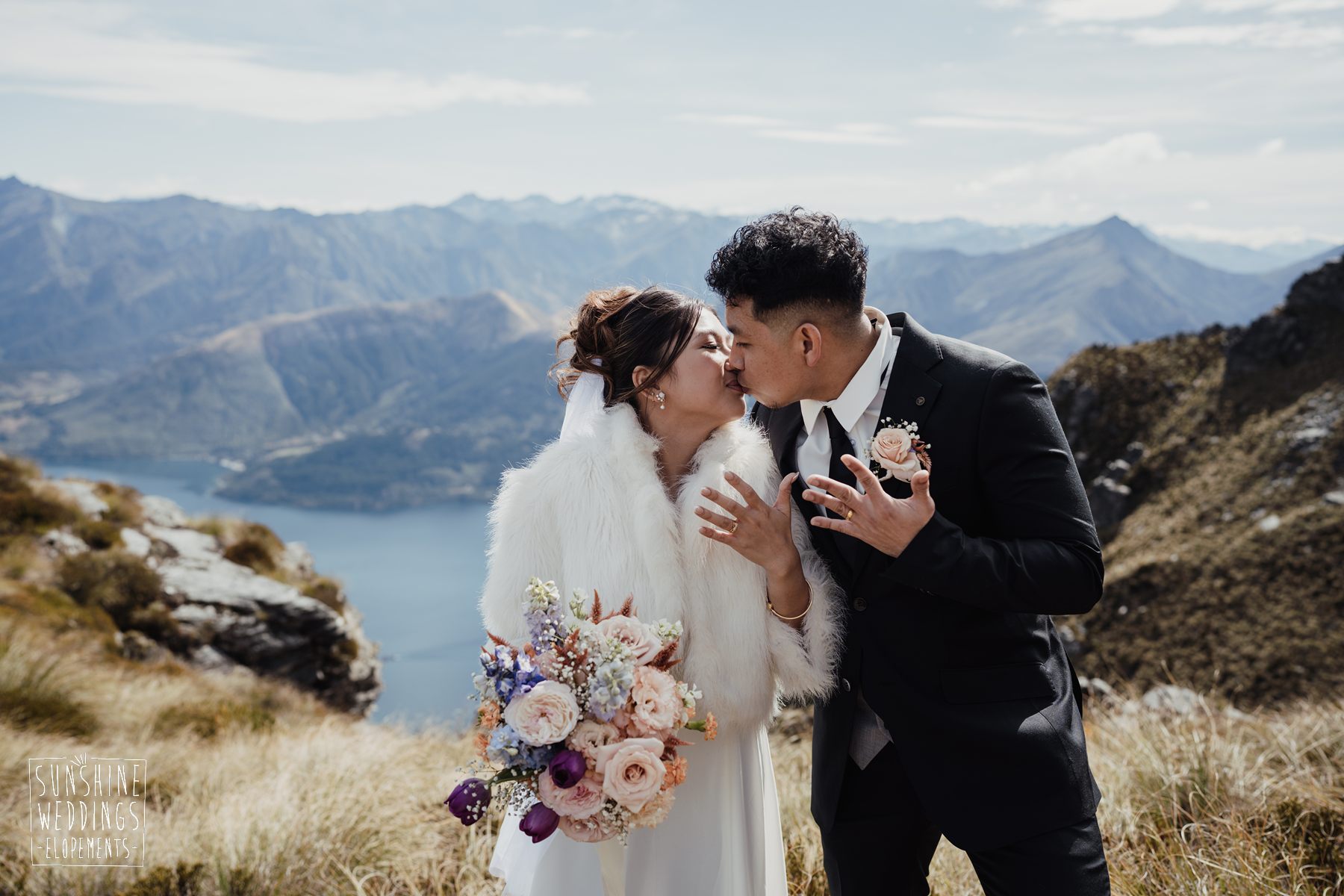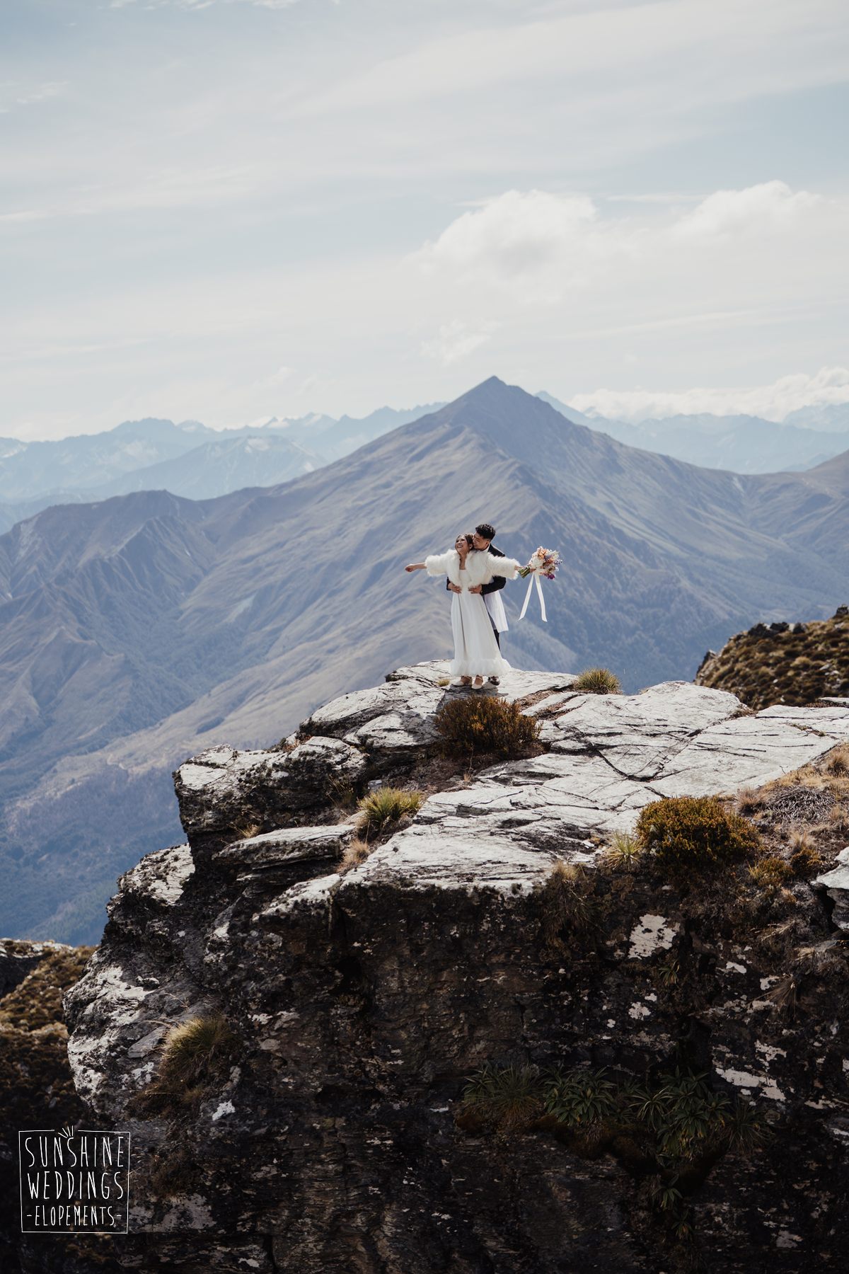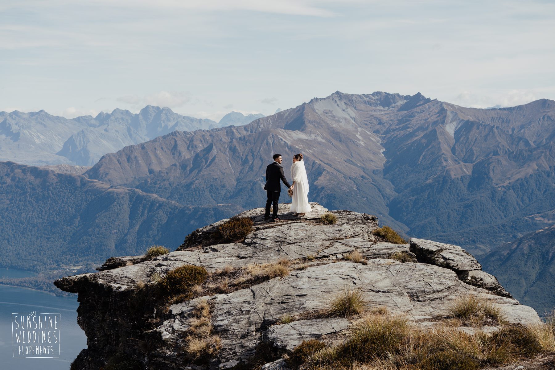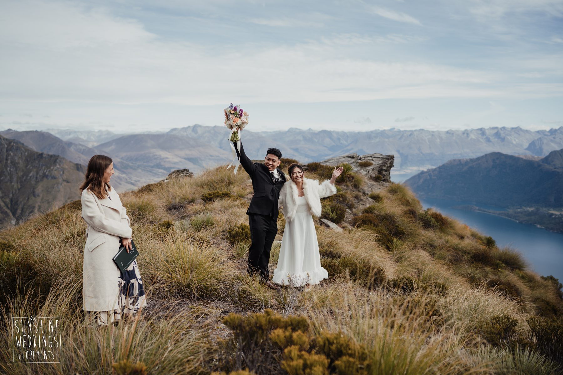 If we’re asked directly when is the best time to elope, we’ll always say Autumn. The sun is low and the light is soft and golden. As it was for Sharmaine and Daniel who had their very own glow going on. Scott collected them from their accommodation for a few photos before the flight, before flying up to Russ’s Drop landing location on Cecil Peak.