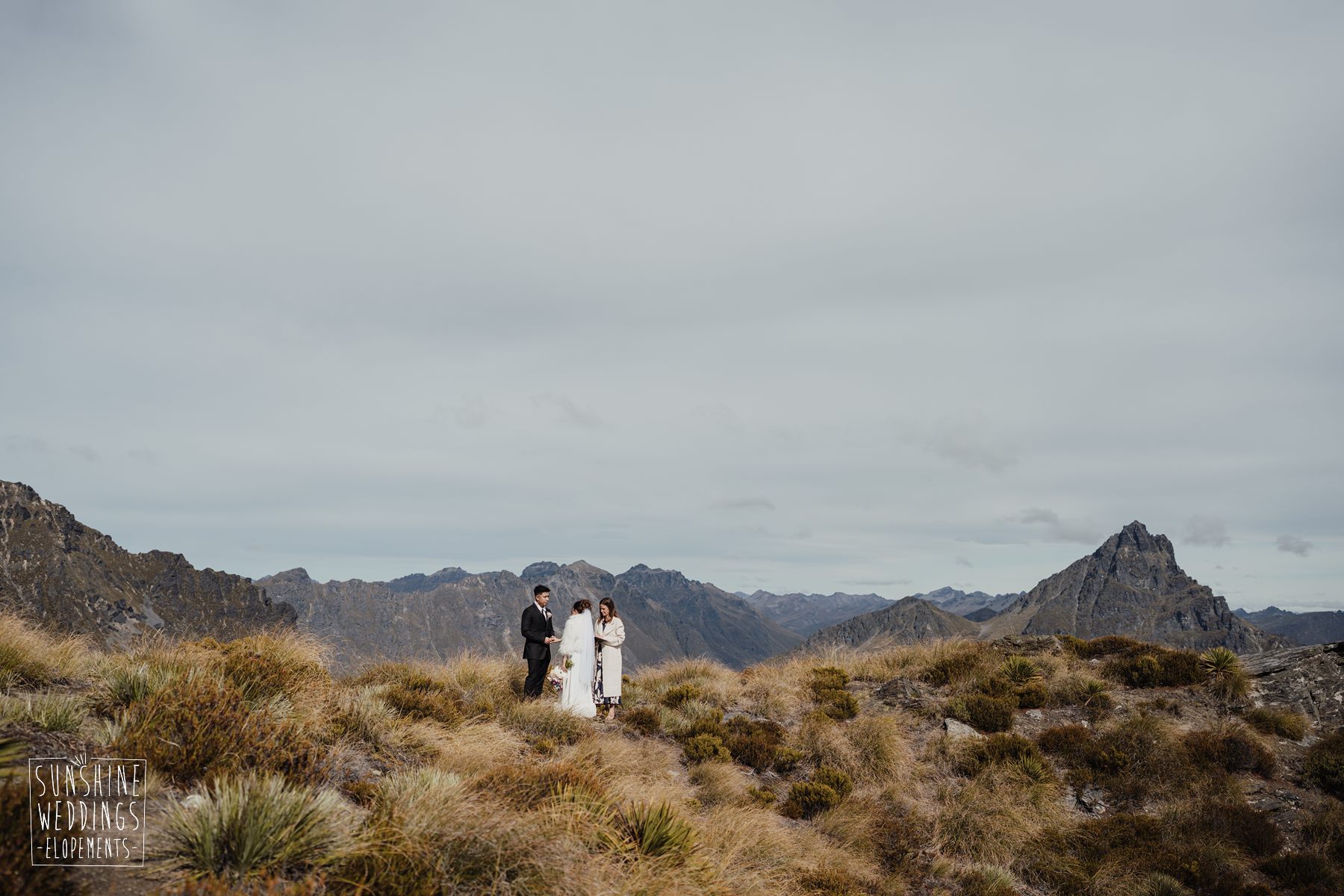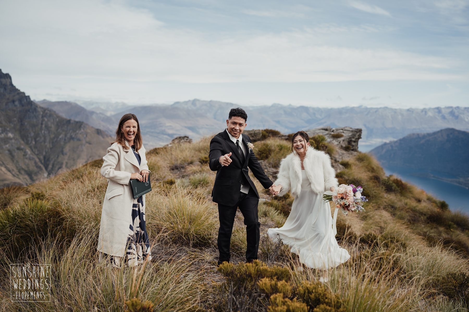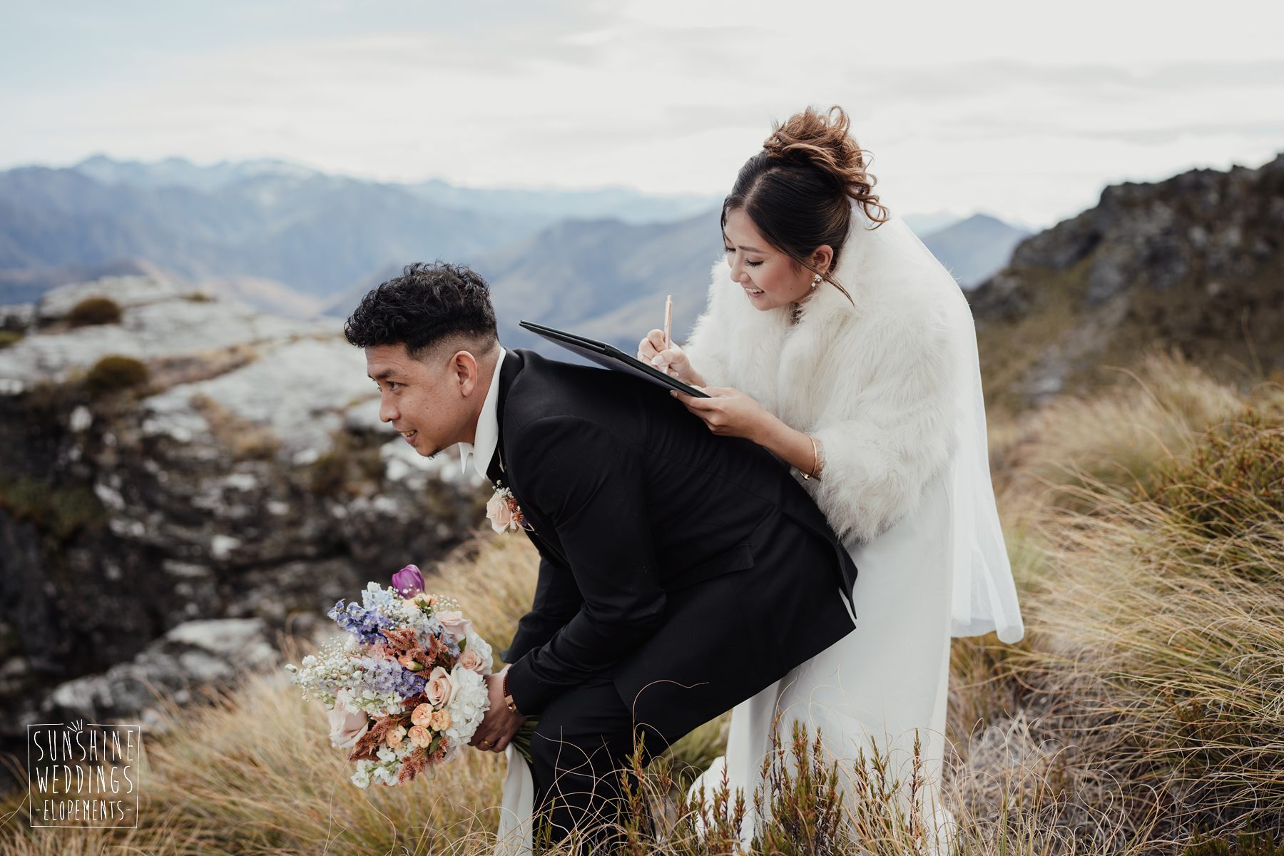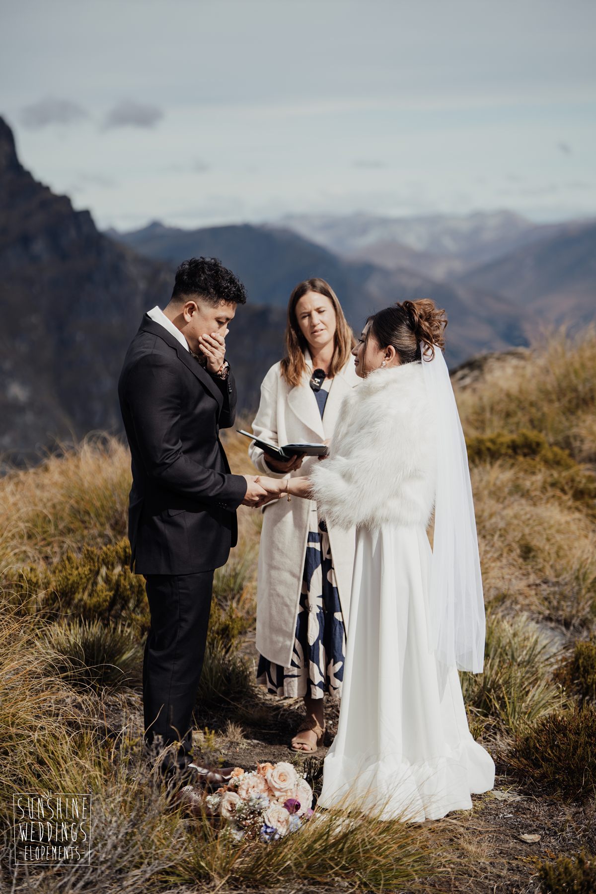 If we’re asked directly when is the best time to elope, we’ll always say Autumn. The sun is low and the light is soft and golden. As it was for Sharmaine and Daniel who had their very own glow going on. Scott collected them from their accommodation for a few photos before the flight, before flying up to Russ’s Drop landing location on Cecil Peak.