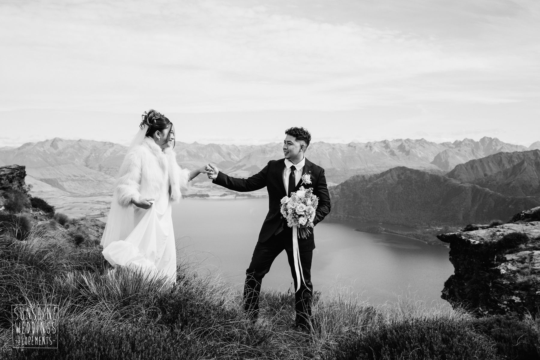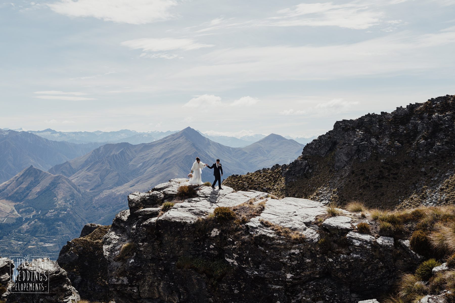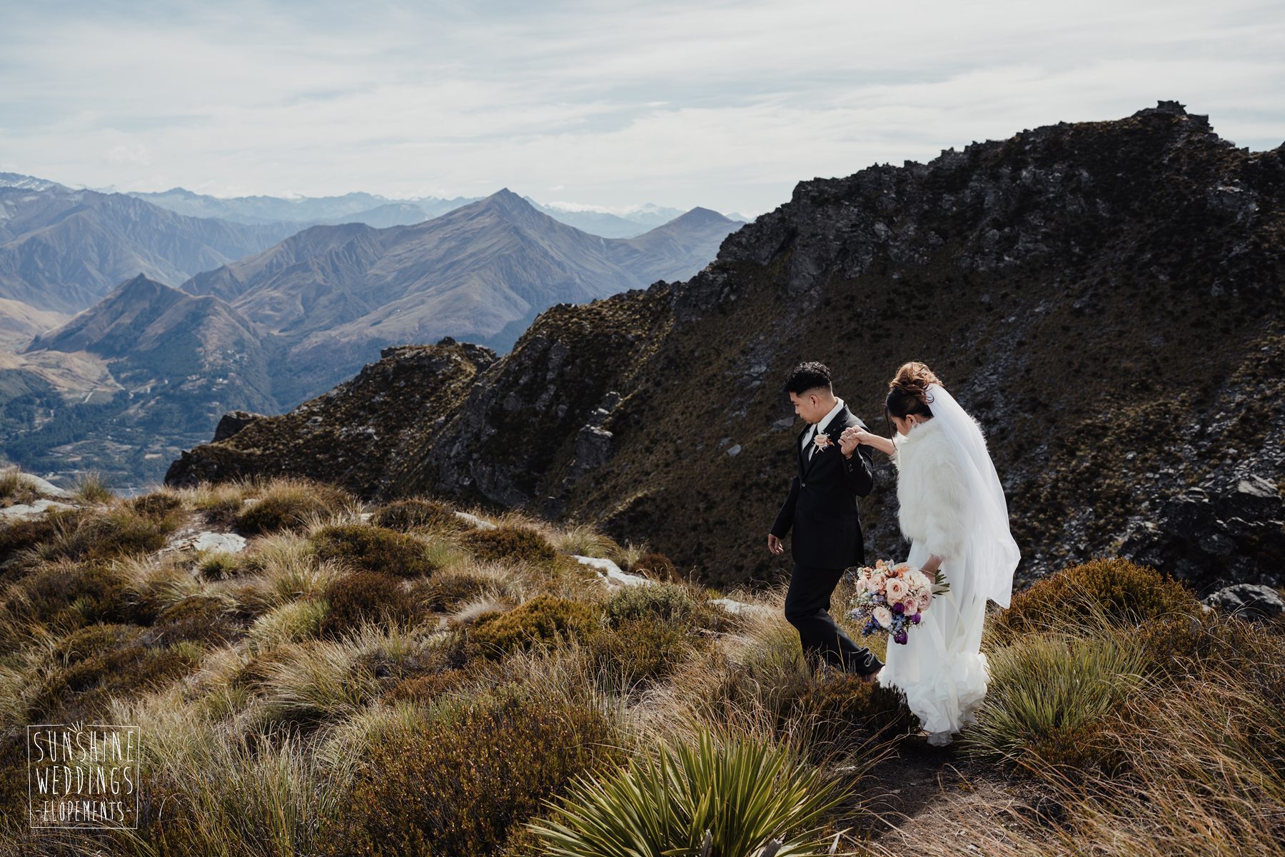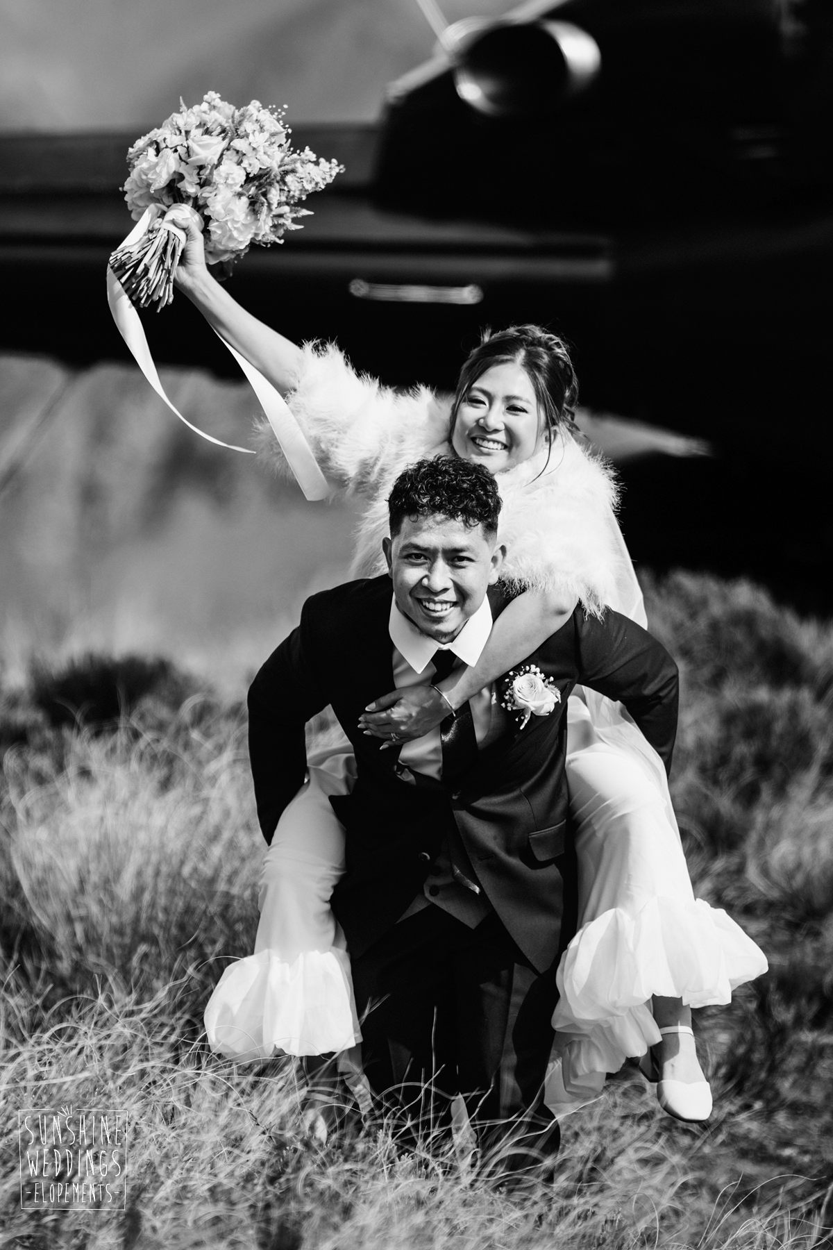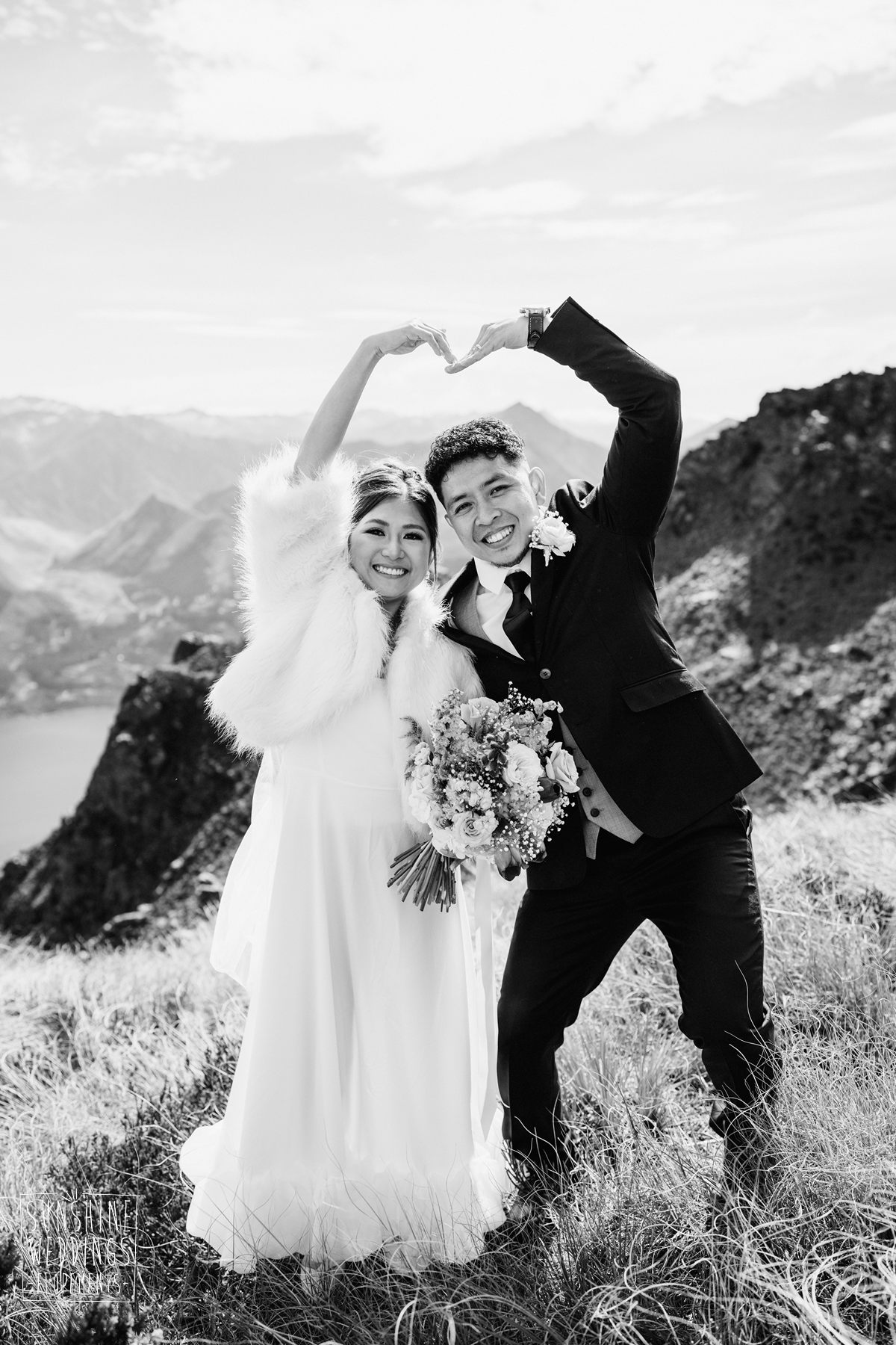 If we’re asked directly when is the best time to elope, we’ll always say Autumn. The sun is low and the light is soft and golden. As it was for Sharmaine and Daniel who had their very own glow going on. Scott collected them from their accommodation for a few photos before the flight, before flying up to Russ’s Drop landing location on Cecil Peak.
