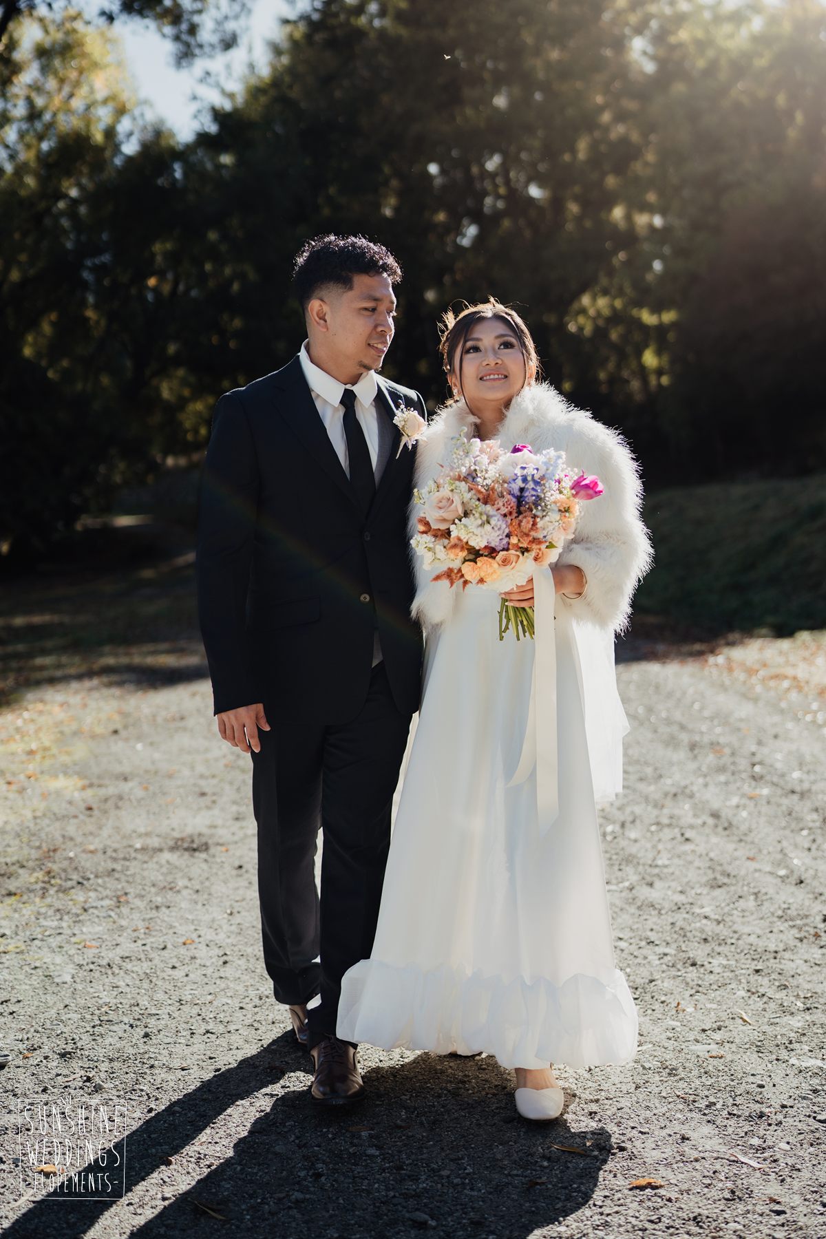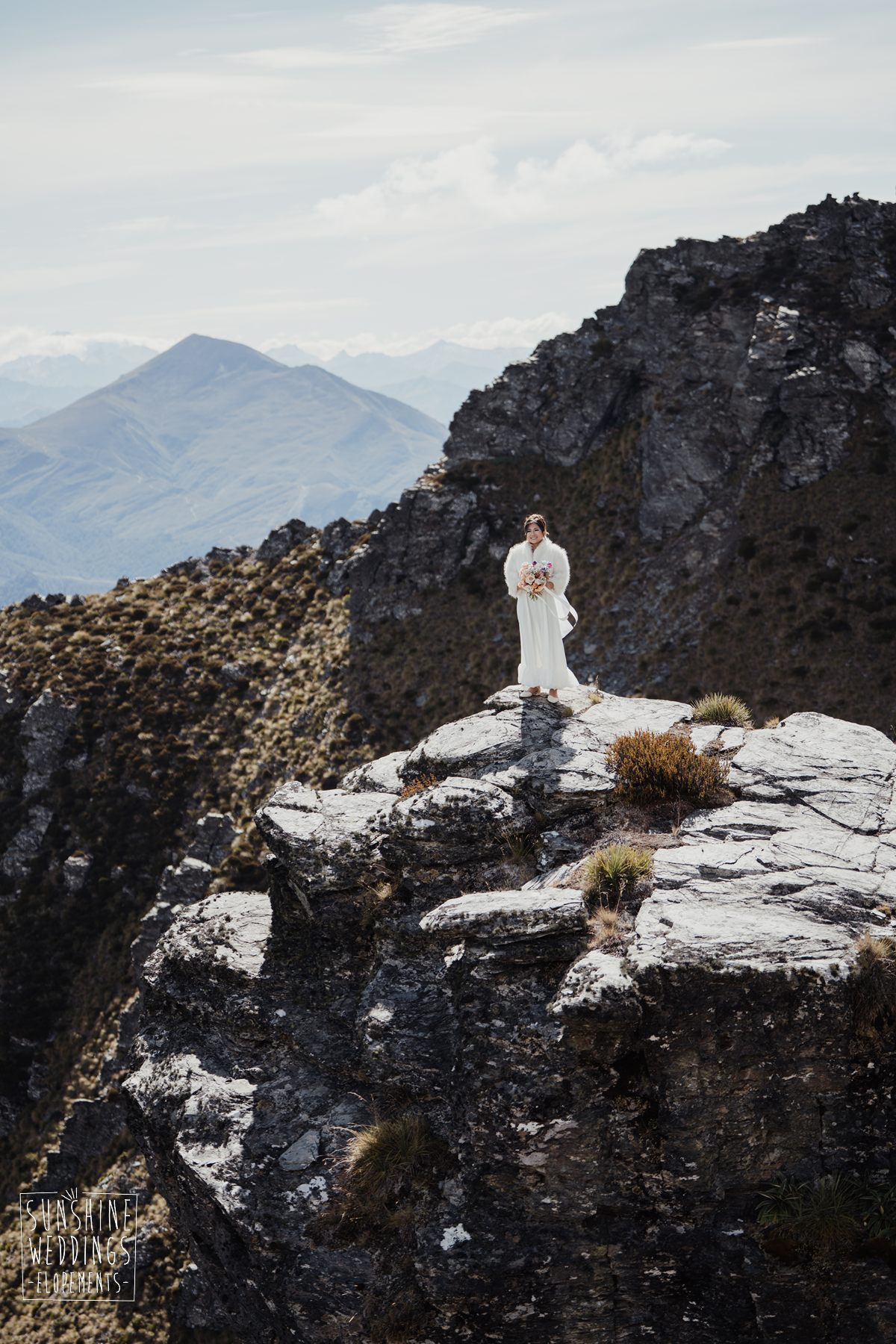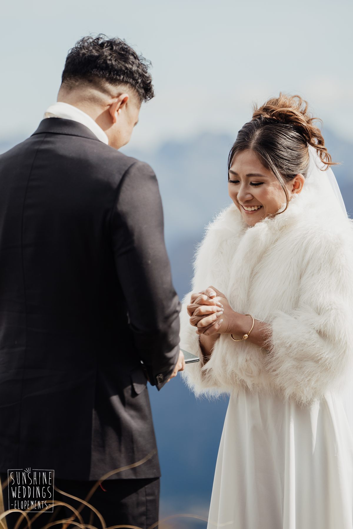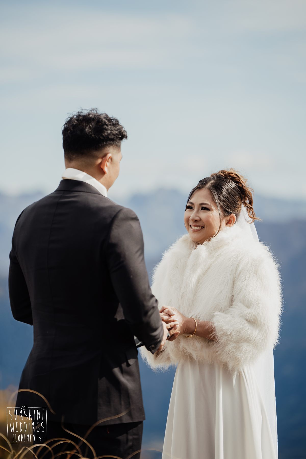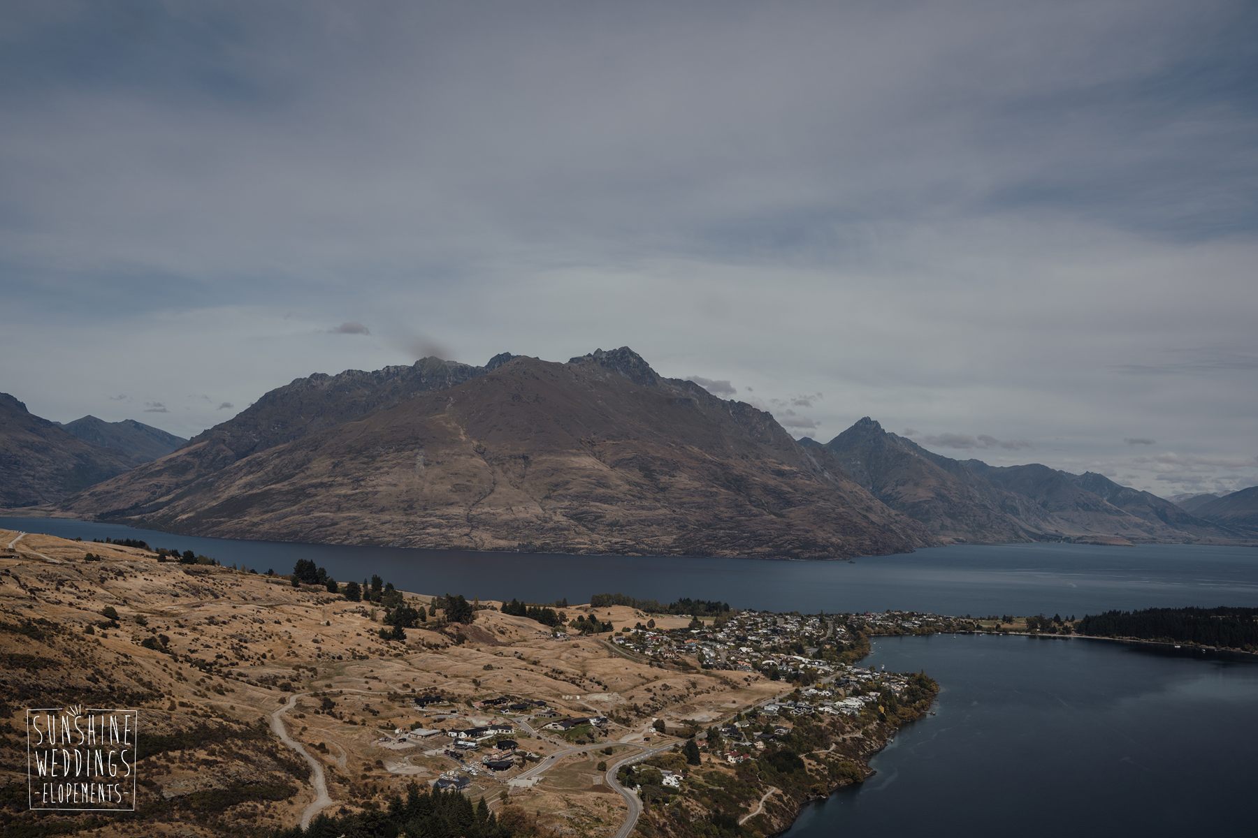 If we’re asked directly when is the best time to elope, we’ll always say Autumn. The sun is low and the light is soft and golden. As it was for Sharmaine and Daniel who had their very own glow going on. Scott collected them from their accommodation for a few photos before the flight, before flying up to Russ’s Drop landing location on Cecil Peak.