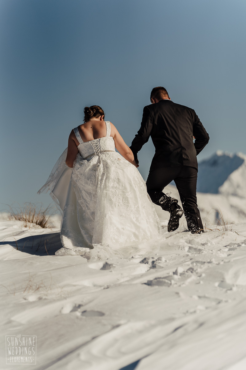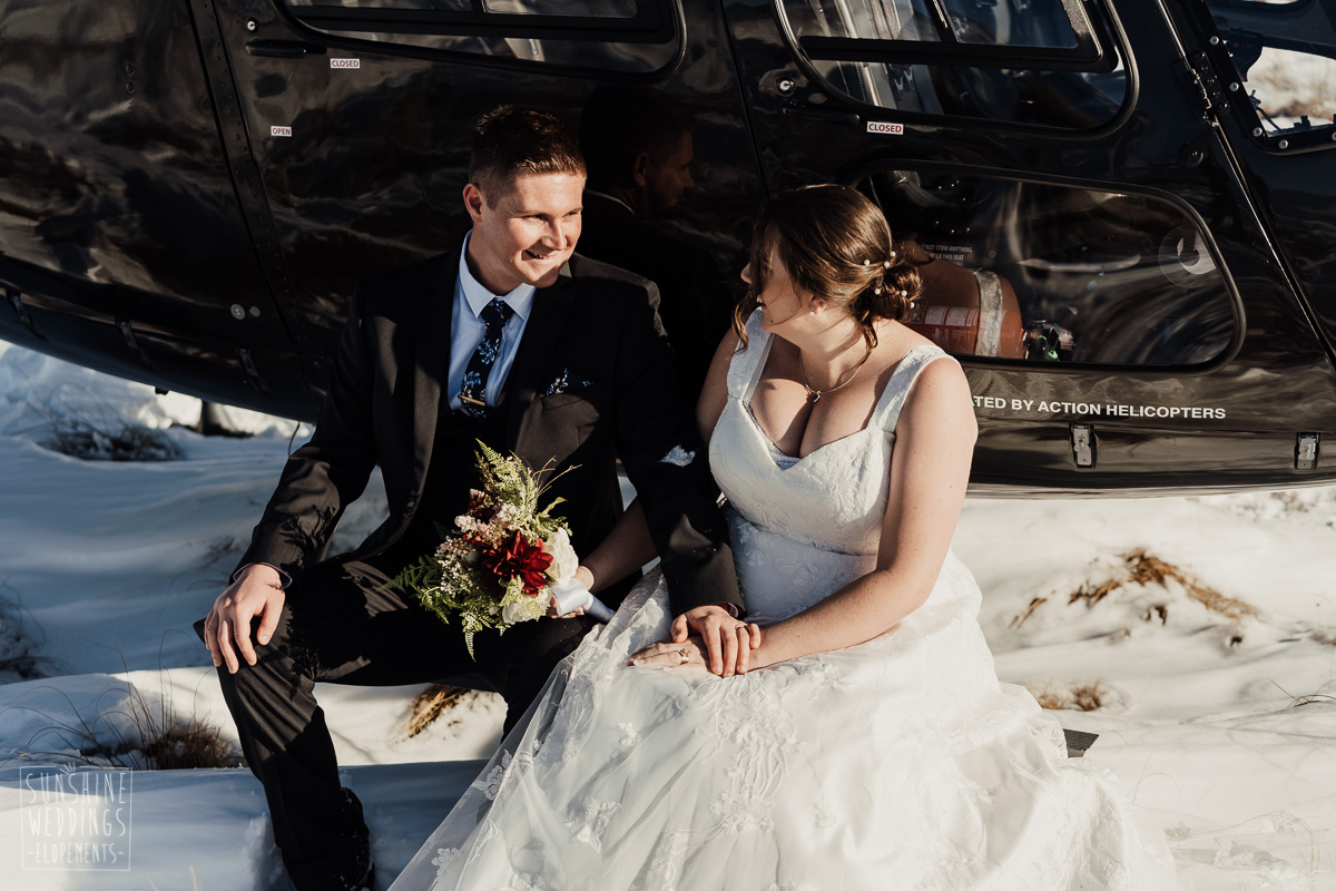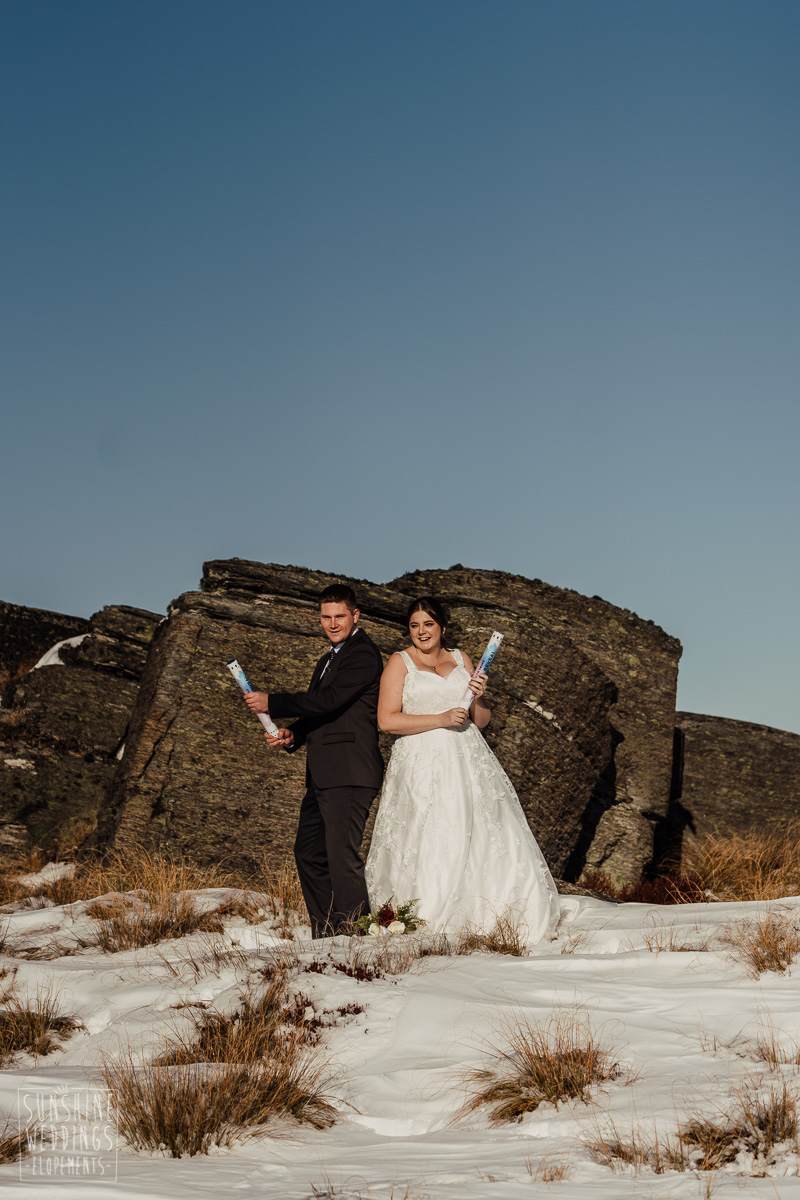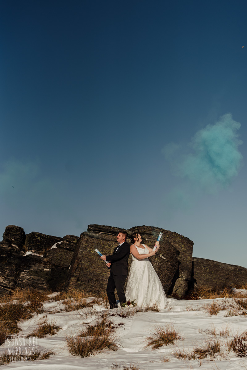 Brynee and Alex not only got married at one of our favourite locations, they also spilled some pretty big news! The flew with Brynee’s dad to Vanguard Peak for a ceremony surrounded by snow, snow and more snow! Before they flew over from Australia they had arranged for a smoke cannon to be sent to us. Scott took it along for a special gender reveal moment for Brynee to find out the sex of their new baby. It’s a boy!