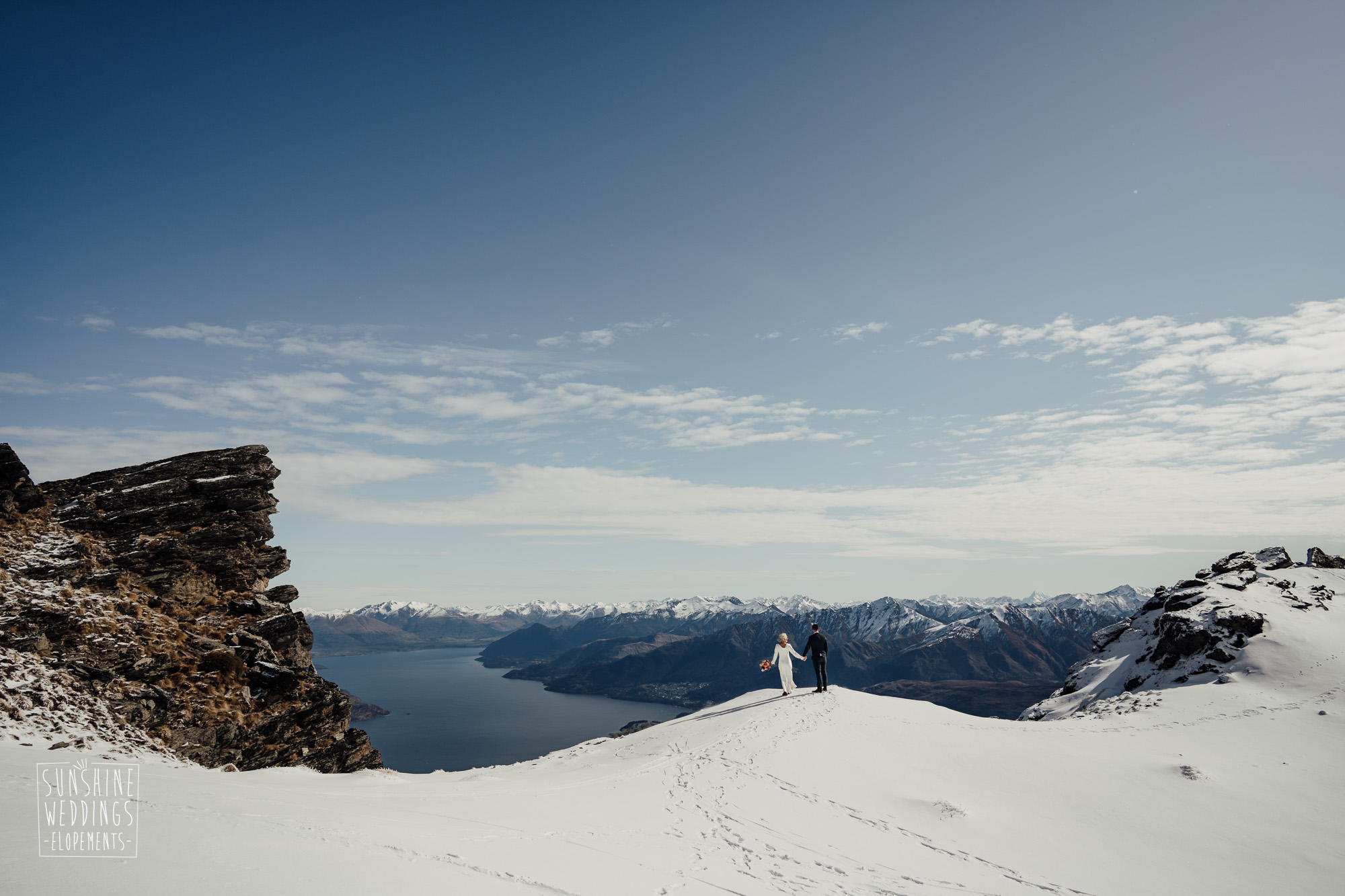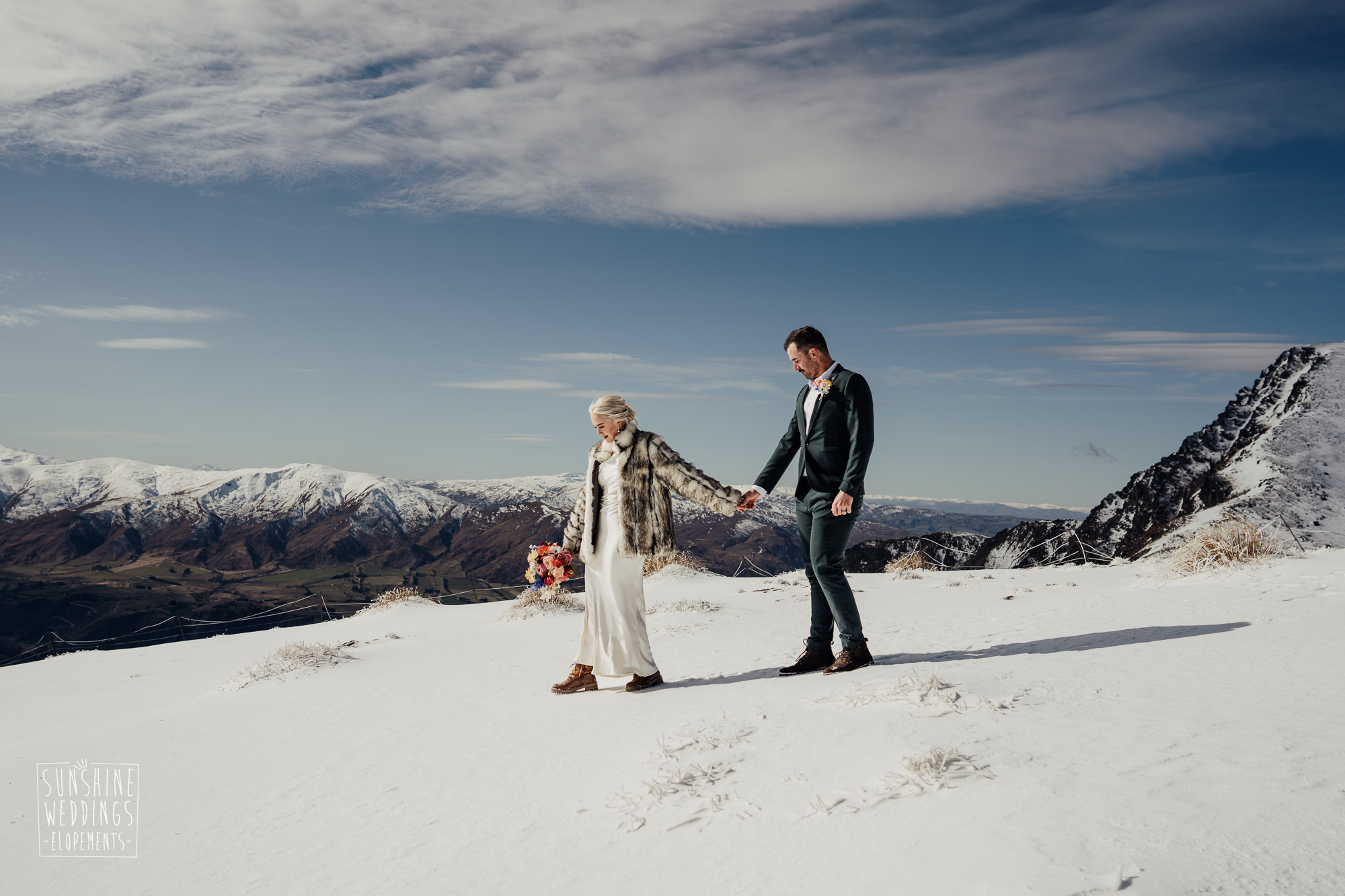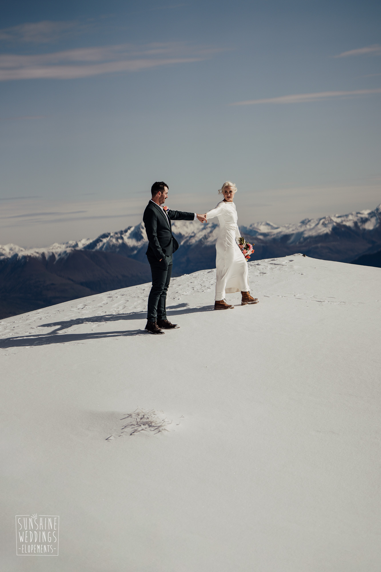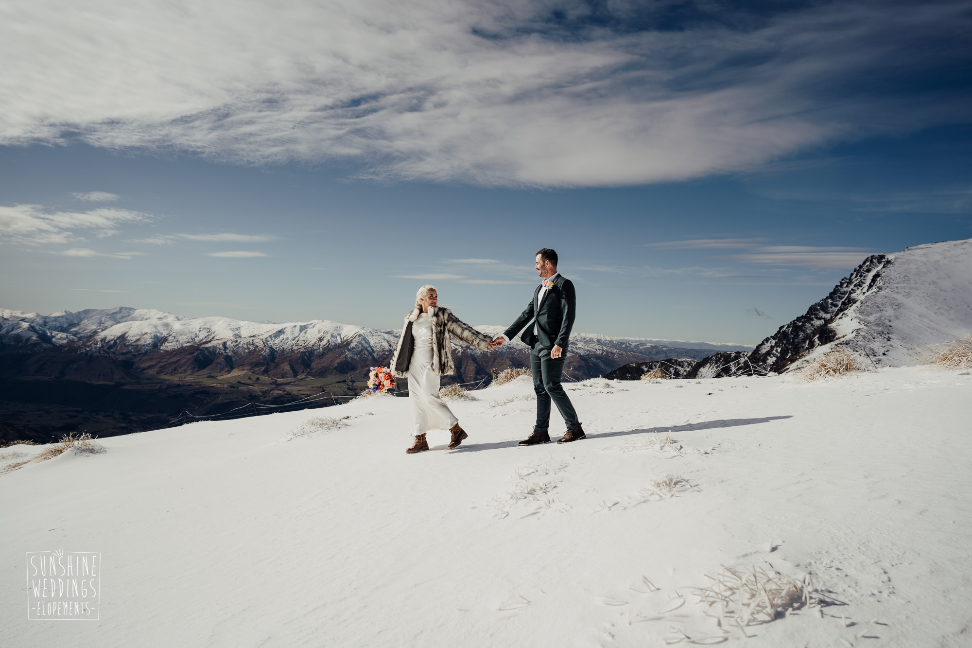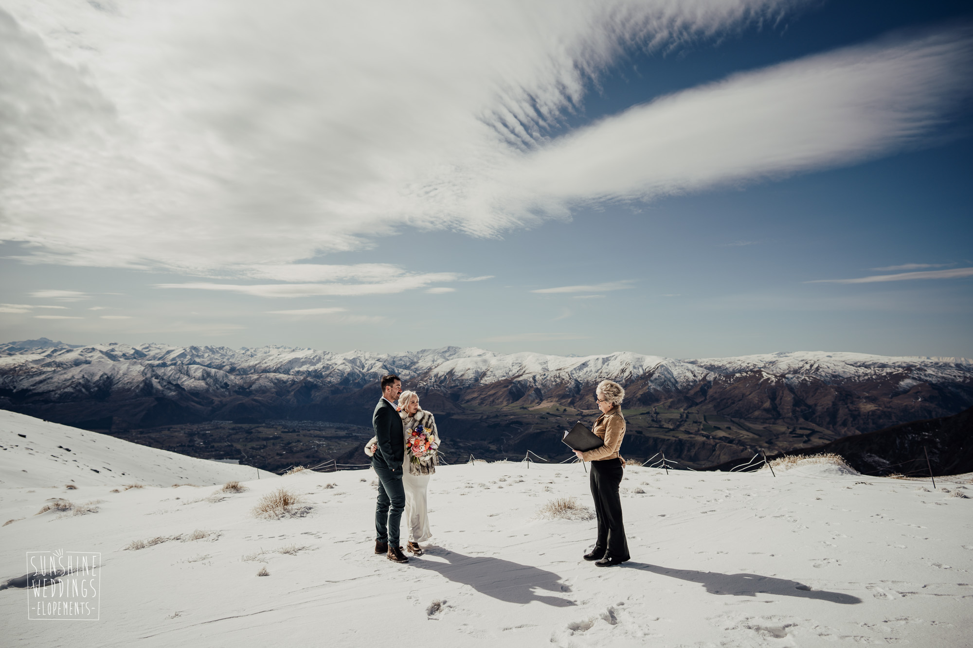 This Queenstown winter elopement had it all. They landed on a lesser known spot on The Remarkables for something a little different and high altitude views right across Lake Wakatipu and down to the township. Despite coming from North Queensland and more used to t-shirt temperatures than needing layers of thermals, these two toughed out the cold in elegant style. And it was bitterly cold with wind chill whipping straight from Antarctica. Even hardened photographer Scott and celebrant Phillipa had a shiver going on.