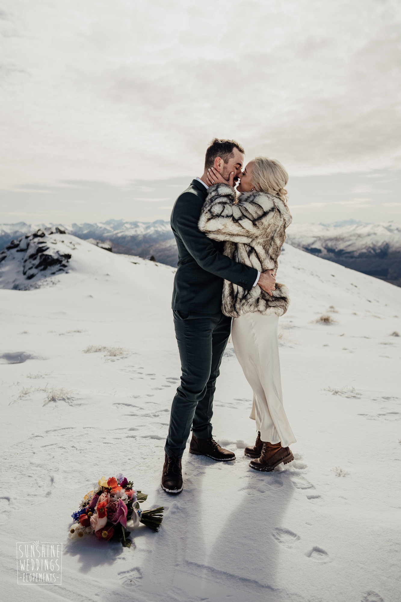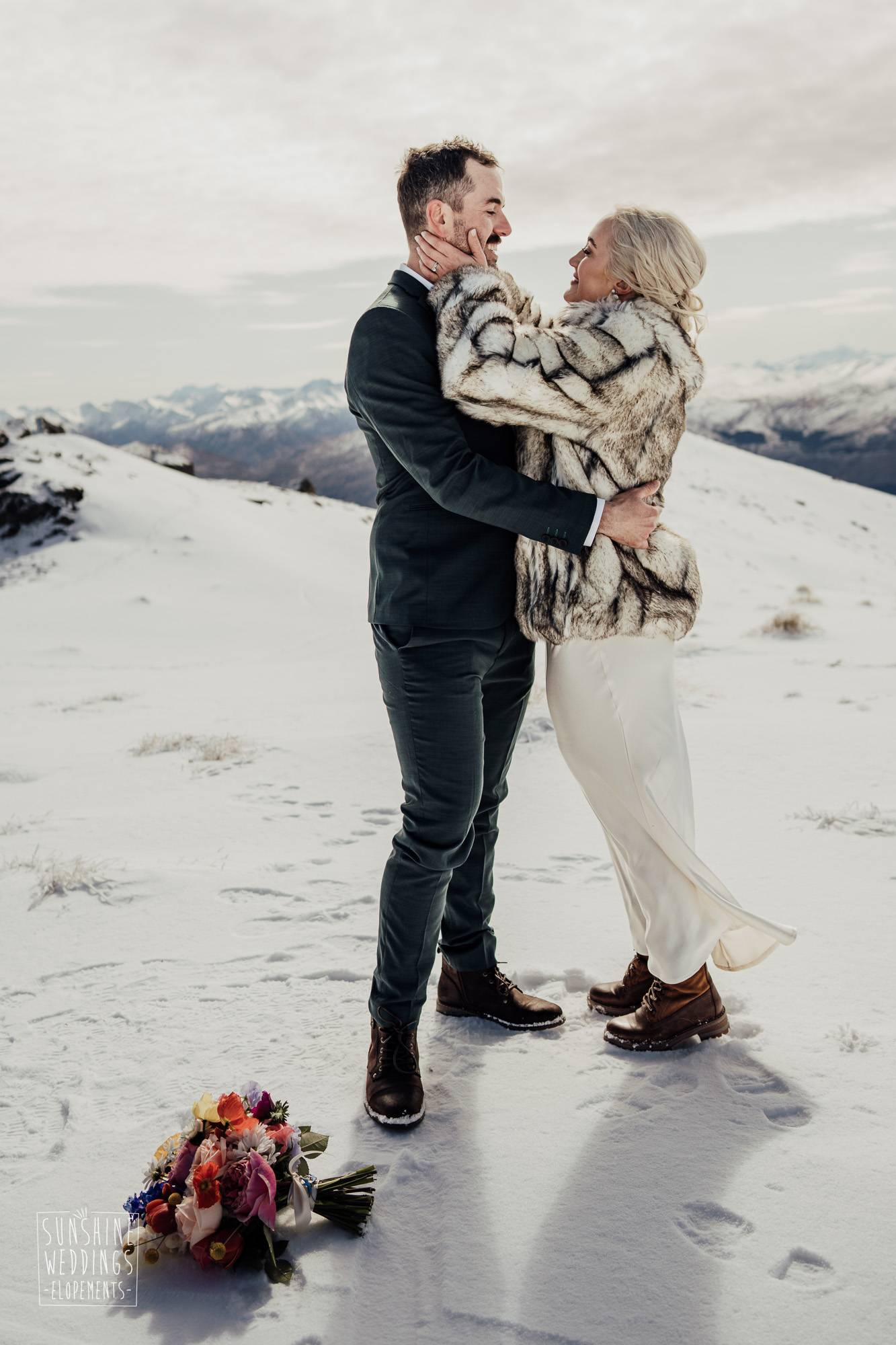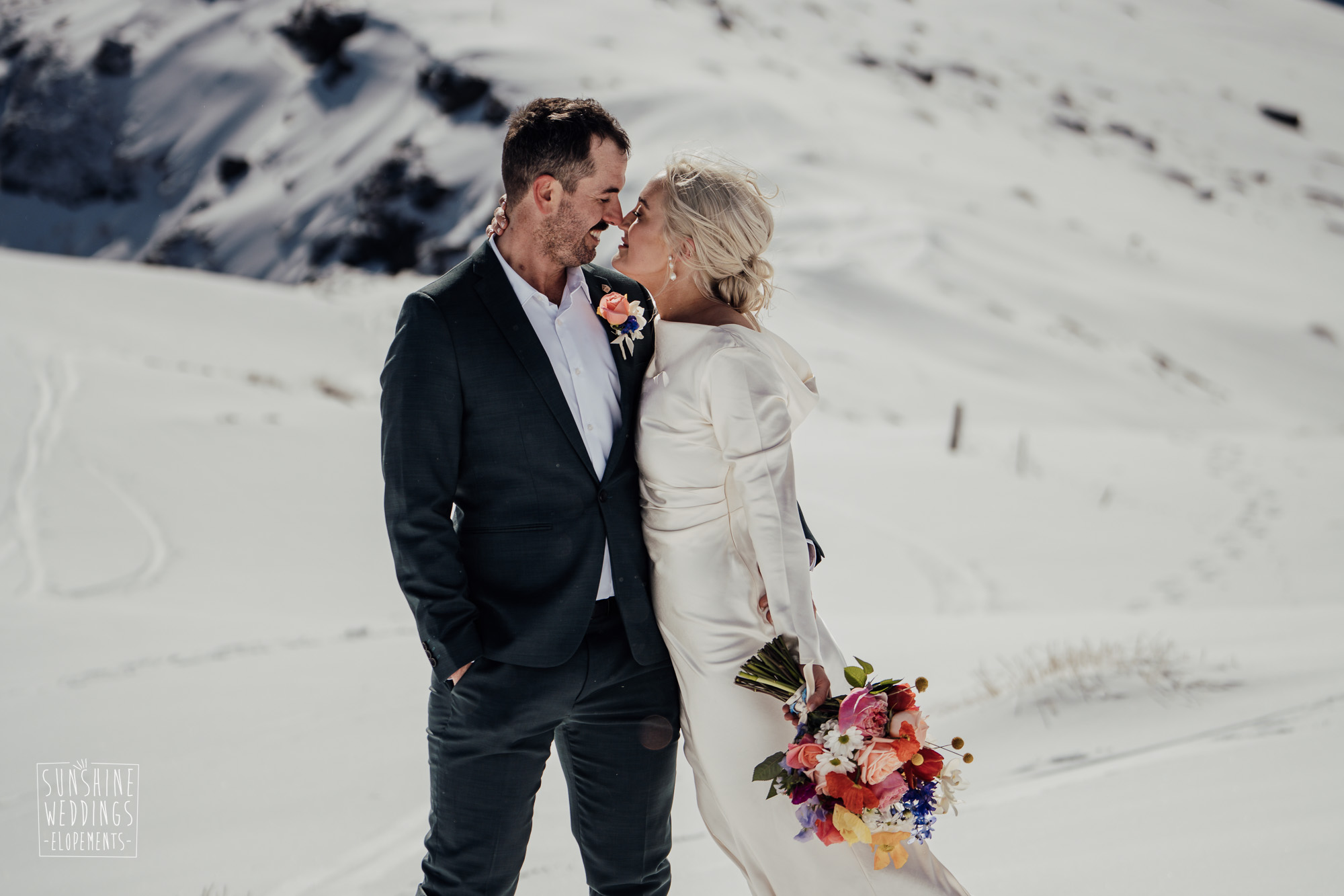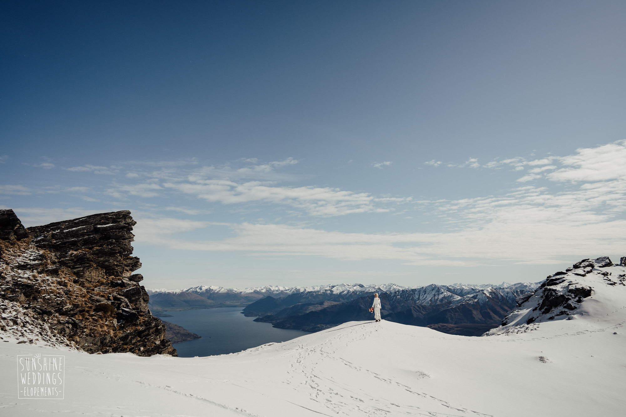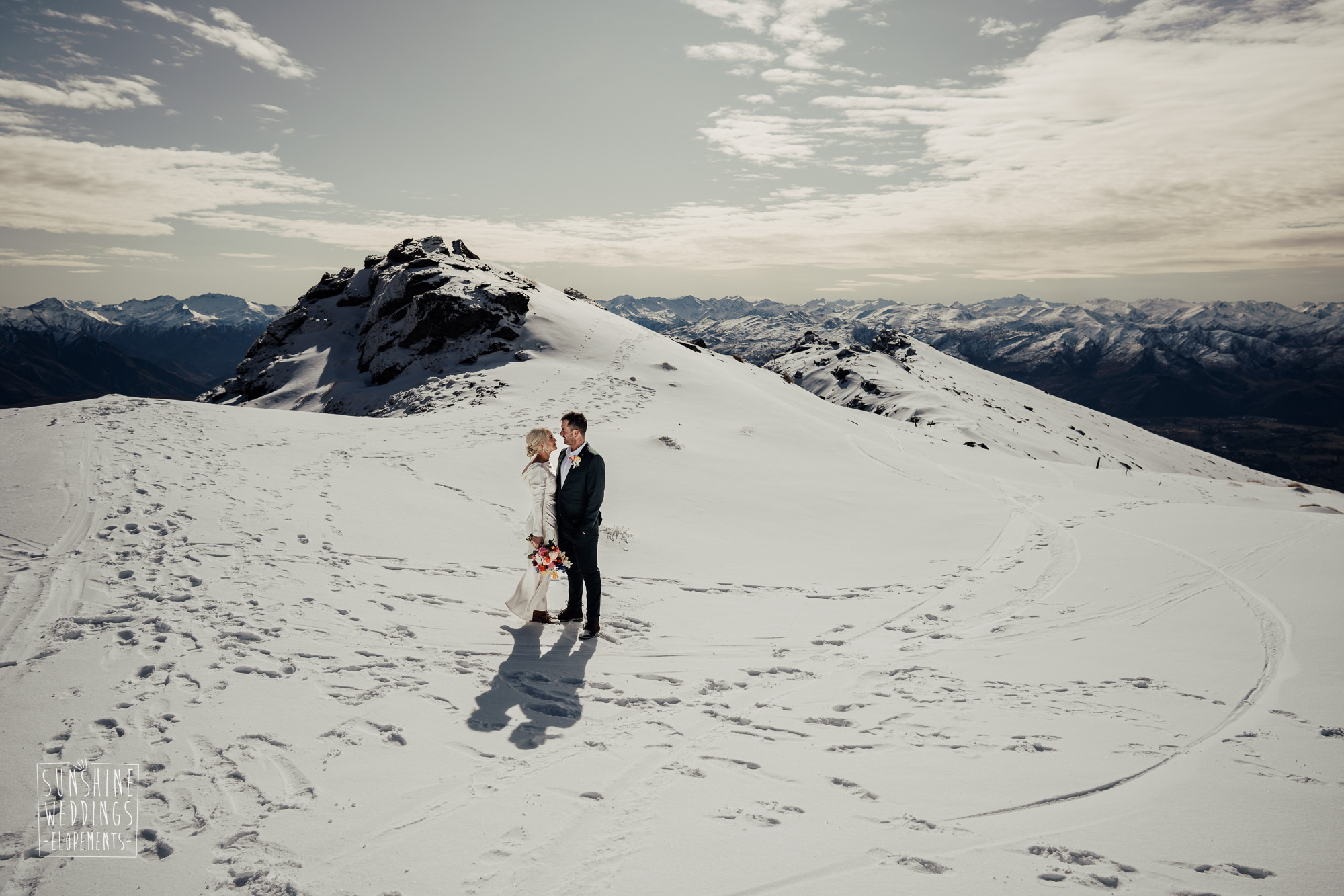 This Queenstown winter elopement had it all. They landed on a lesser known spot on The Remarkables for something a little different and high altitude views right across Lake Wakatipu and down to the township. Despite coming from North Queensland and more used to t-shirt temperatures than needing layers of thermals, these two toughed out the cold in elegant style. And it was bitterly cold with wind chill whipping straight from Antarctica. Even hardened photographer Scott and celebrant Phillipa had a shiver going on.