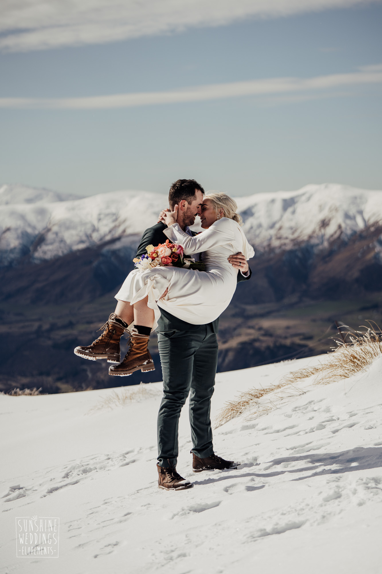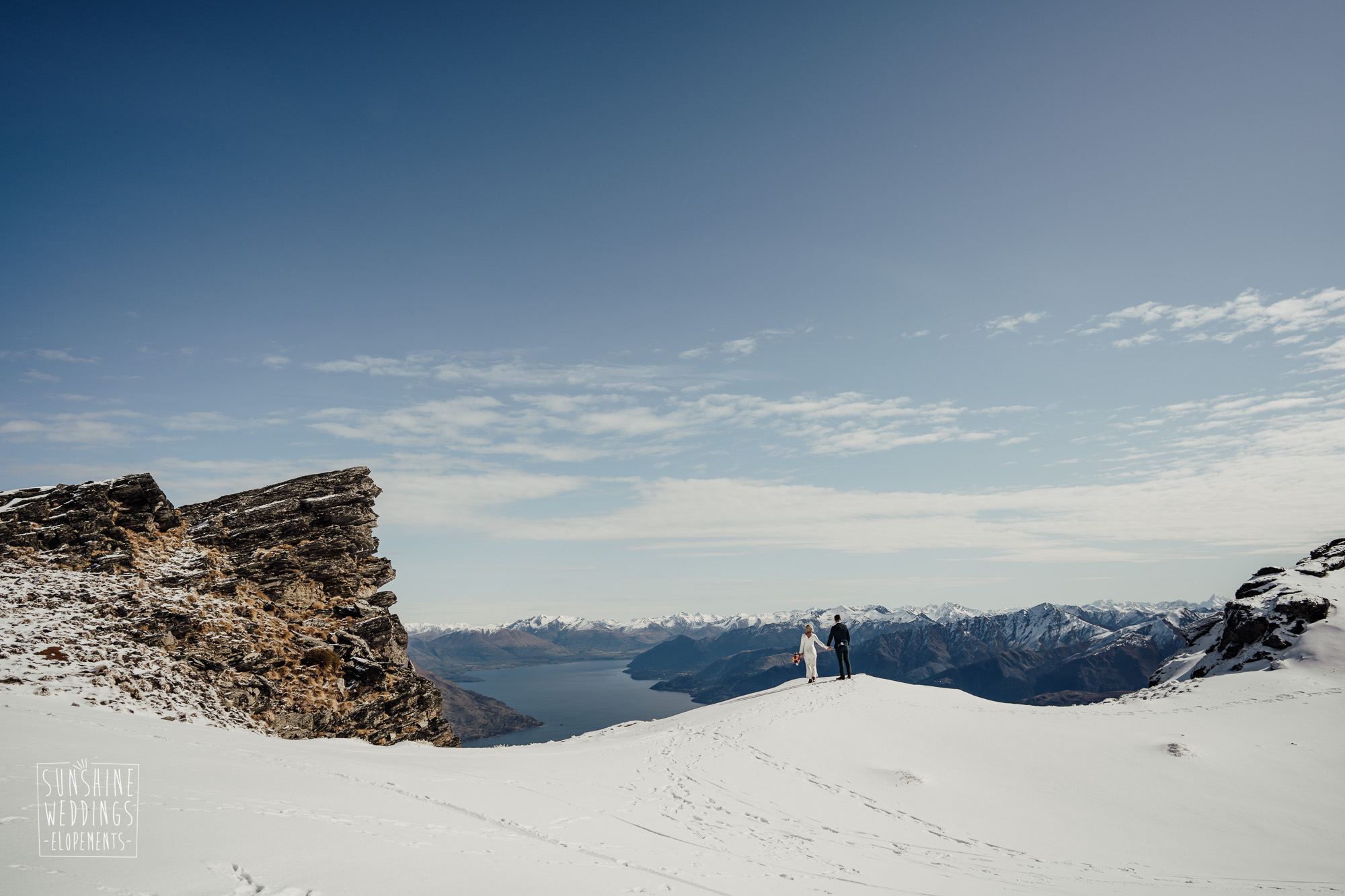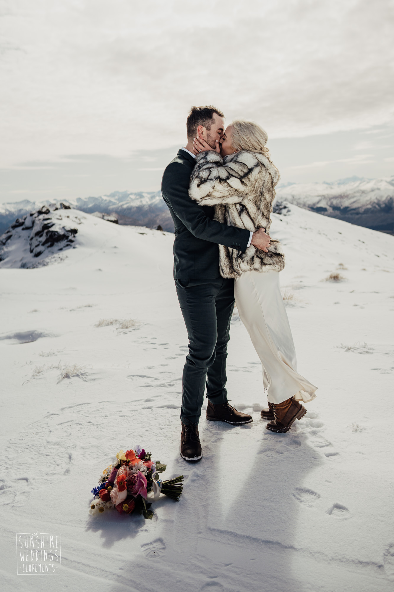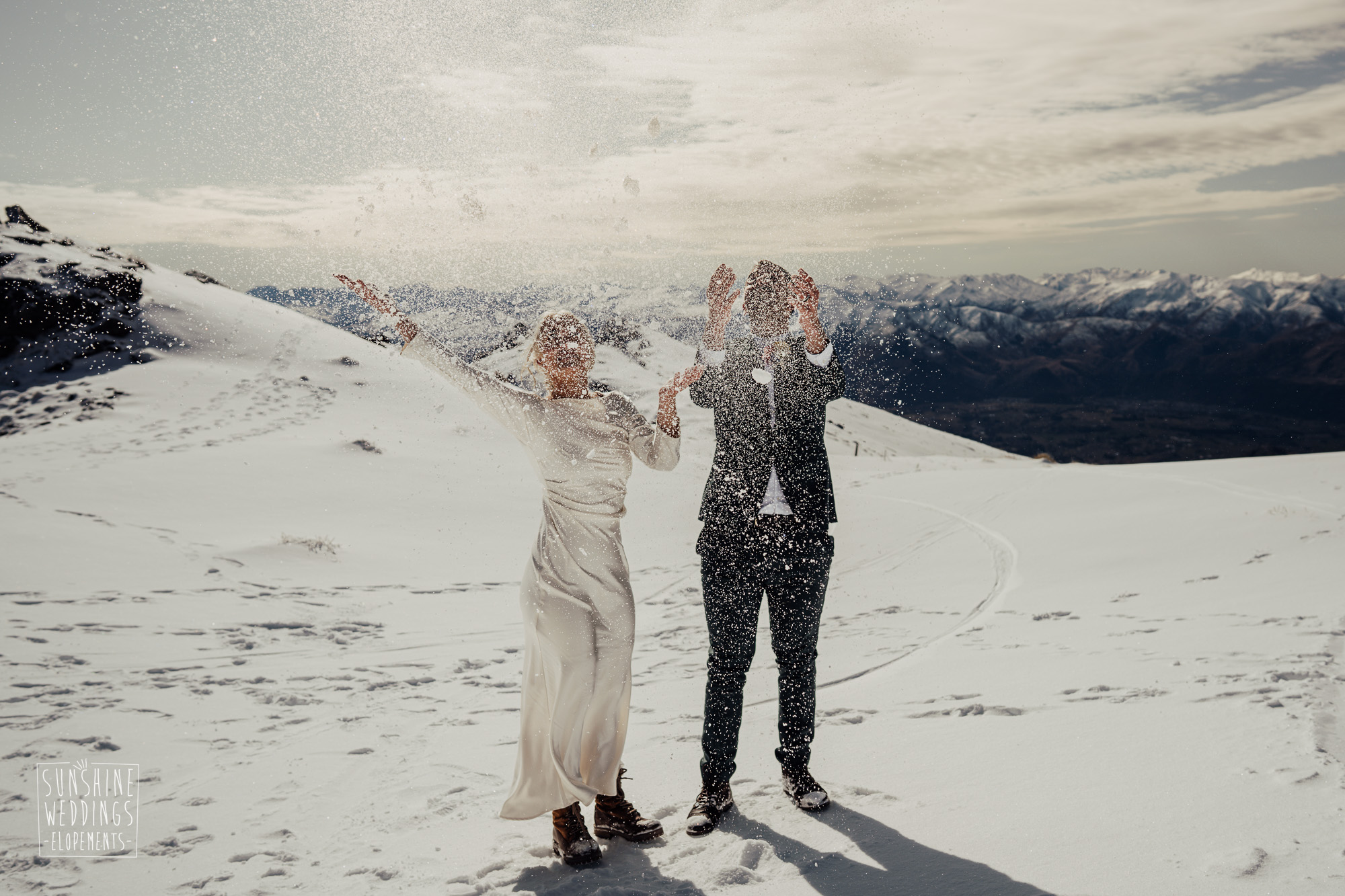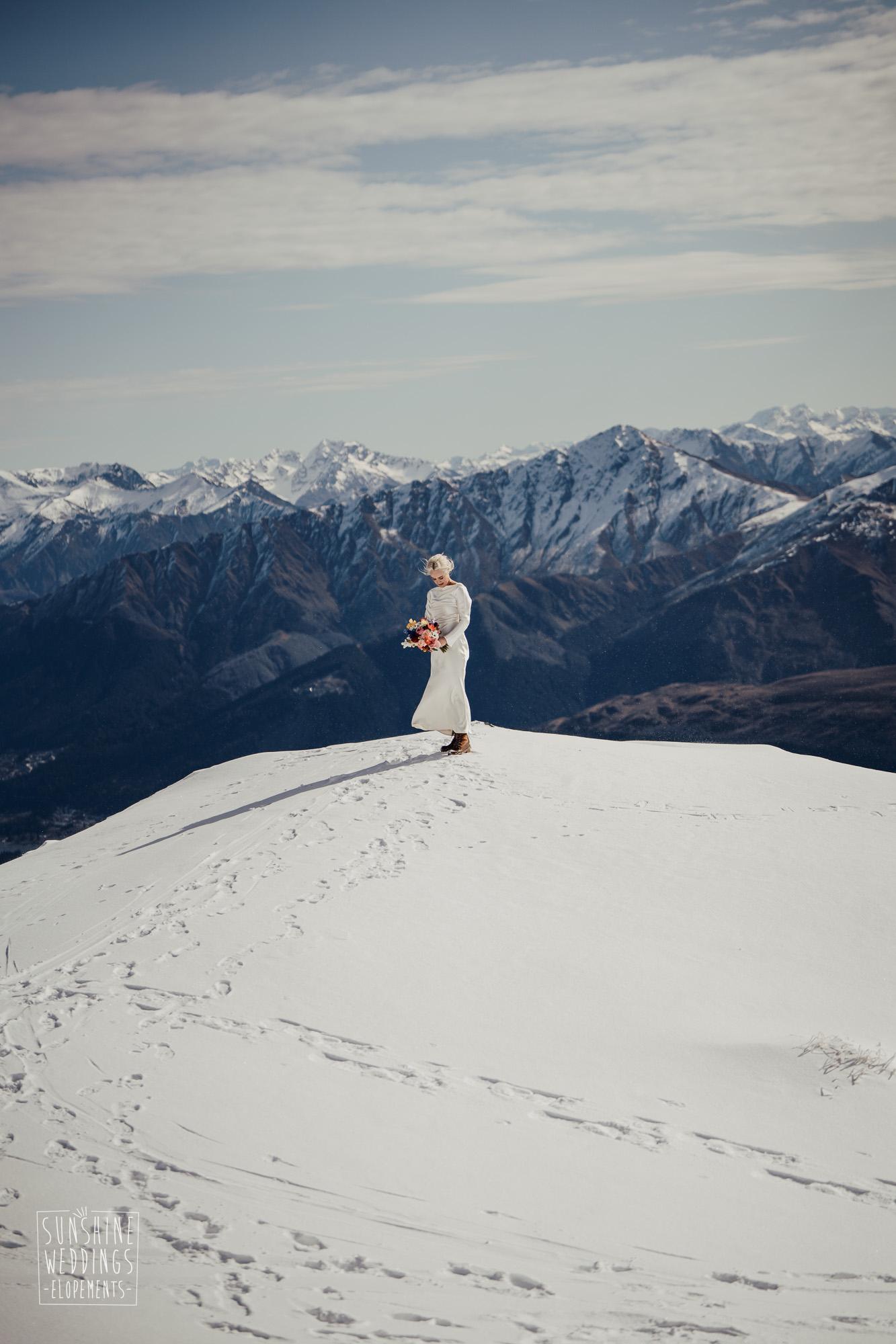This Queenstown winter elopement had it all. They landed on a lesser known spot on The Remarkables for something a little different and high altitude views right across Lake Wakatipu and down to the township. Despite coming from North Queensland and more used to t-shirt temperatures than needing layers of thermals, these two toughed out the cold in elegant style. And it was bitterly cold with wind chill whipping straight from Antarctica. Even hardened photographer Scott and celebrant Phillipa had a shiver going on.