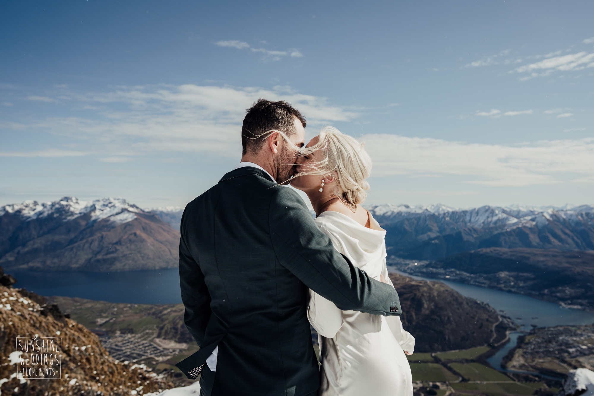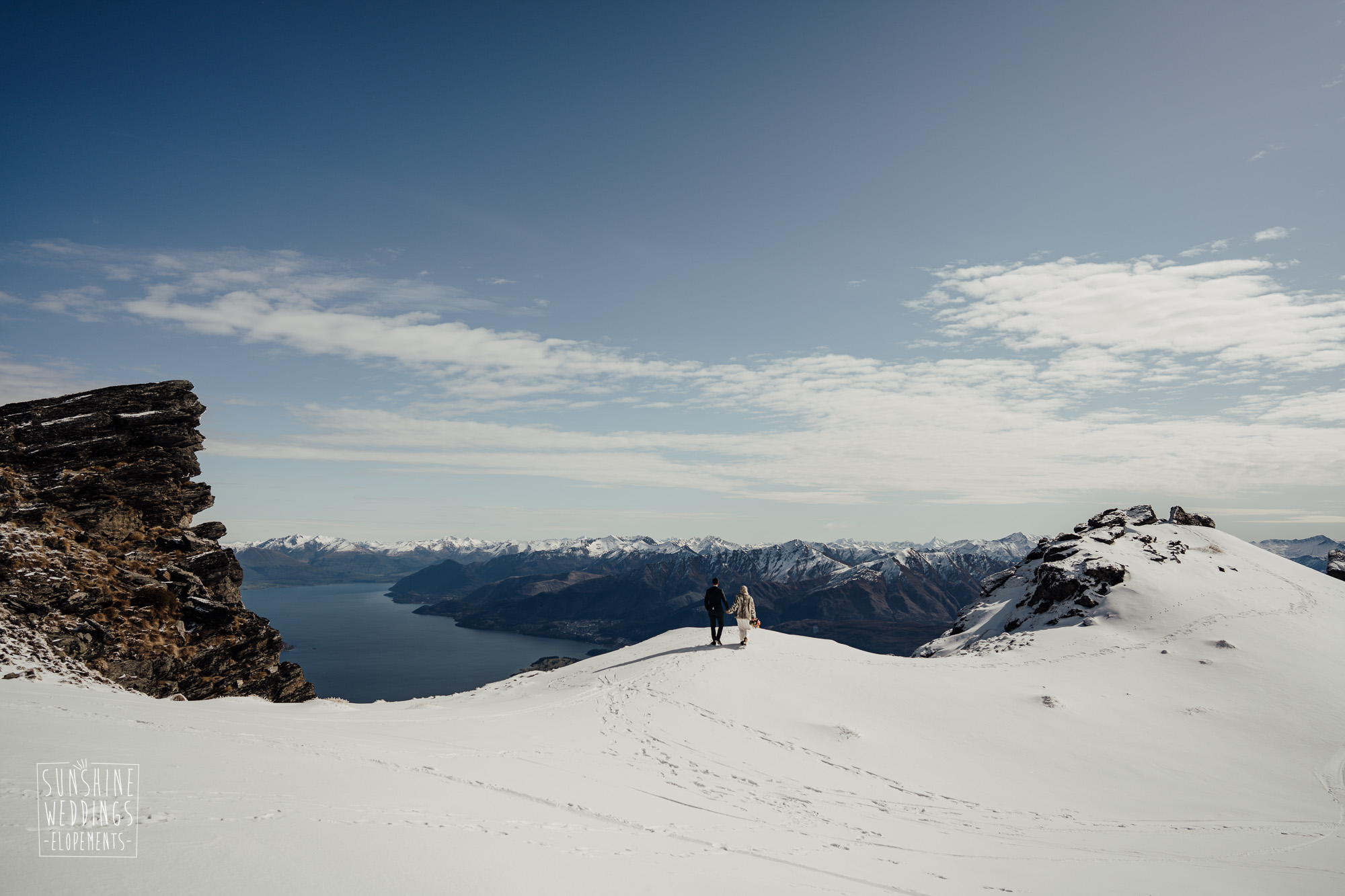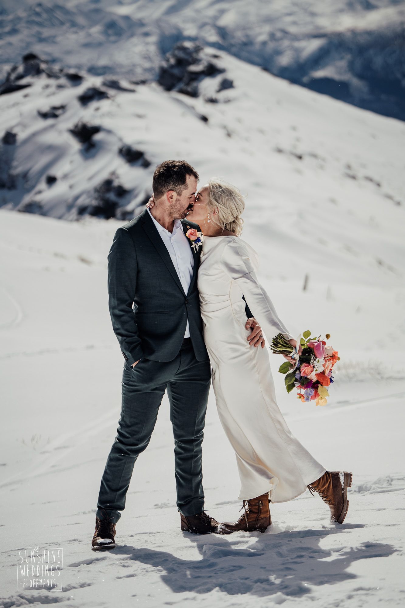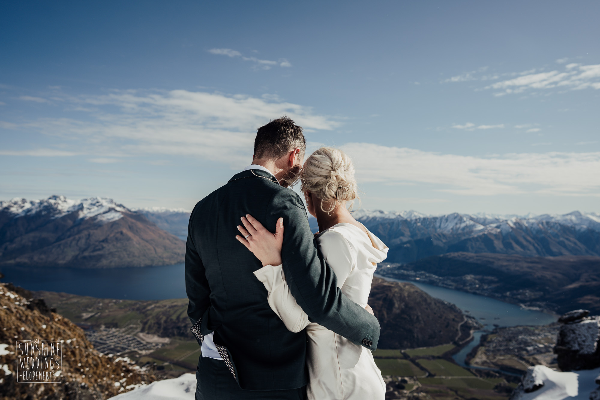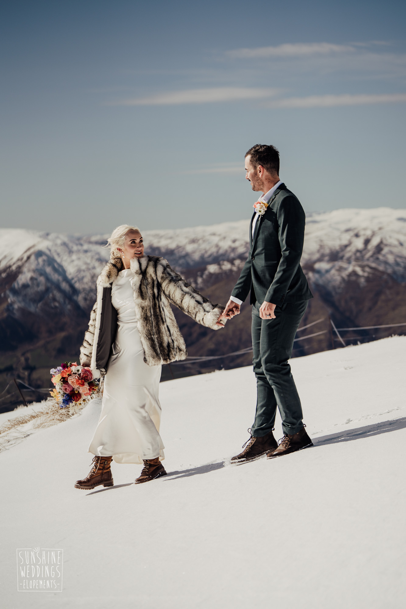 This Queenstown winter elopement had it all. They landed on a lesser known spot on The Remarkables for something a little different and high altitude views right across Lake Wakatipu and down to the township. Despite coming from North Queensland and more used to t-shirt temperatures than needing layers of thermals, these two toughed out the cold in elegant style. And it was bitterly cold with wind chill whipping straight from Antarctica. Even hardened photographer Scott and celebrant Phillipa had a shiver going on.