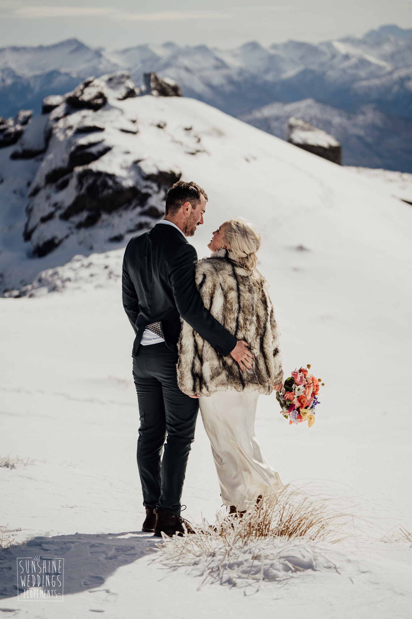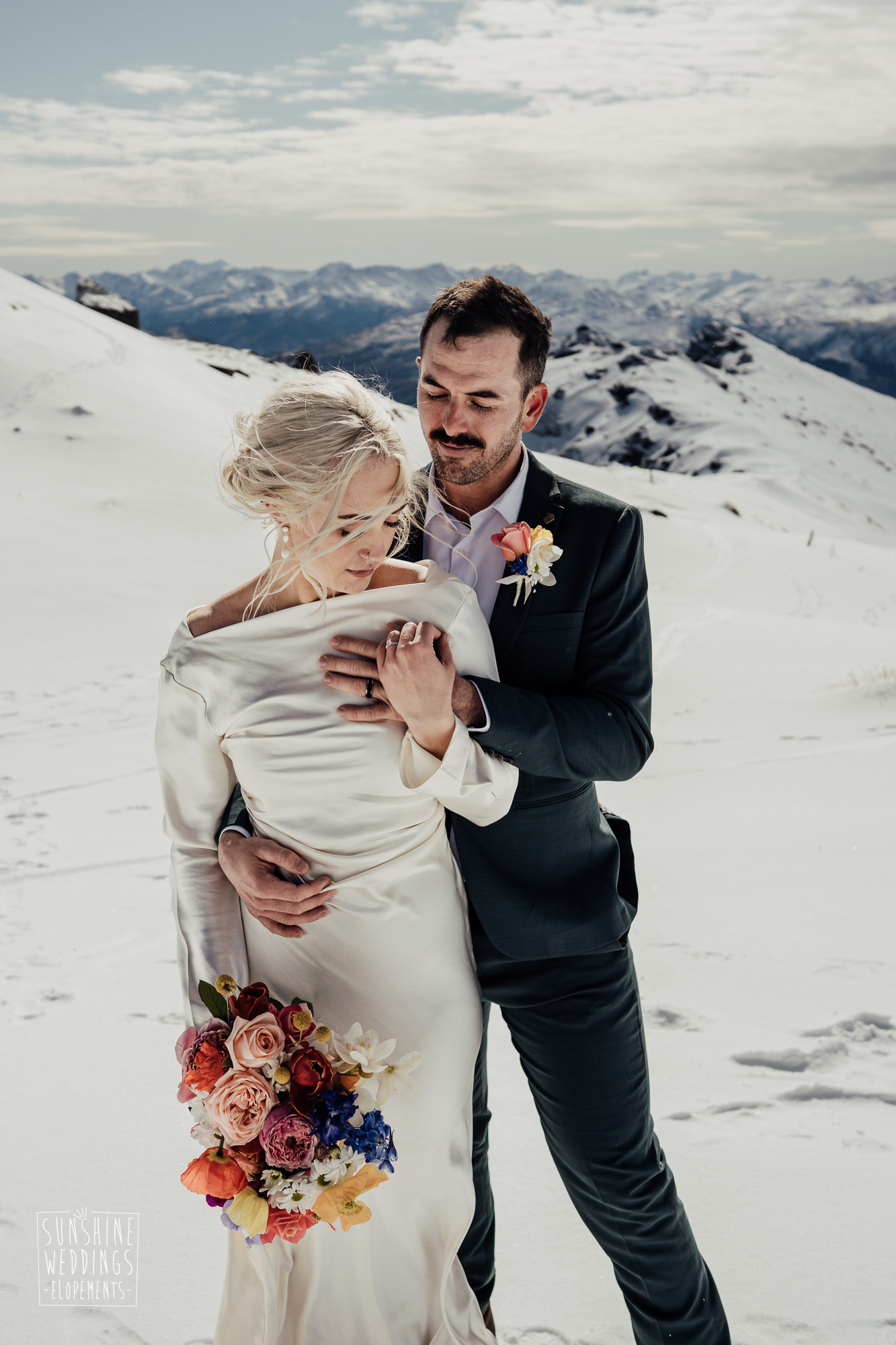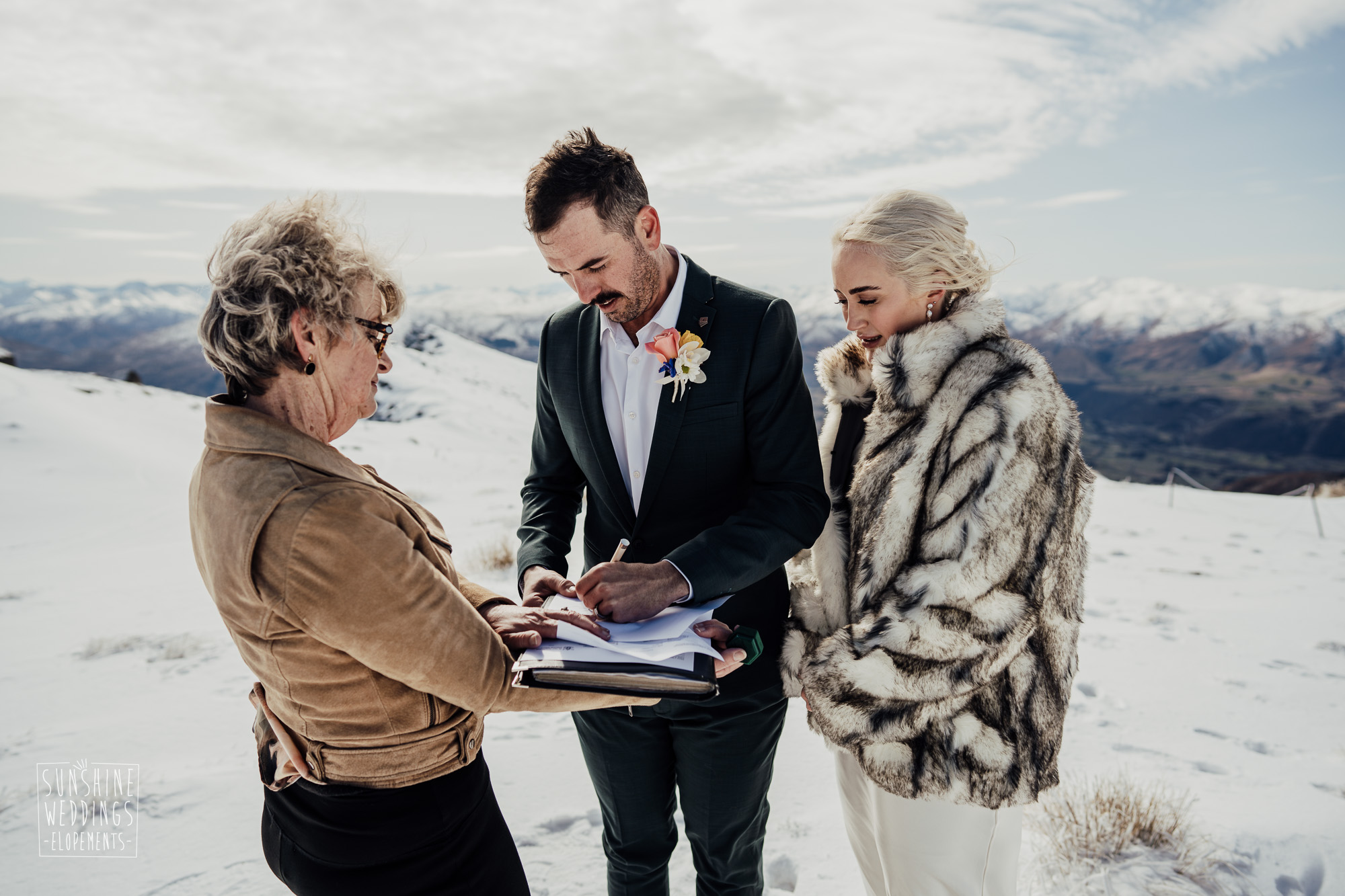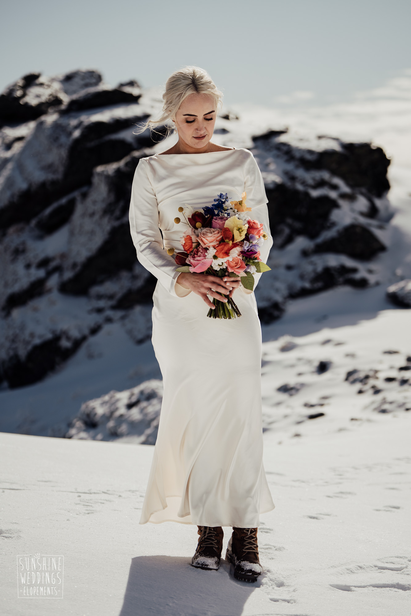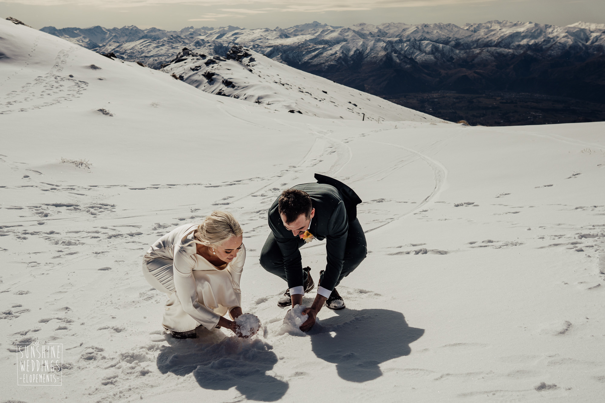 This Queenstown winter elopement had it all. They landed on a lesser known spot on The Remarkables for something a little different and high altitude views right across Lake Wakatipu and down to the township. Despite coming from North Queensland and more used to t-shirt temperatures than needing layers of thermals, these two toughed out the cold in elegant style. And it was bitterly cold with wind chill whipping straight from Antarctica. Even hardened photographer Scott and celebrant Phillipa had a shiver going on.