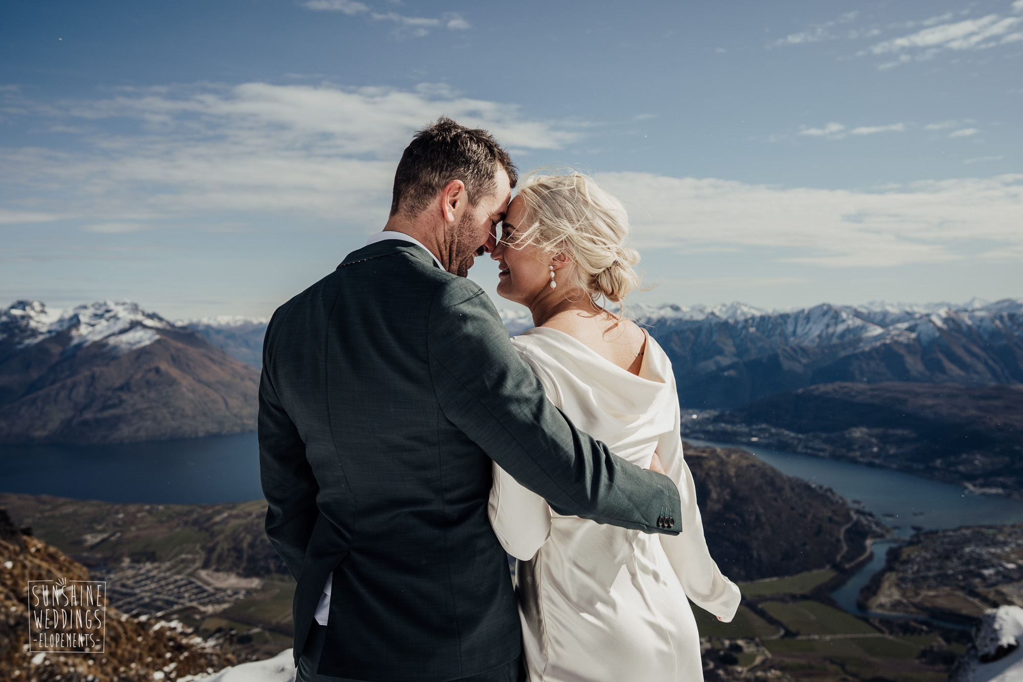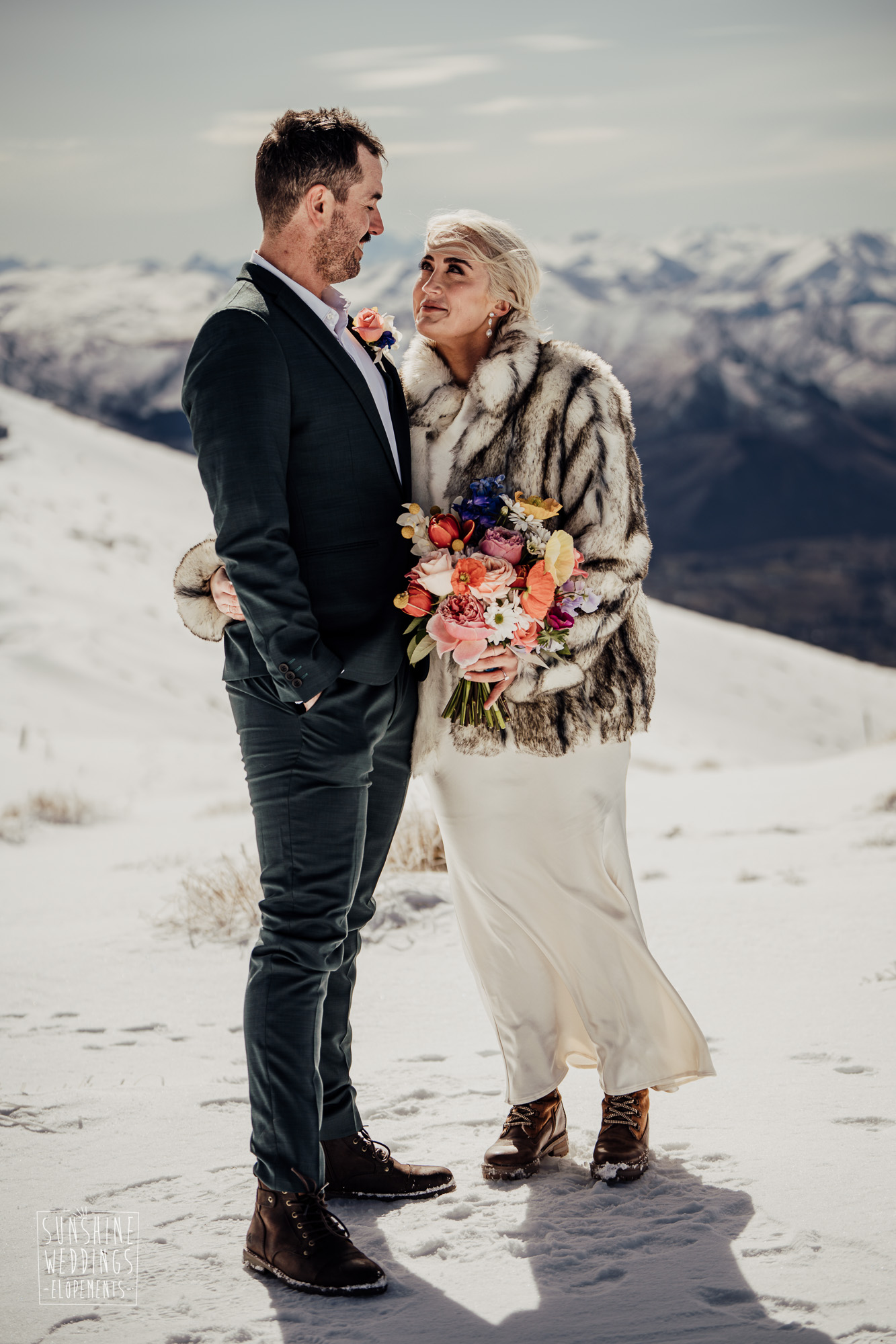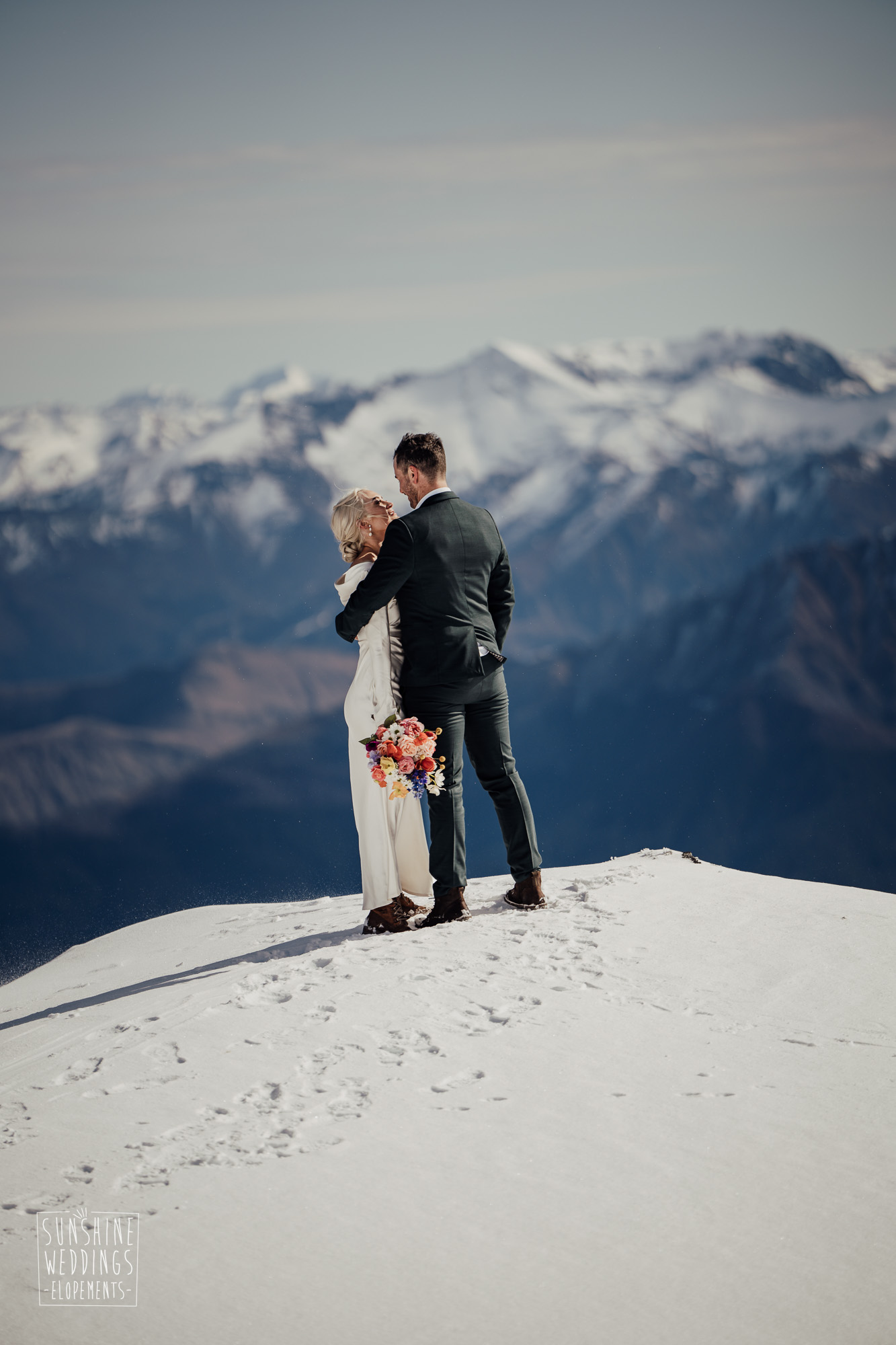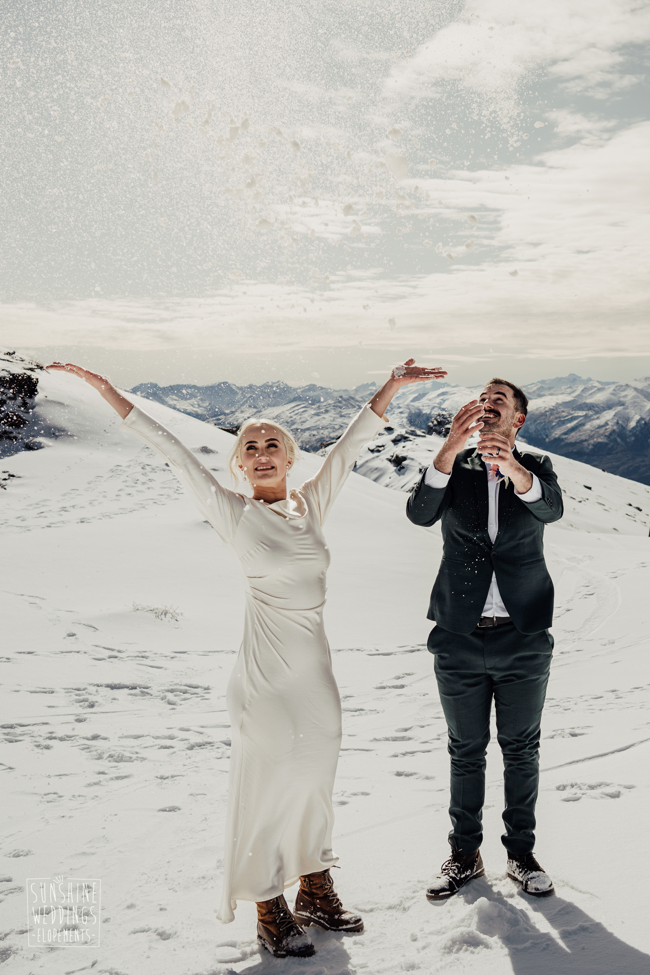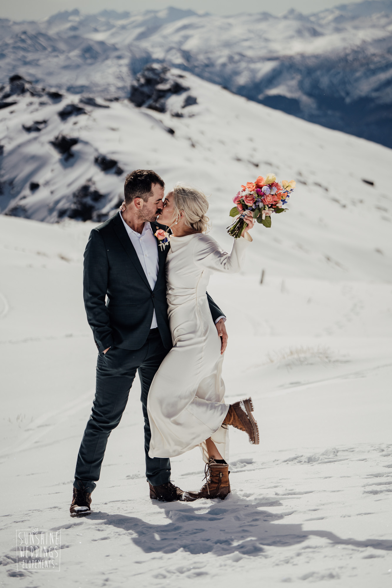 This Queenstown winter elopement had it all. They landed on a lesser known spot on The Remarkables for something a little different and high altitude views right across Lake Wakatipu and down to the township. Despite coming from North Queensland and more used to t-shirt temperatures than needing layers of thermals, these two toughed out the cold in elegant style. And it was bitterly cold with wind chill whipping straight from Antarctica. Even hardened photographer Scott and celebrant Phillipa had a shiver going on.