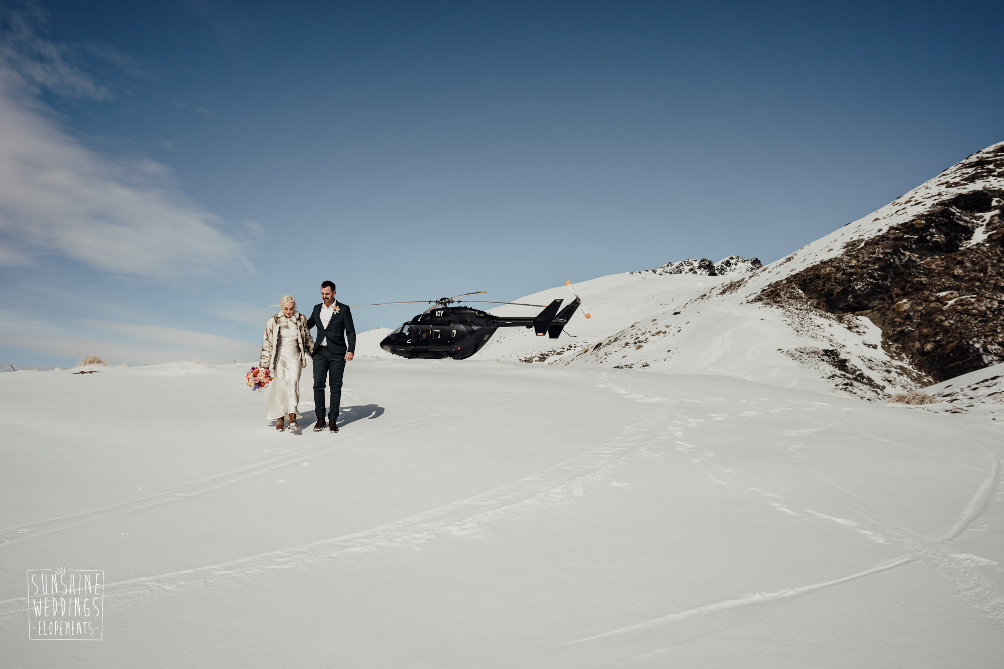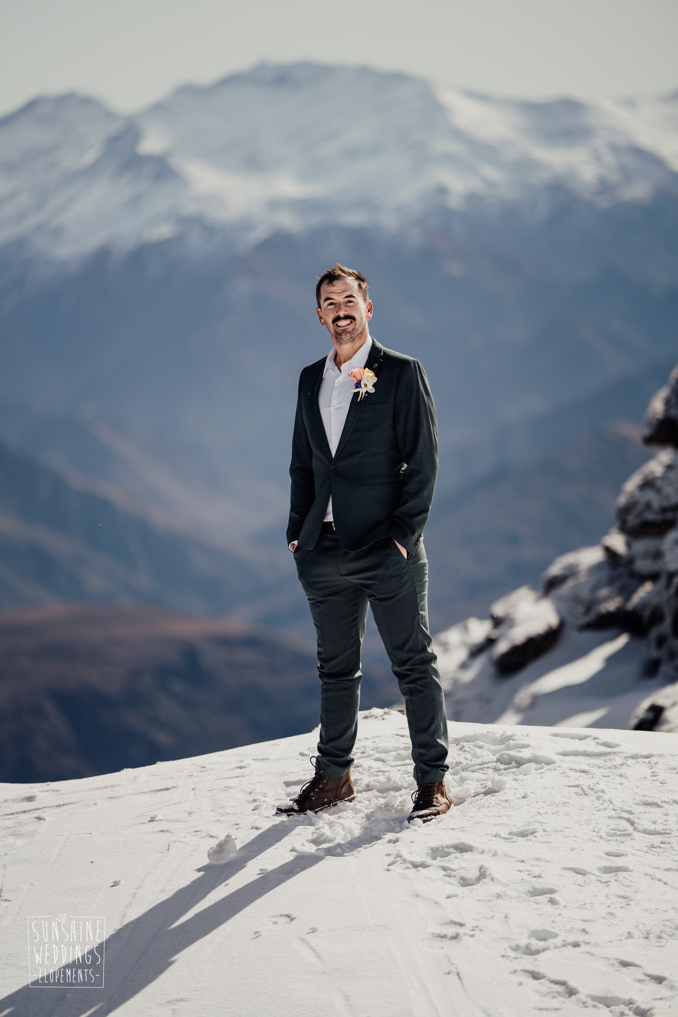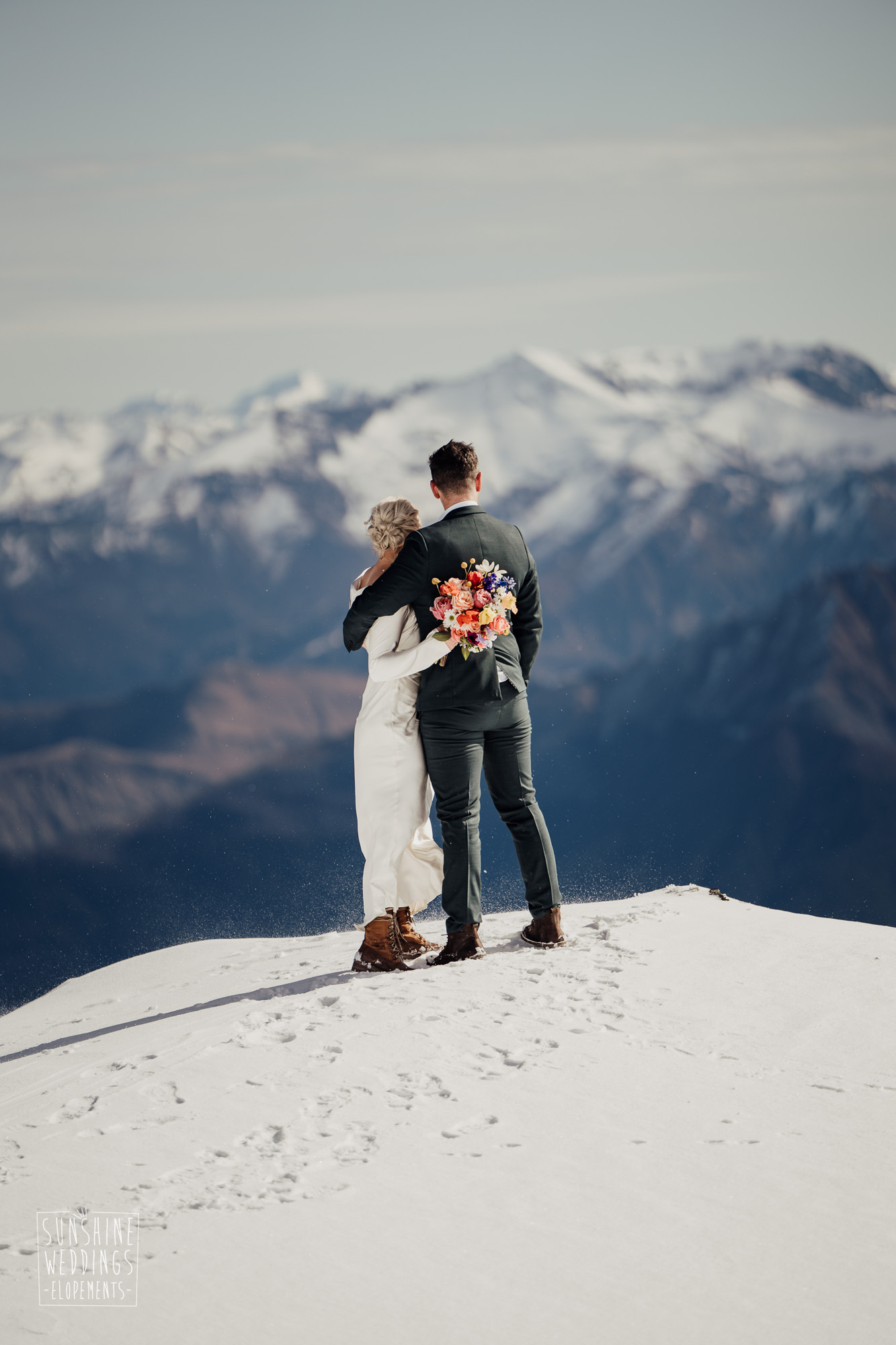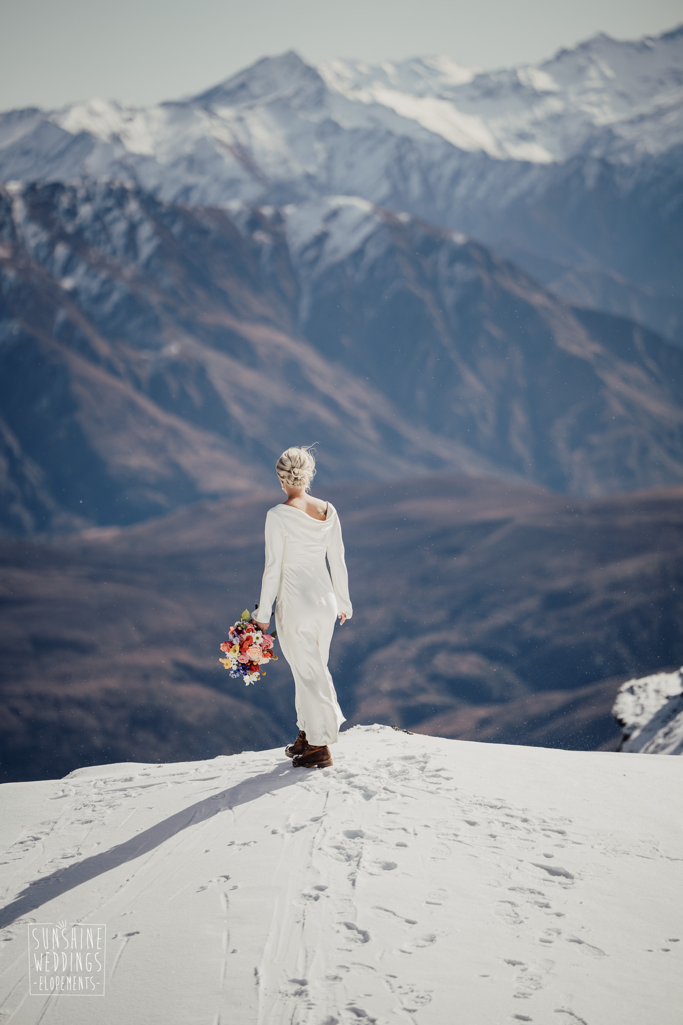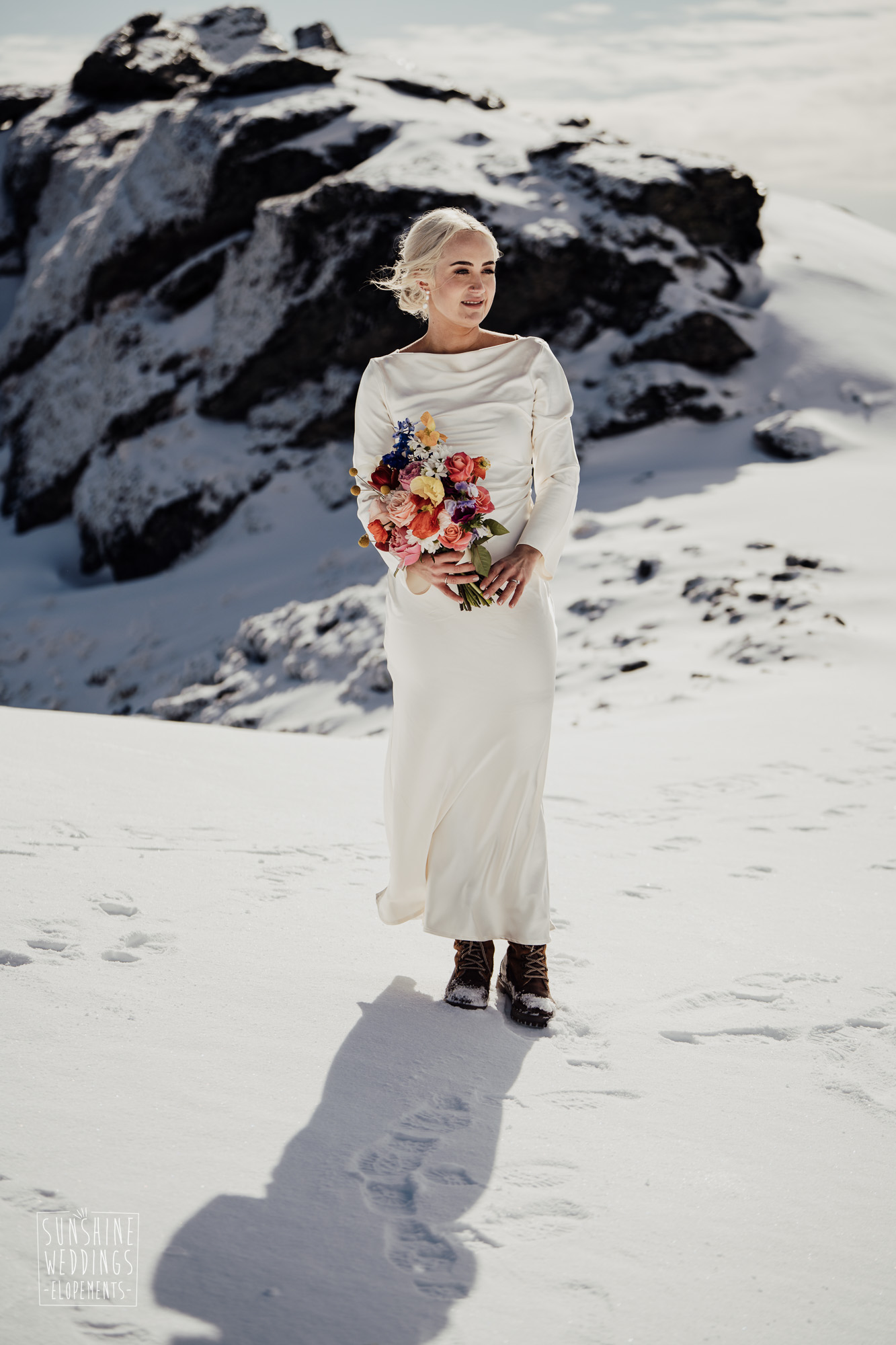 This Queenstown winter elopement had it all. They landed on a lesser known spot on The Remarkables for something a little different and high altitude views right across Lake Wakatipu and down to the township. Despite coming from North Queensland and more used to t-shirt temperatures than needing layers of thermals, these two toughed out the cold in elegant style. And it was bitterly cold with wind chill whipping straight from Antarctica. Even hardened photographer Scott and celebrant Phillipa had a shiver going on.
